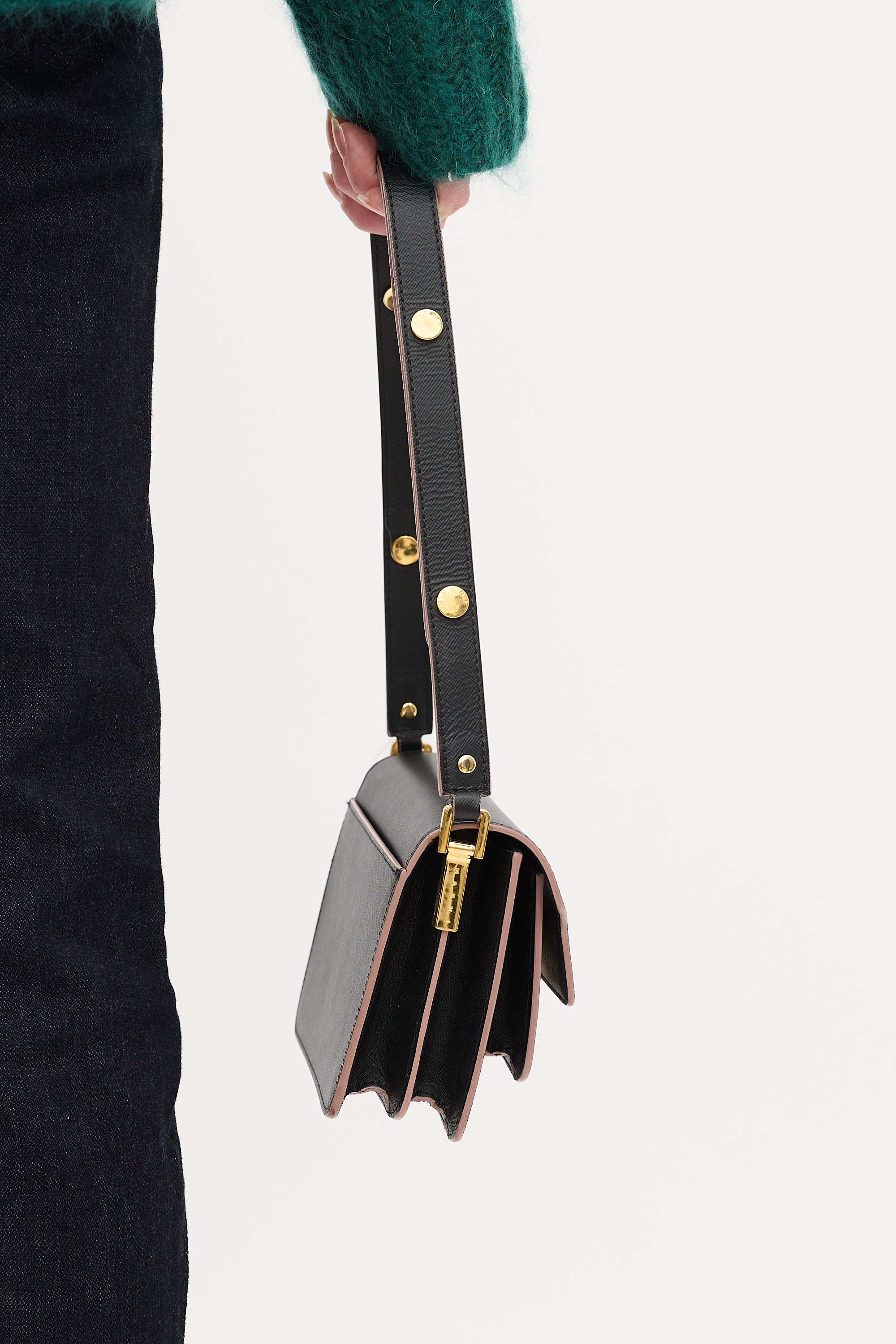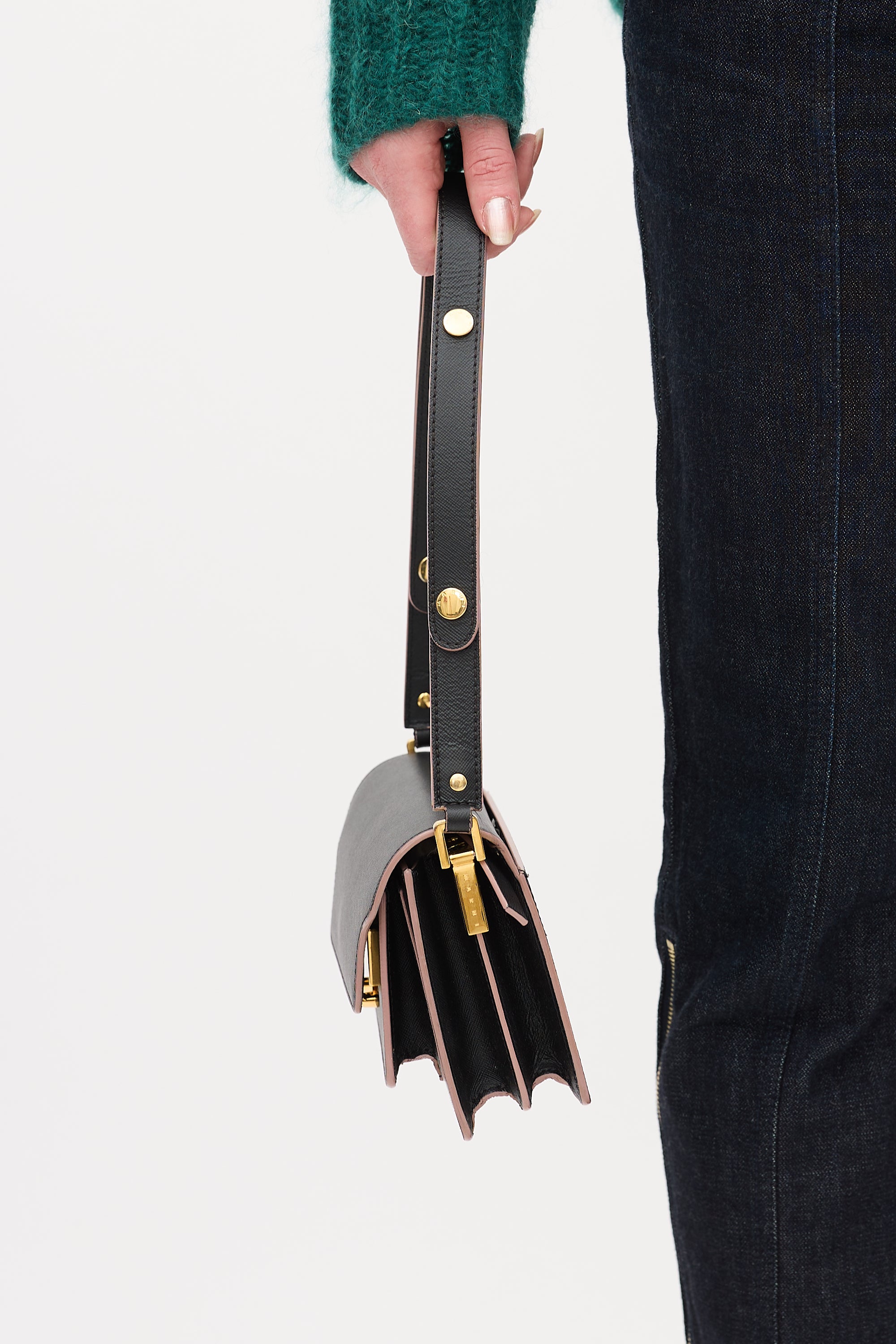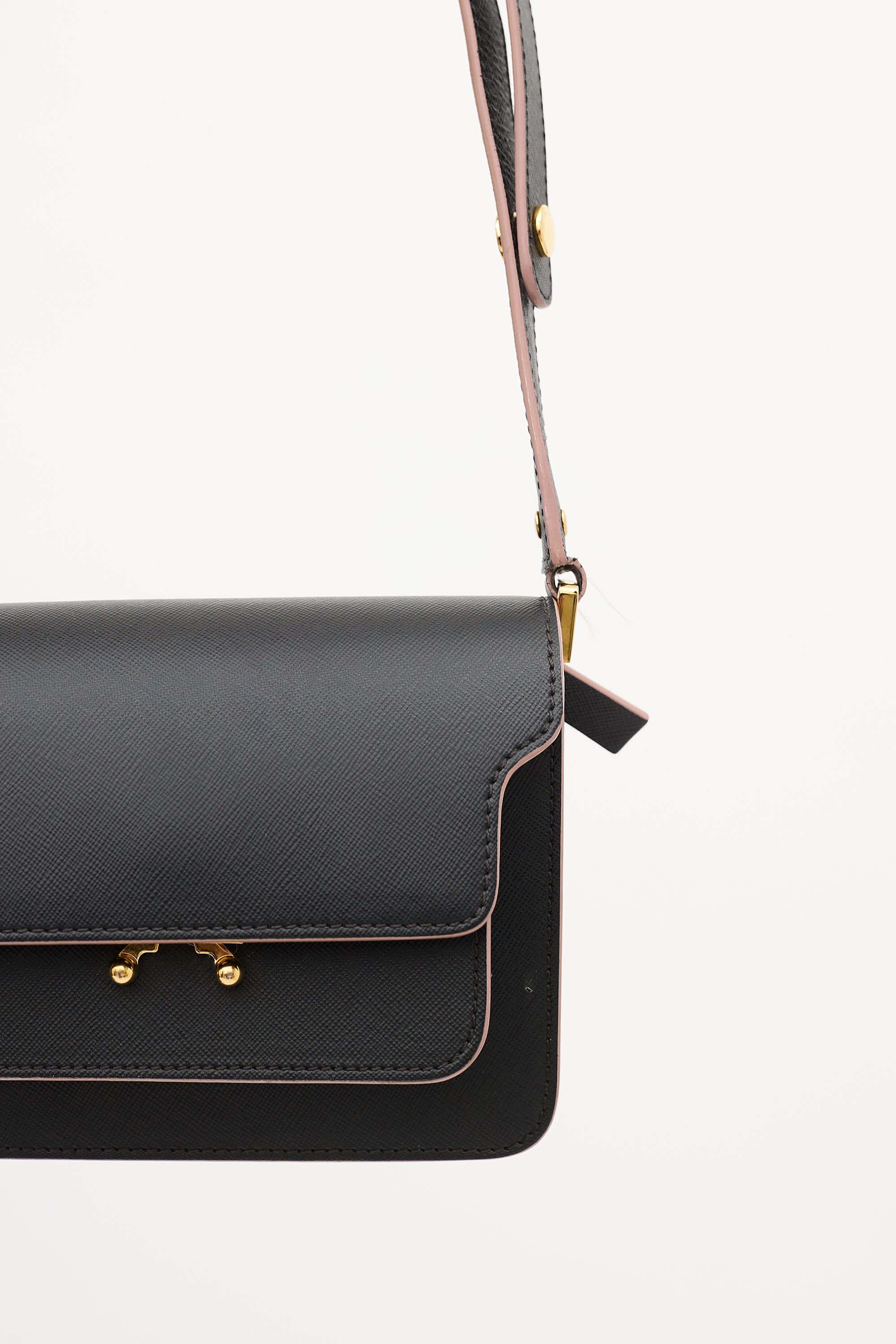 Pre-owned Marni black saffiano leather Mini Trunk bag featuring top flap with gold tone press release latch closure, two main compartments with one zip pocket, one slip pocket at front and one at back, adjustable shoulder strap with gold tone engraved logo hardware, and pink trim throughout. Comes with original dust bag.