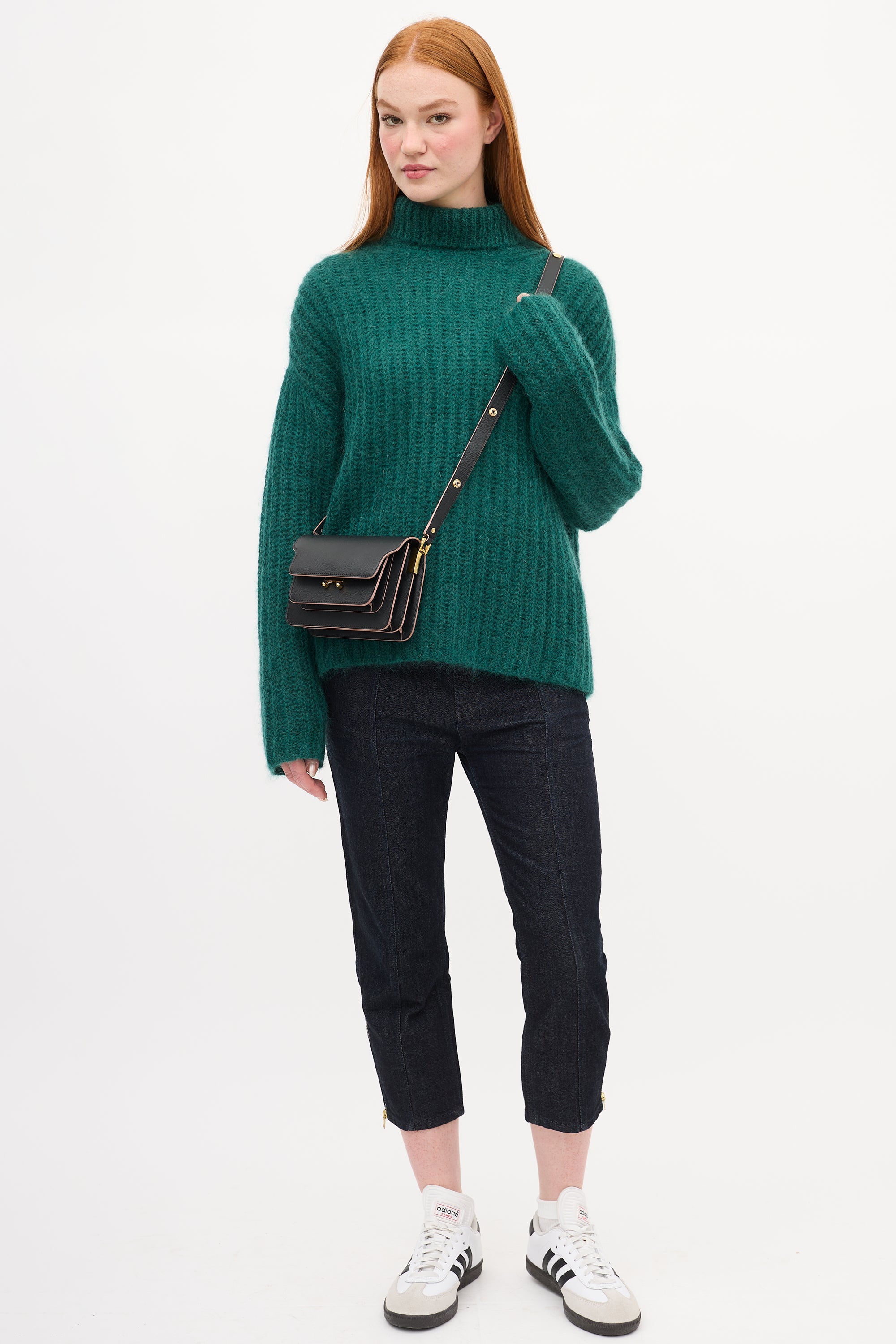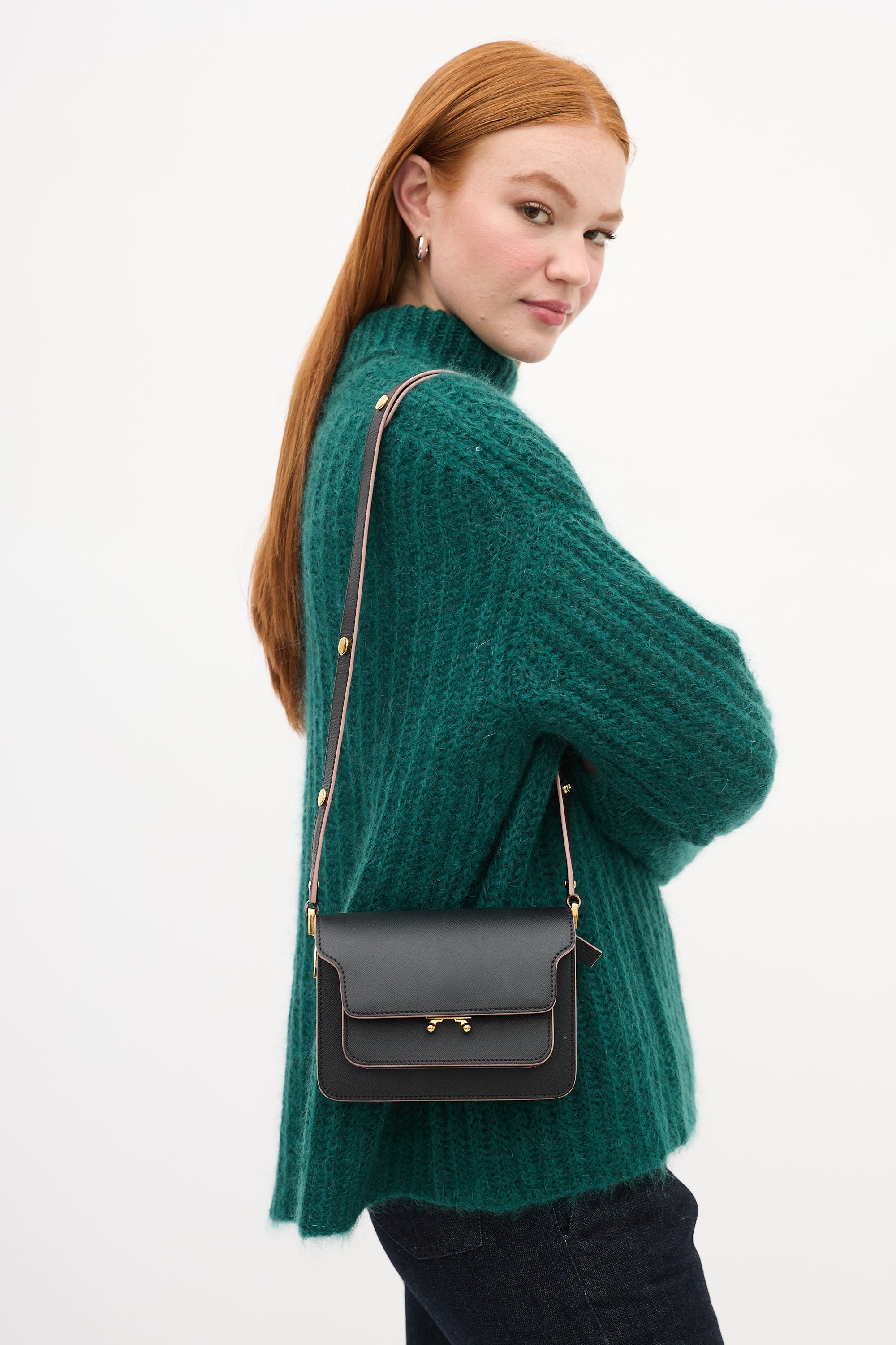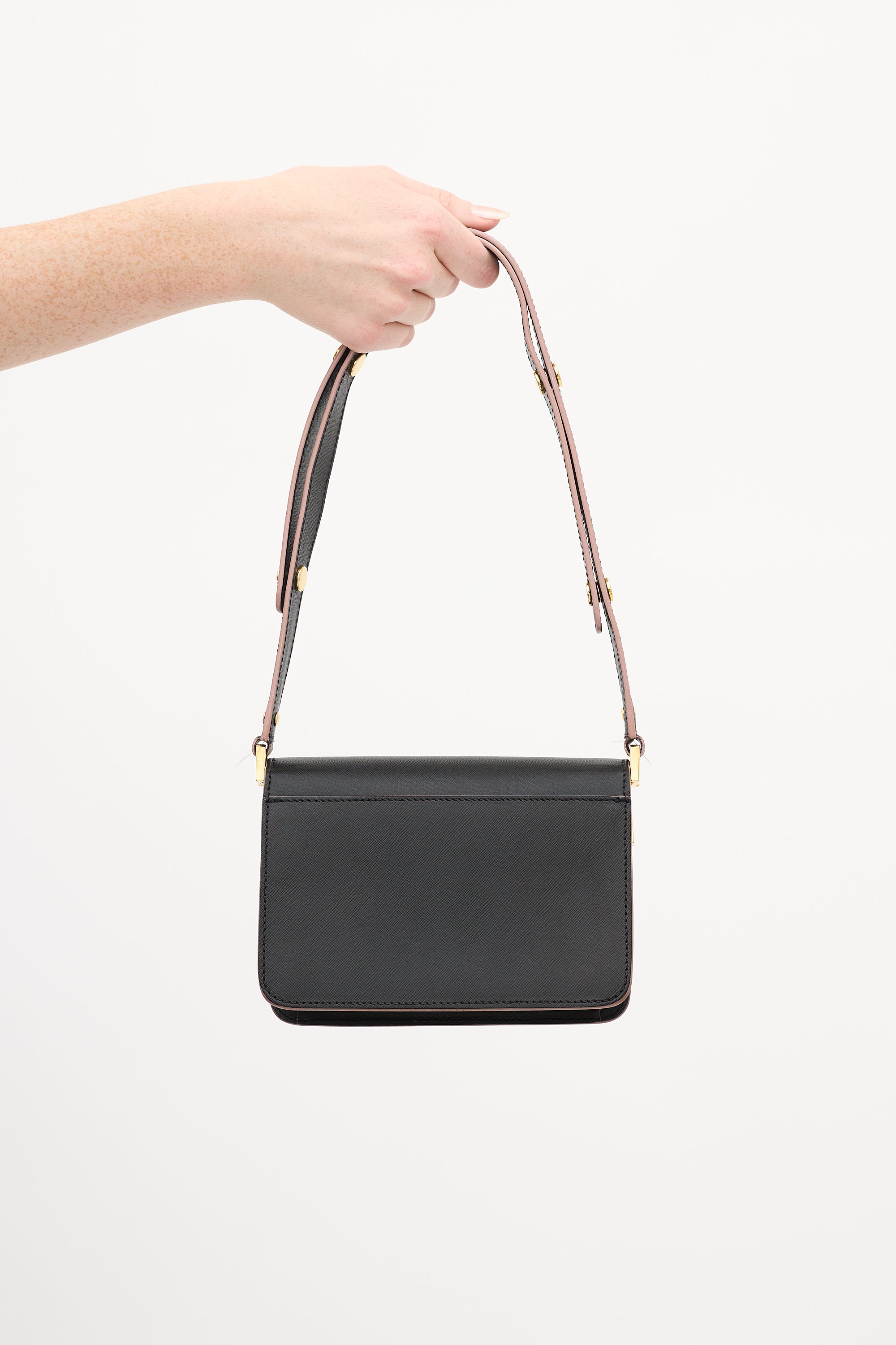 Pre-owned Marni black saffiano leather Mini Trunk bag featuring top flap with gold tone press release latch closure, two main compartments with one zip pocket, one slip pocket at front and one at back, adjustable shoulder strap with gold tone engraved logo hardware, and pink trim throughout. Comes with original dust bag.