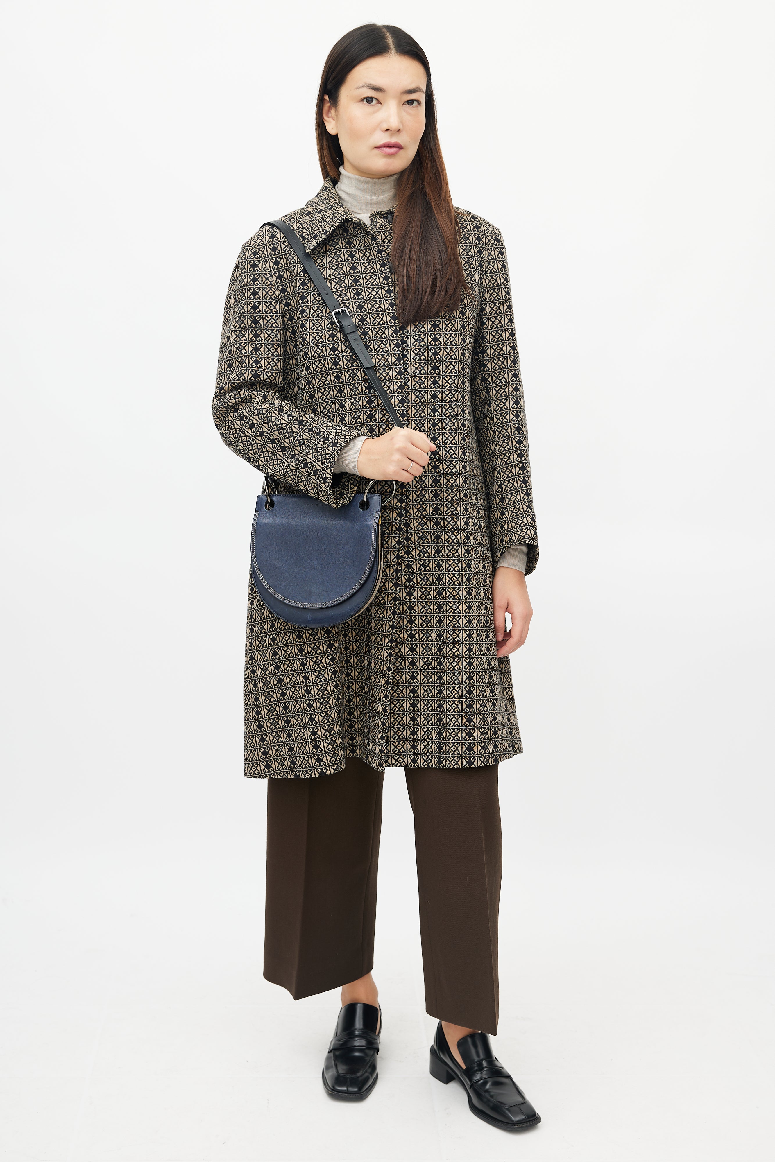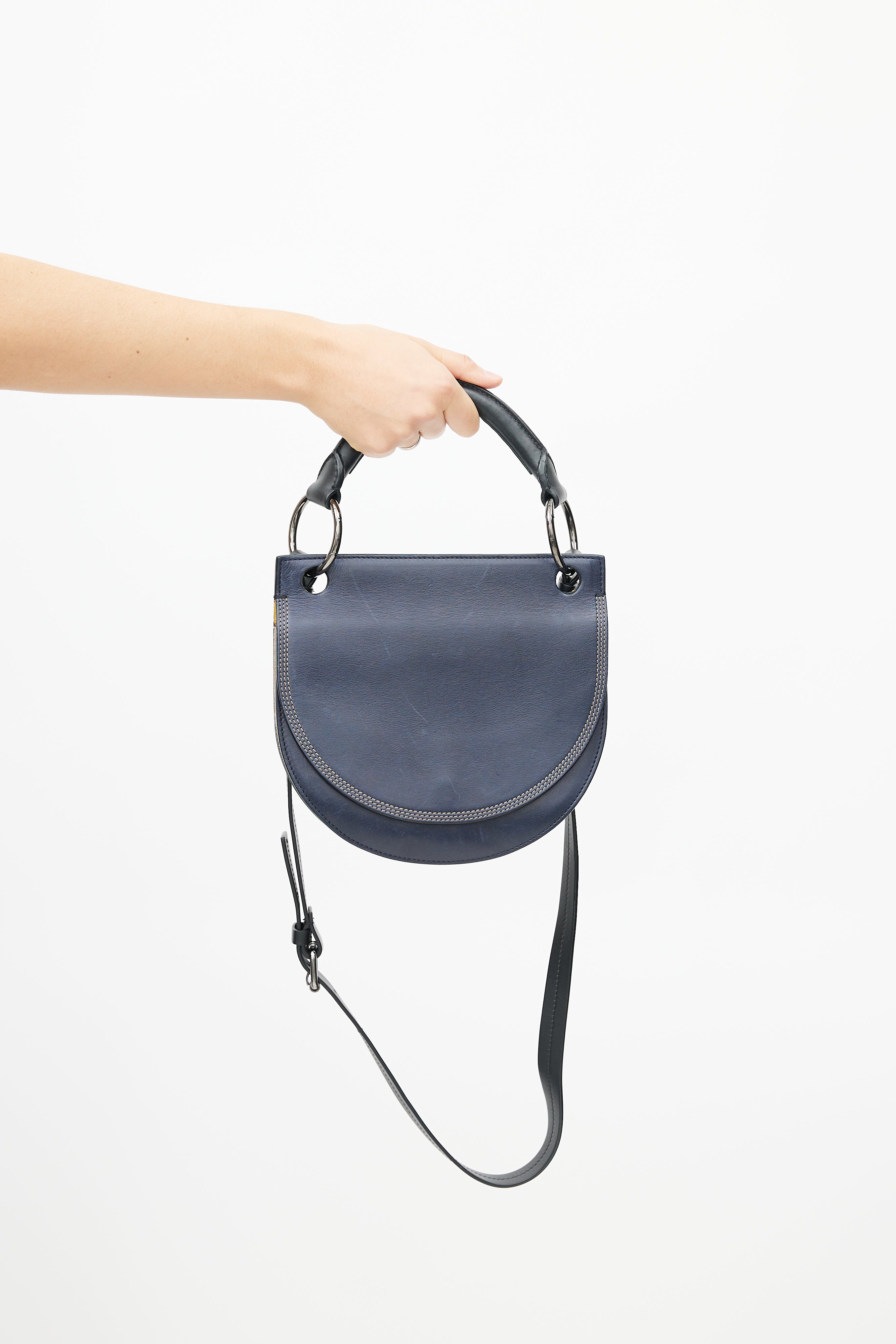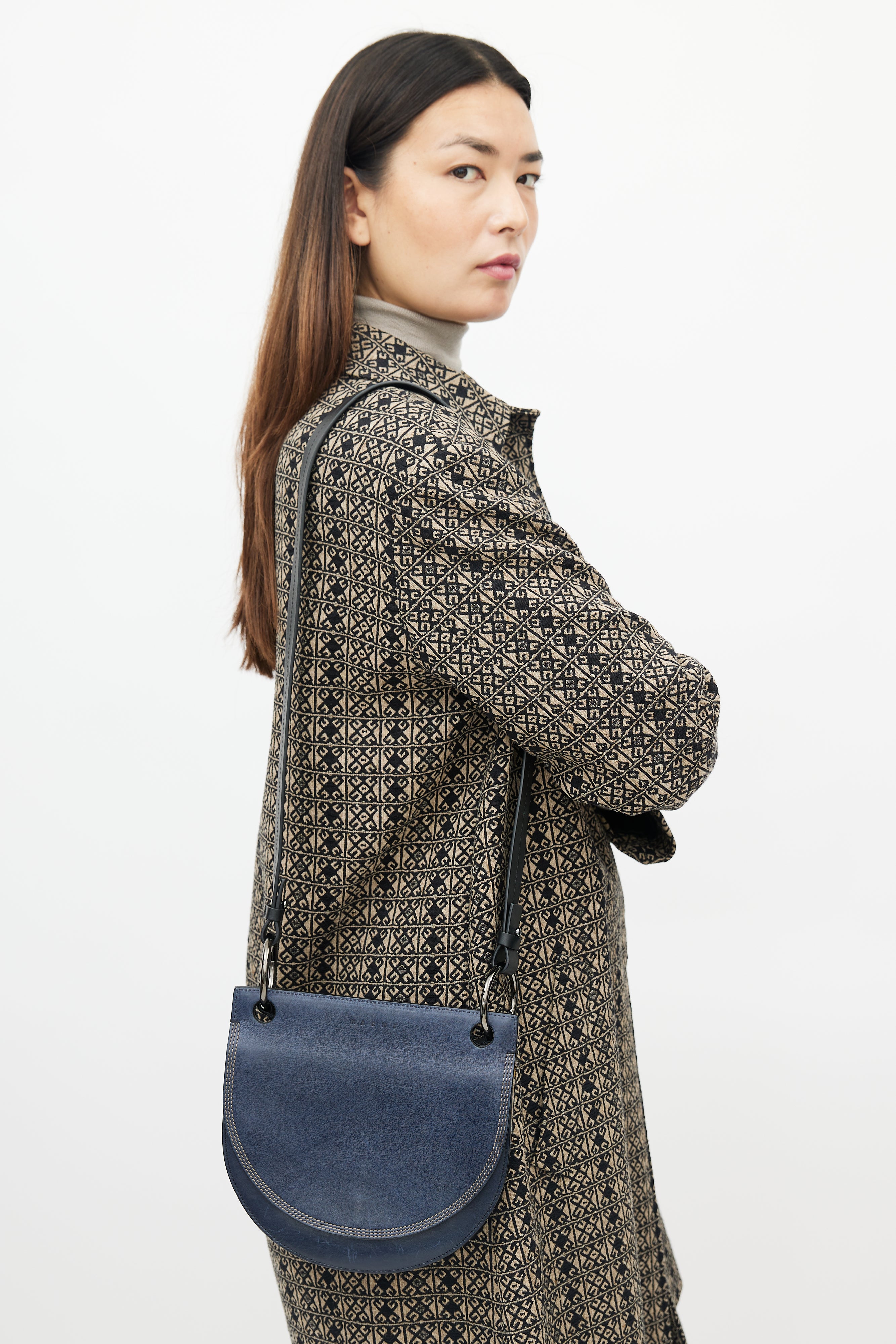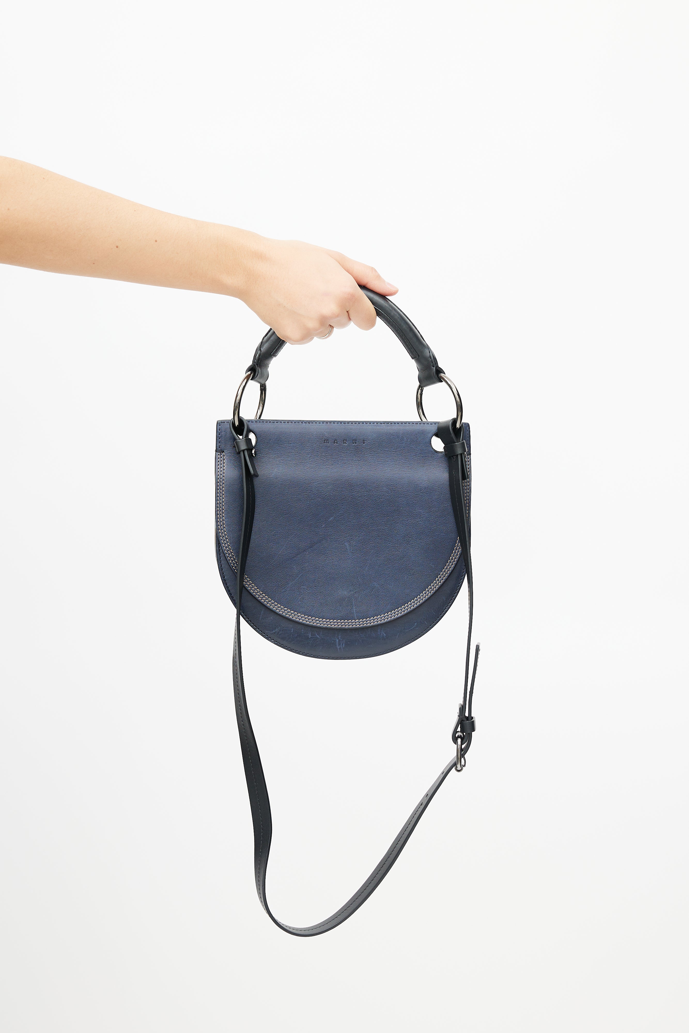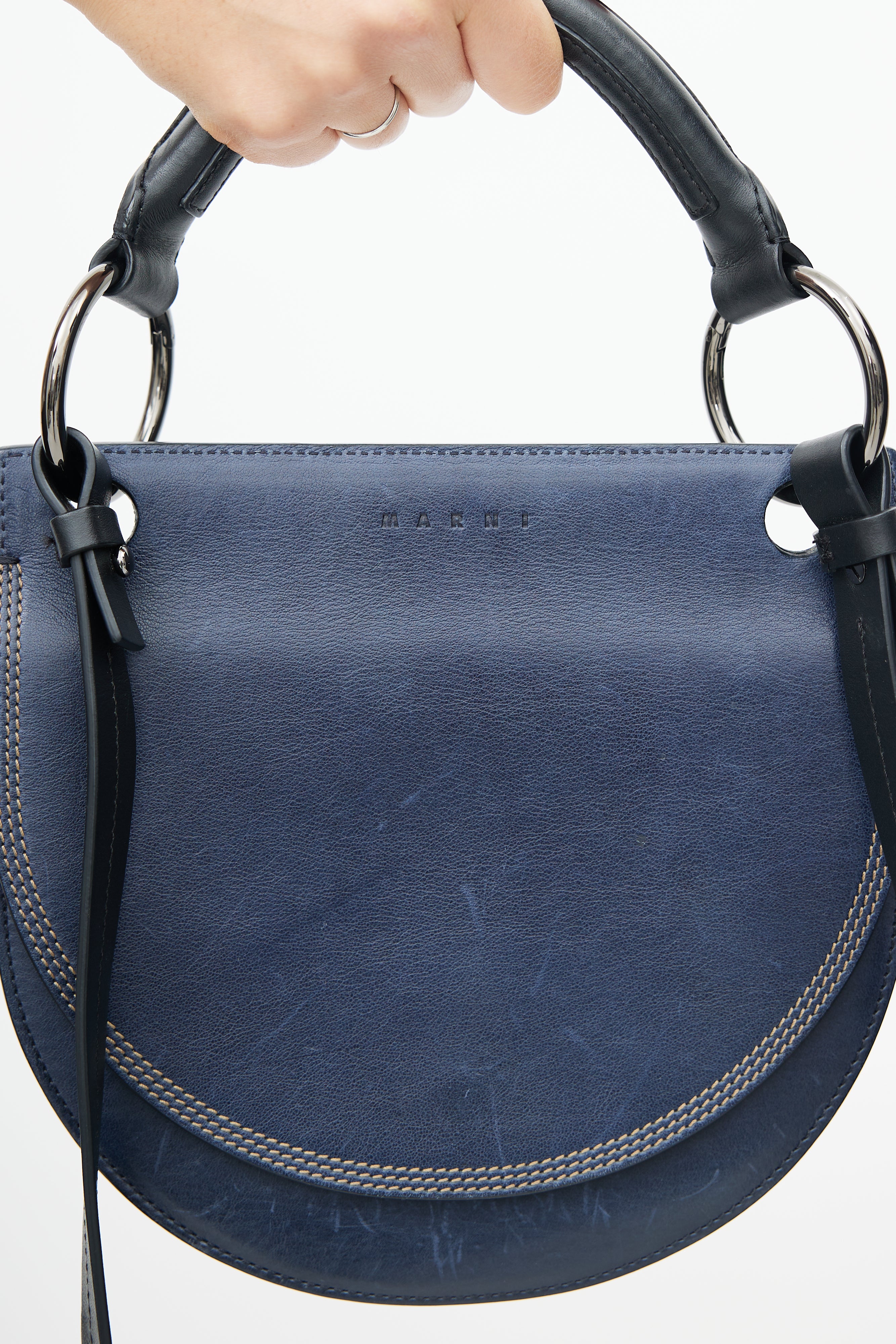 Pre-owned Marni blue saddle bag featuring embossed logo at outer, two snap closure accordion pockets at front and back, yellow raw leather interior, small interior slip pocket with logo, rolled top handle and flat leather adjustable shoulder strap.