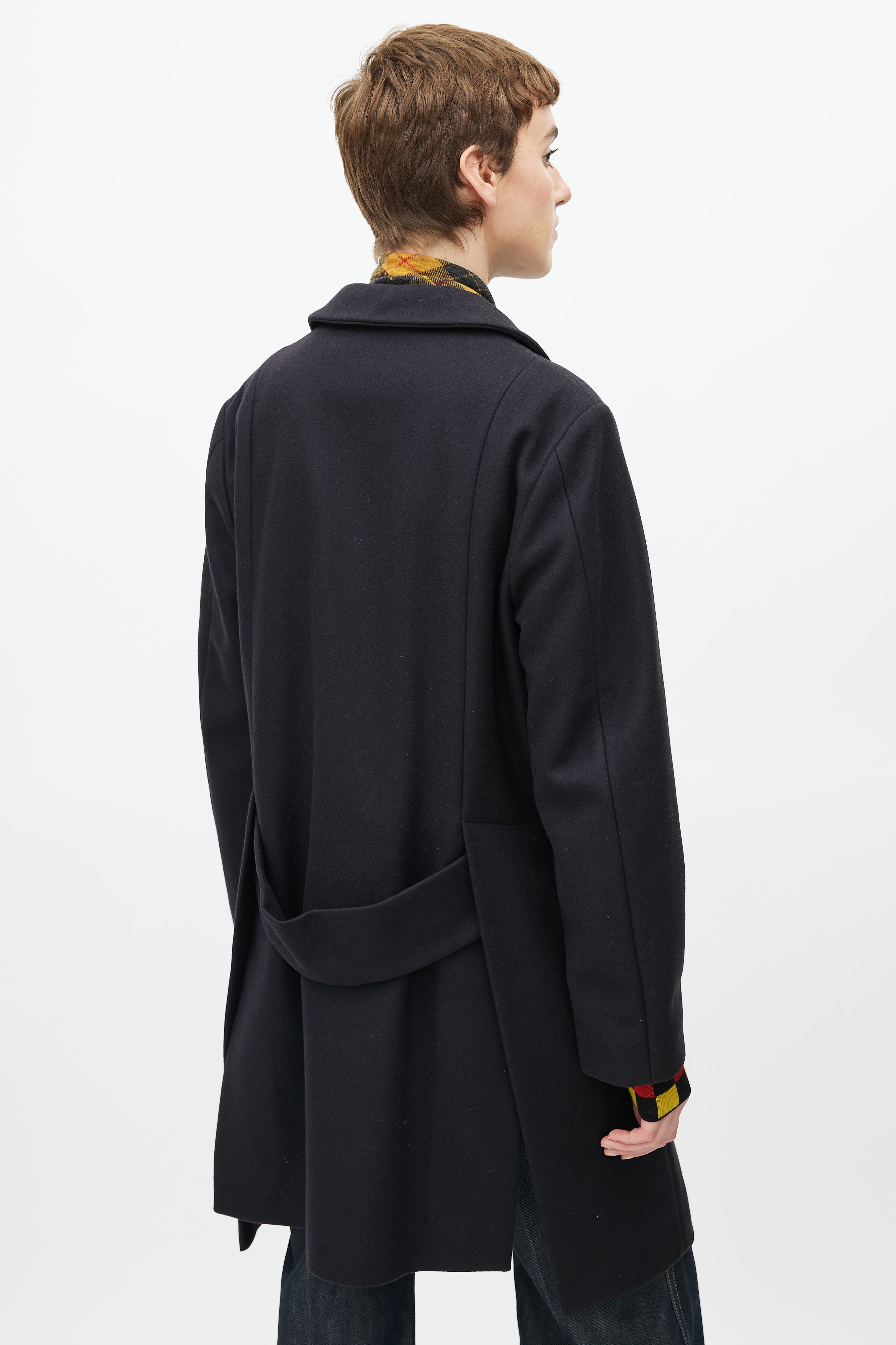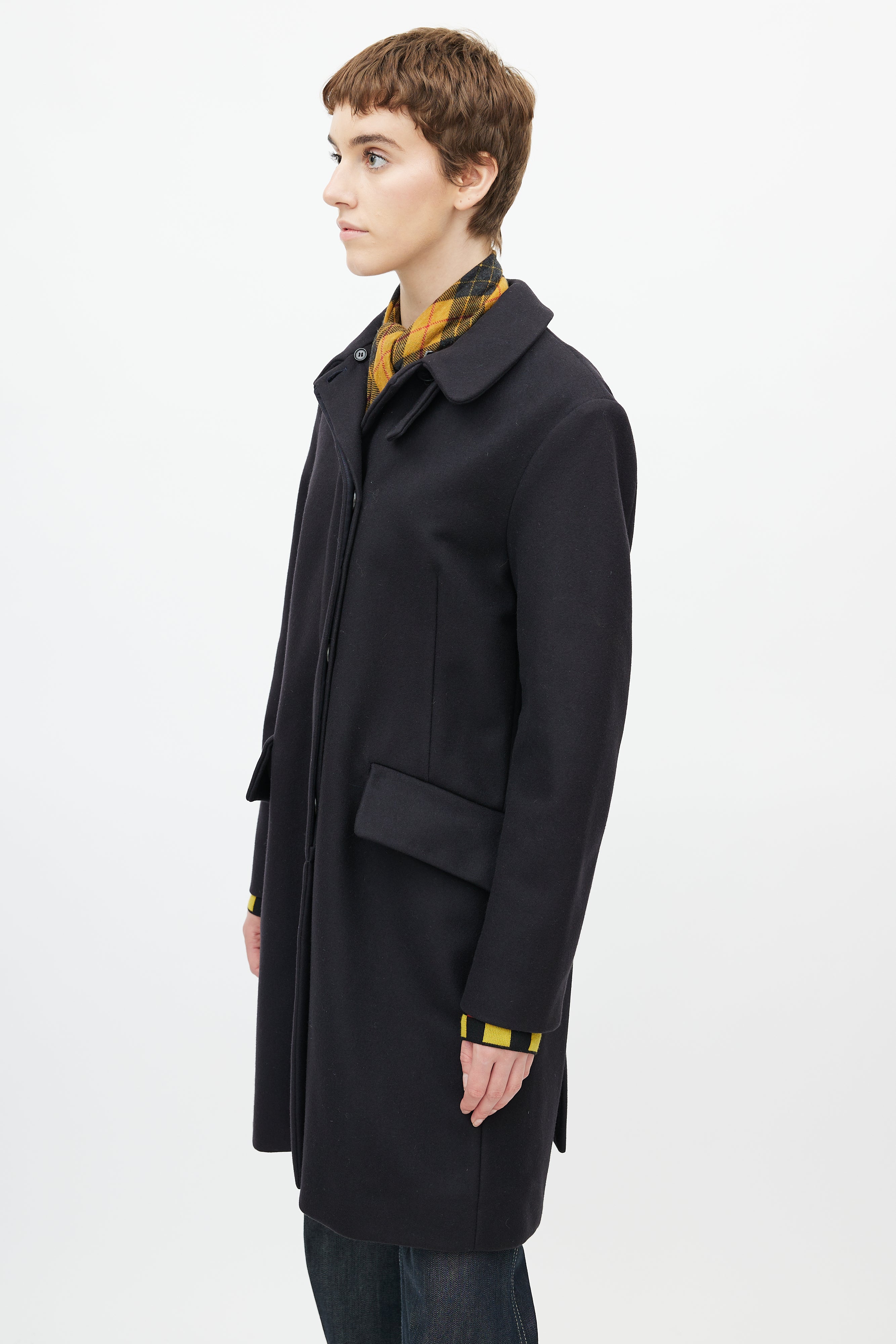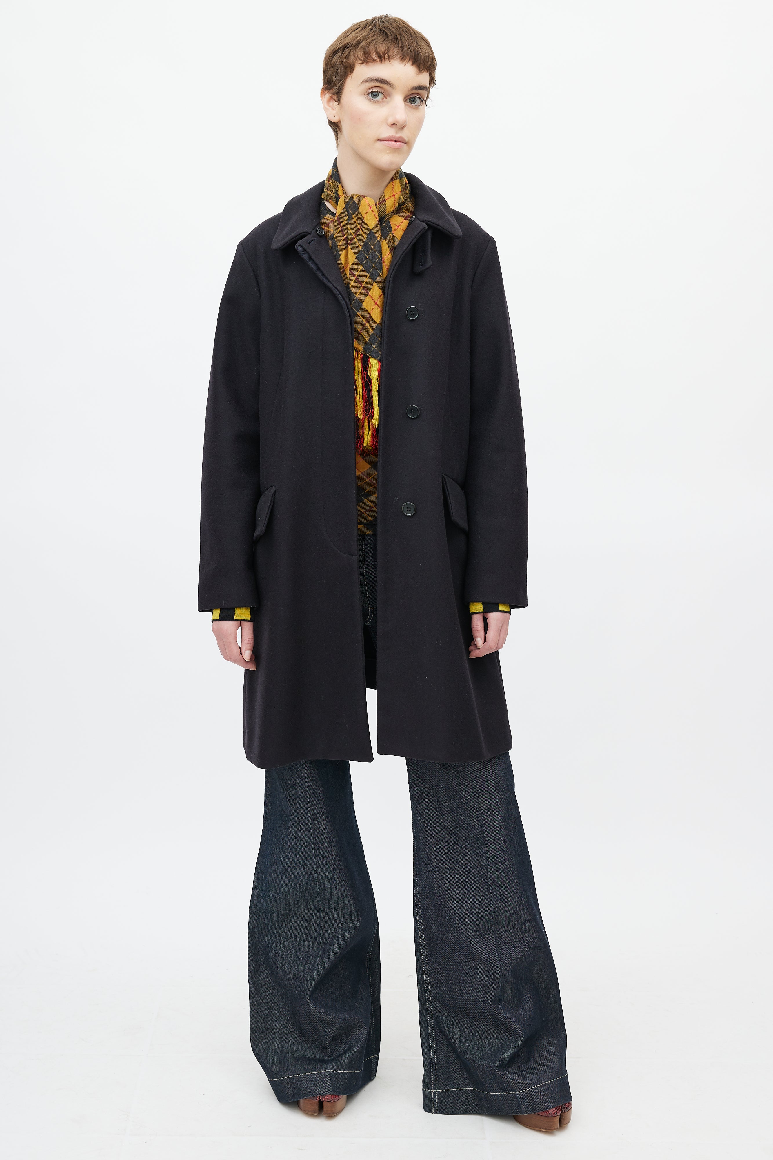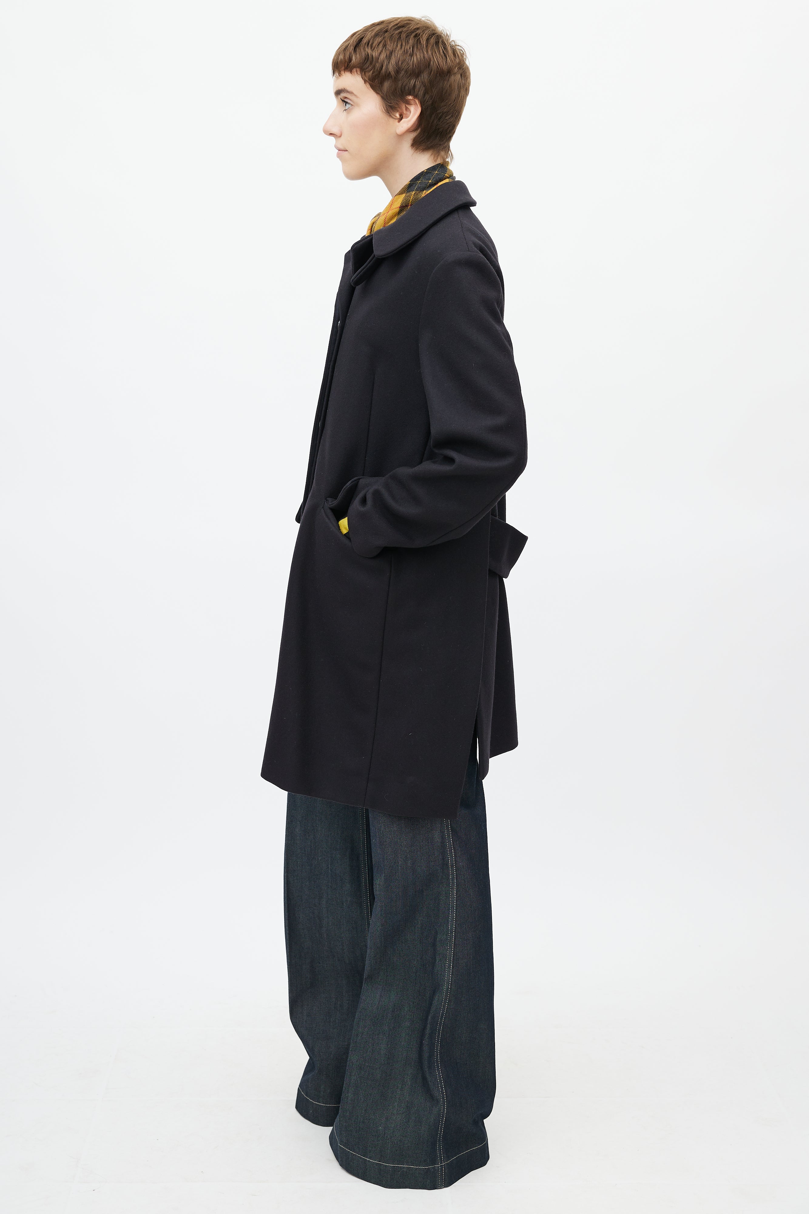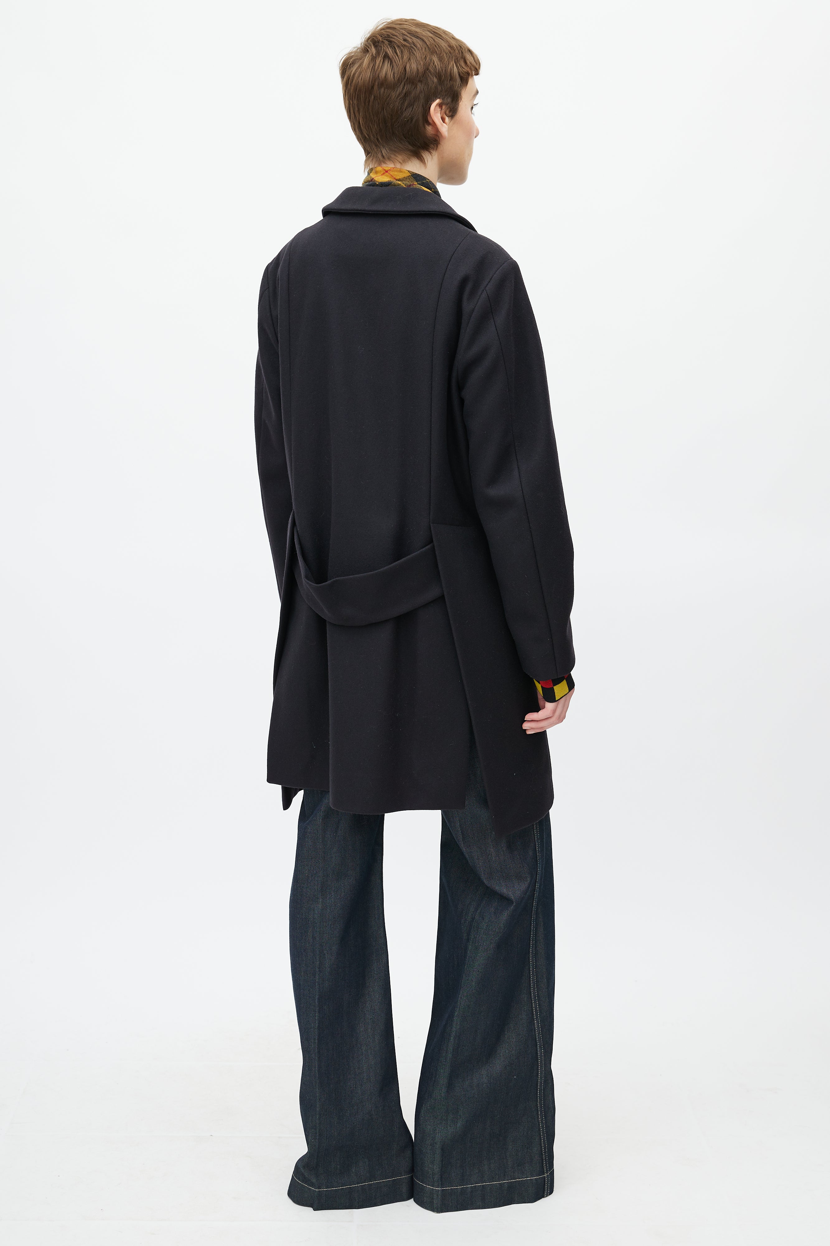Pre-owned Fall 2013 Marni black coat featuring classic collar, button up front, two flap pockets at hips, half waist belt at back, and dual back vents.