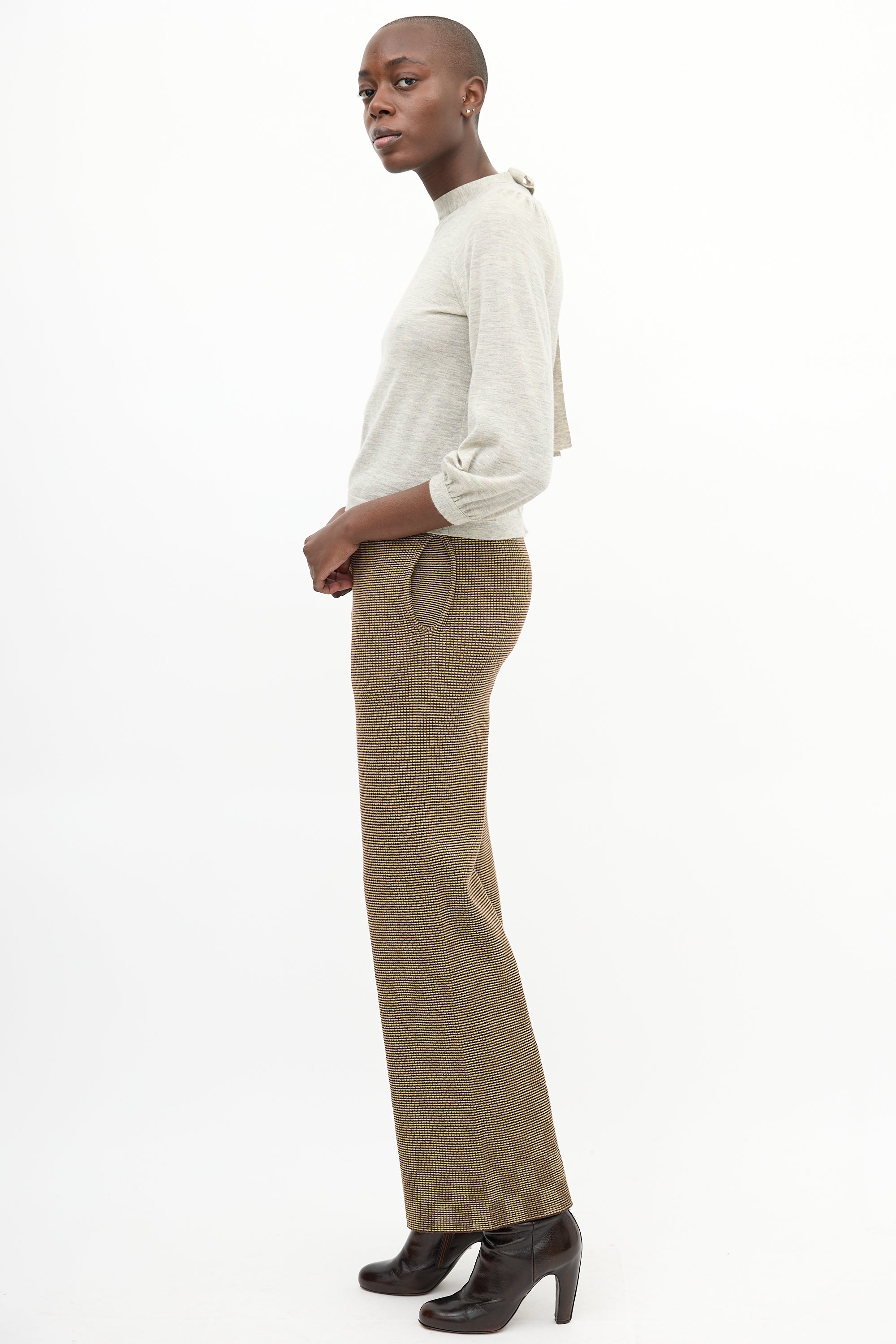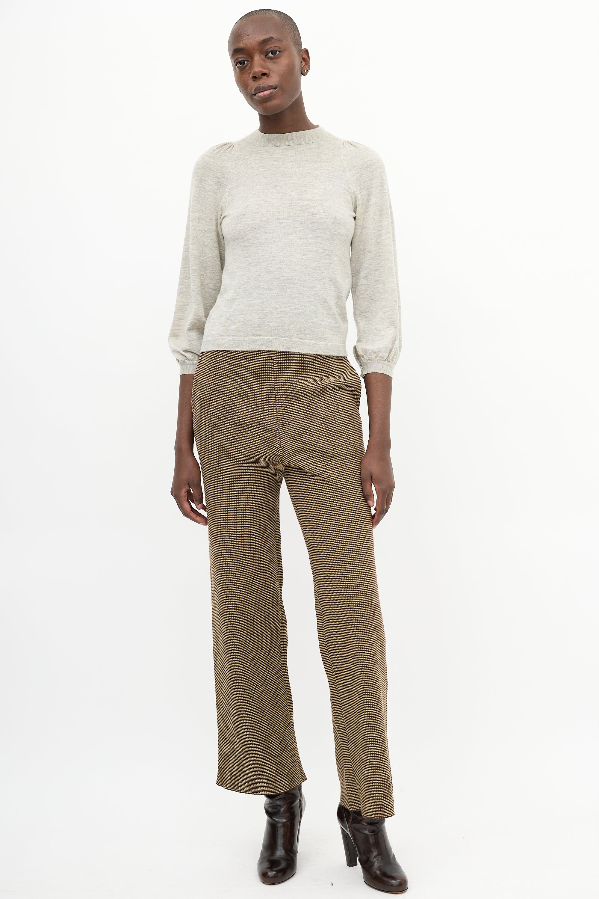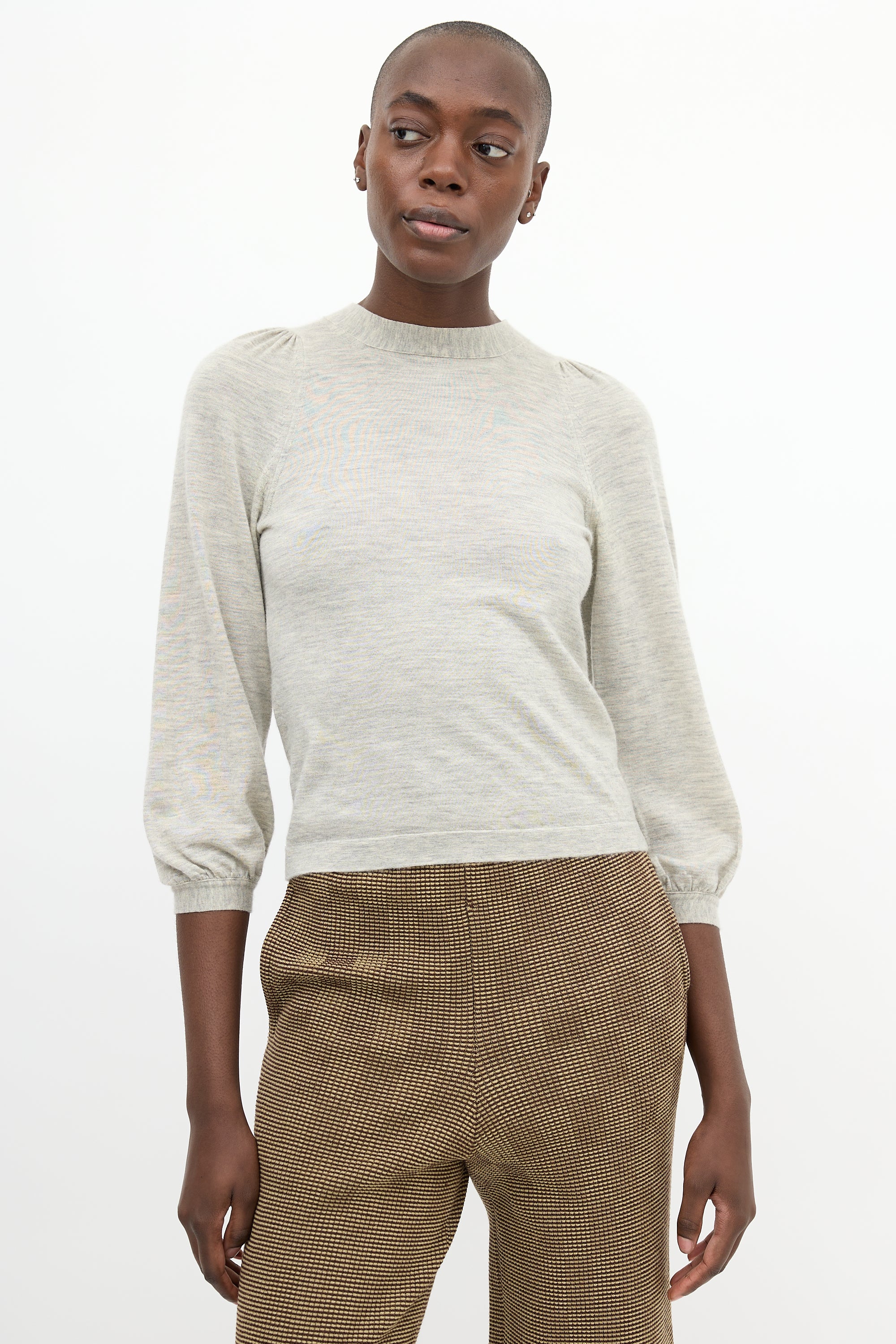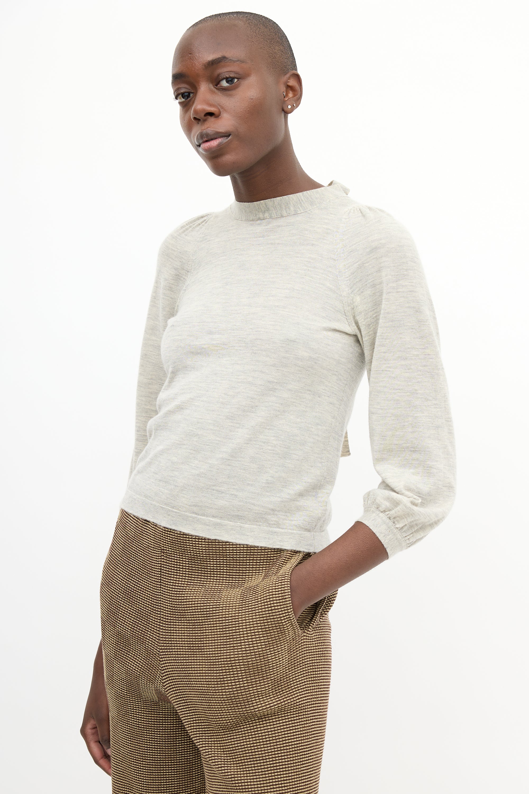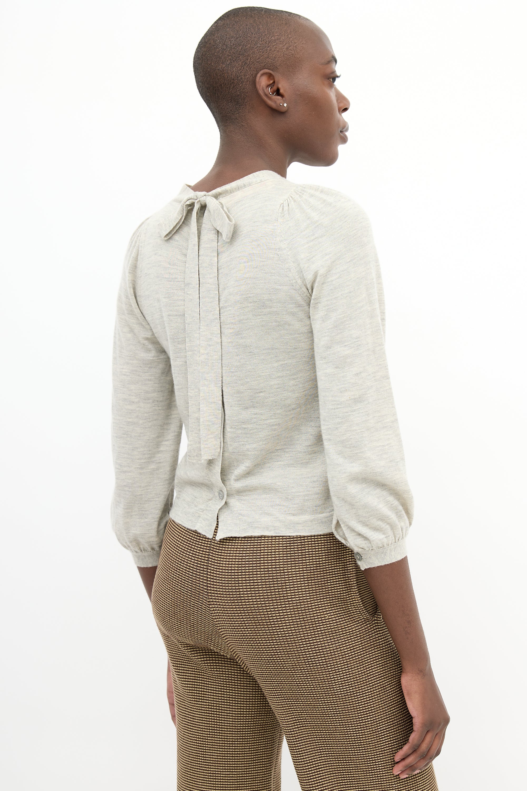 Pre-owned Marni heathered grey cashmere sweater featuring stand collar with back tie neck, gathered shoulders, button up back, and quarter length sleeves with buttoned cuffs.