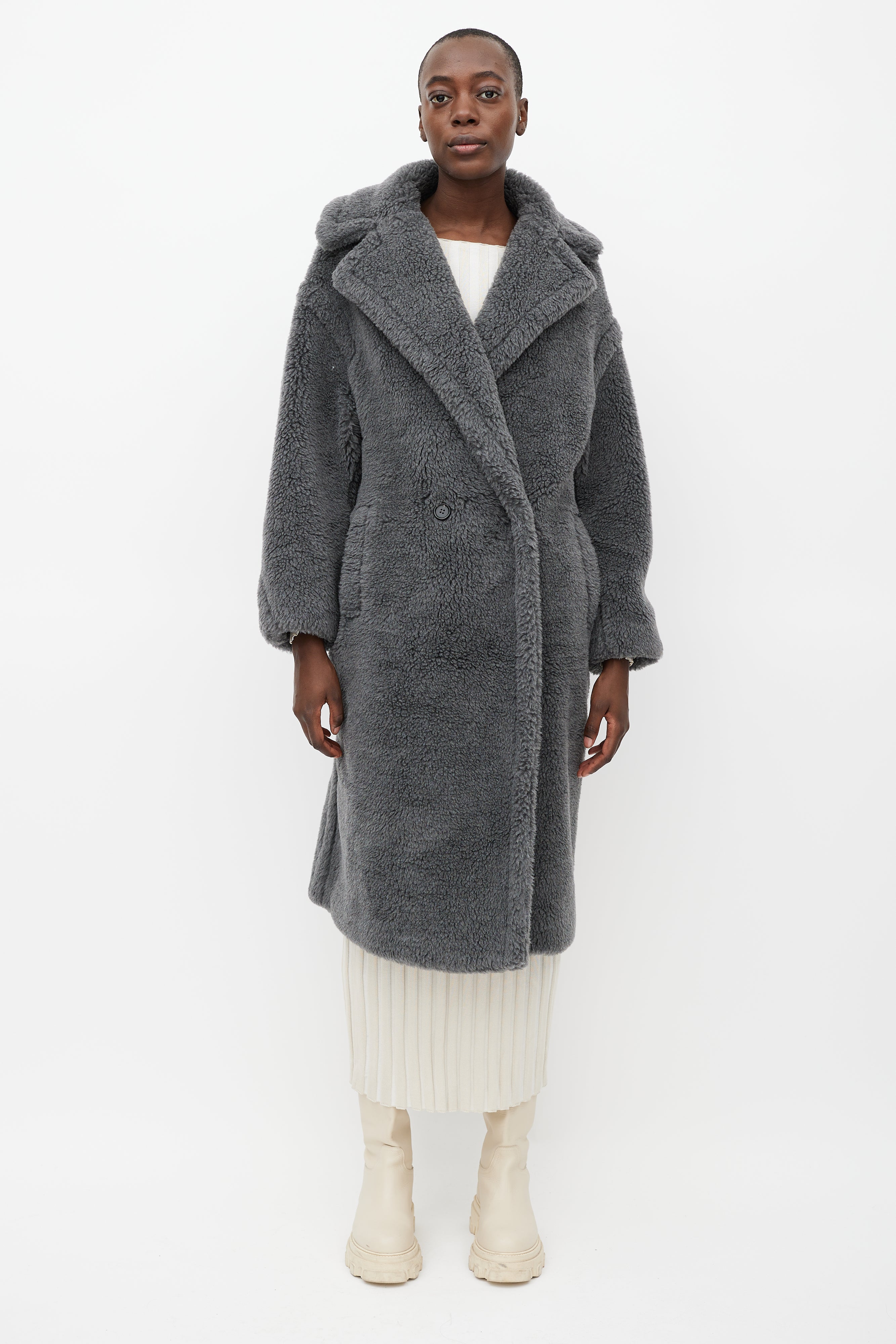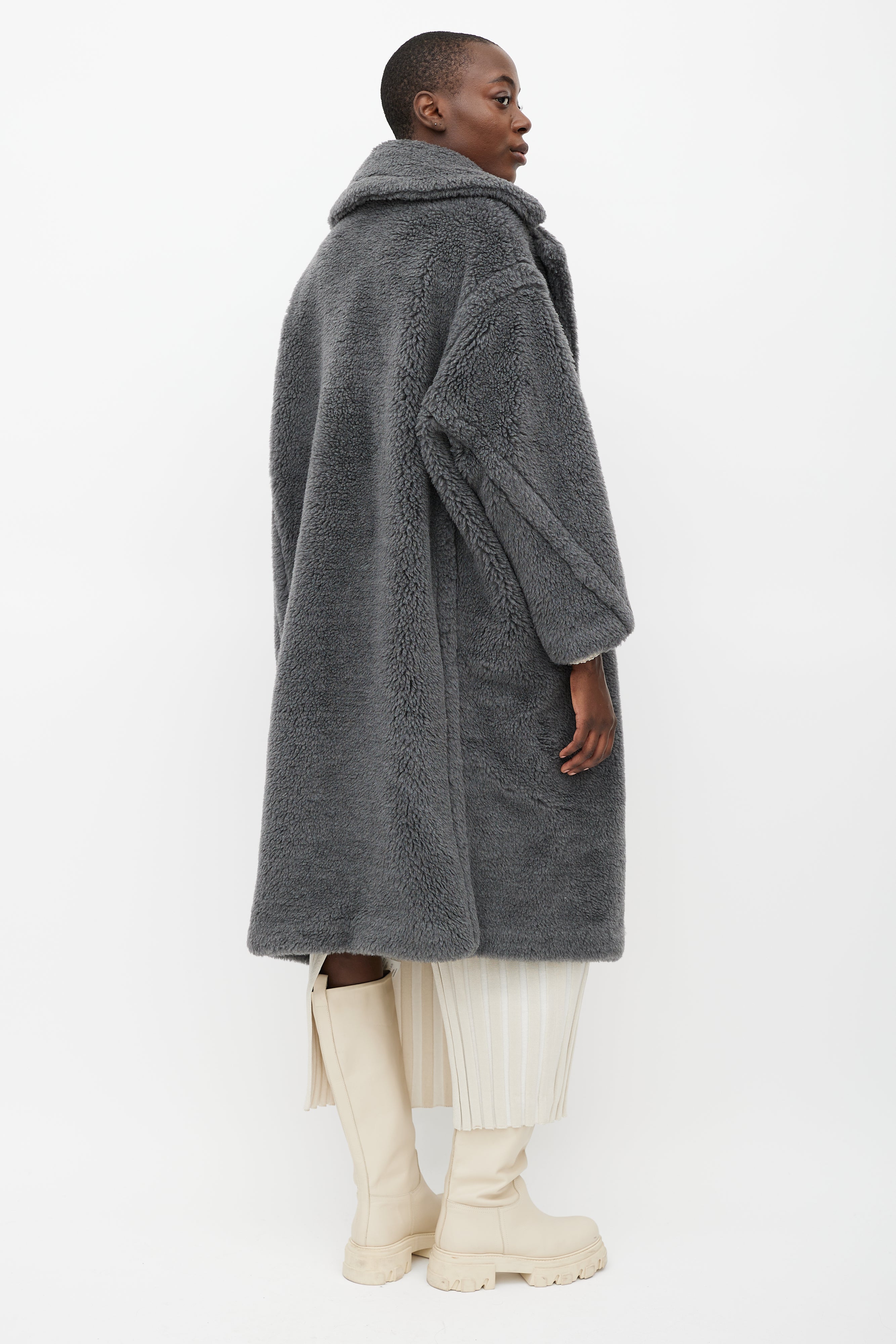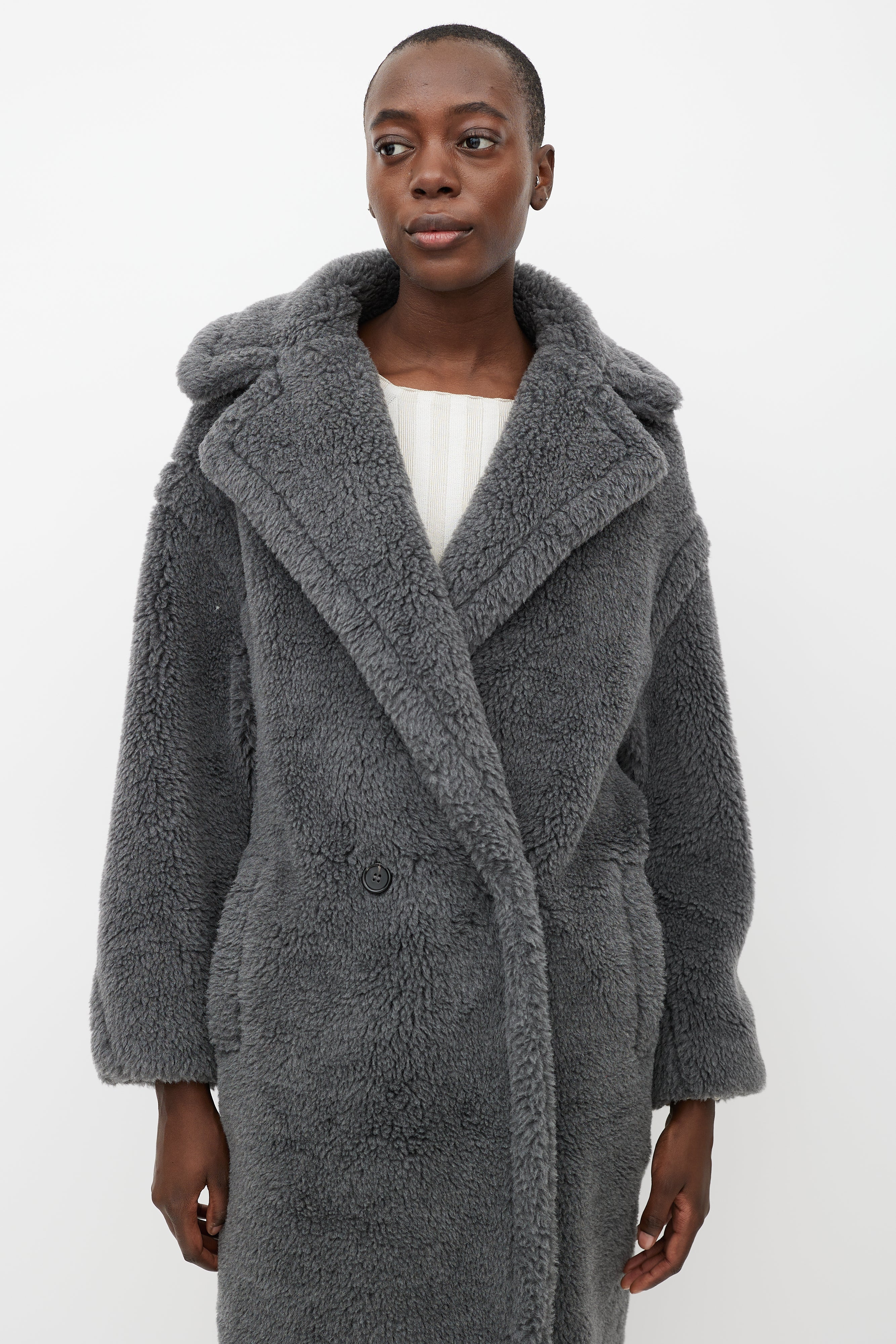 Pre-owned Max Mara medium grey wool Teddy Bear Icon coat featuring a notched lapel, two slip pockets at hip, and double breasted button closure. Lined.