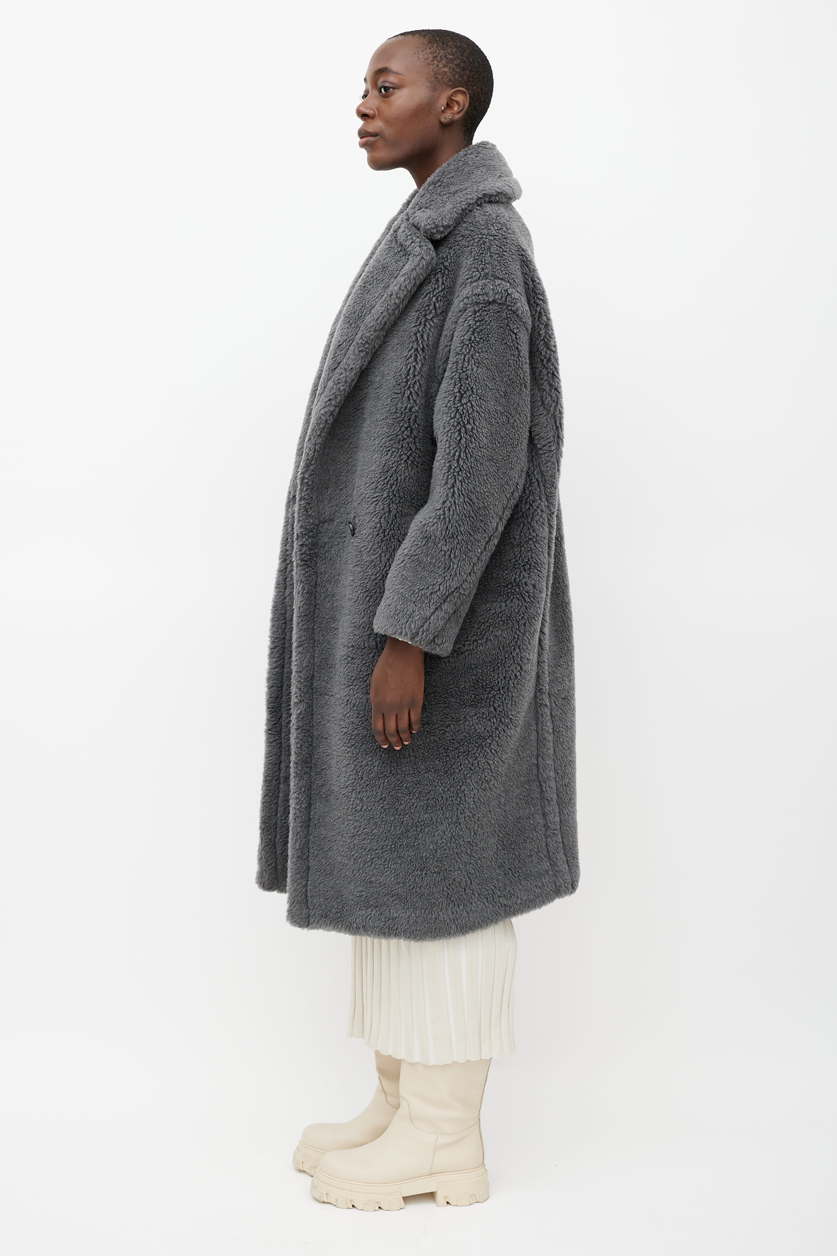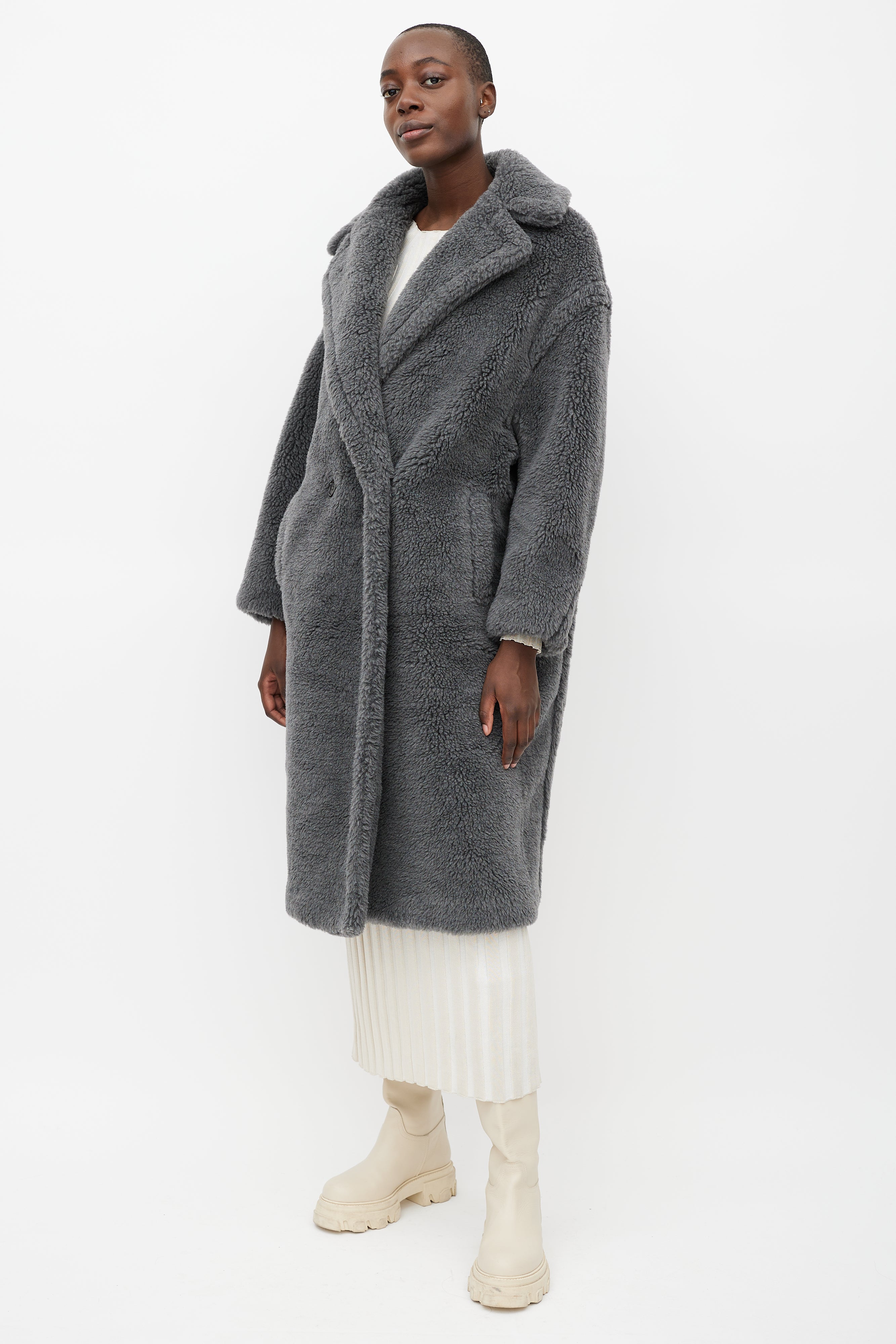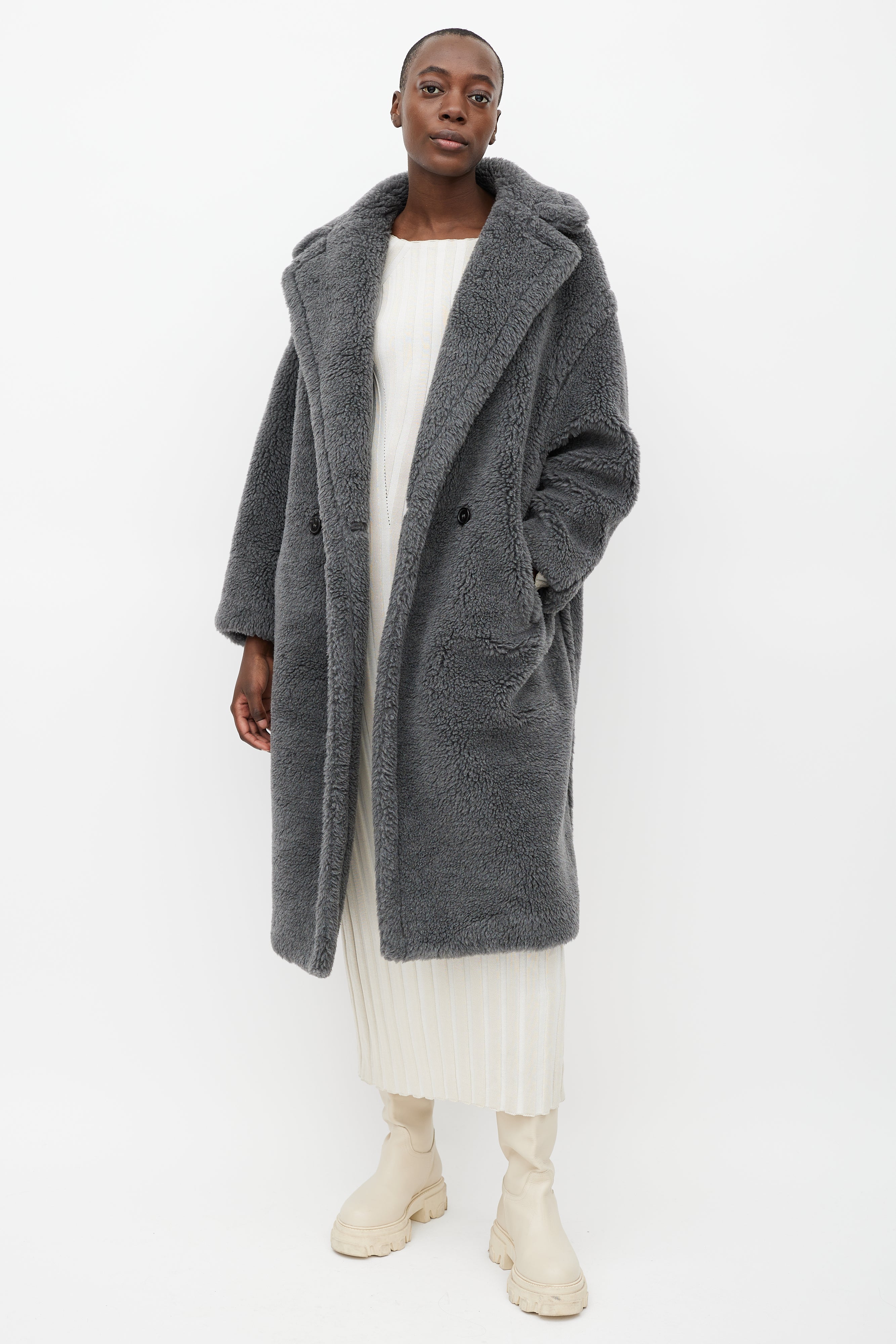 Pre-owned Max Mara medium grey wool Teddy Bear Icon coat featuring a notched lapel, two slip pockets at hip, and double breasted button closure. Lined.