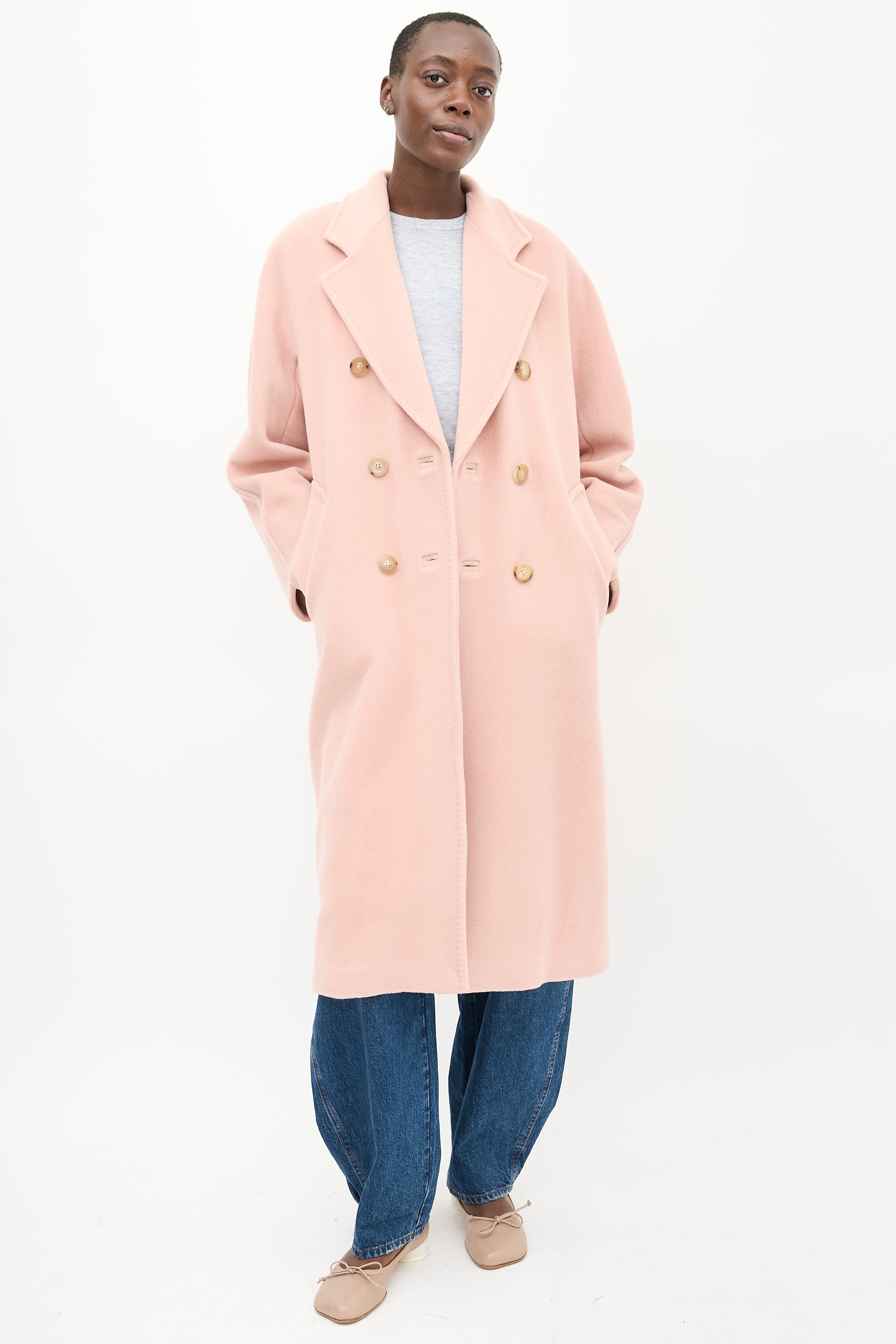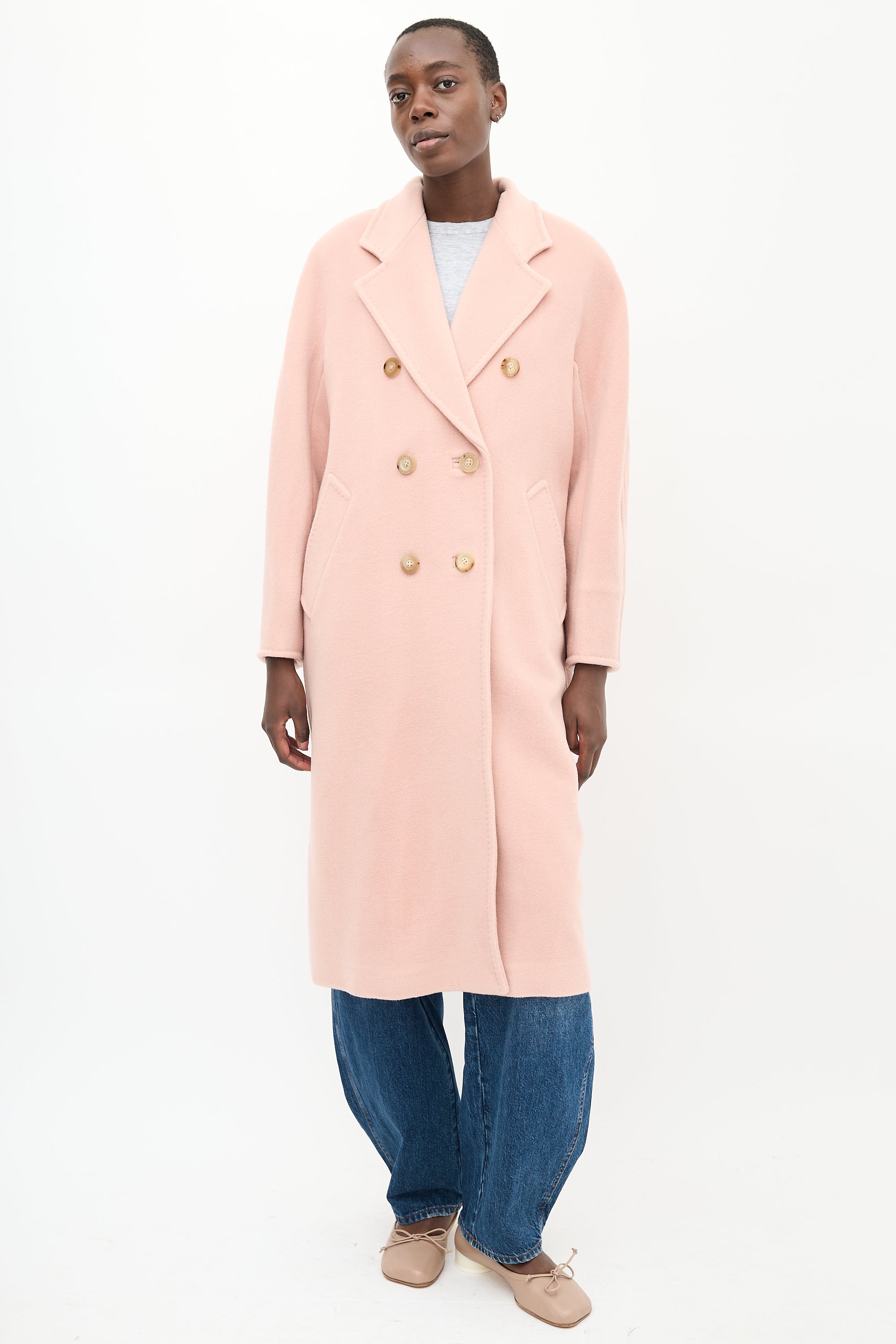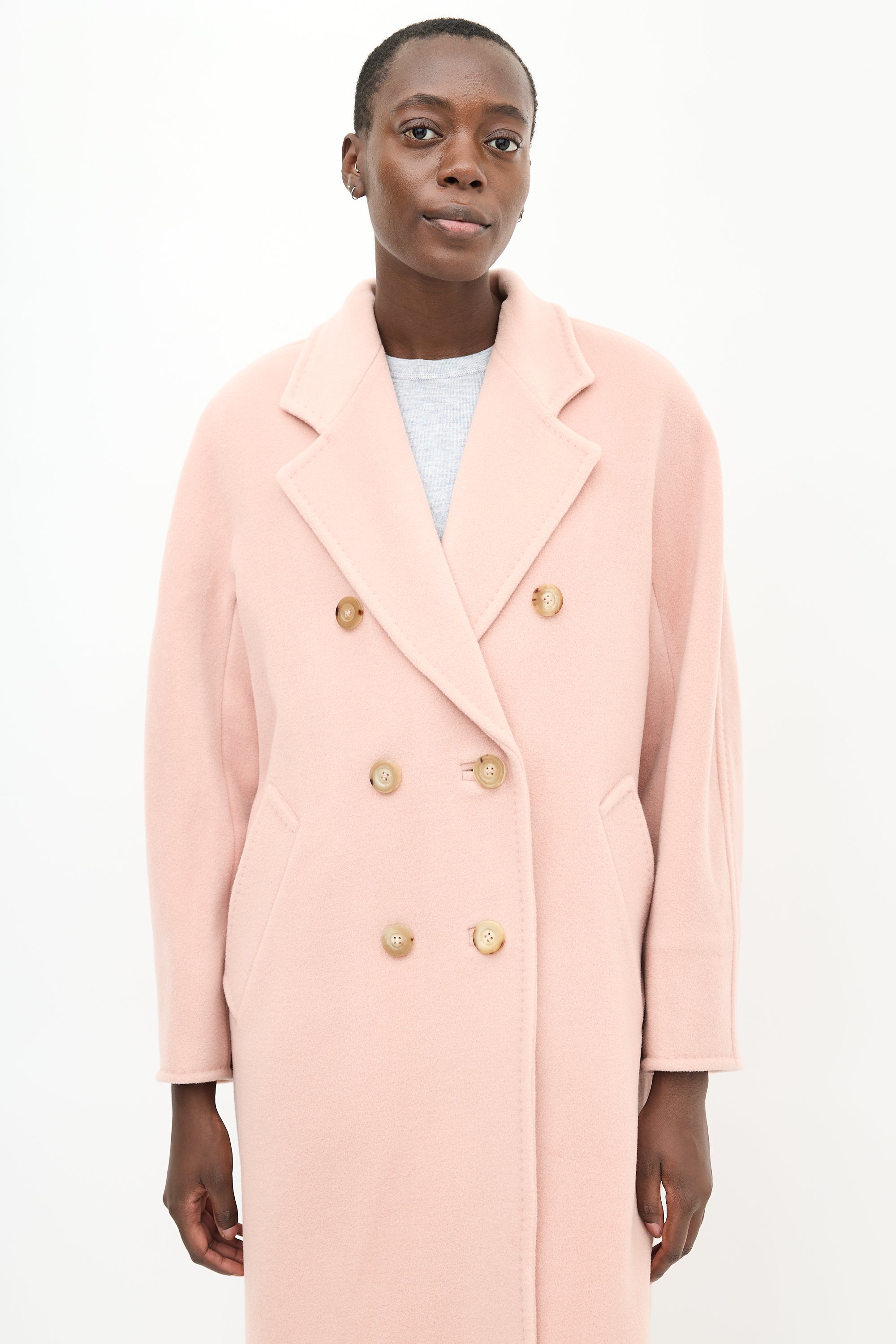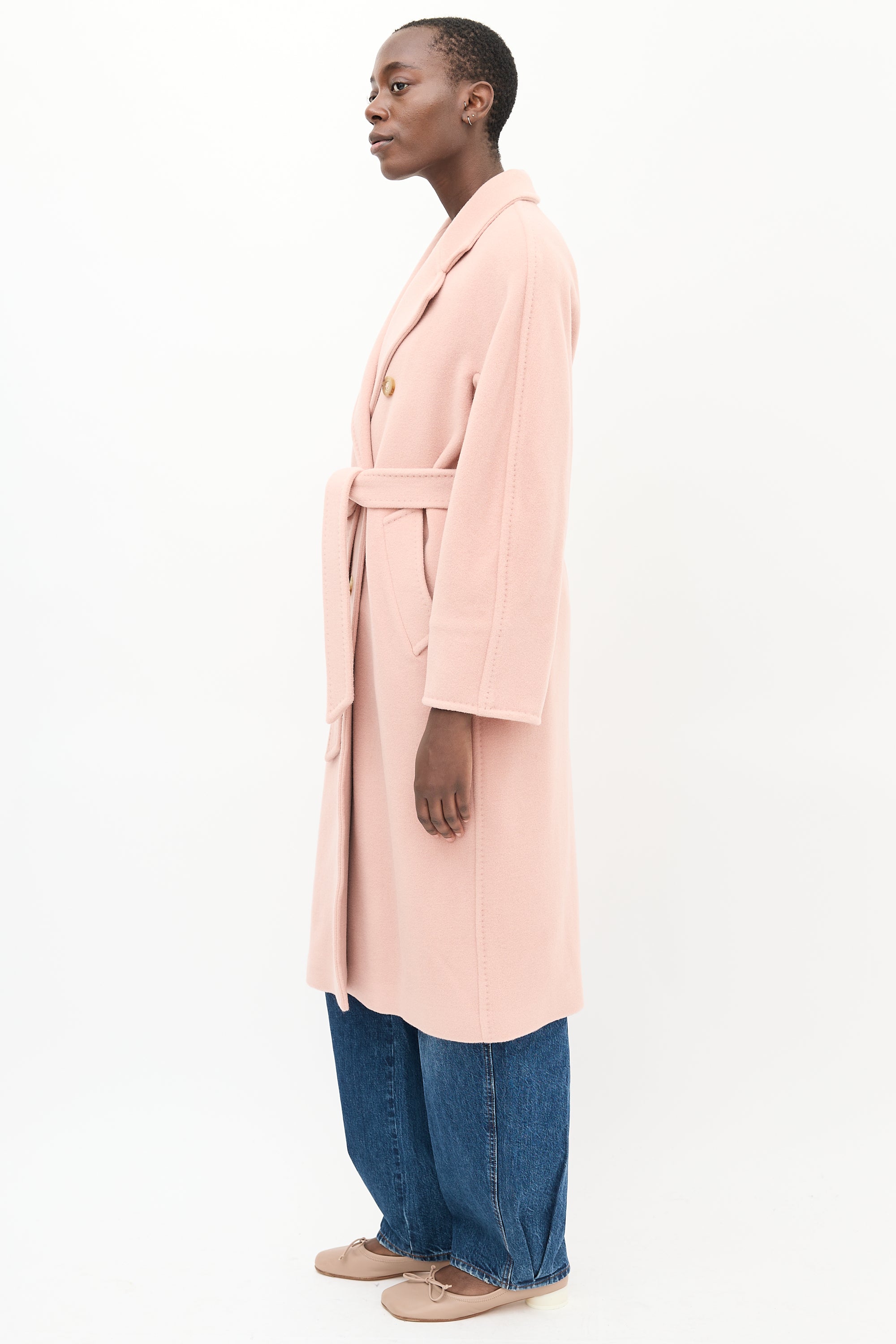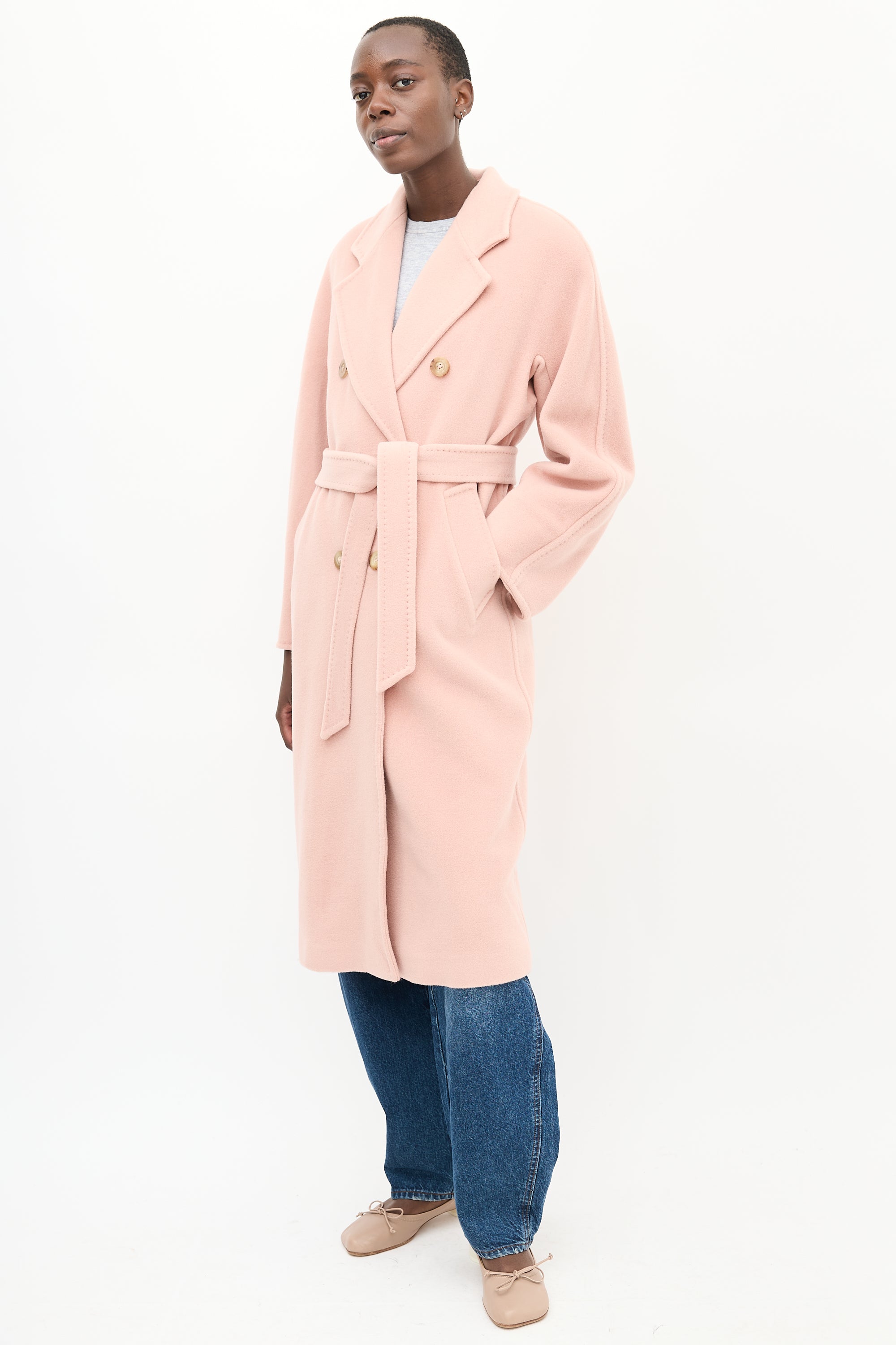 Pre-owned Max Mara pink wool coat featuring notched lapel, self tie waist belt, two slip pockets at hips, and double breasted button up front. Lined.