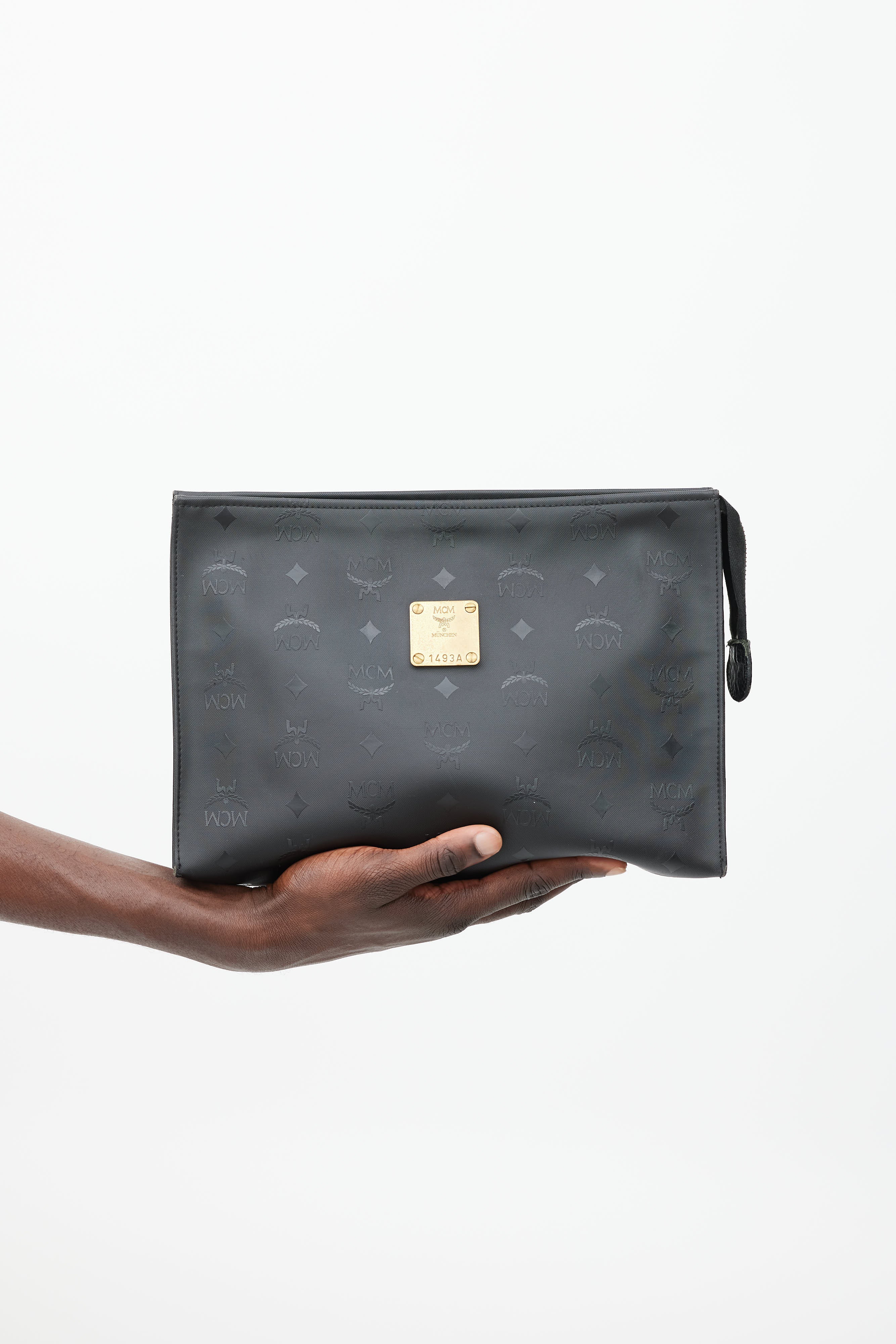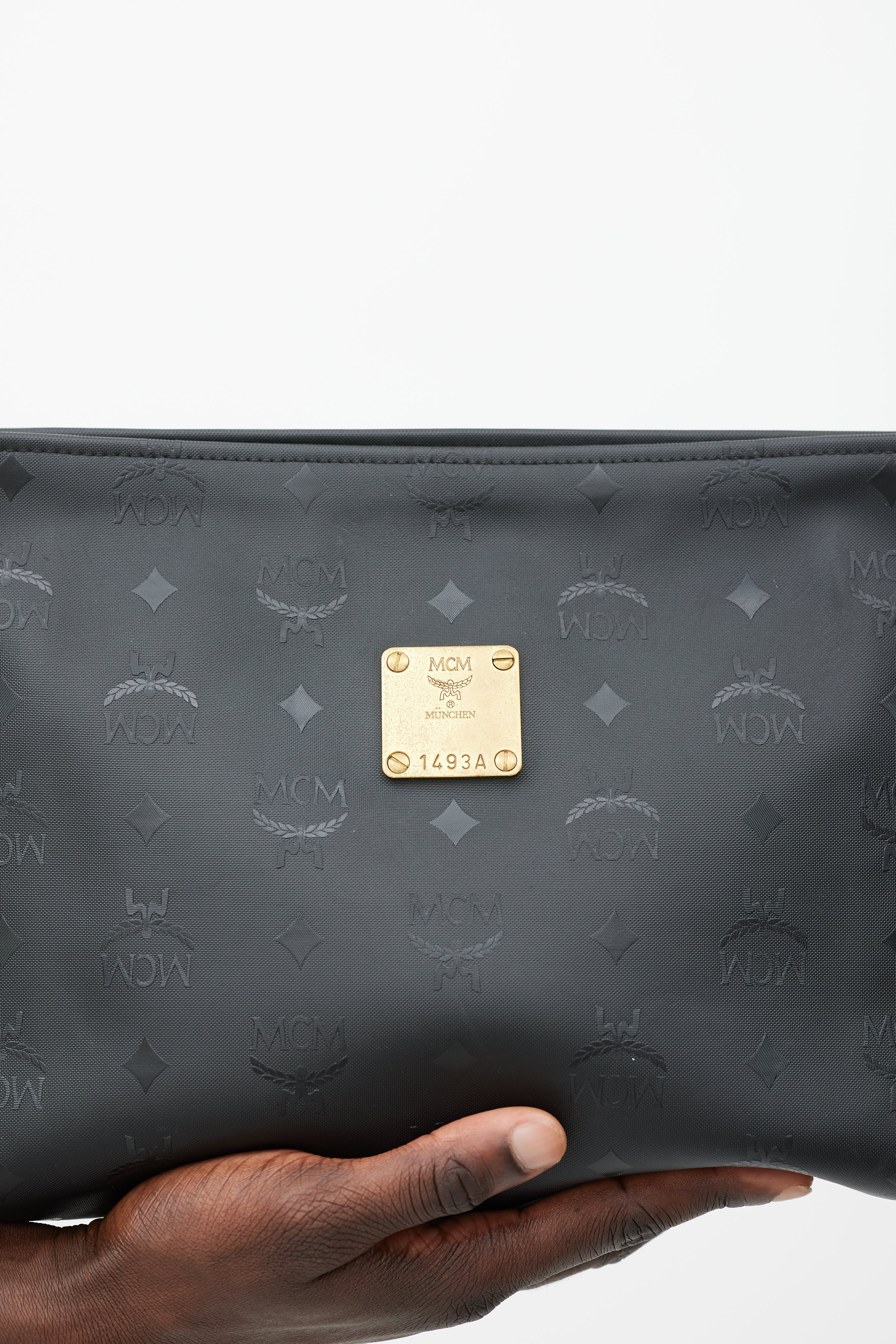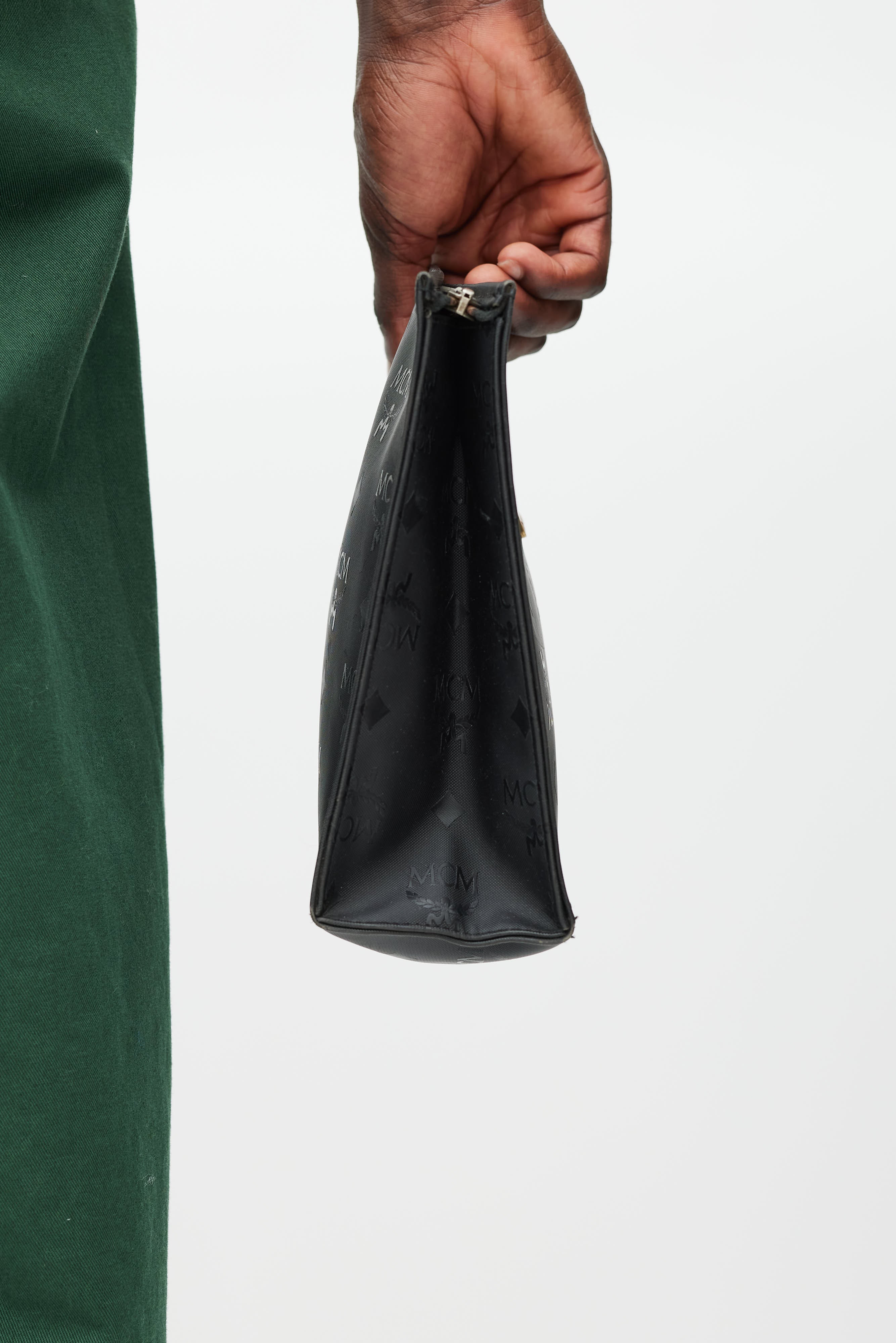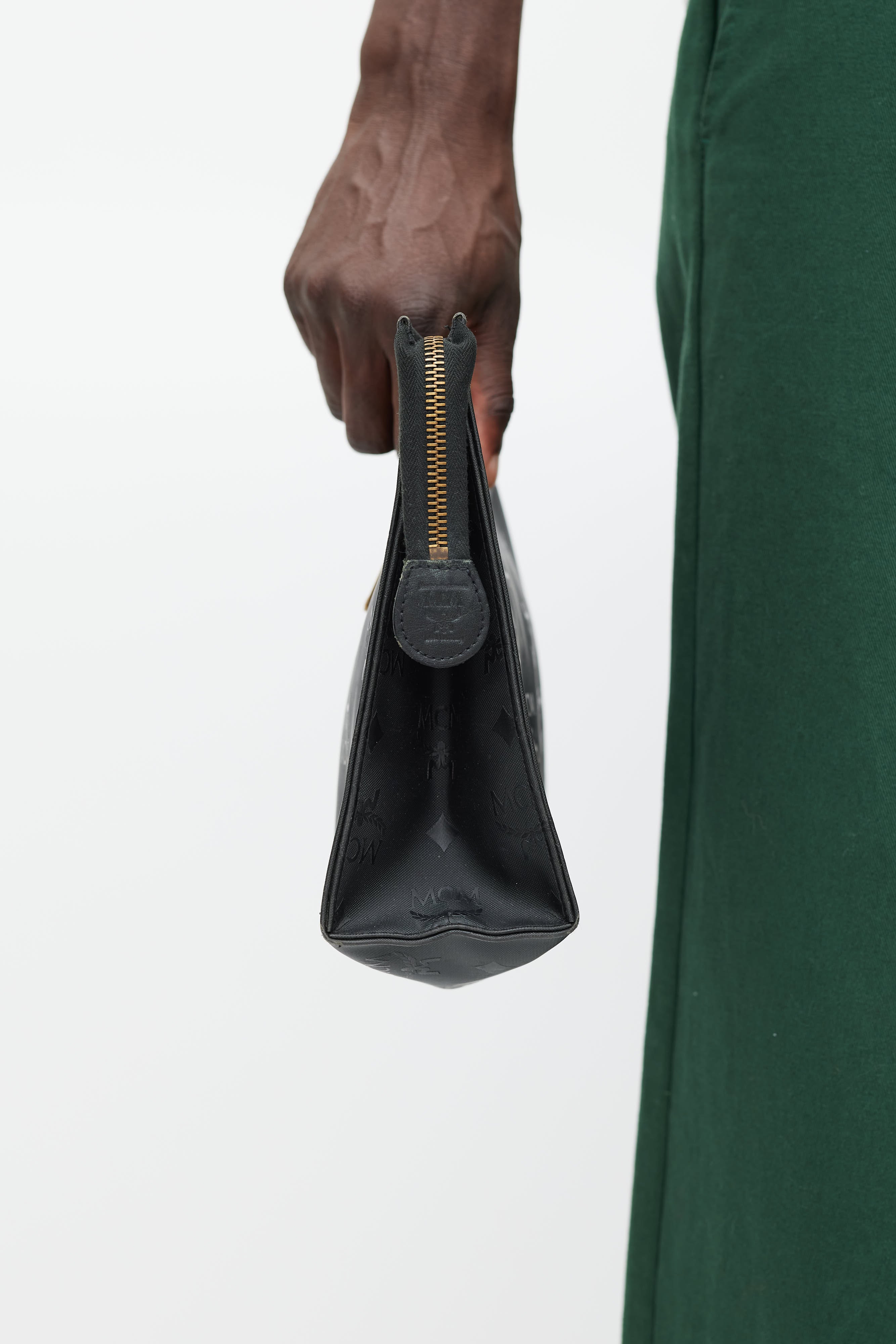 Pre owned MCM black nylon pouch featuring signature monogram print throughout, gold tone plaque with engraved logo at front, top zip closure, and single leather lined compartment with logo stamp.