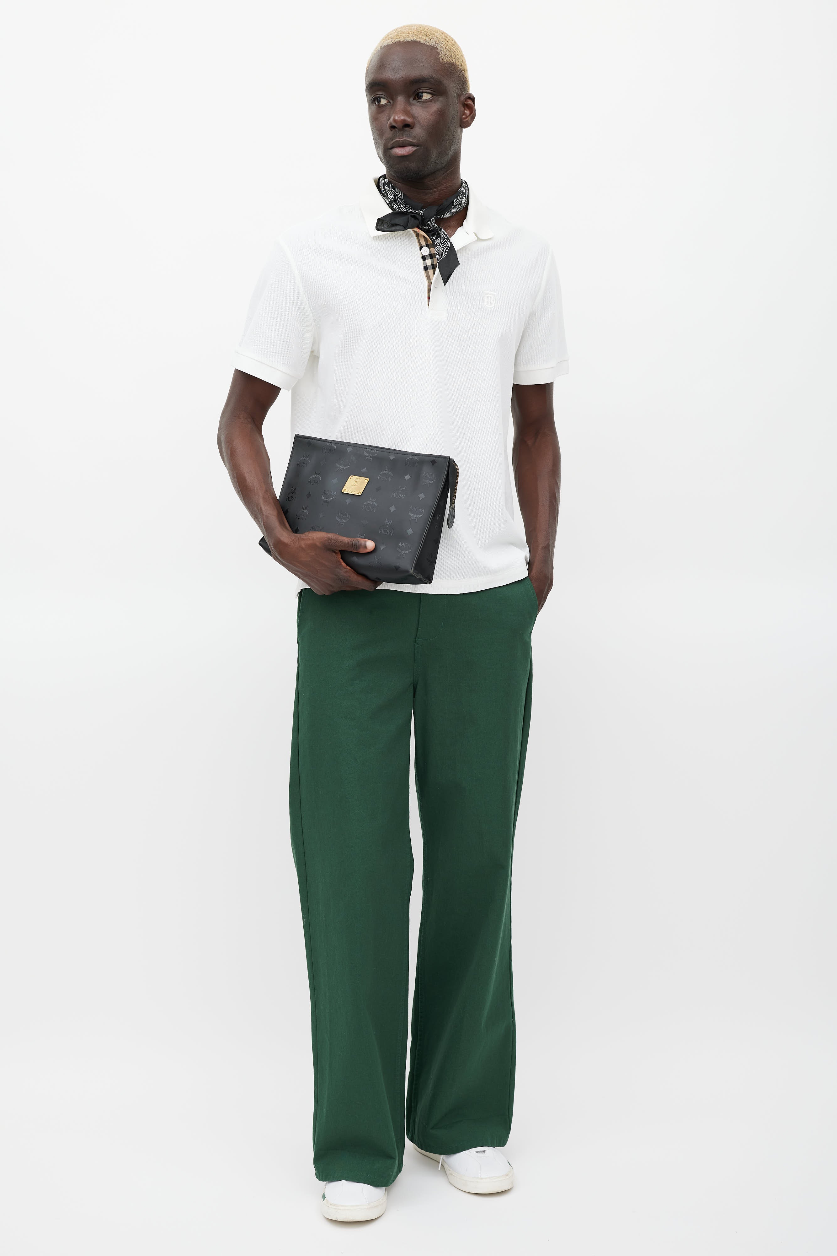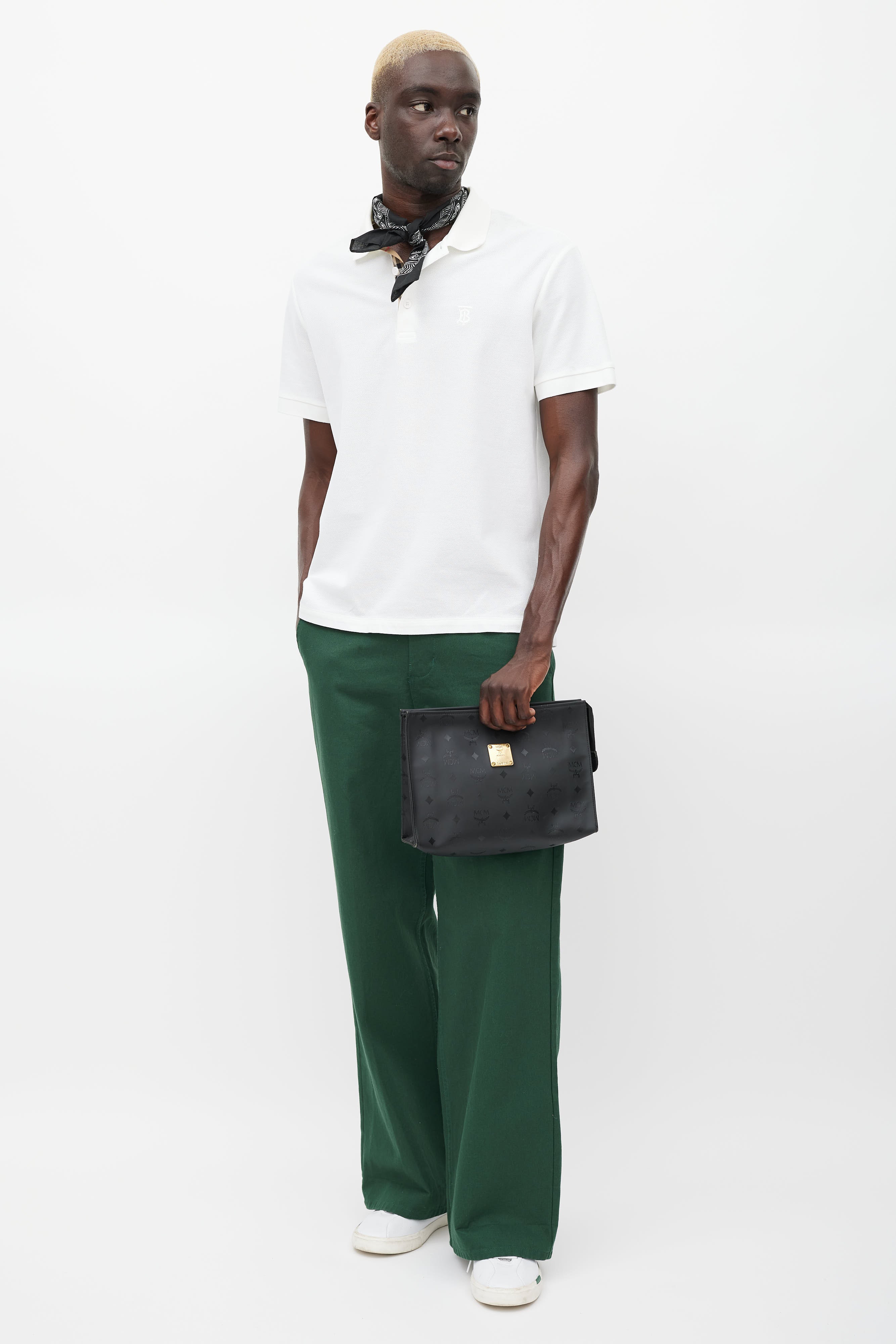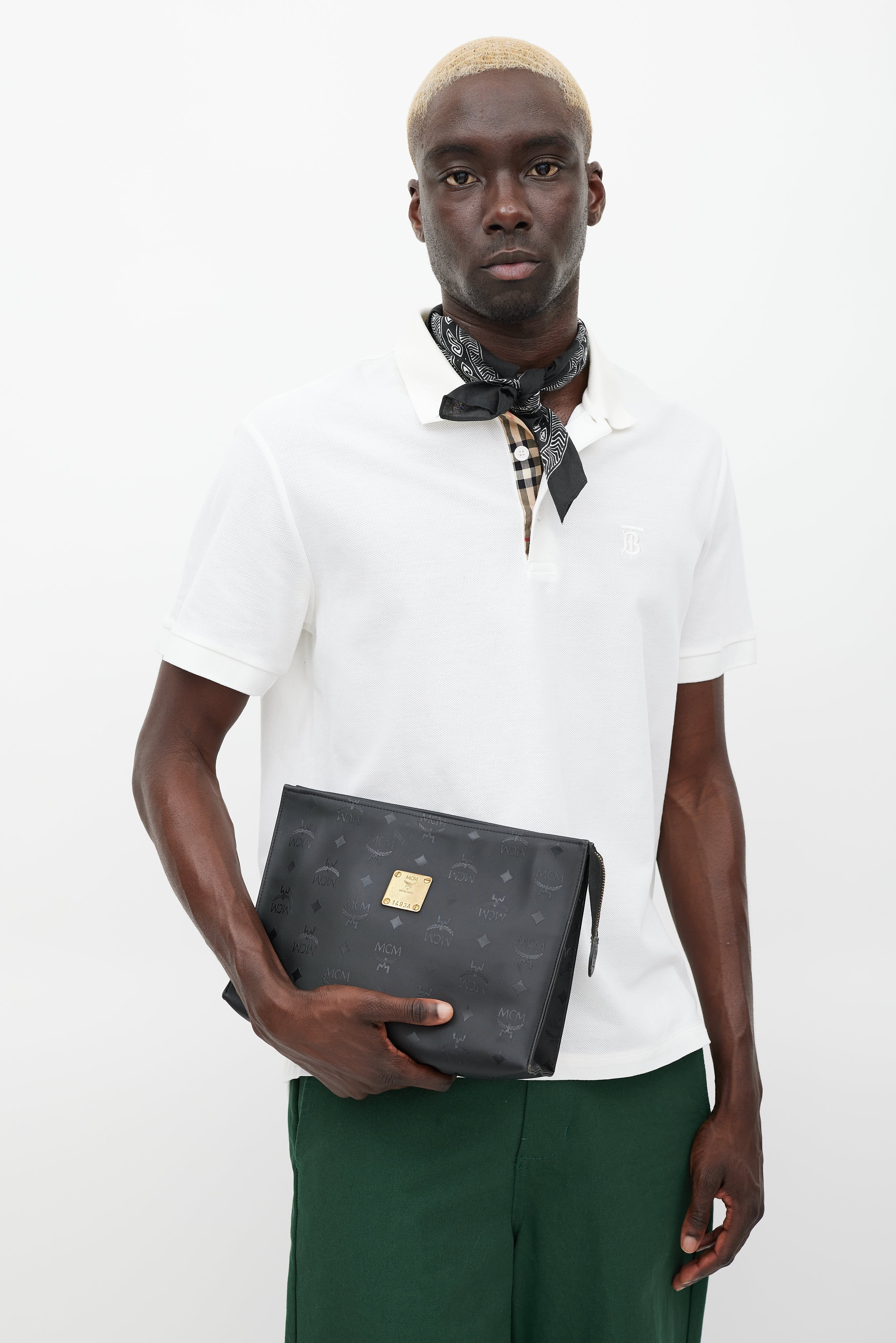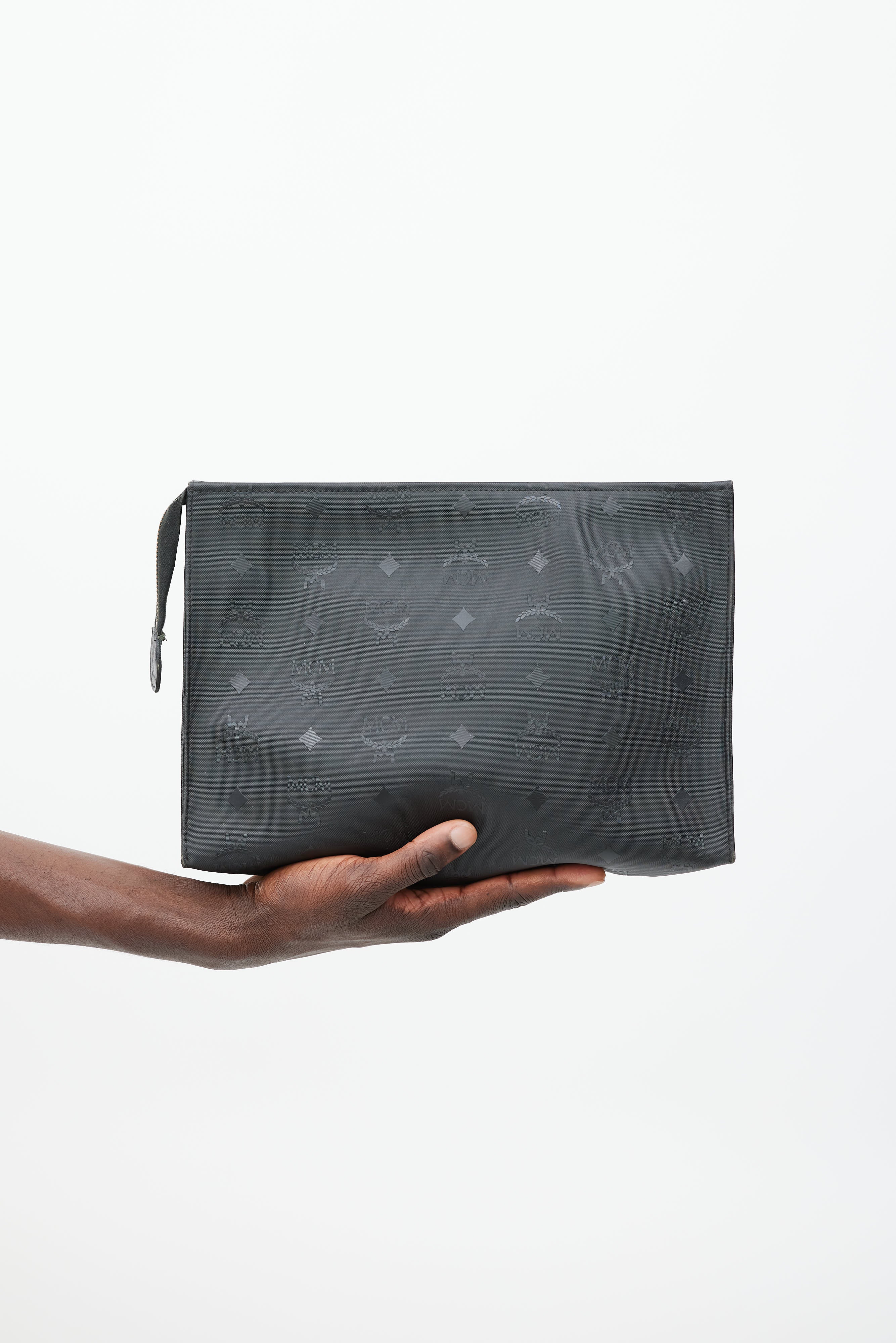 Pre owned MCM black nylon pouch featuring signature monogram print throughout, gold tone plaque with engraved logo at front, top zip closure, and single leather lined compartment with logo stamp.