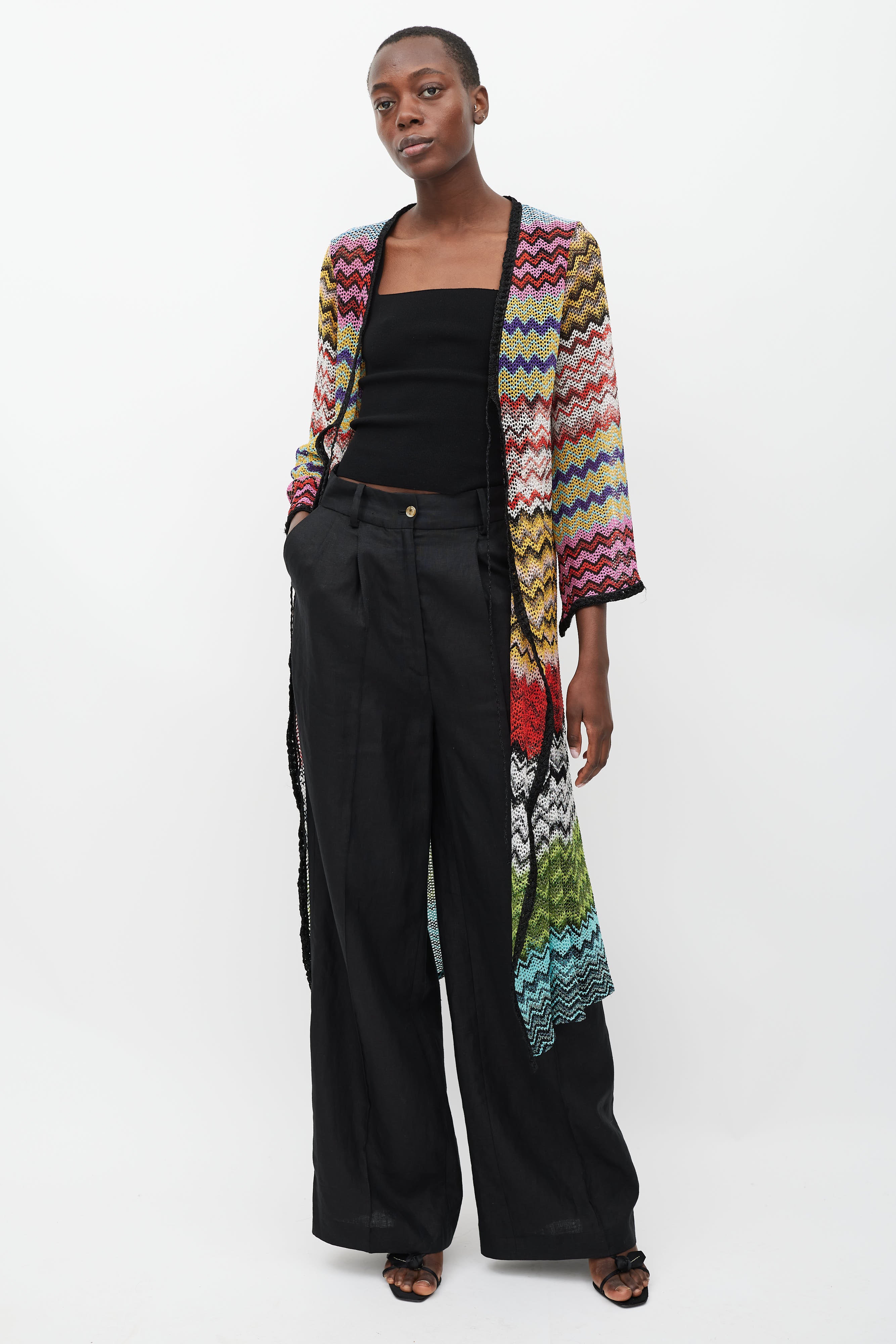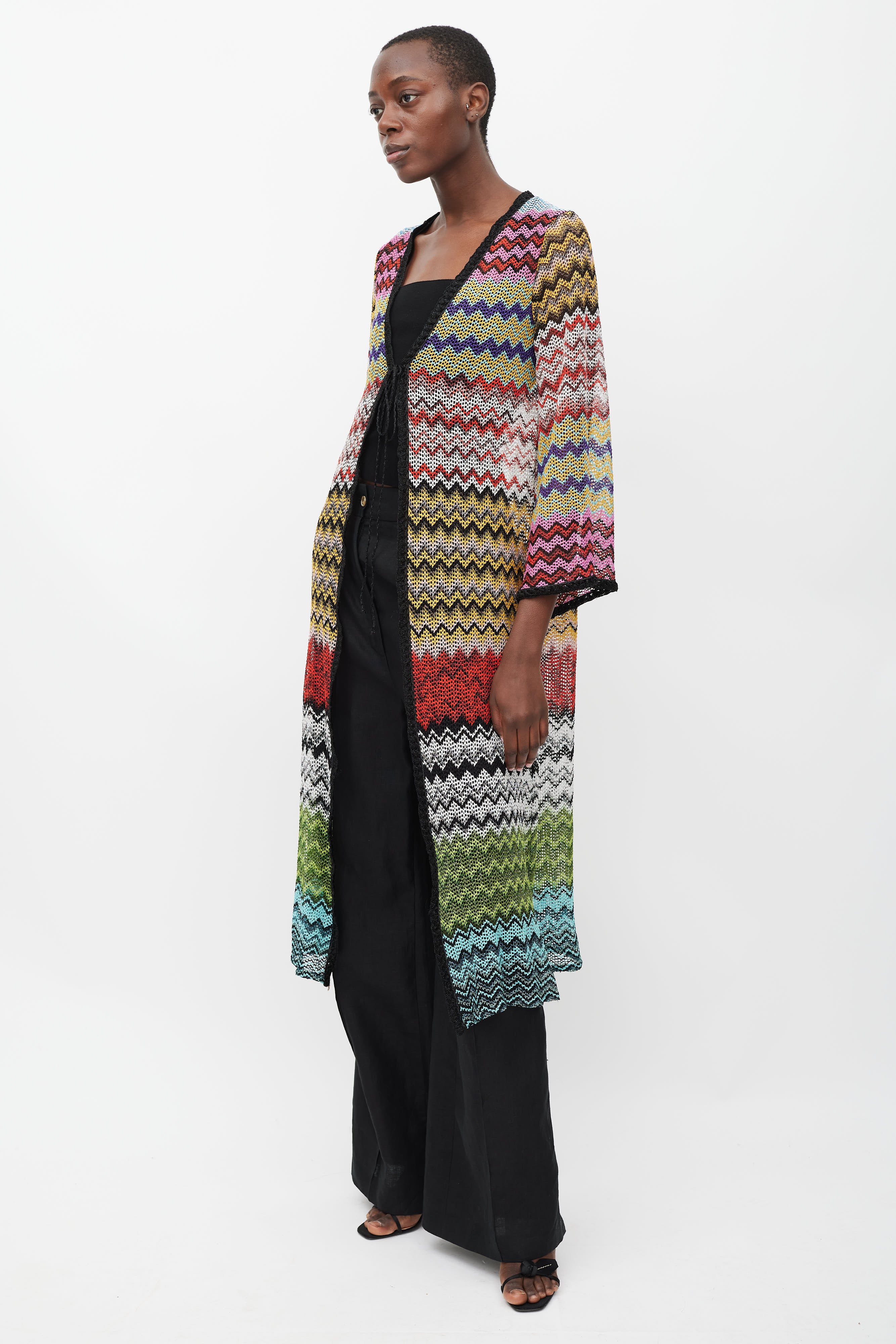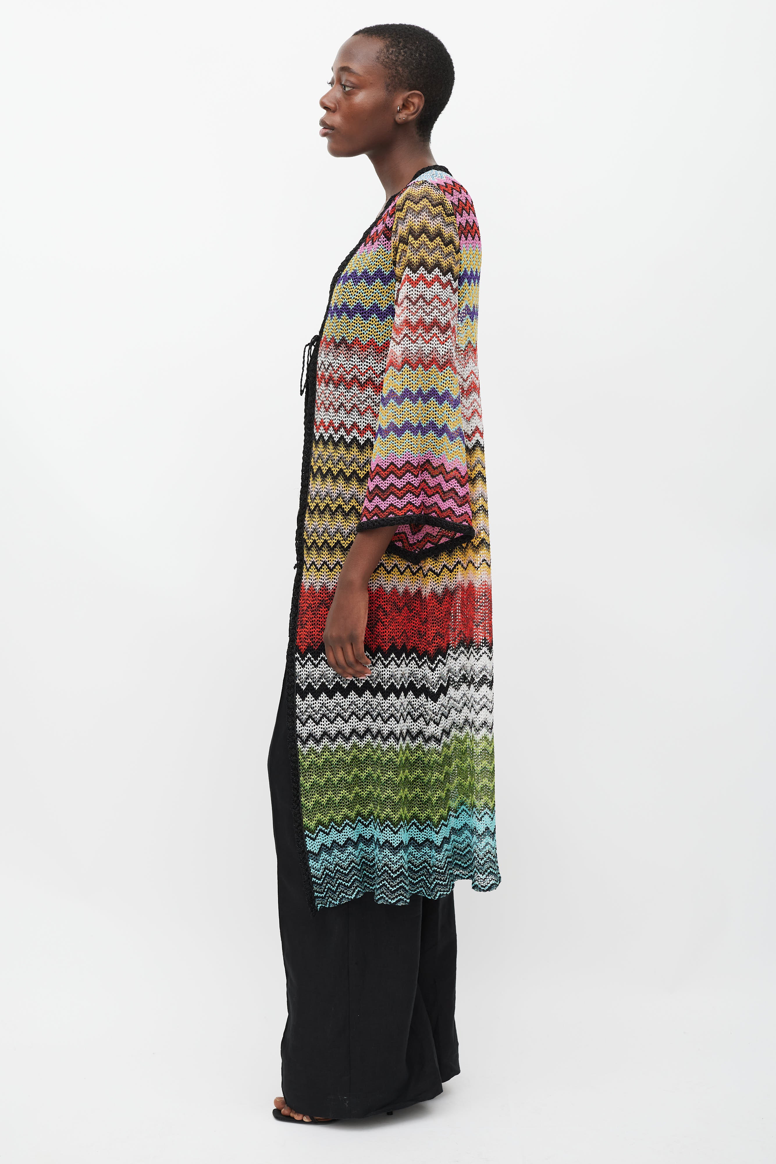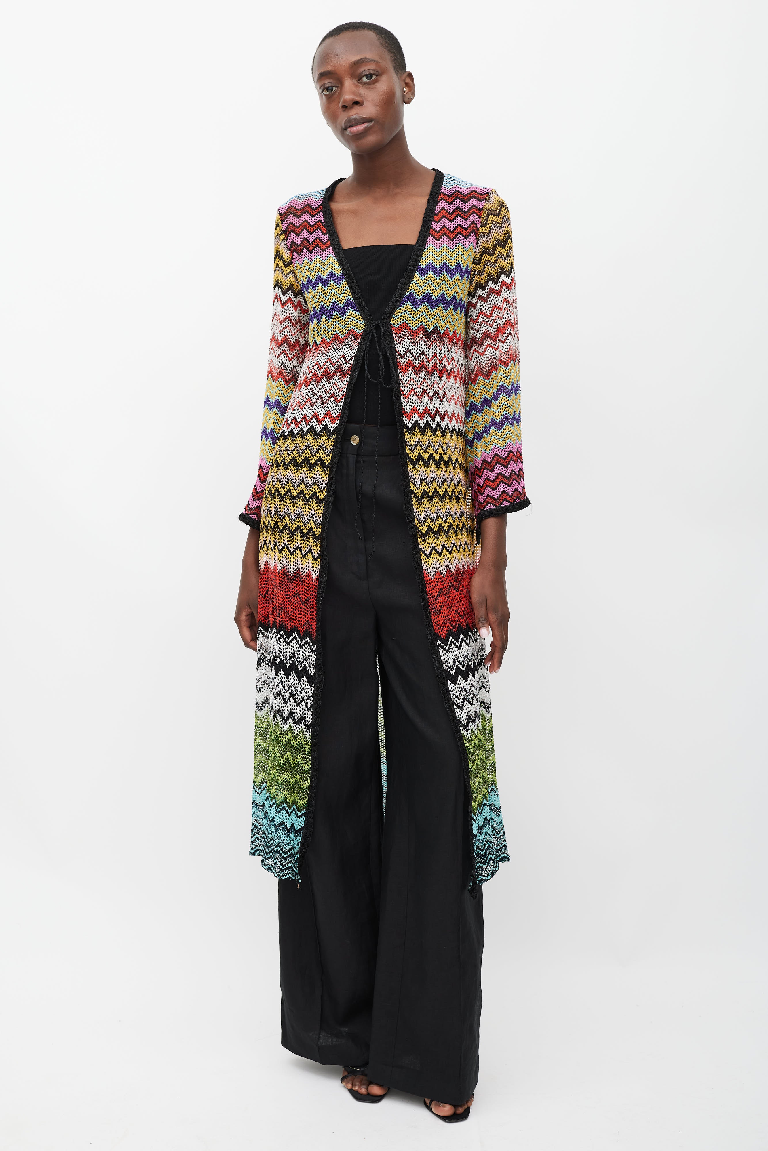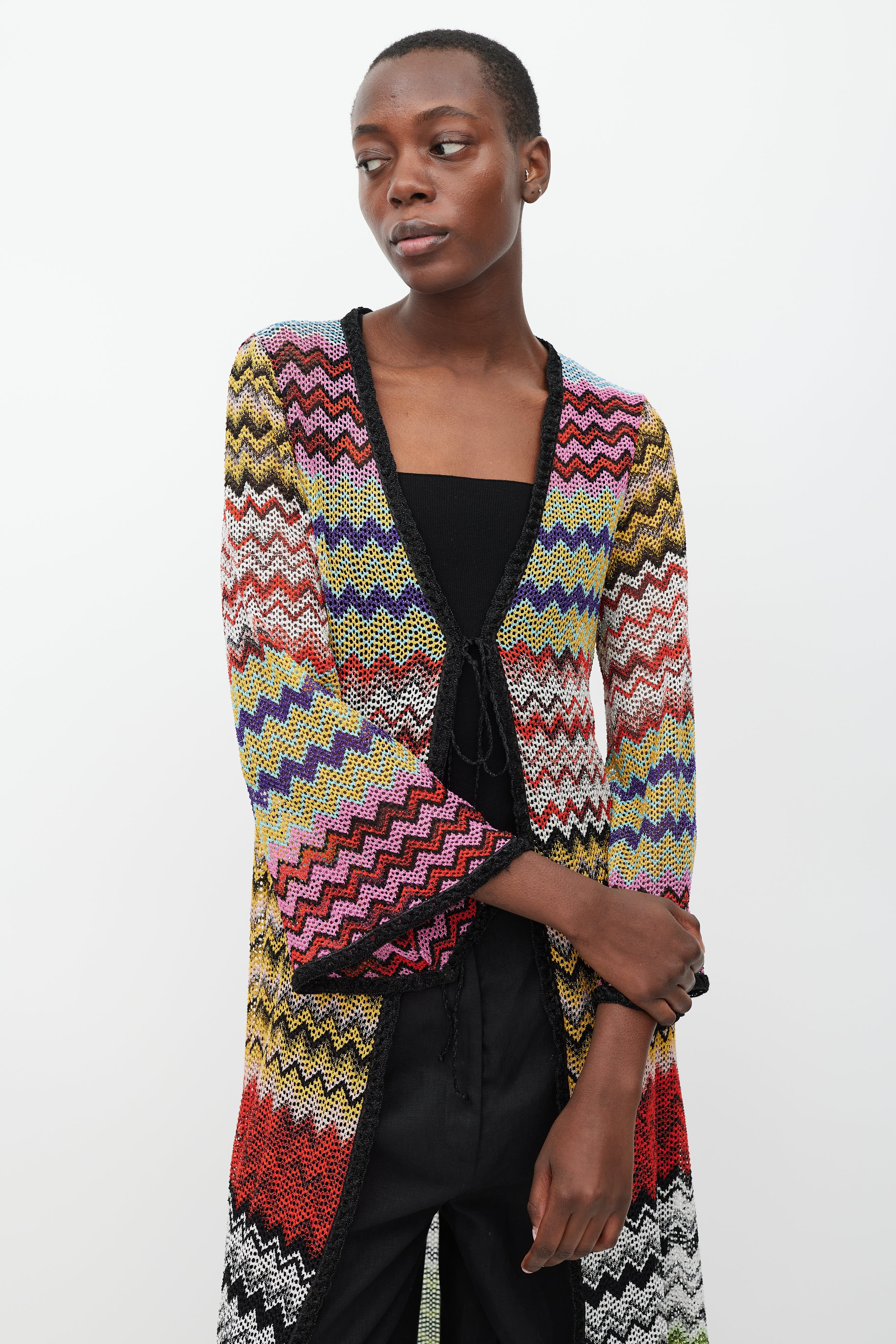 Pre-owned Missoni Mare long knit cardigan featuring a multicolour zig zag pattern with metallic thread throughout, V-neckline, open front with self tie, long bell sleeves, and black trim.