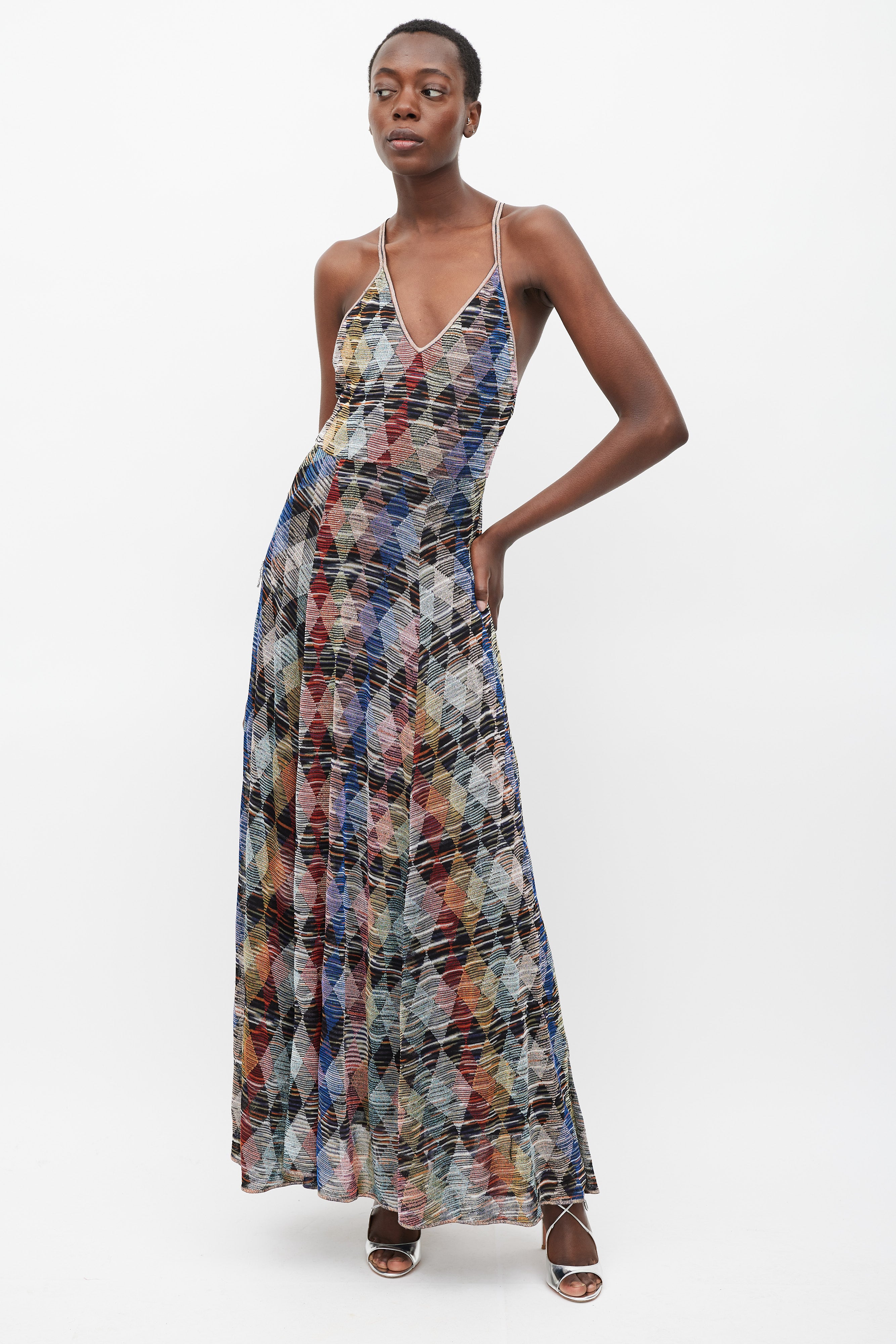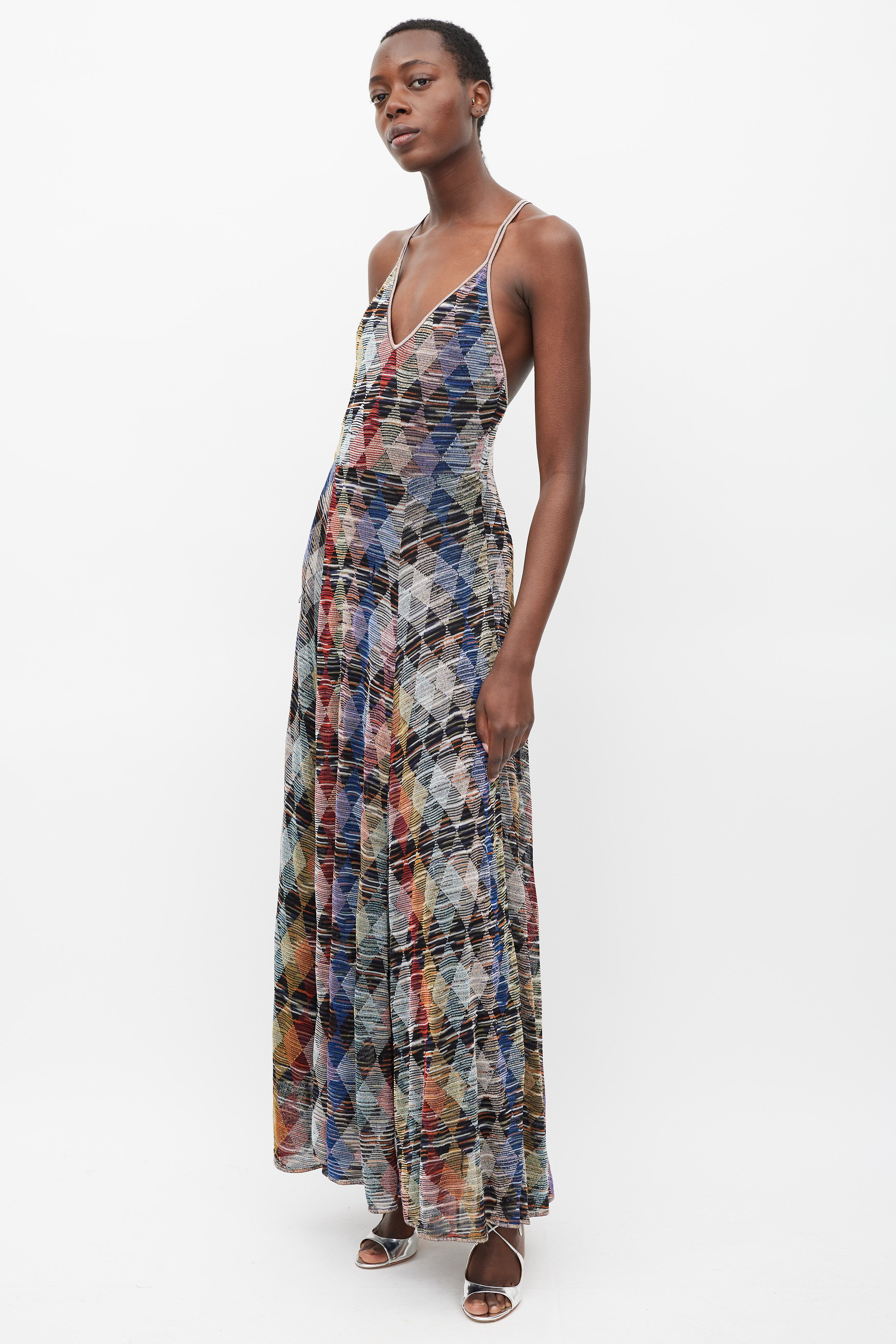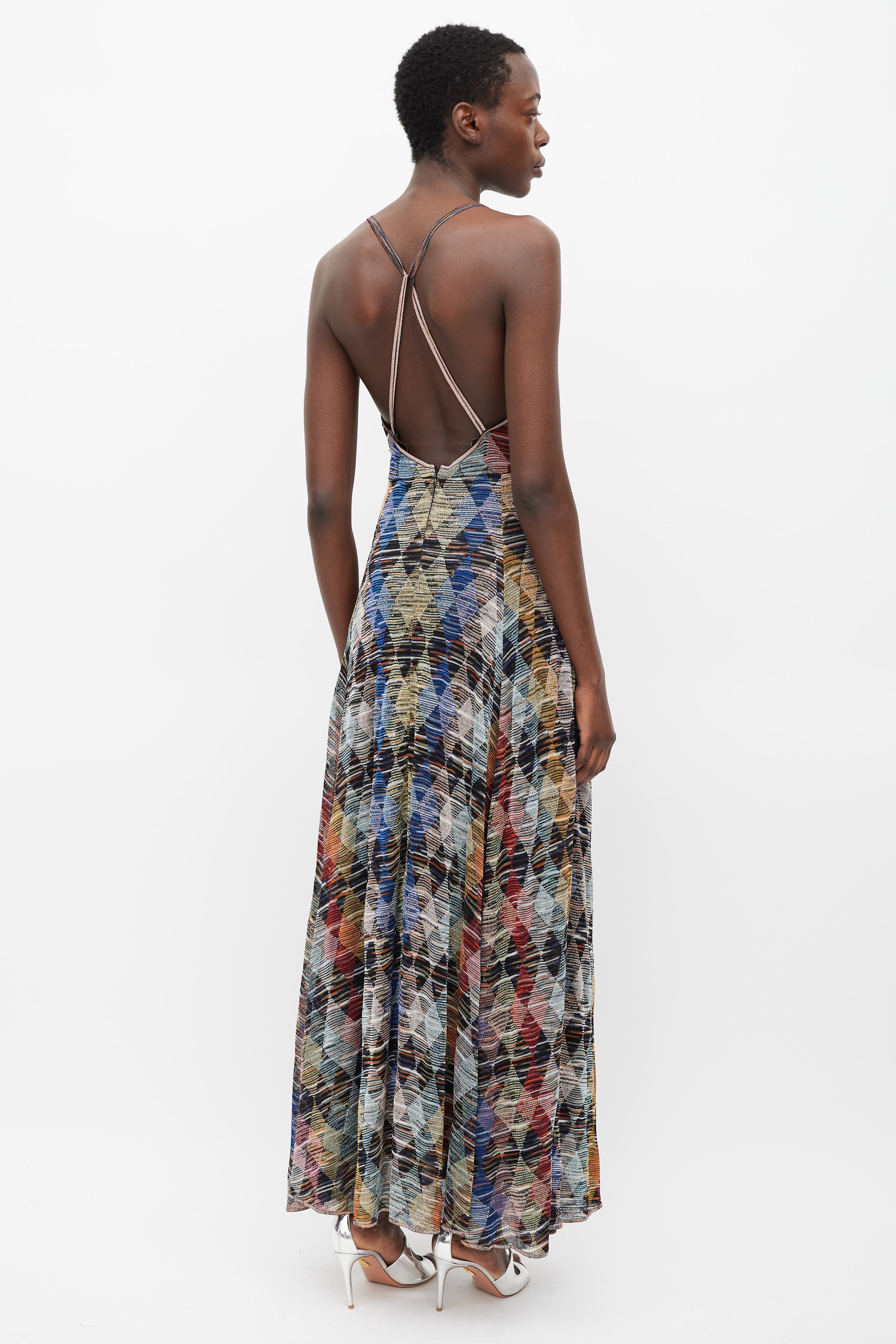 Pre-owned Missoni multicolour sleeveless maxi dress featuring an argyle pattern throughout, deep V-neckline, panelled skirt, open back with crossed straps, and concealed back zip. Lined.