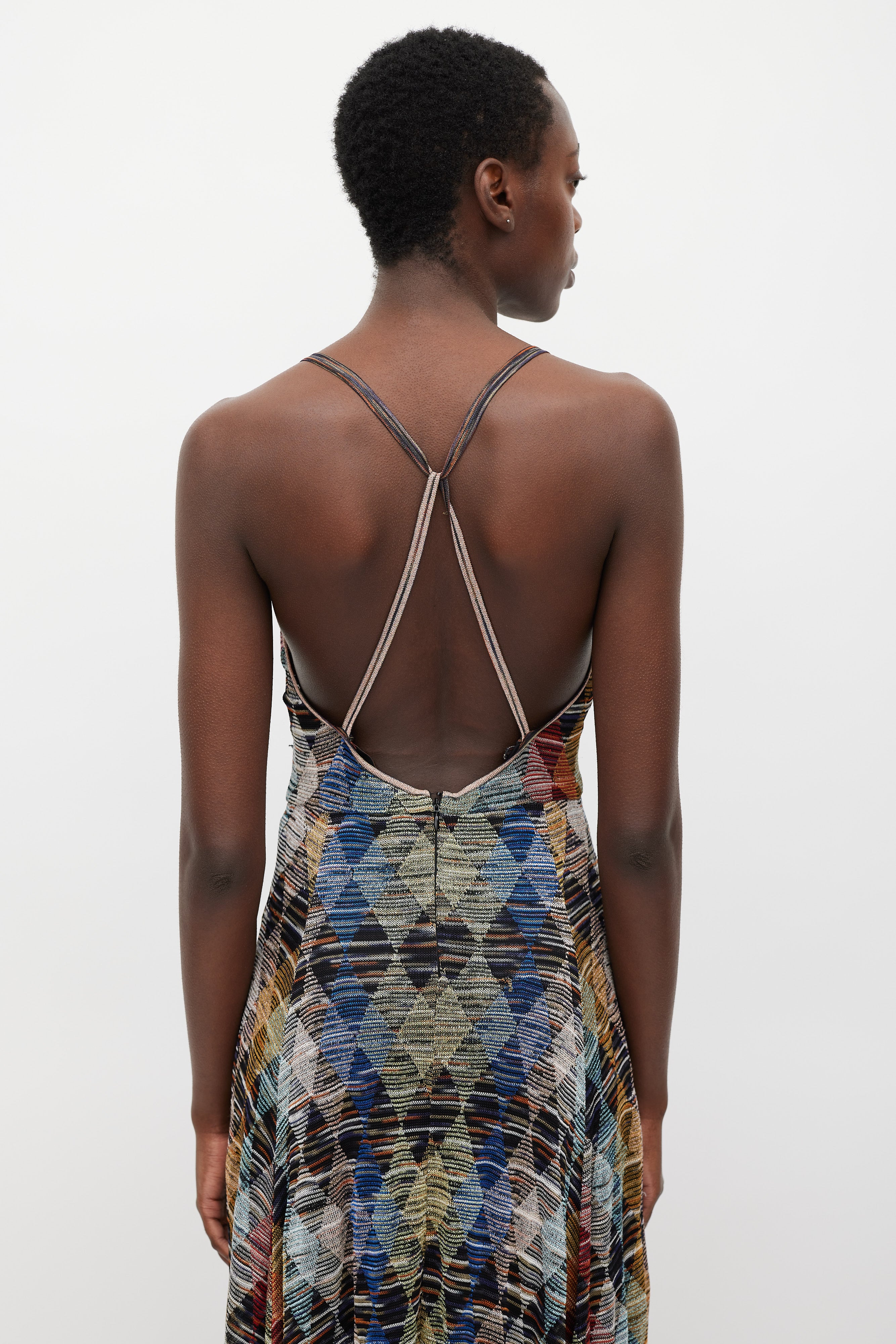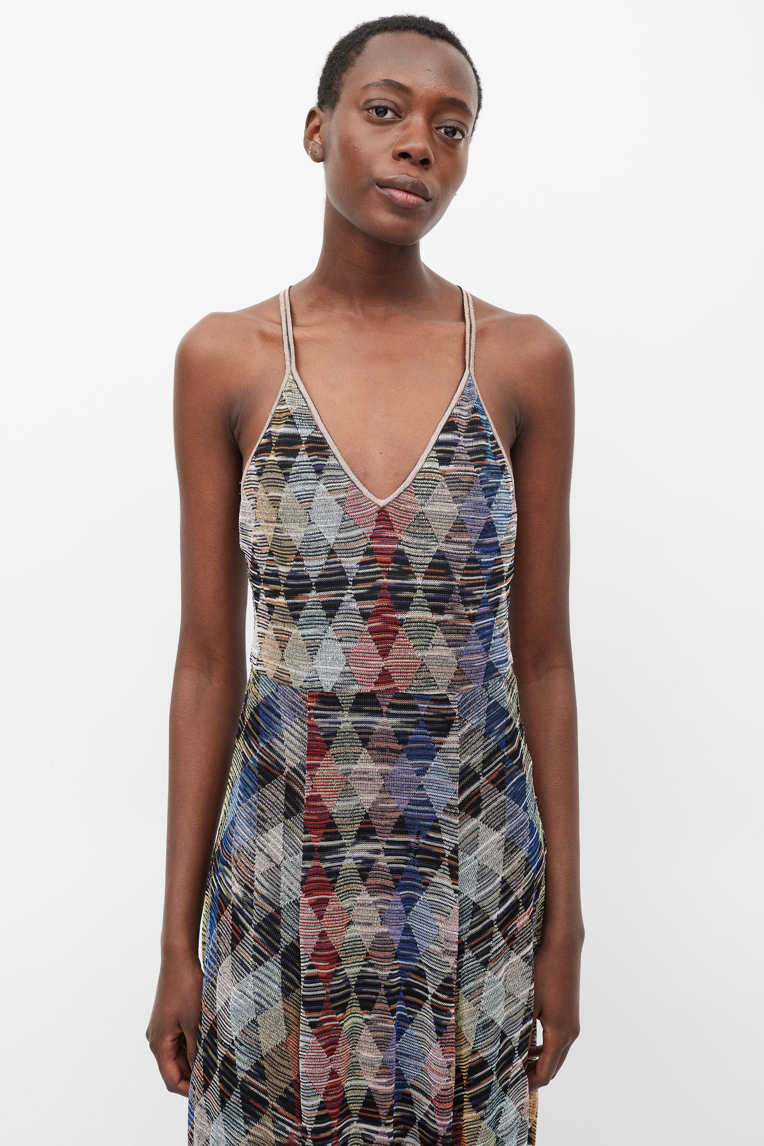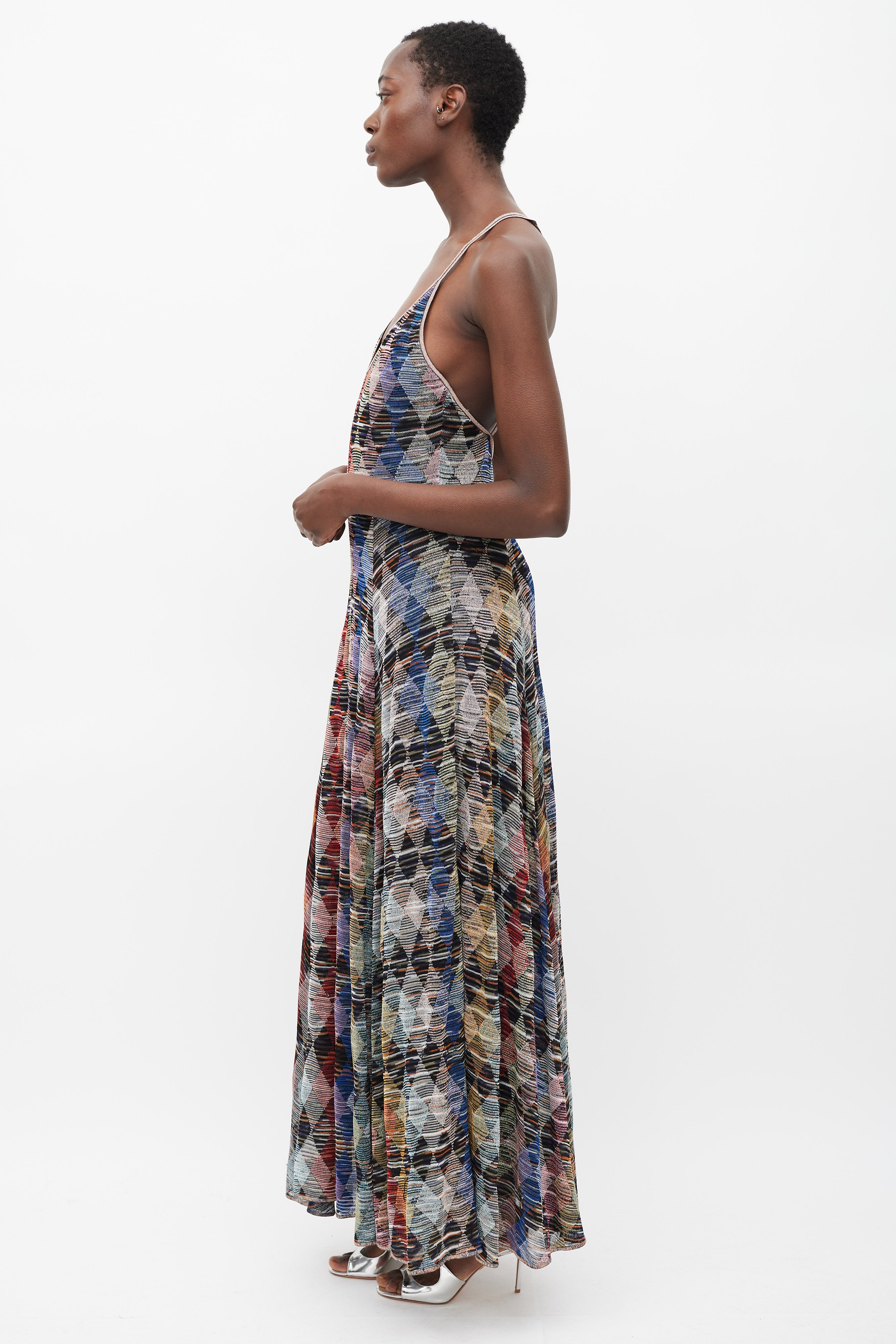 Pre-owned Missoni multicolour sleeveless maxi dress featuring an argyle pattern throughout, deep V-neckline, panelled skirt, open back with crossed straps, and concealed back zip. Lined.