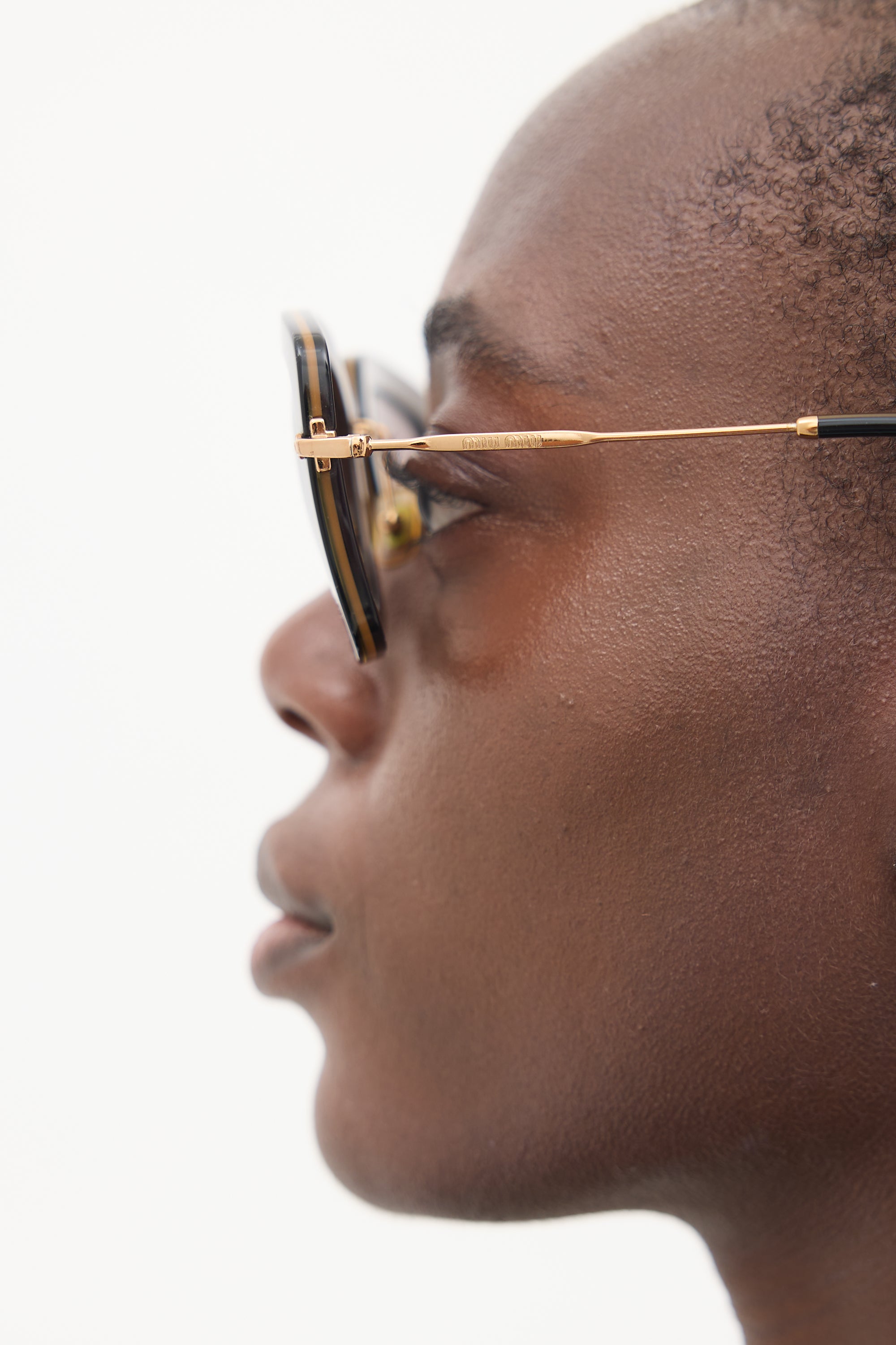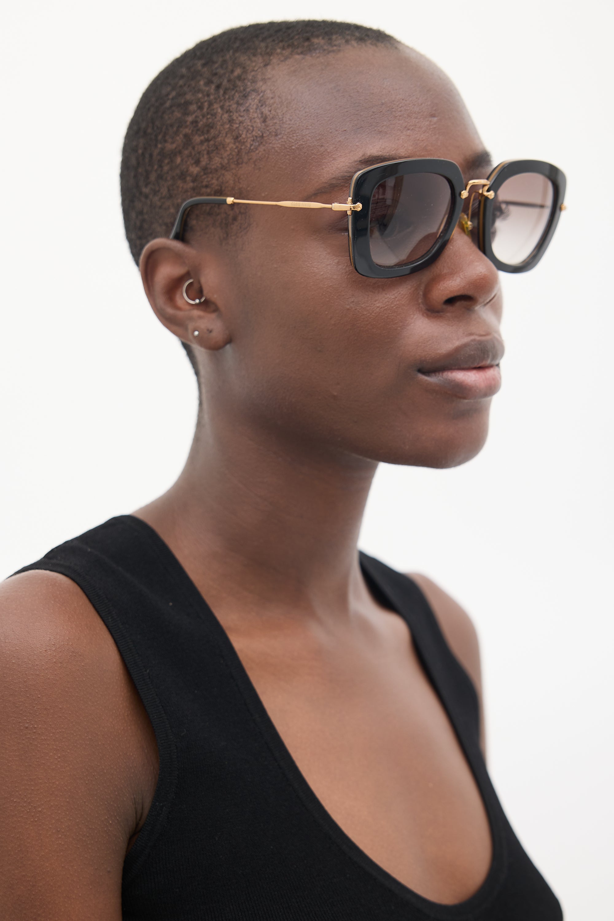 Pre-owned Miu Miu black SMJ070 sunglasses featuring a square frame, tinted lenses, adjustable nose pads, wire brow bar, gold tone arms, and embossed logo at temples. Comes with original case.
