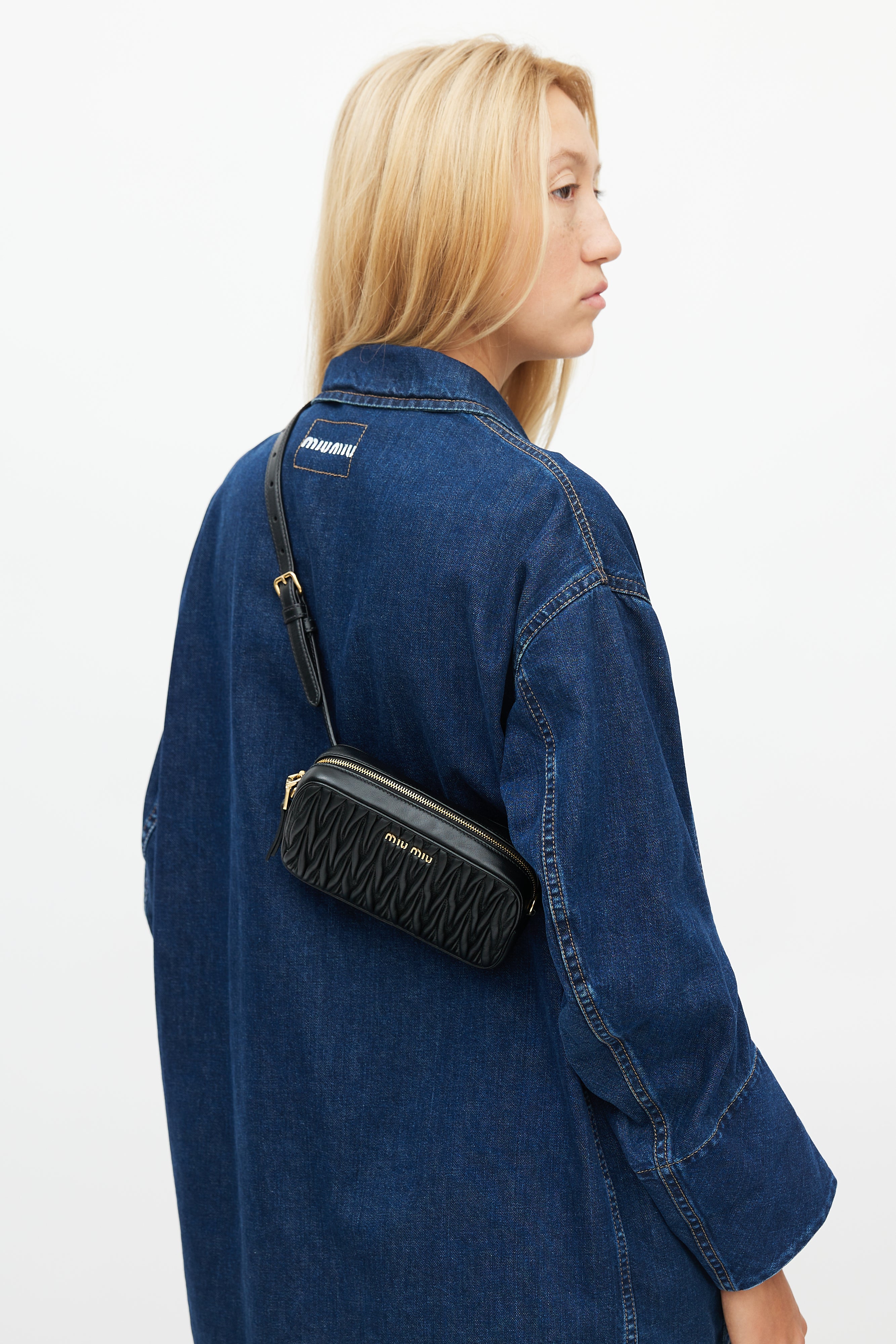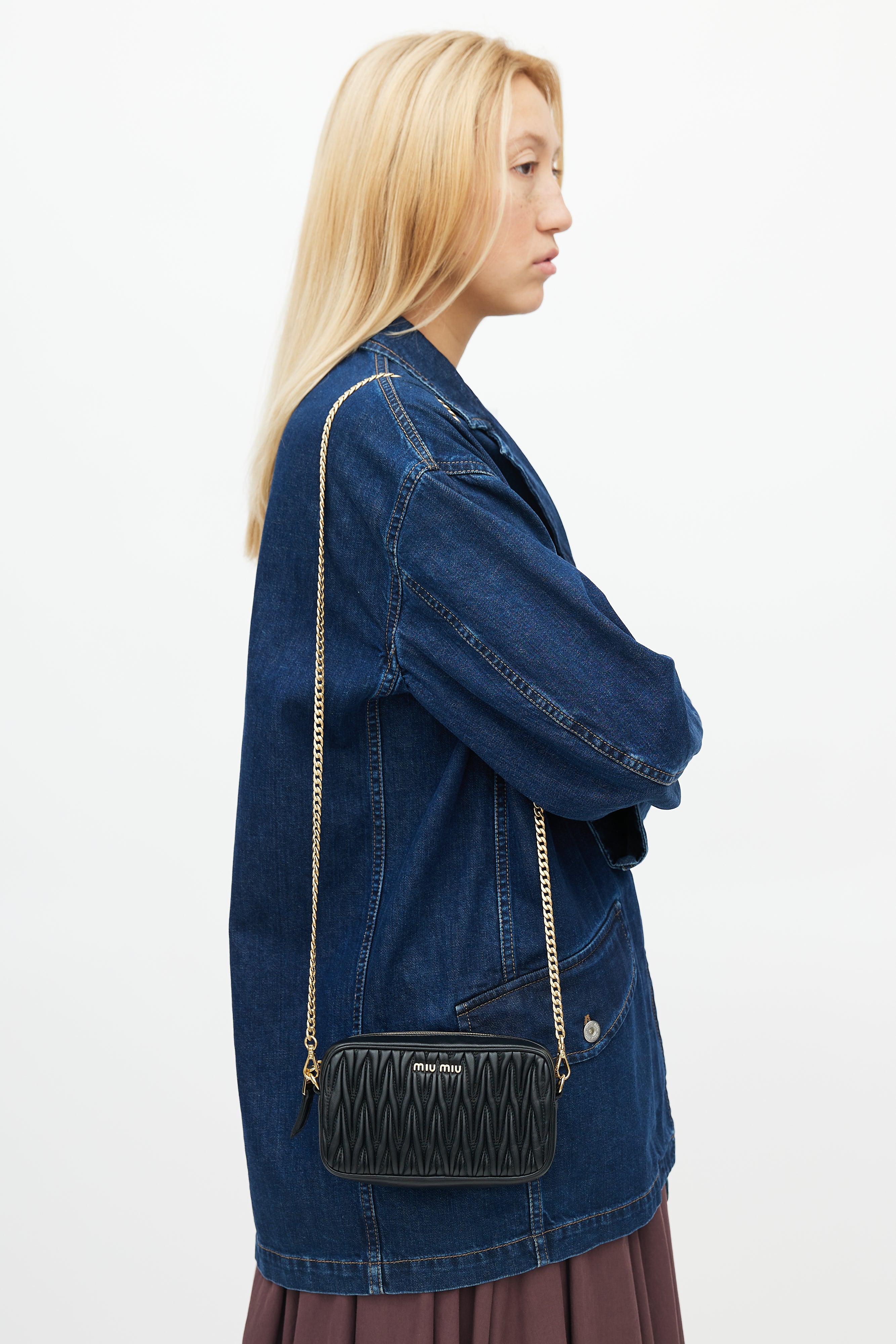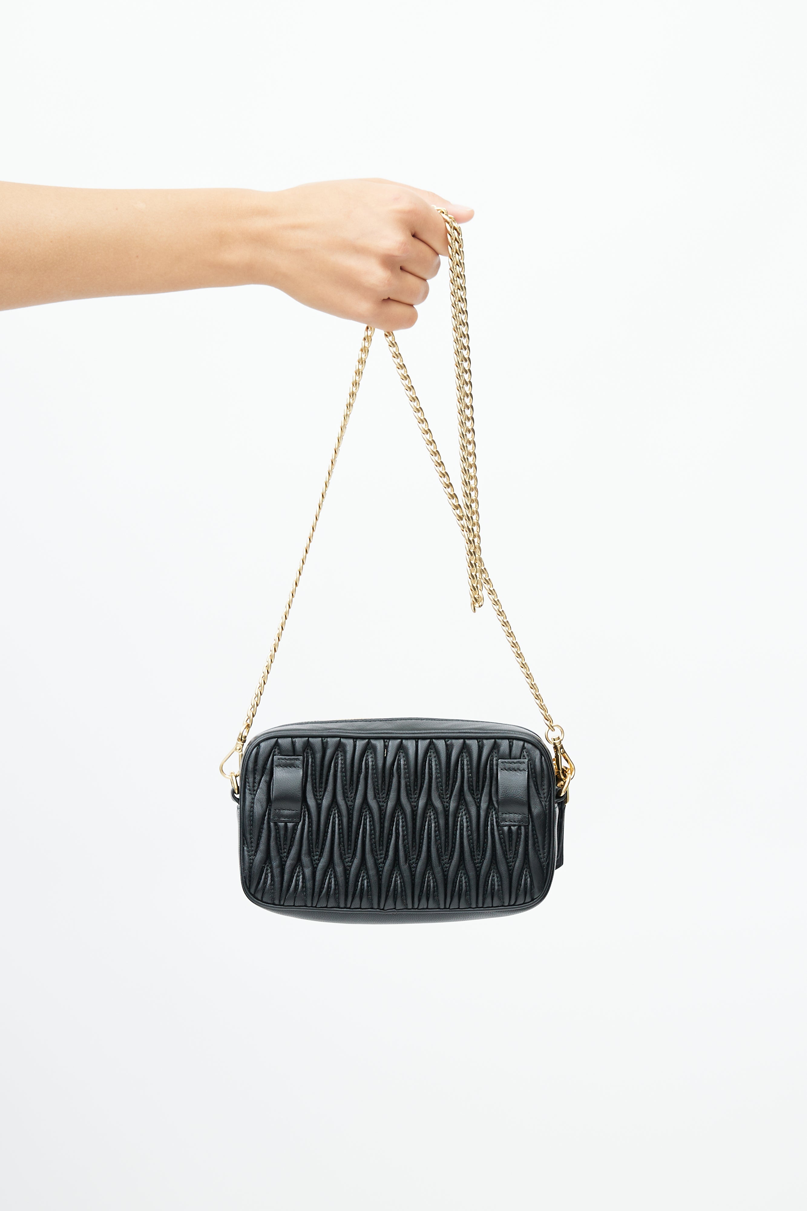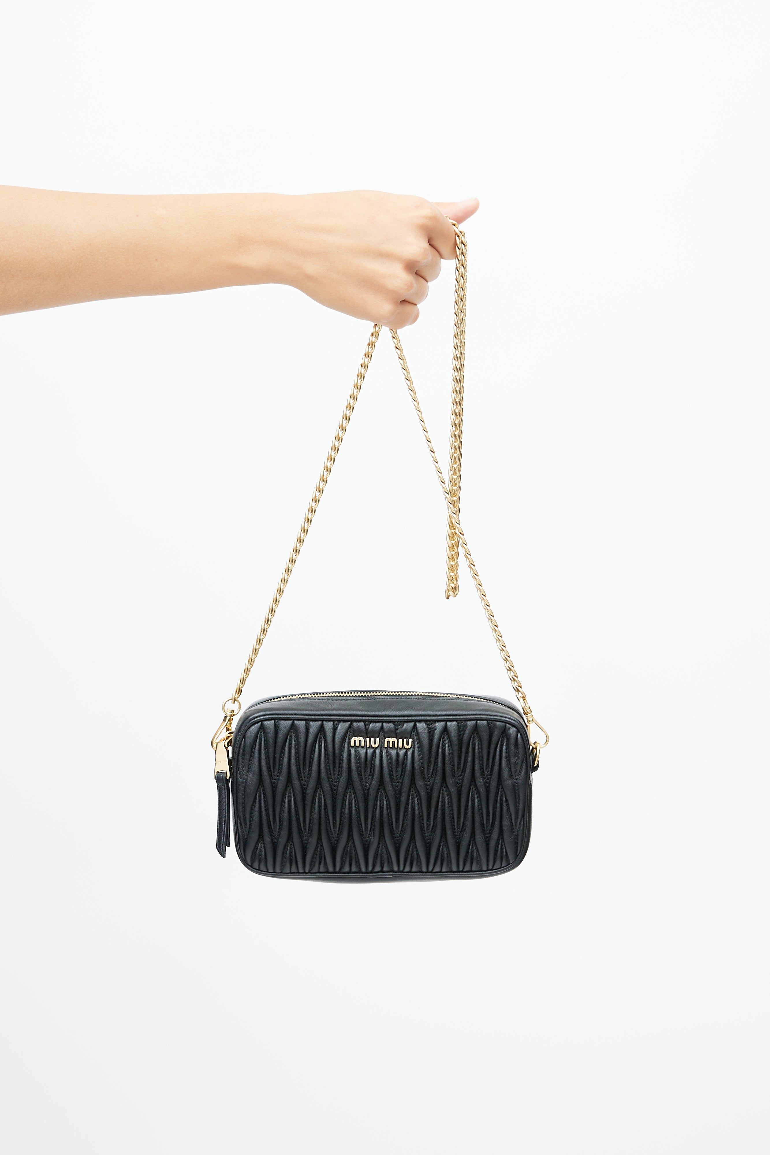 Pre-owned Miu Miu black belt bag featuring matelasse quilted leather, gold tone logo hardware at front, zip closure at top, belt loops at back, satin lining, and detachable leather and chain strap. Comes with original dust bag.