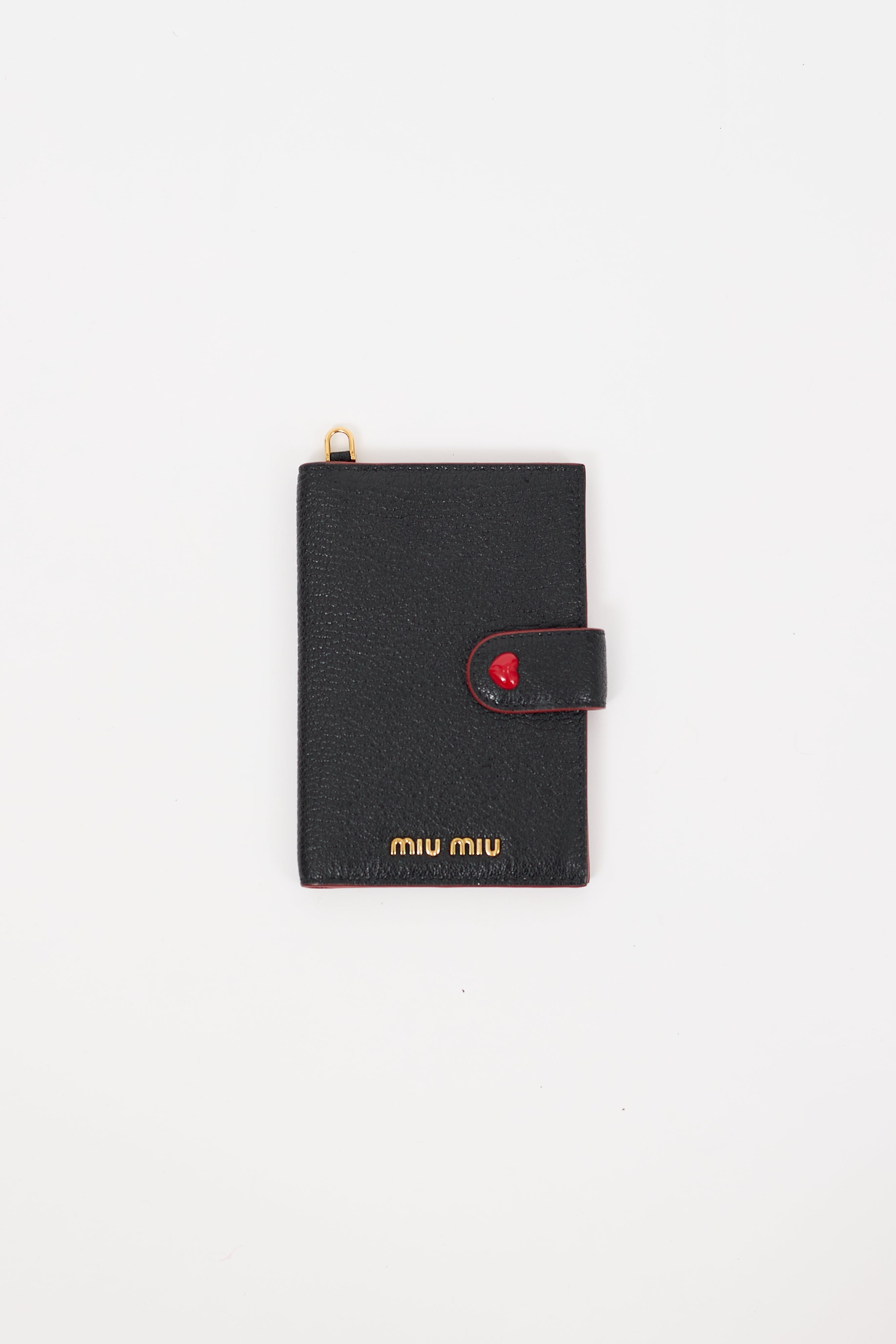 Pre-owned Miu Miu black and red Madras Love wallet featuring gold tone logo hardware at front, snap button closure with heart embellishment, three slip pockets, three card slots, and detachable lanyard. Comes with brand authentication card.