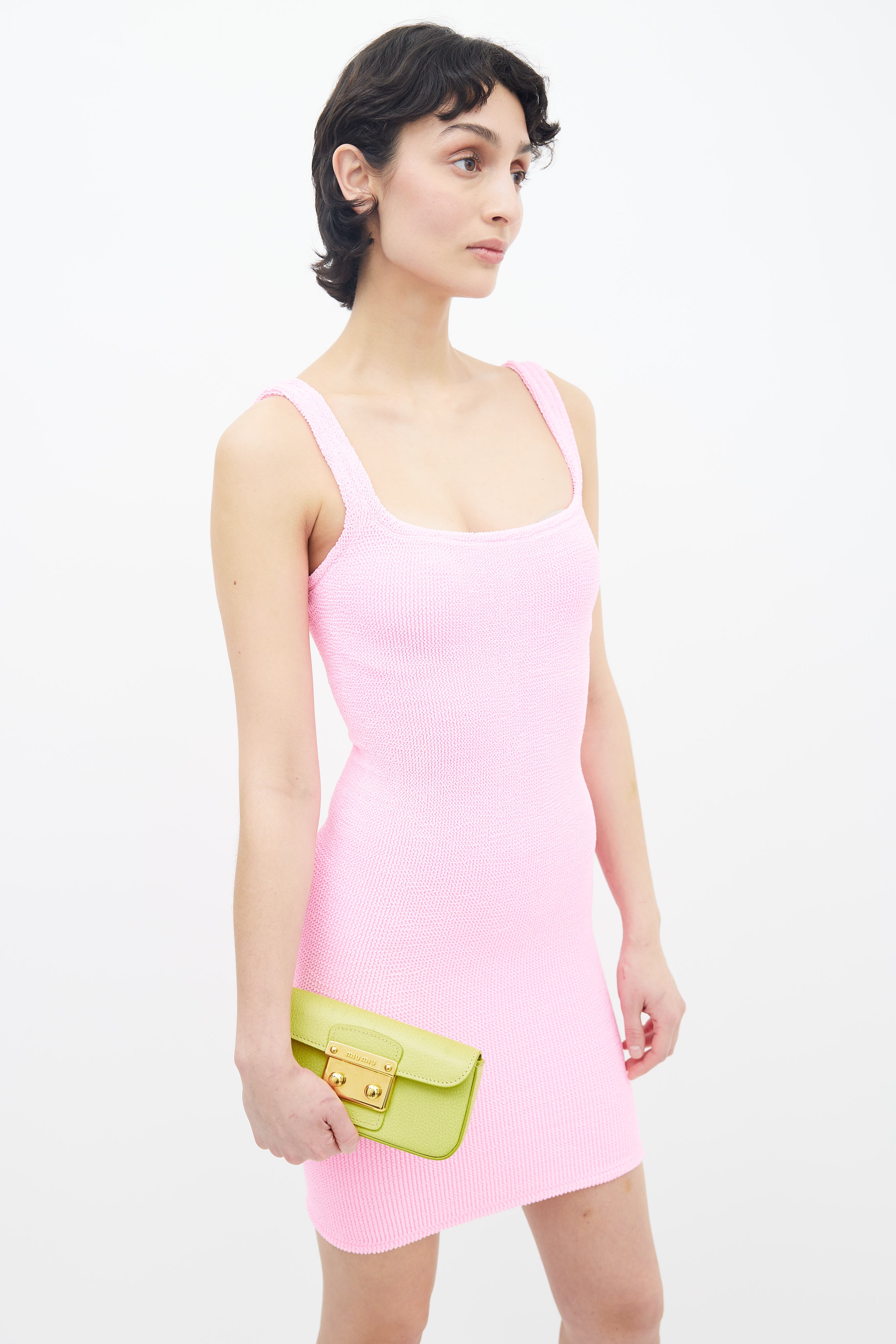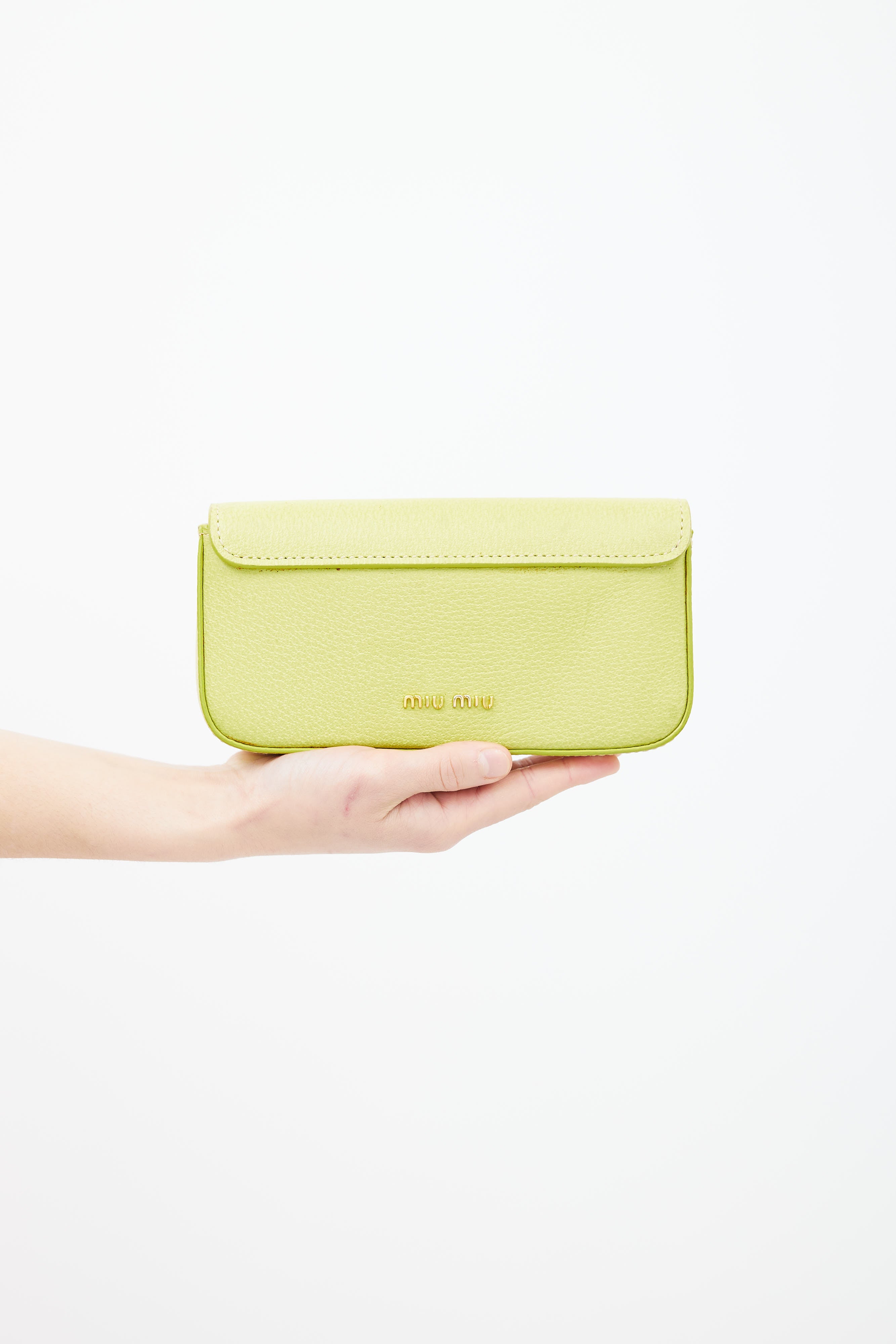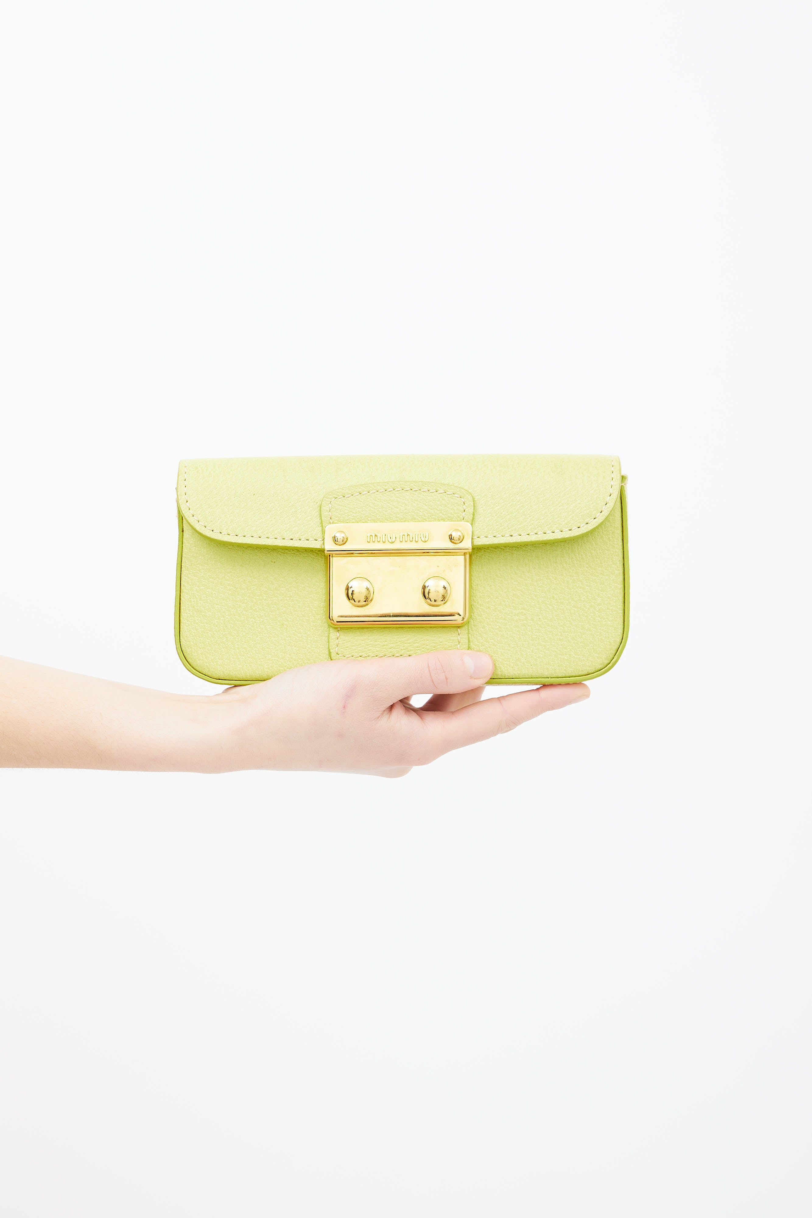 Pre-owned Miu Miu clutch in green Madras leather featuring gold-tone hardware, front flap opening, push lock closure, logo hardware at face and back, tonal wristlet, suede lining, single main compartment, and interior card slot.