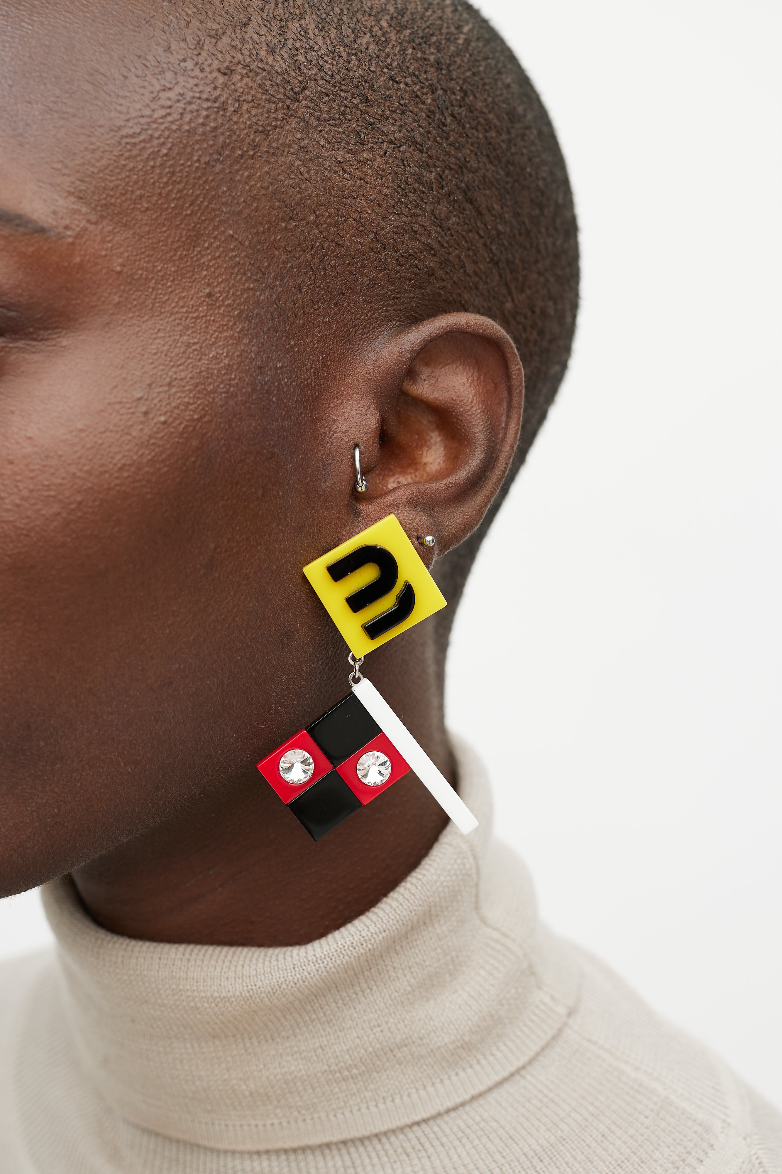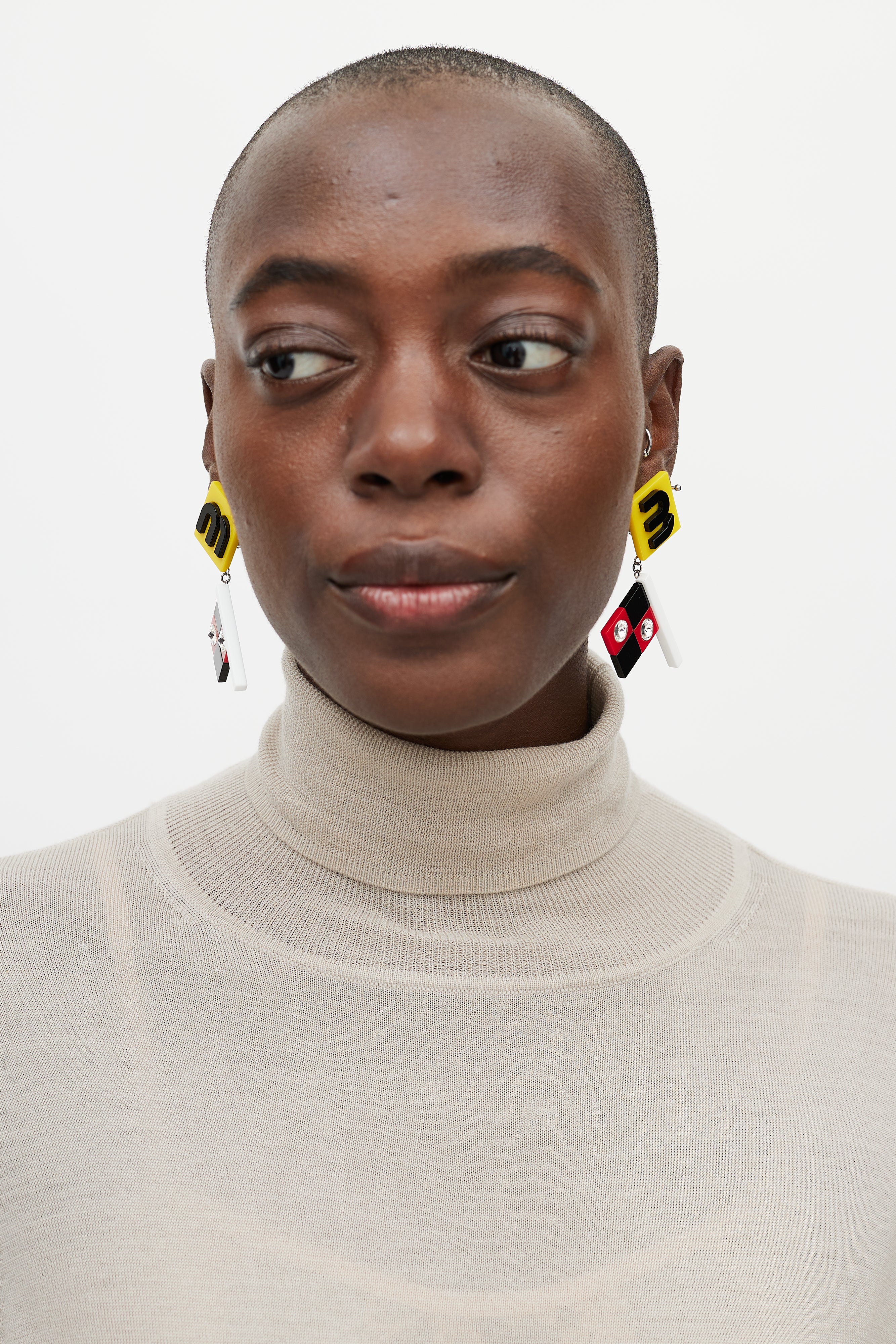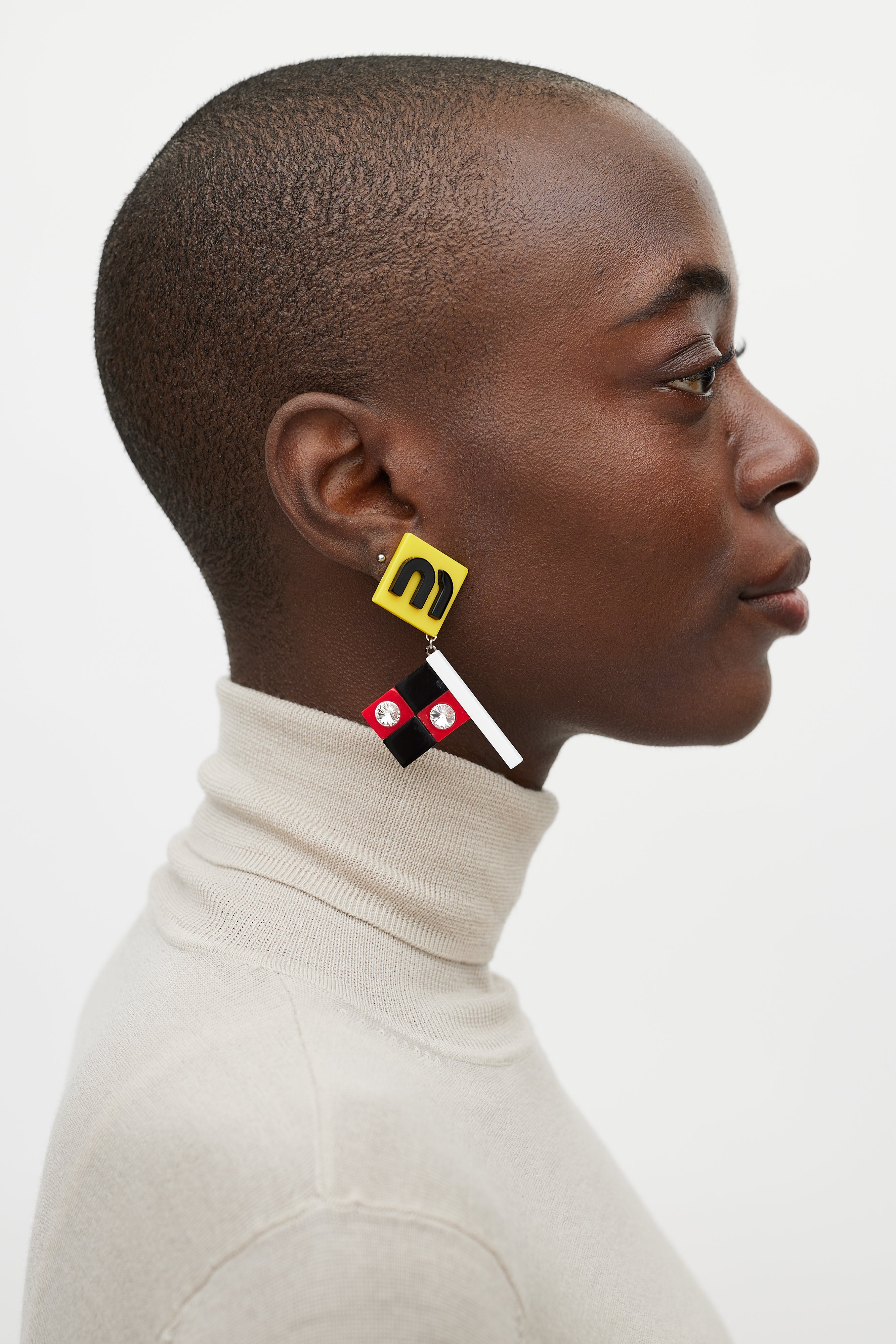 Pre-owned Miu Miu Resort 2018 multicolour earrings featuring flag motif, Swarovski crystal embellishment, black logo, and clip on closure.