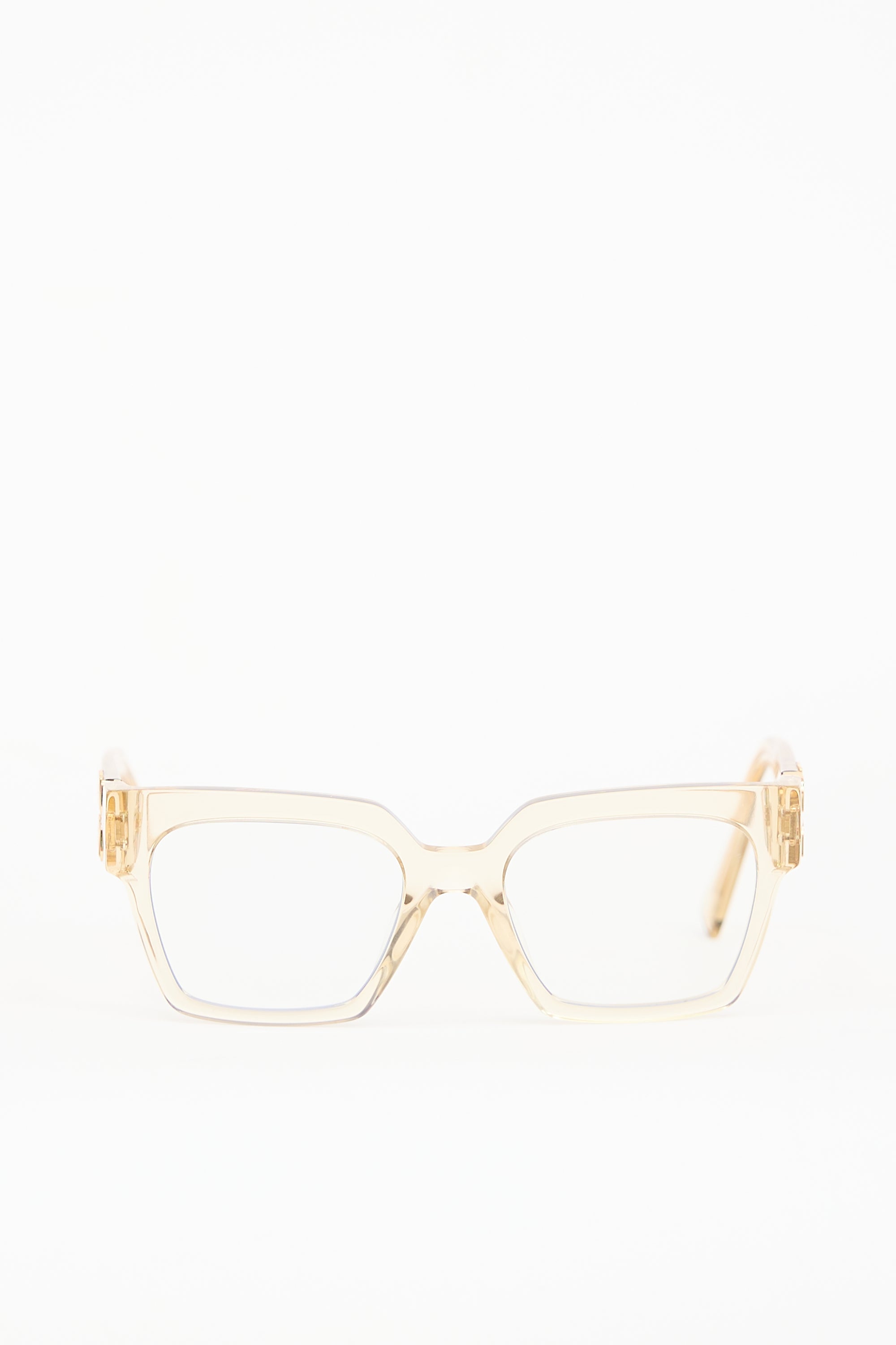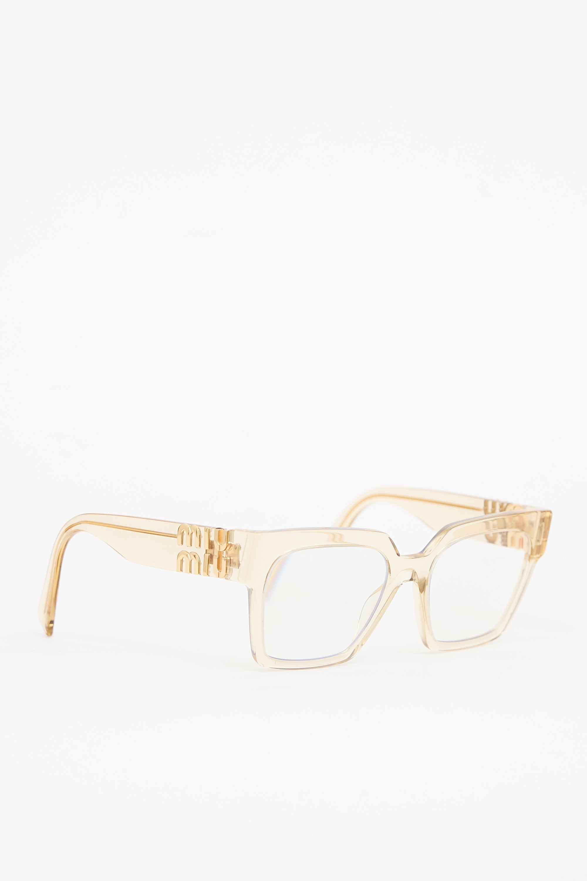 Pre-owned Miu Miu VMU04U glasses featuring prescribed lenses, clear yellow square frame, nose saddle bridge, and inset gold tone logo at temples. Comes with original case, wipe cloth, and box.