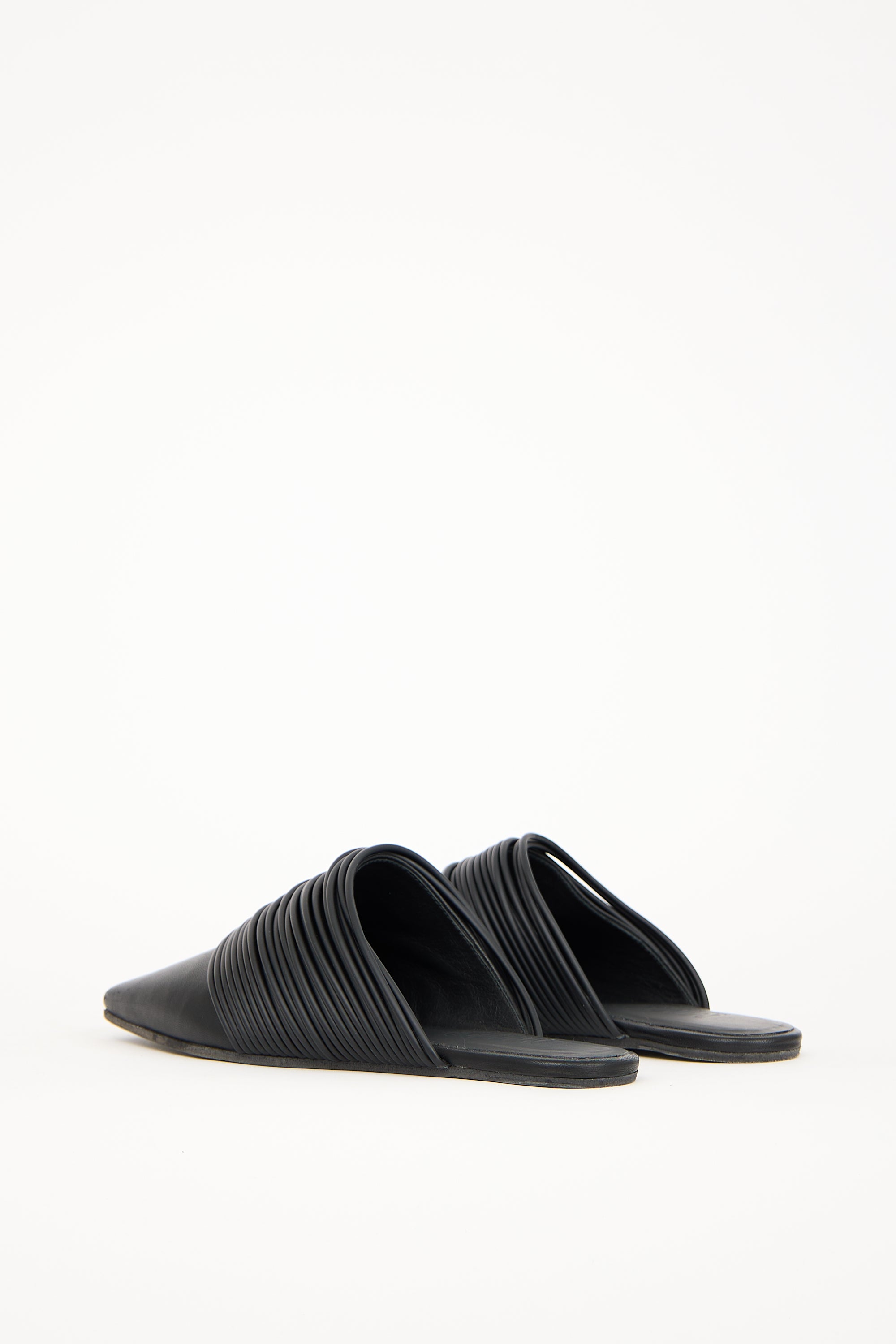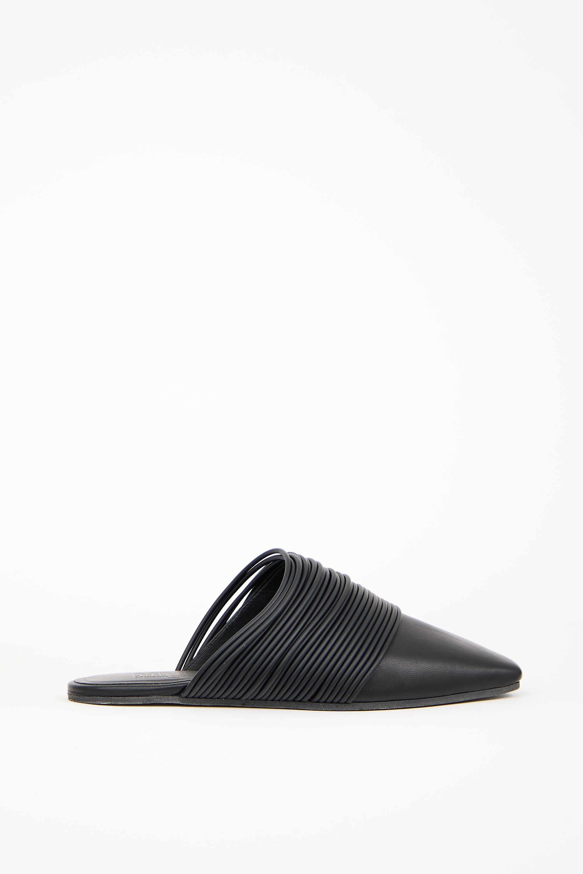 Pre-owned MM6 Maison Margiela black leather mules featuring a squared toe, strappy panel at vamp, and slip on entry. Includes original dust bag and box.