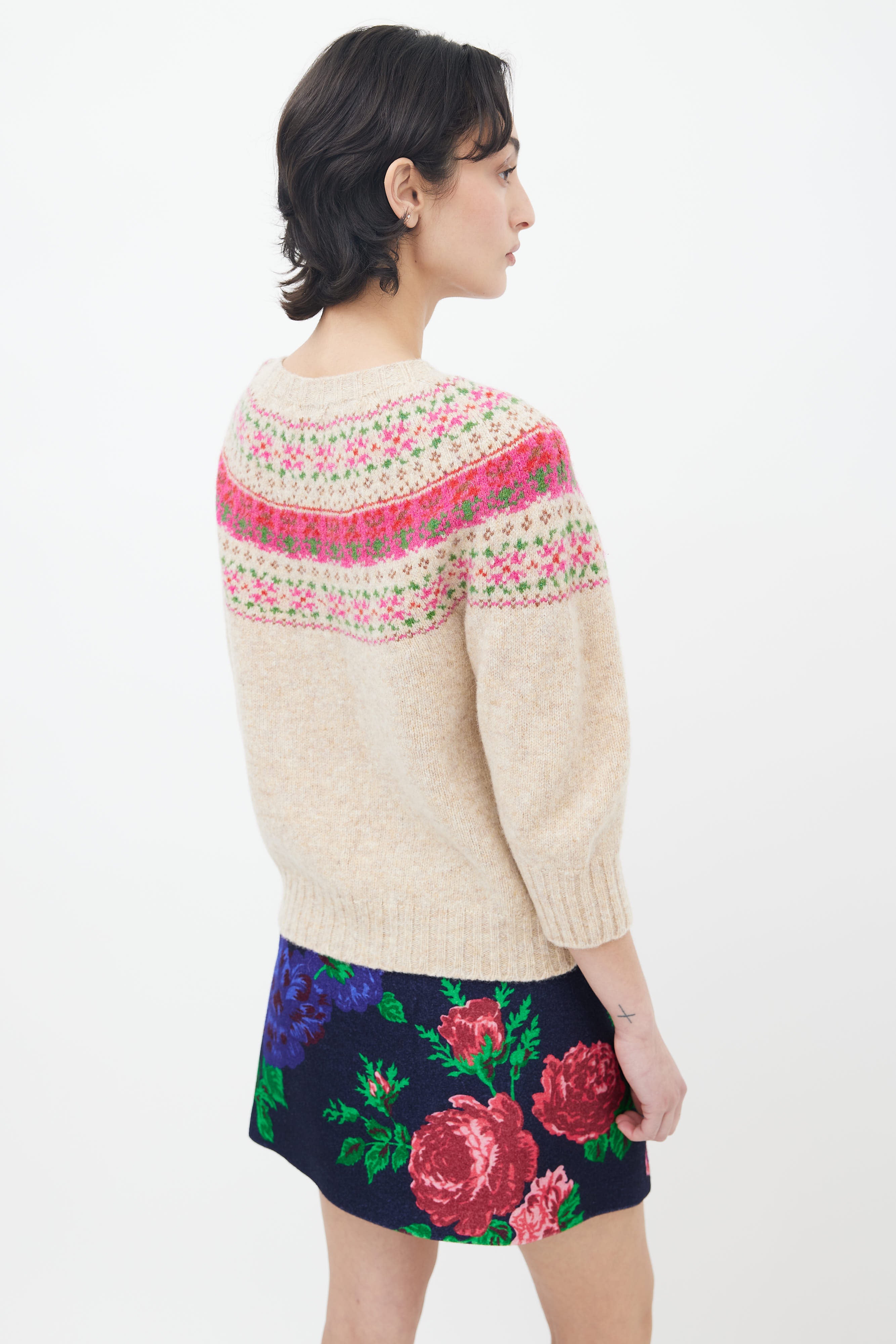 Pre-owned Molly Goddard cardigan in brown featuring pink and green fair isle knit, button up front, and tight ribbed knit collar, cuffs, and hem.
