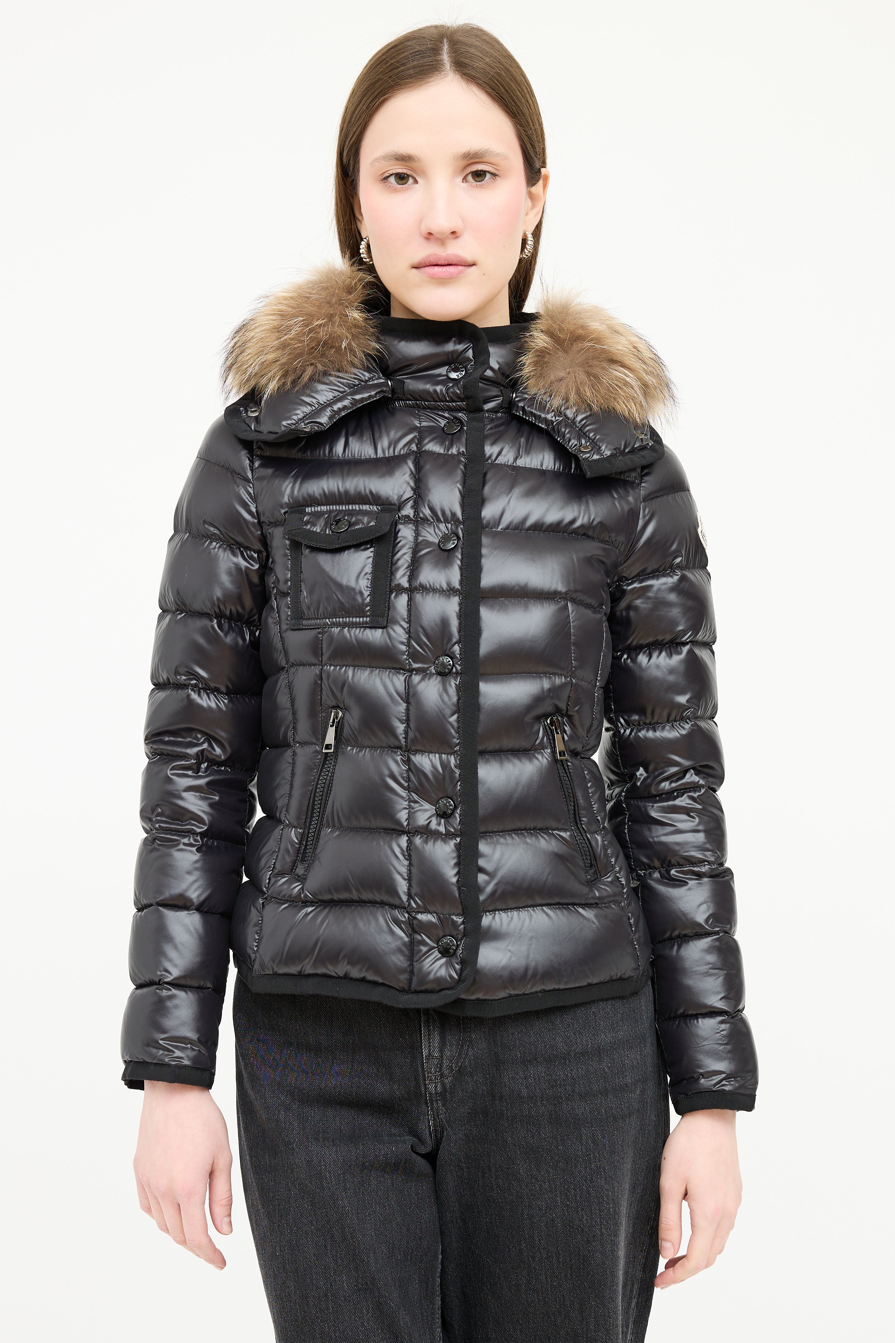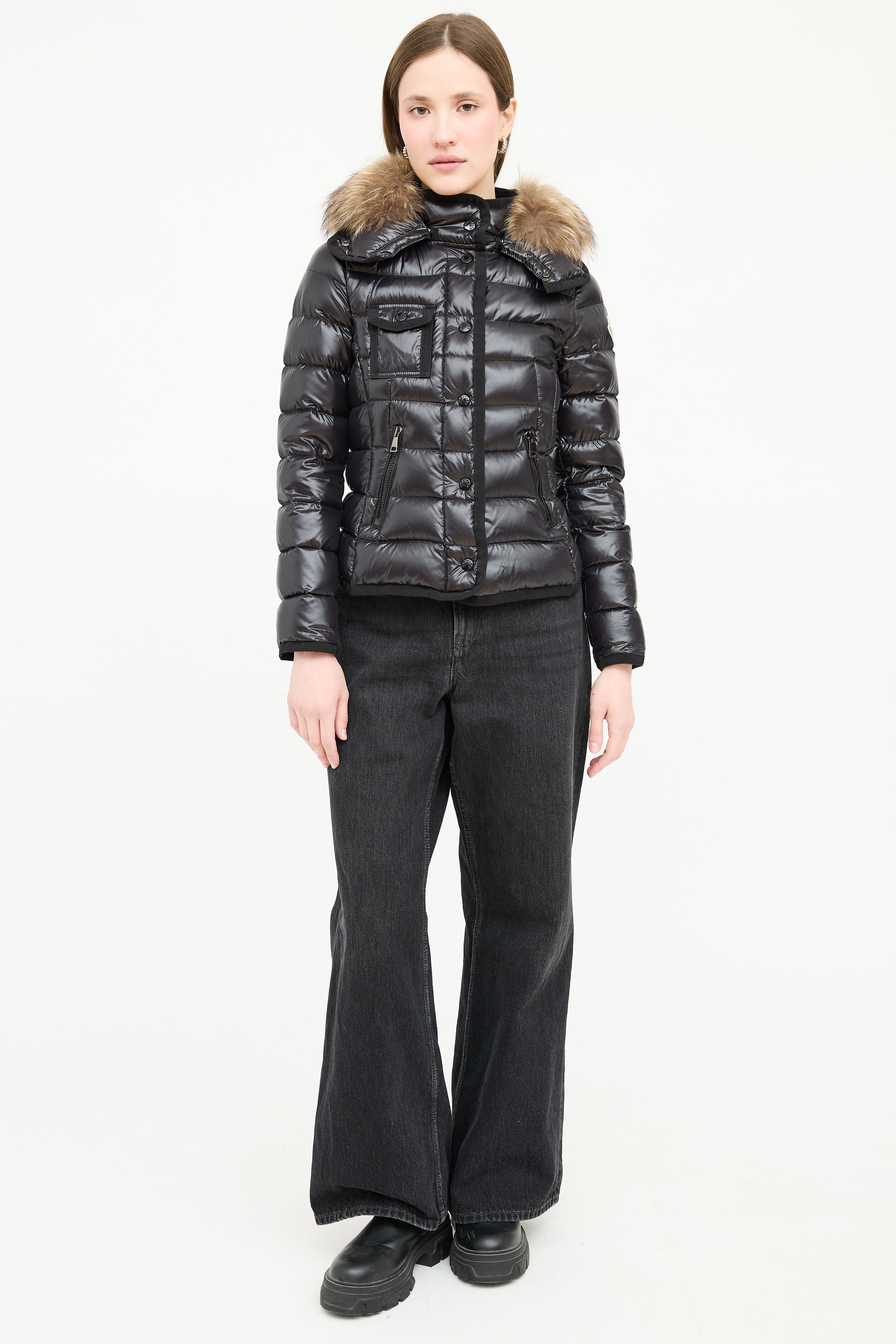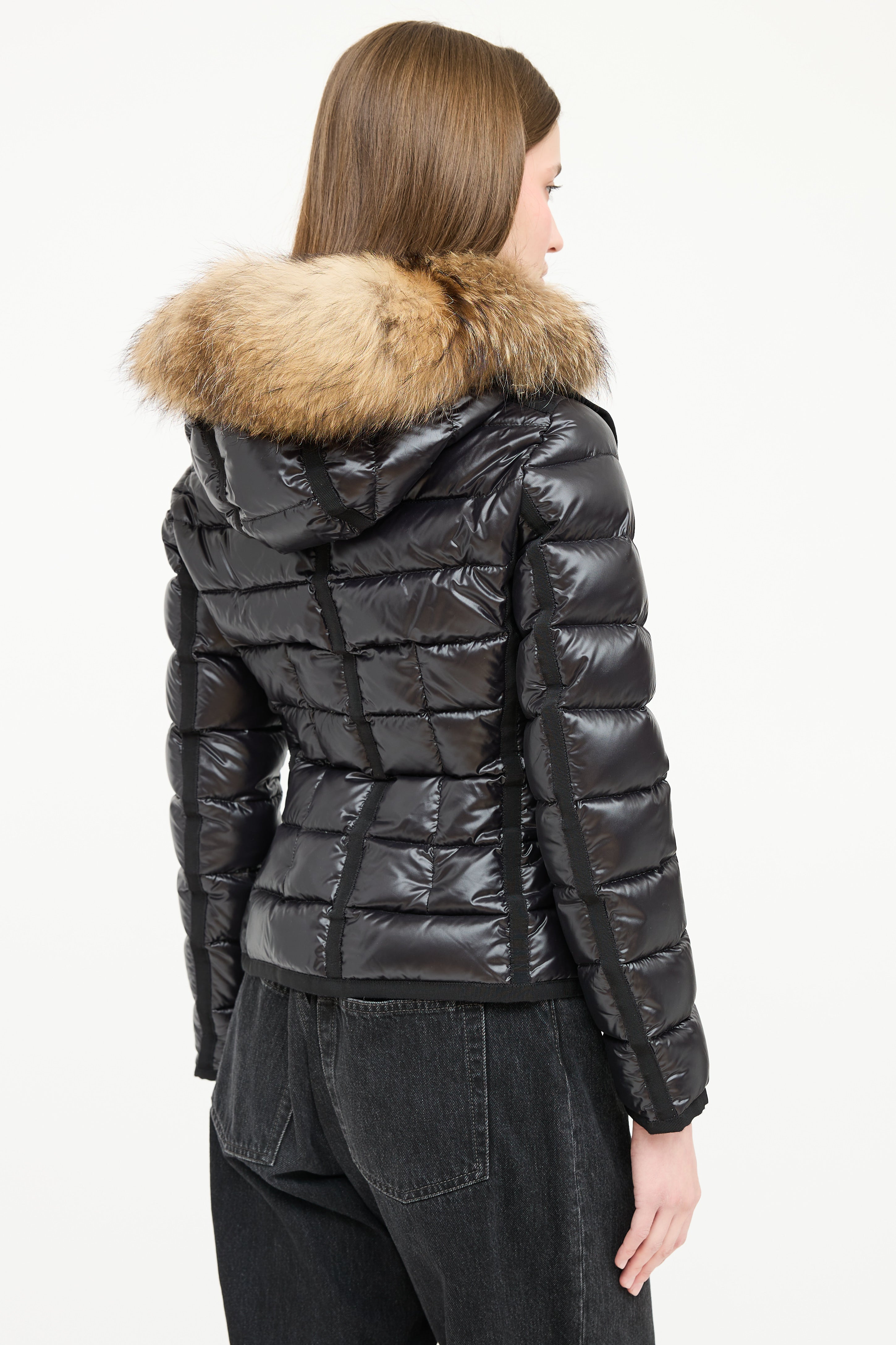 Pre-owned Moncler black down Armoise puffer jacket featuring a funnel collar, detachable hood with fur trim, front double zip closure, three front pockets, and grosgrain trim. Padded and lined.