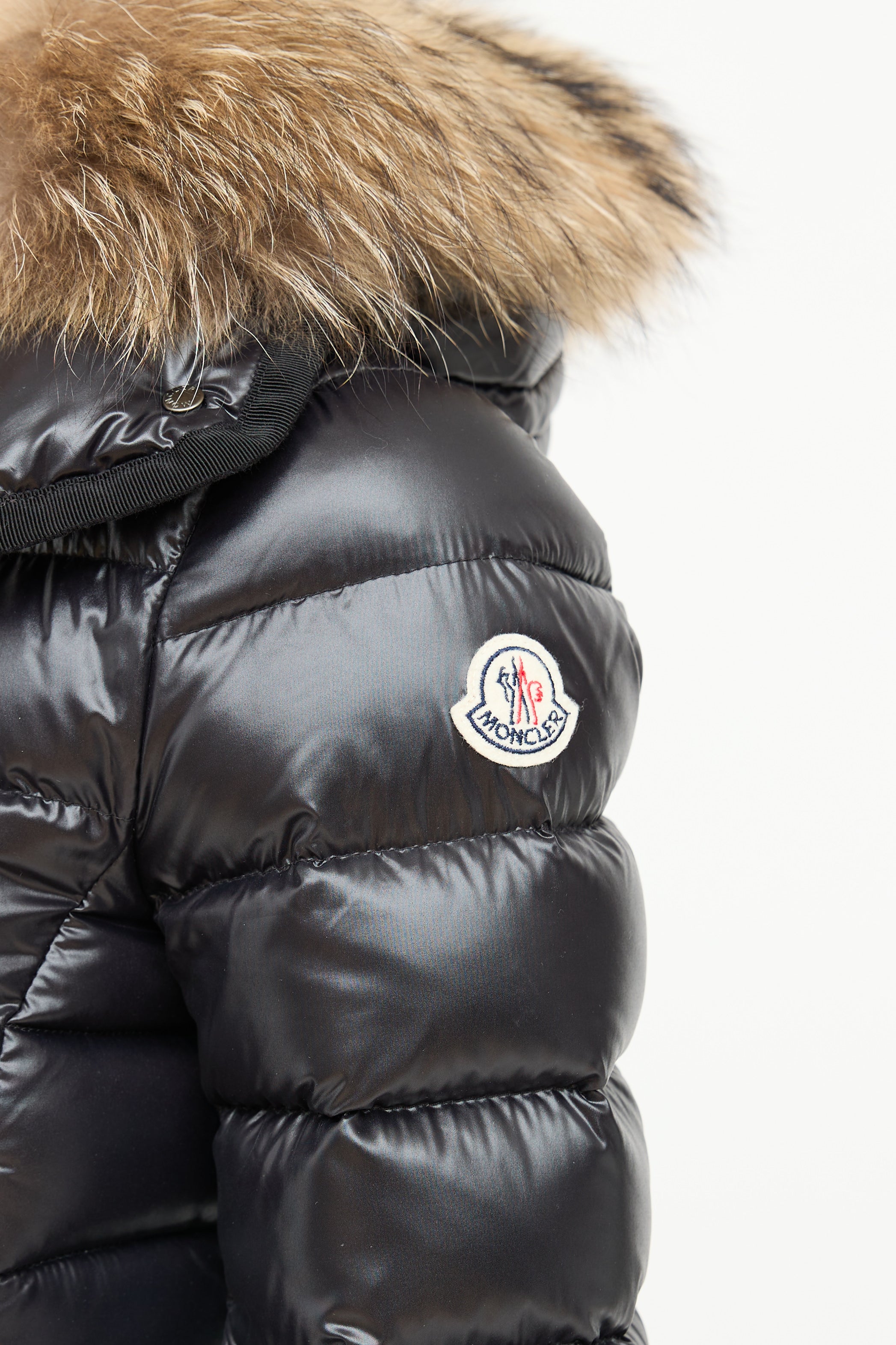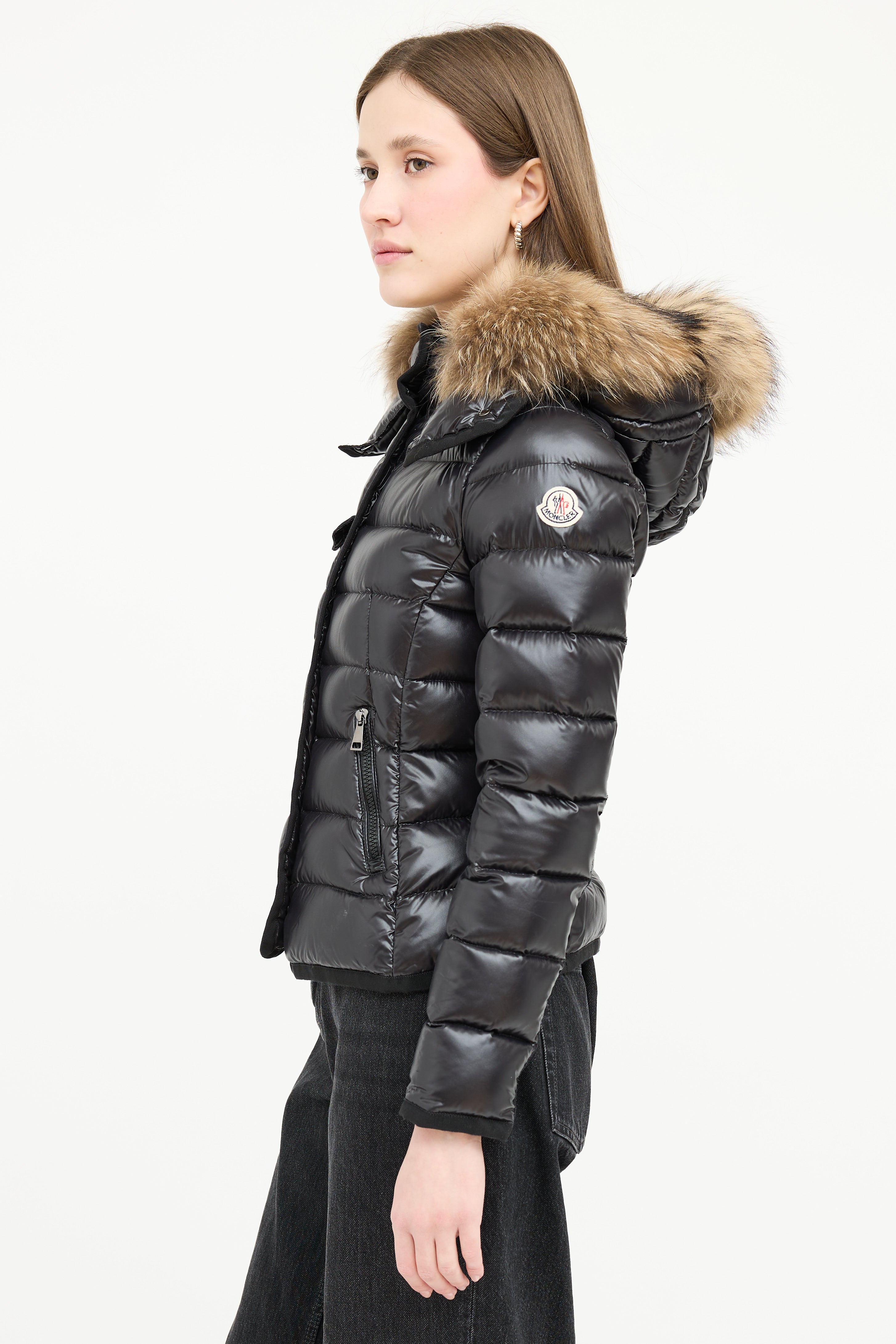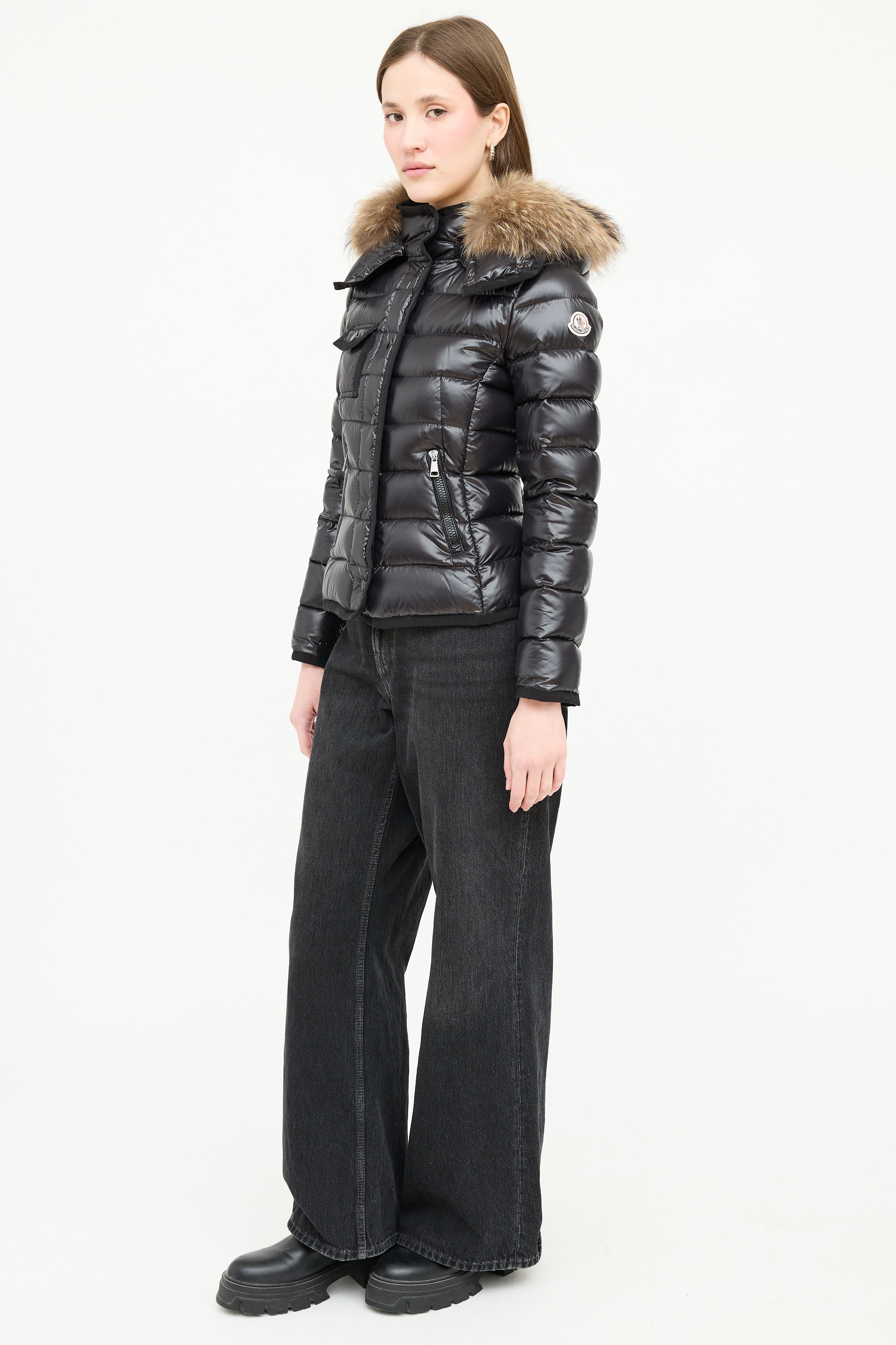Pre-owned Moncler black down Armoise puffer jacket featuring a funnel collar, detachable hood with fur trim, front double zip closure, three front pockets, and grosgrain trim. Padded and lined.