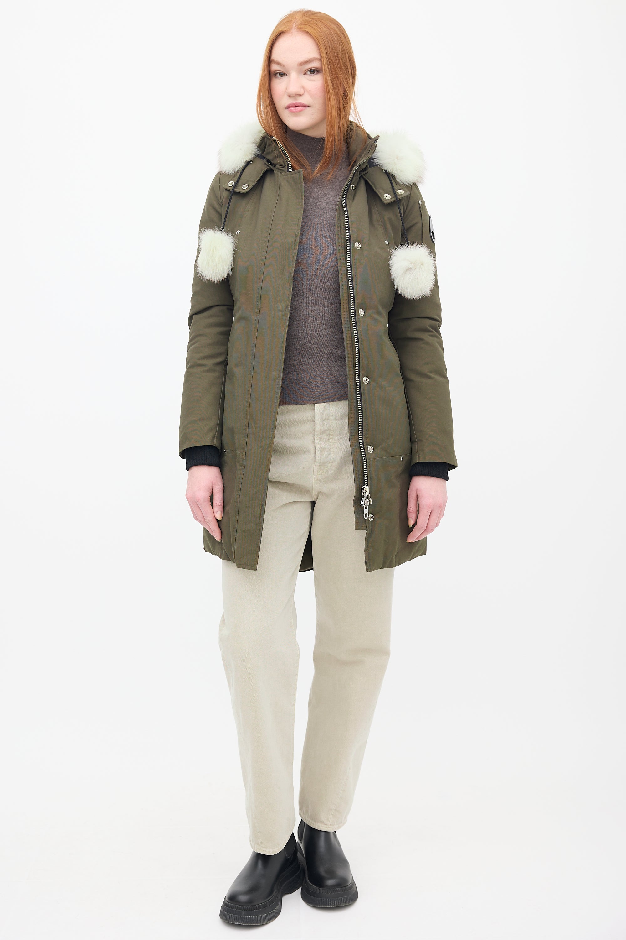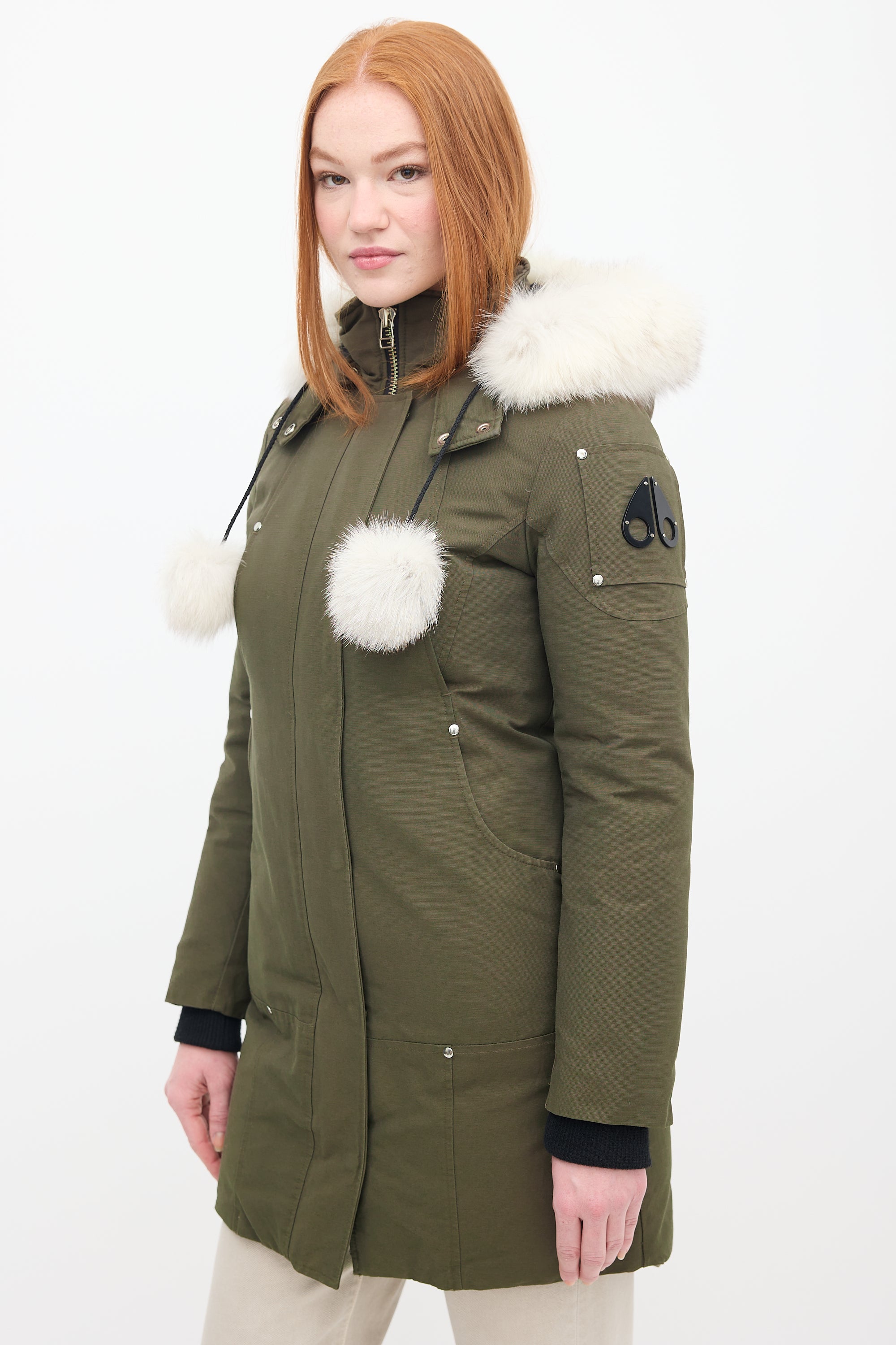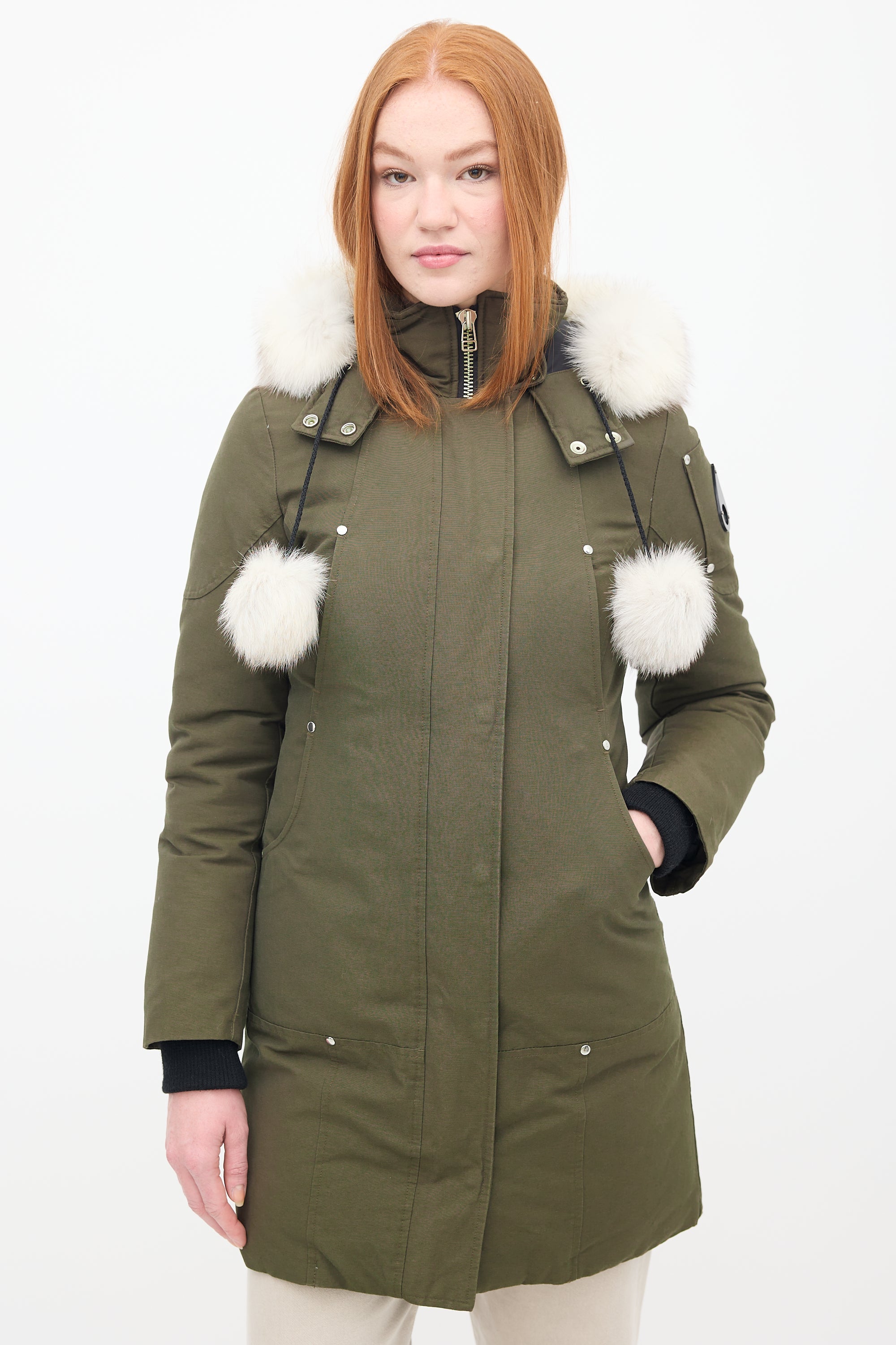 Pre-owned Moose Knuckles khaki green Stirling down parka featuring a stand collar, removable hood with fur trim and pom poms, front double zip closure, four front pockets, two interior pockets, black signature hardware embellishment at left arm, and inset ribbed cuffs. Padded and lined.
