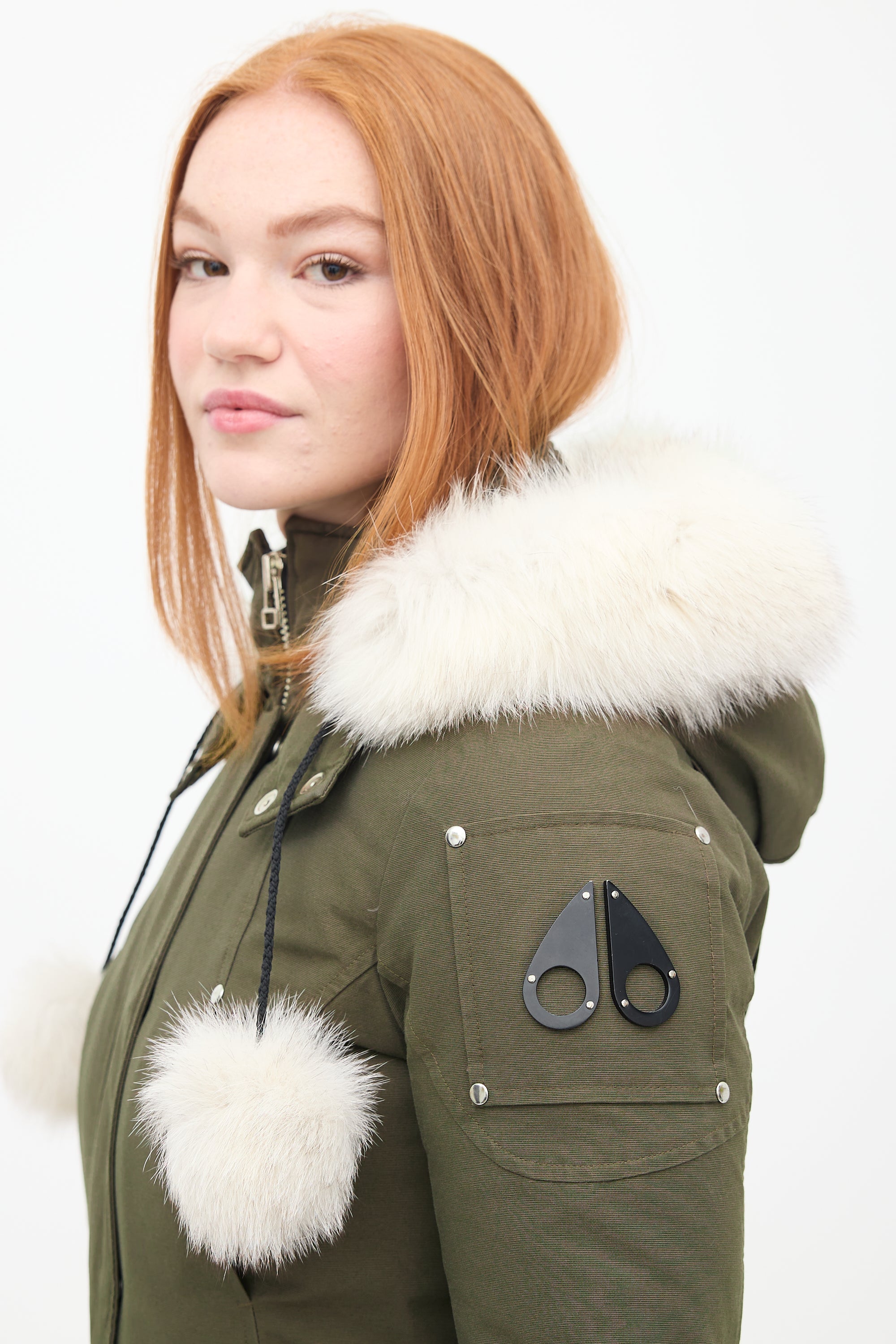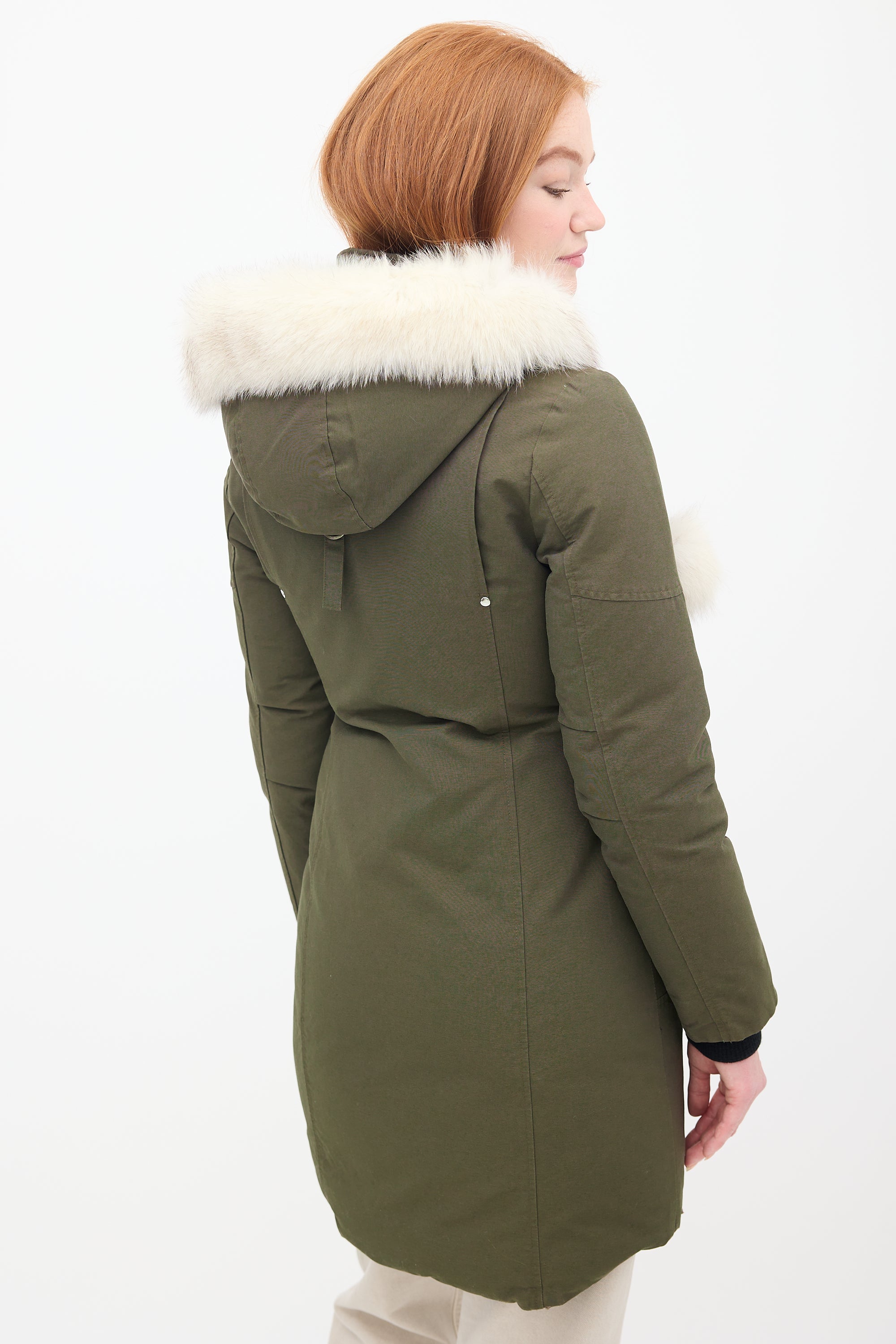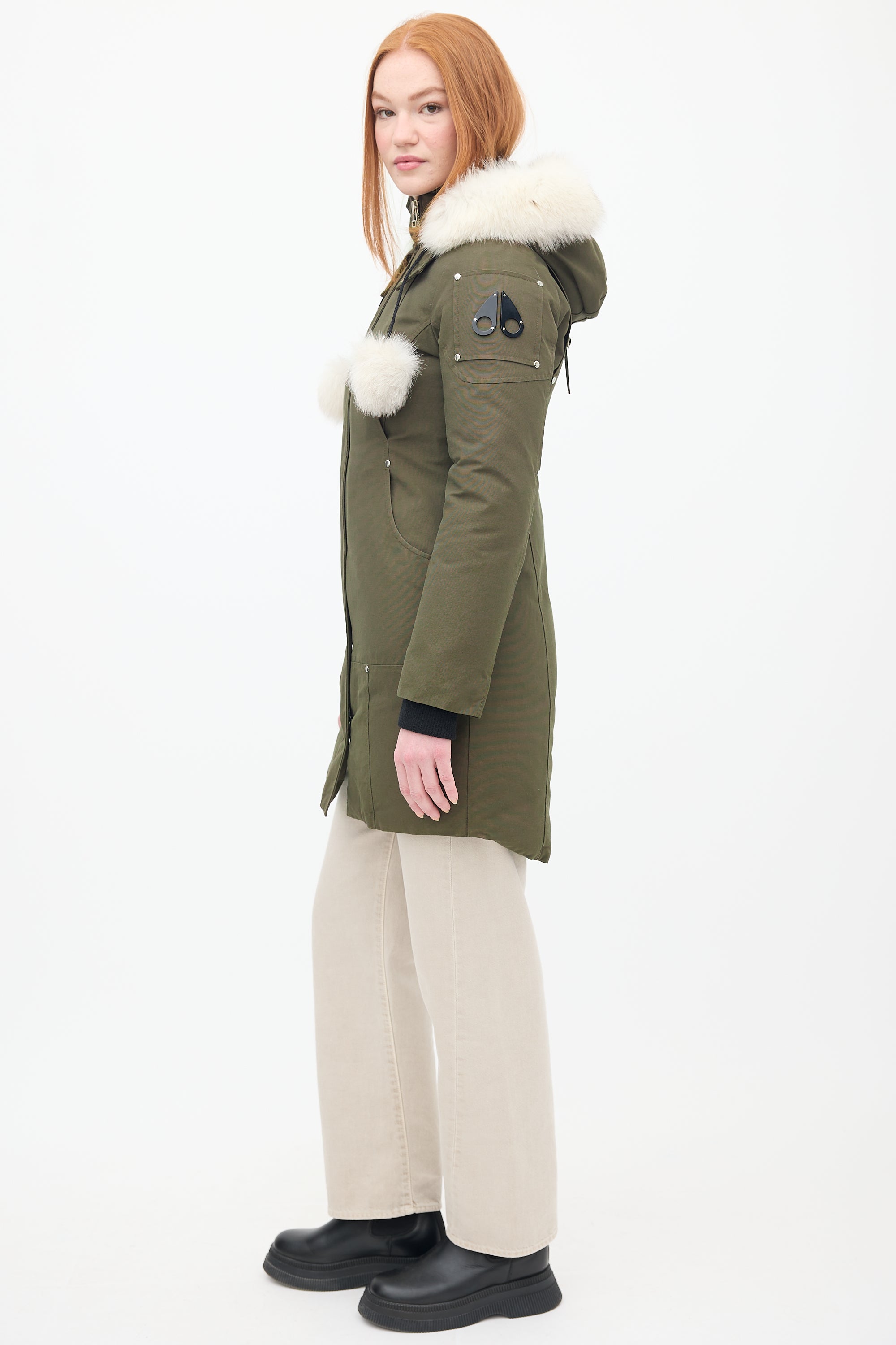 Pre-owned Moose Knuckles khaki green Stirling down parka featuring a stand collar, removable hood with fur trim and pom poms, front double zip closure, four front pockets, two interior pockets, black signature hardware embellishment at left arm, and inset ribbed cuffs. Padded and lined.