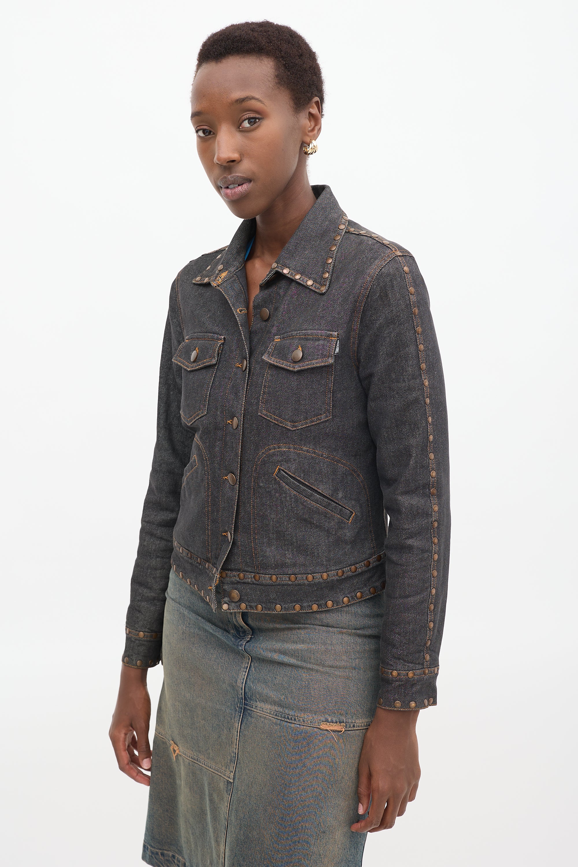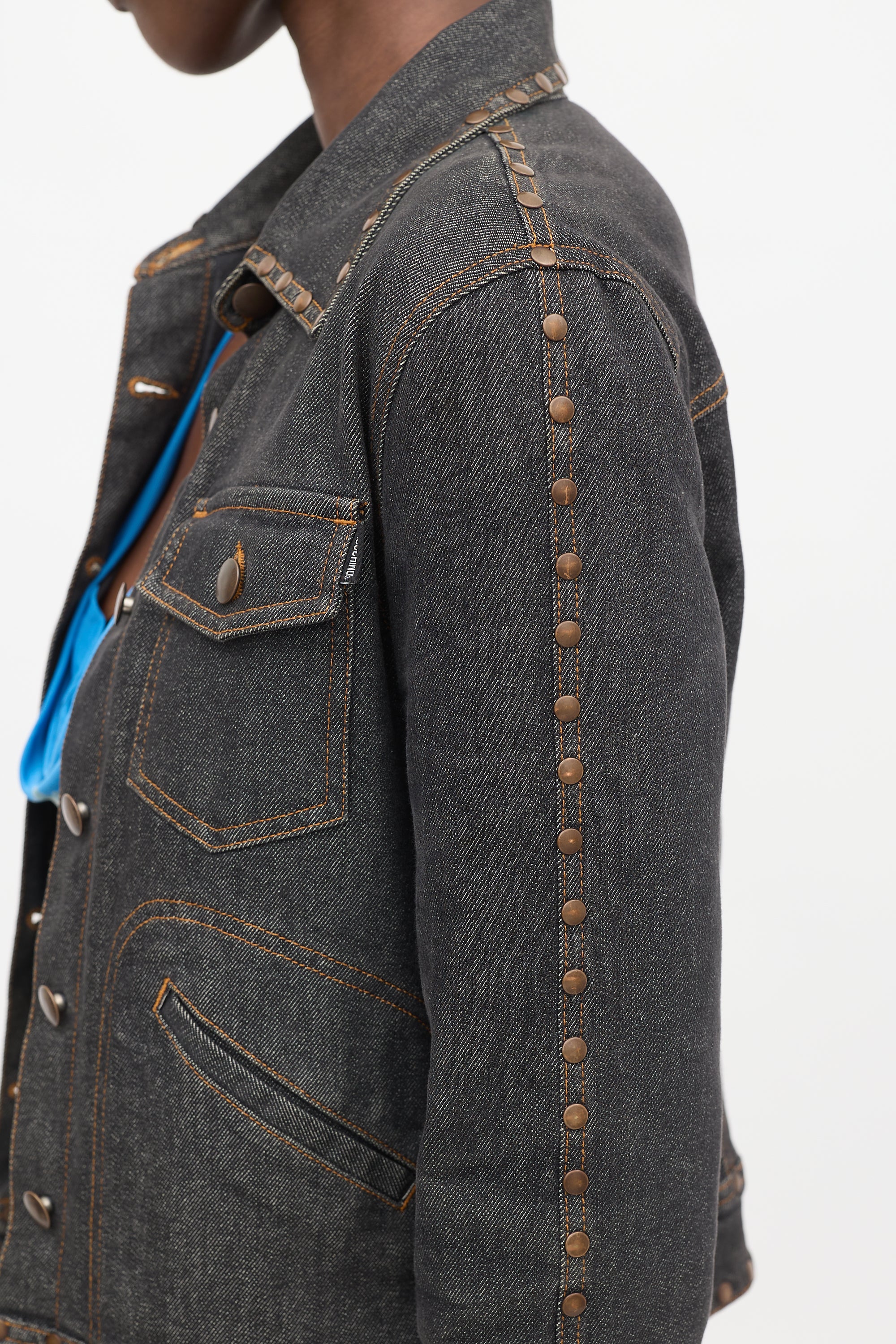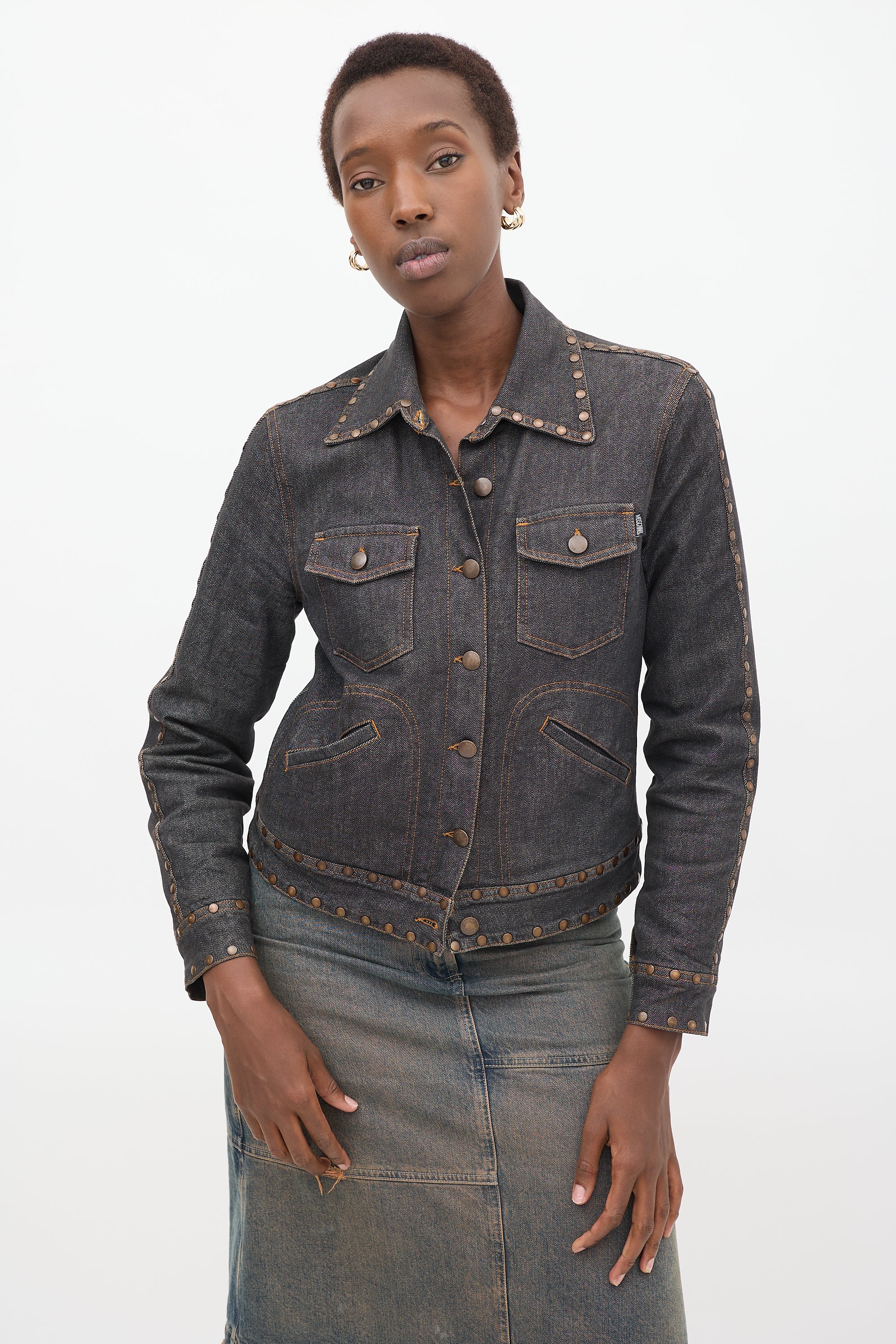 Pre-owned Moschino black denim jacket featuring orange contrast stitching, pointed collar, buttoned up front, two front buttoned flap pockets, two slip pockets at hips, long sleeves with buttoned cuffs, and bronze studded trim. Fleece Lined.