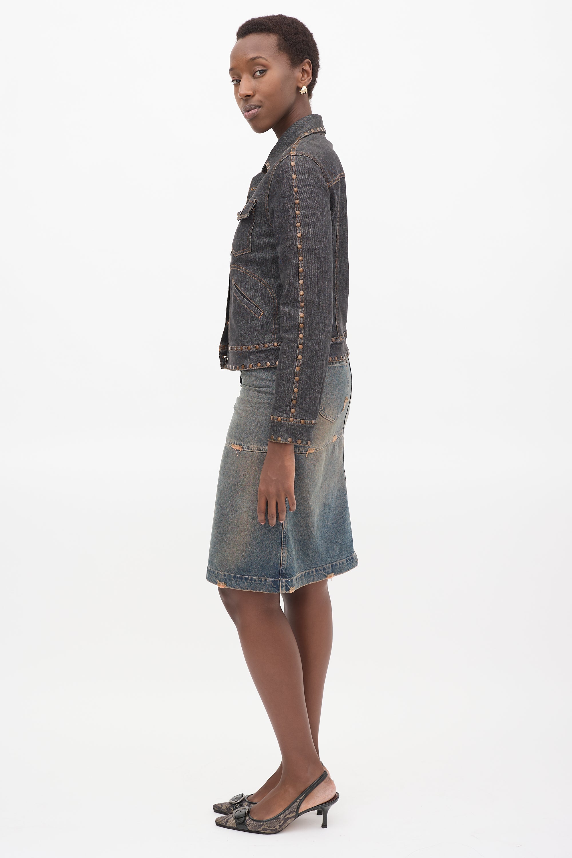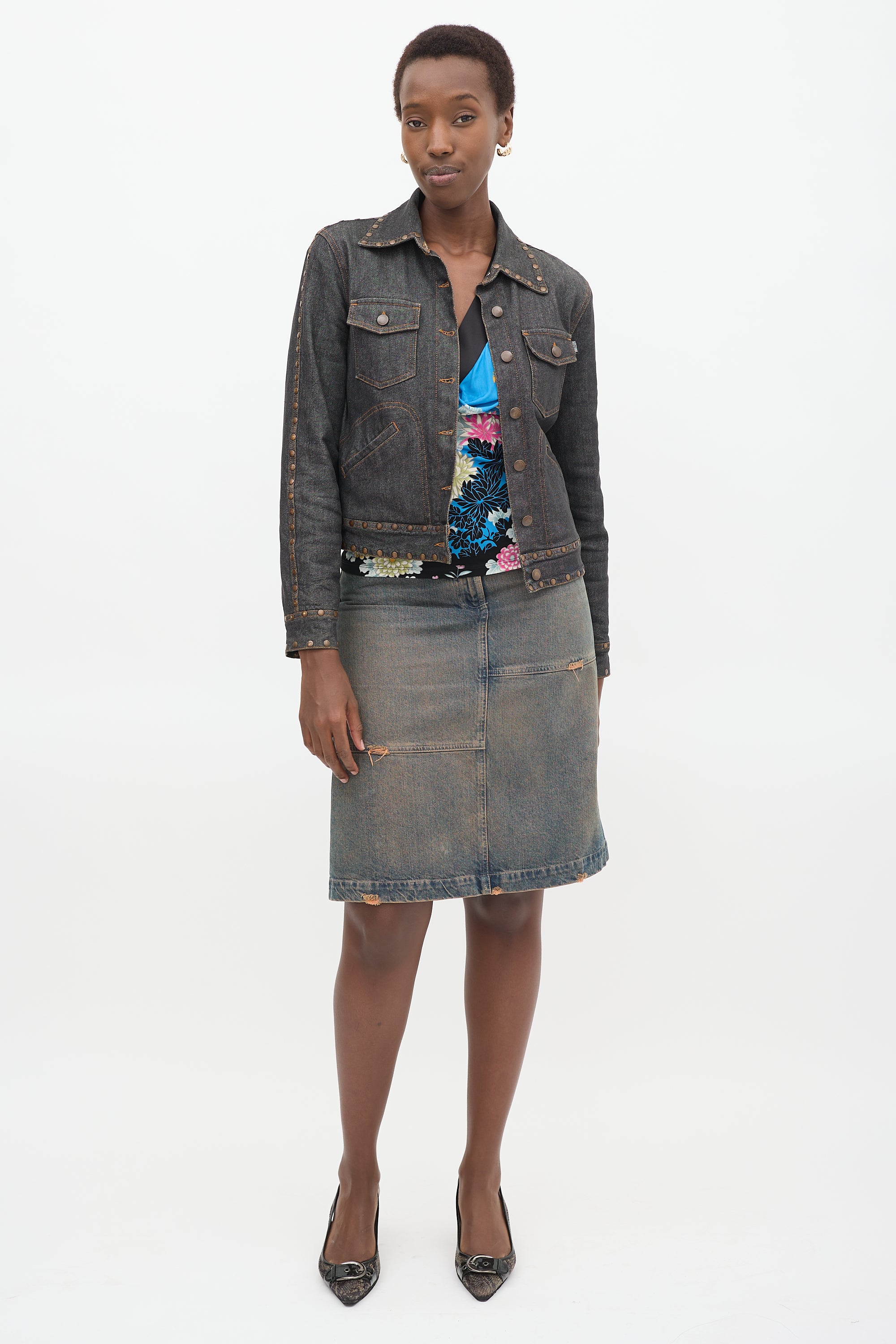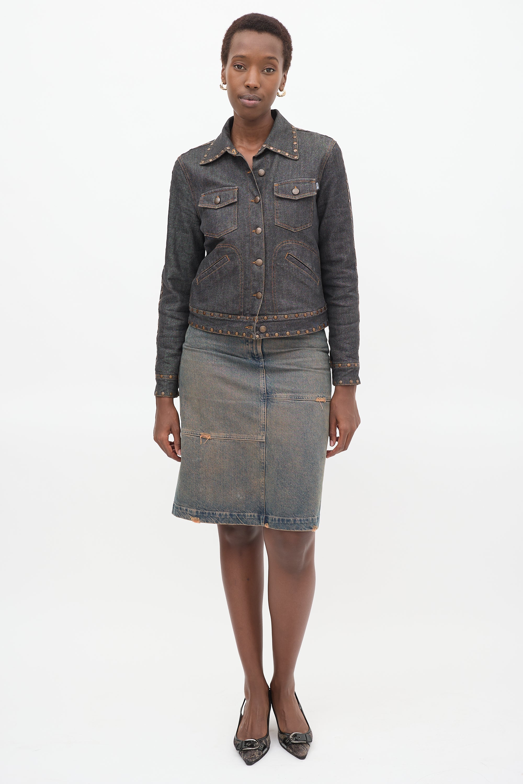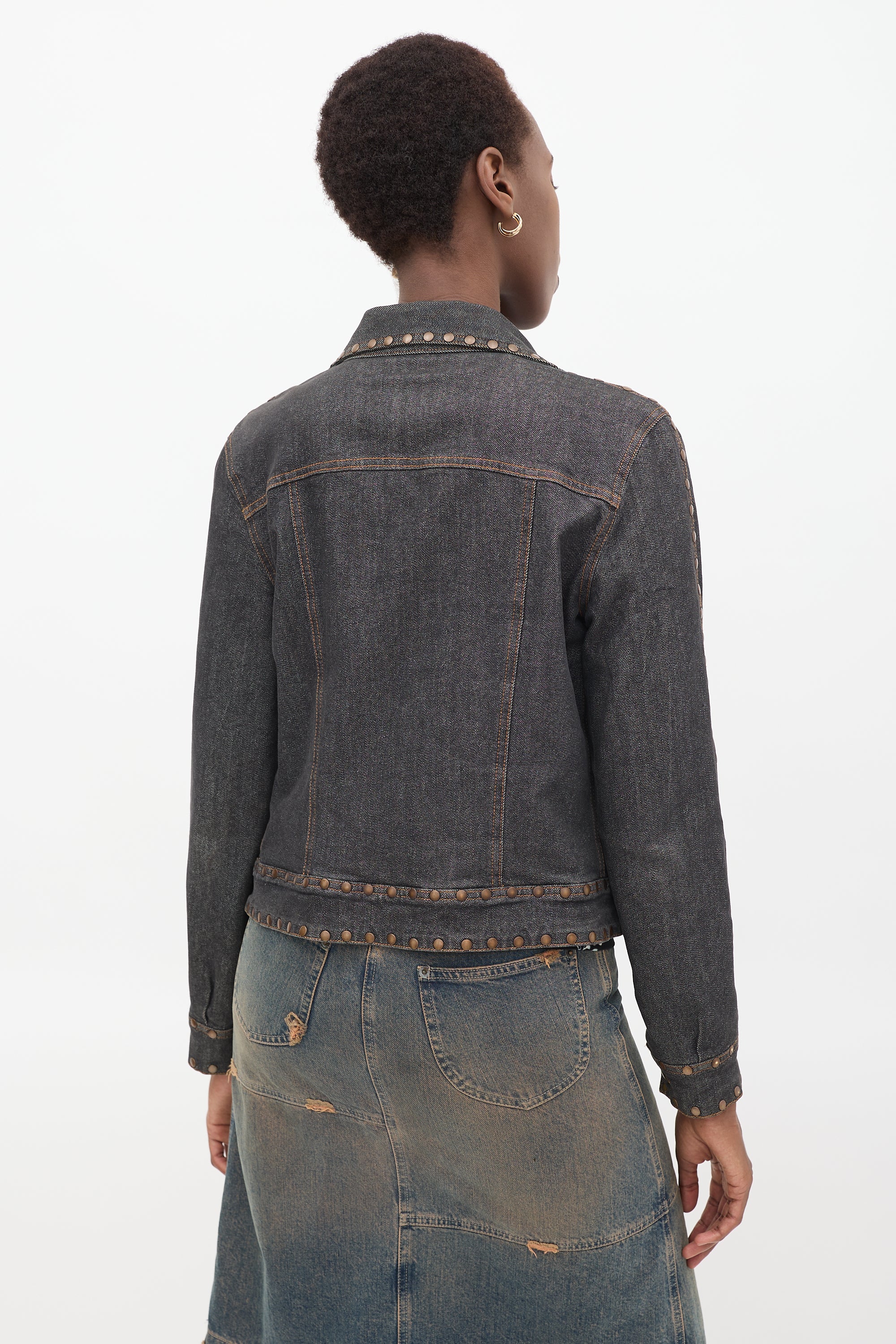 Pre-owned Moschino black denim jacket featuring orange contrast stitching, pointed collar, buttoned up front, two front buttoned flap pockets, two slip pockets at hips, long sleeves with buttoned cuffs, and bronze studded trim. Fleece Lined.