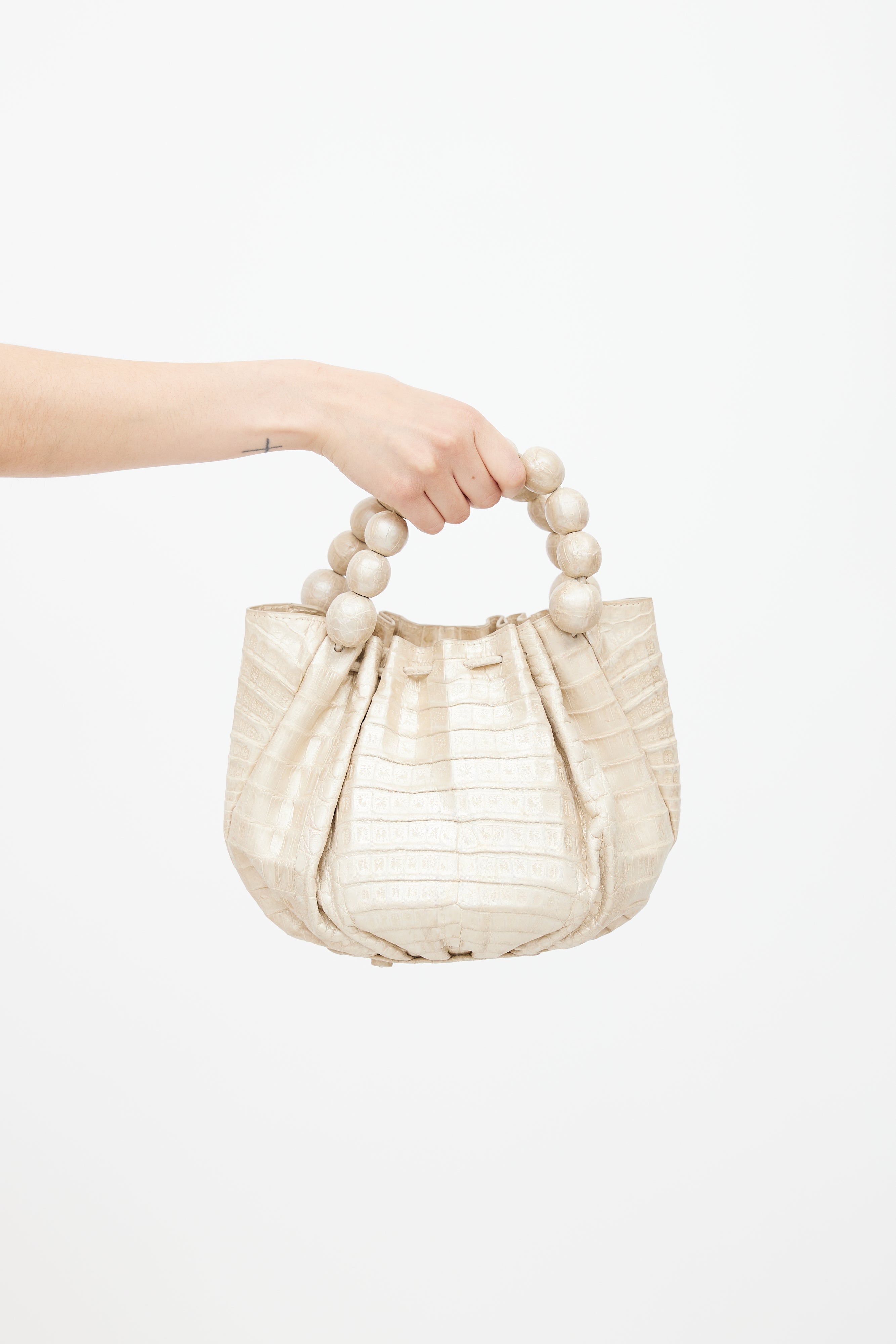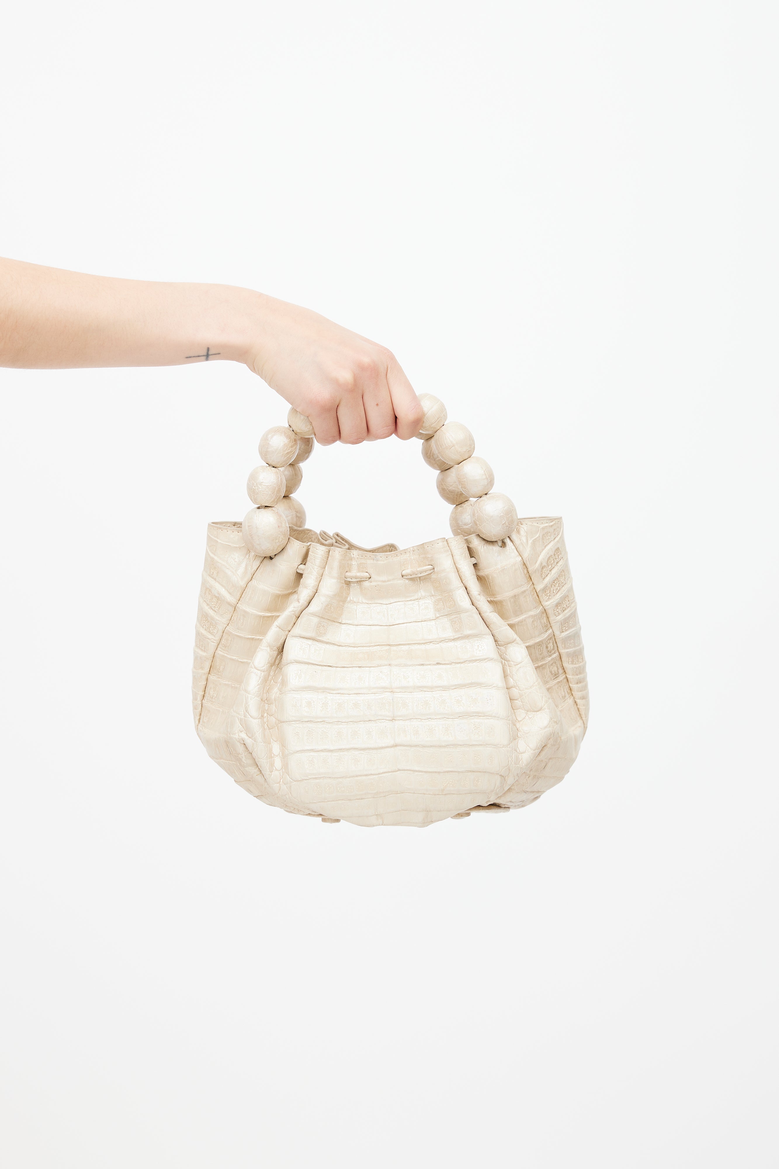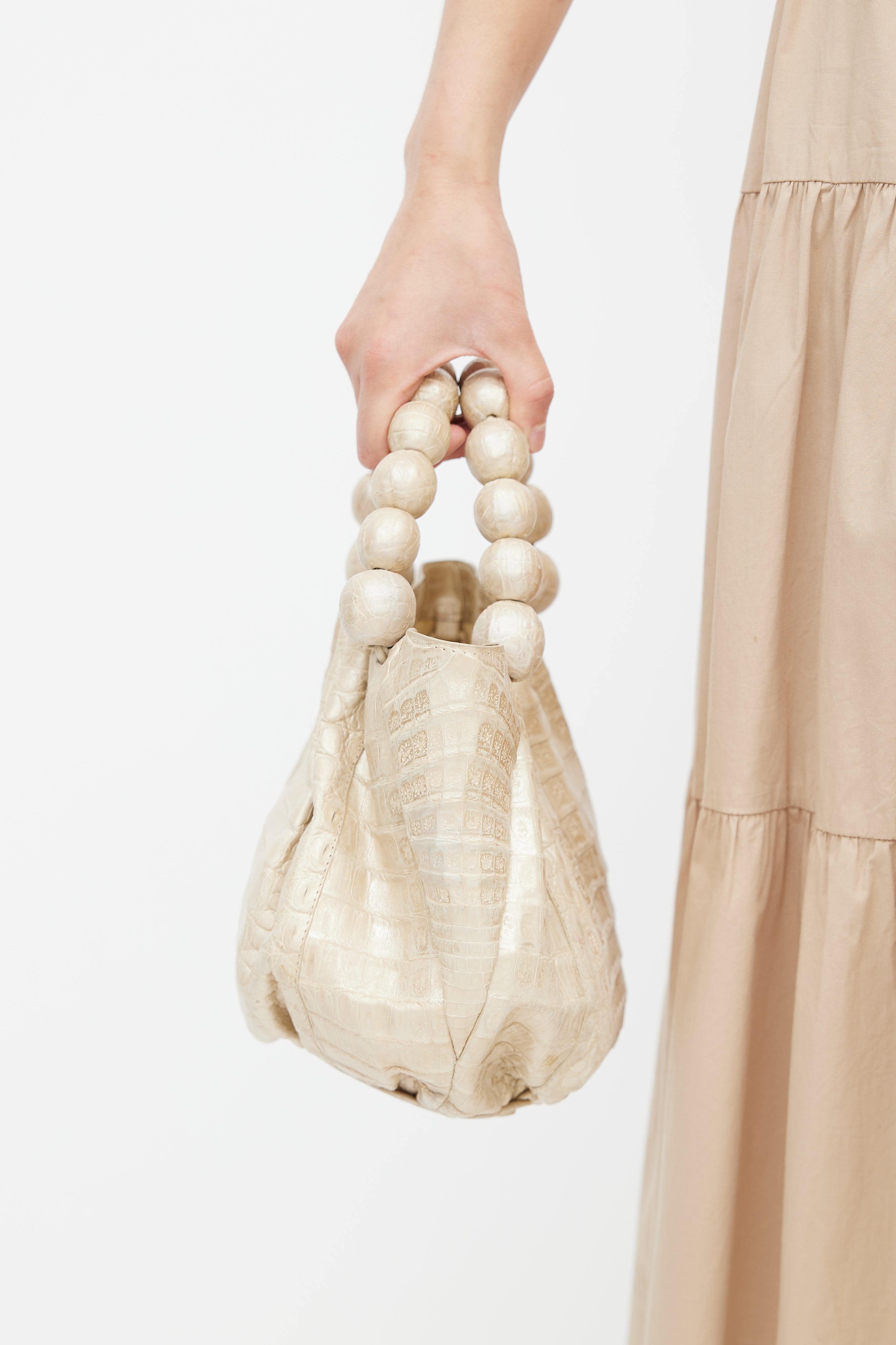 Pre-owned Nancy Gonzalez cream leather bag featuring crocodile leather, two beaded top handles, one main compartment, protective feet at bottom of bag, and magnetic top closure.
