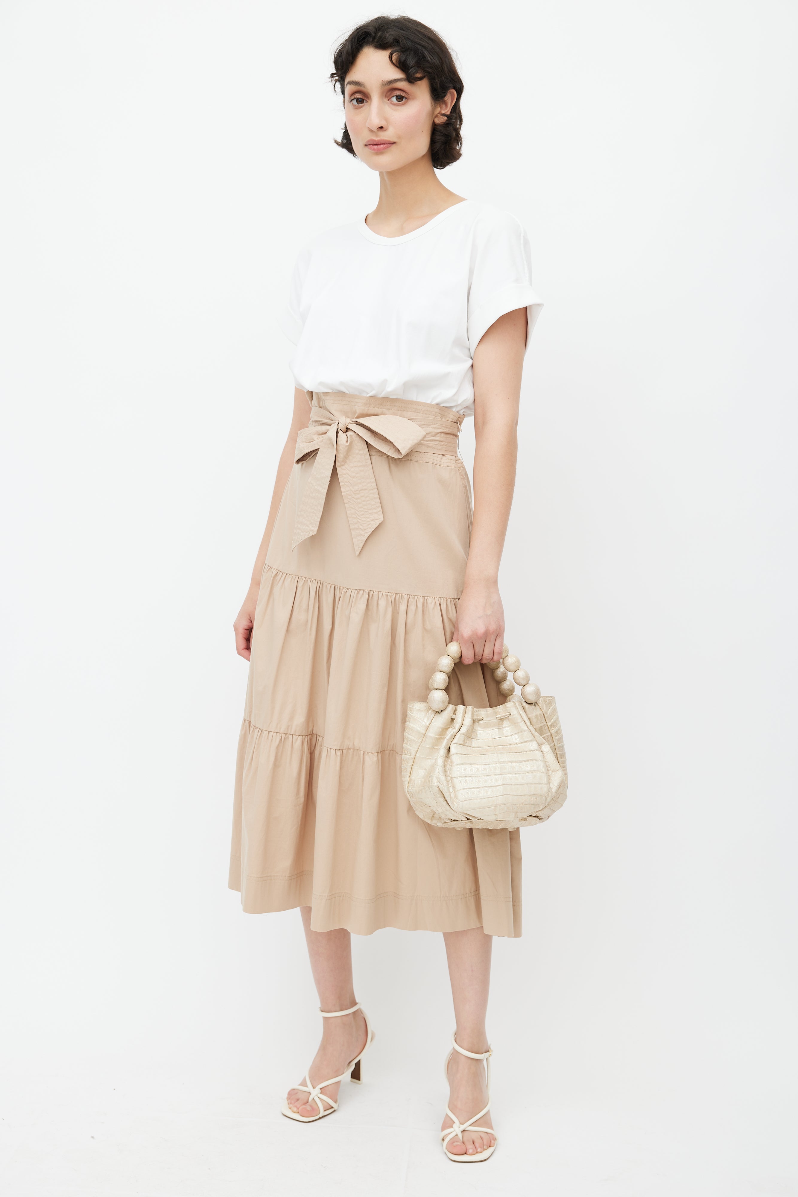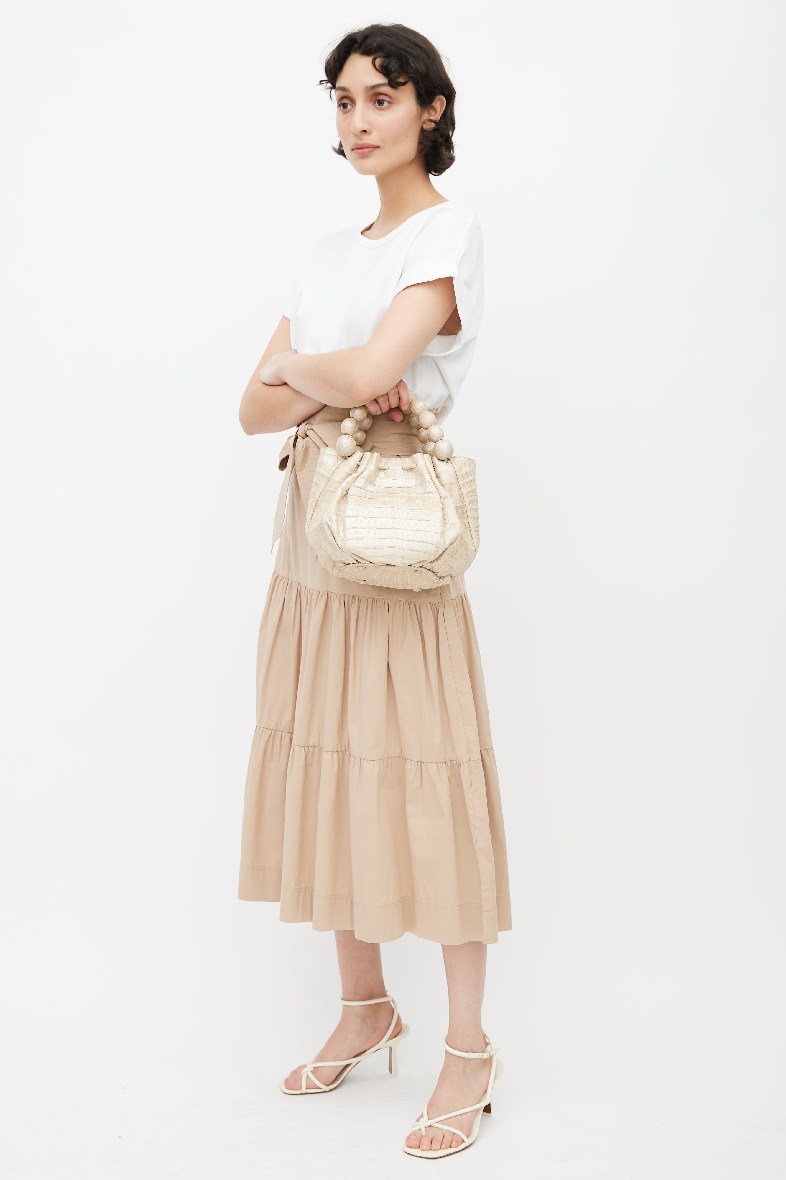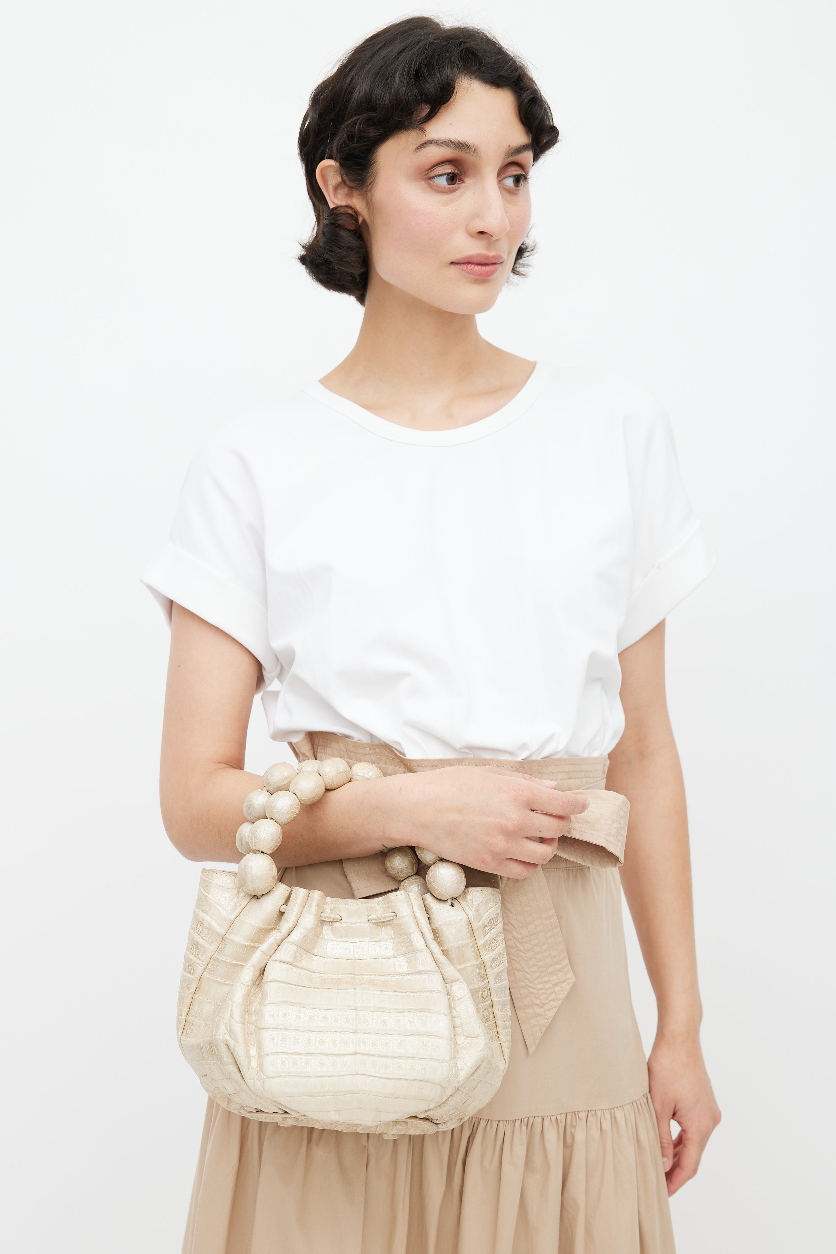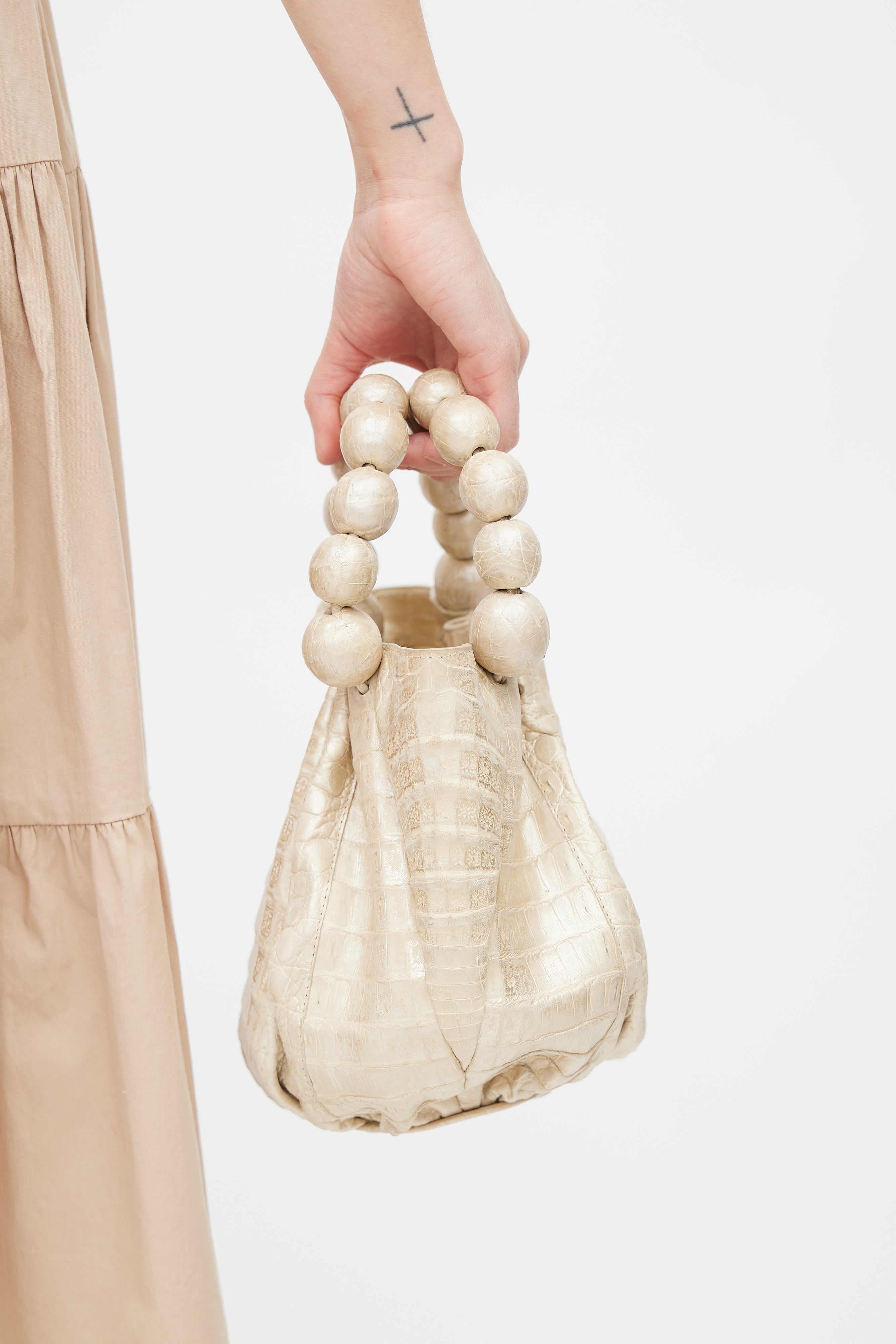 Pre-owned Nancy Gonzalez cream leather bag featuring crocodile leather, two beaded top handles, one main compartment, protective feet at bottom of bag, and magnetic top closure.