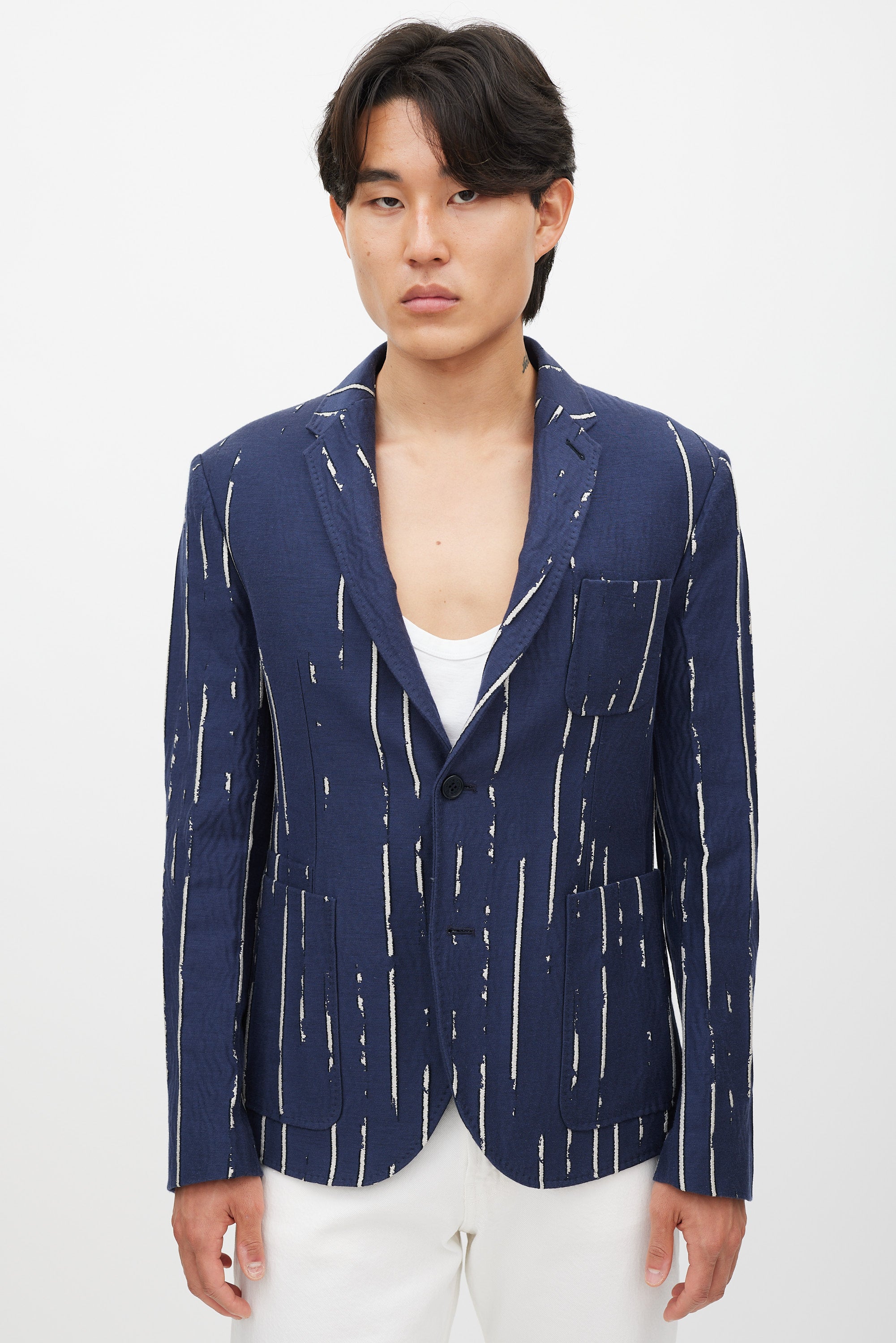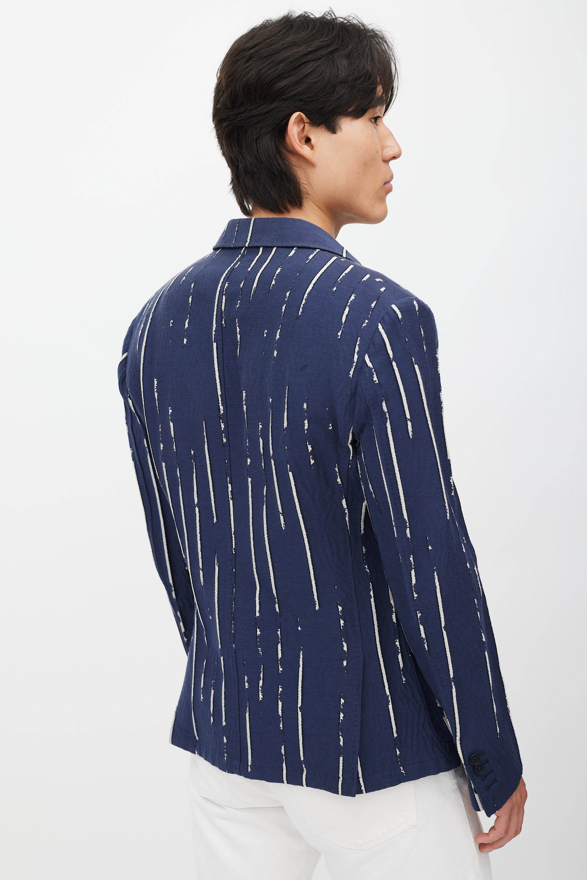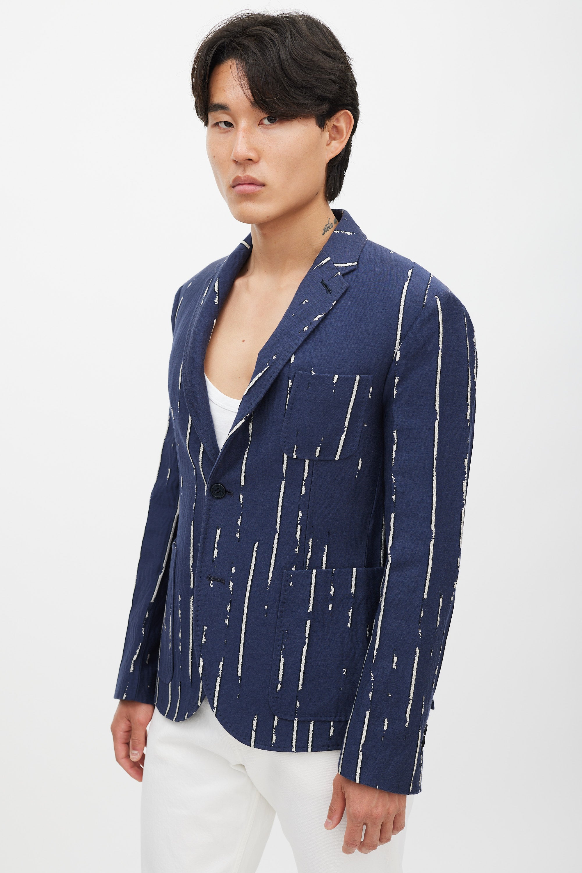 Pre-owned Neil Barrett navy blazer featuring white textured woven detailing, notched lapel, long sleeves with buttoned cuffs, one patch pocket at chest, two patch pockets at hip, tonal pocket square, and button up closure. Lined.