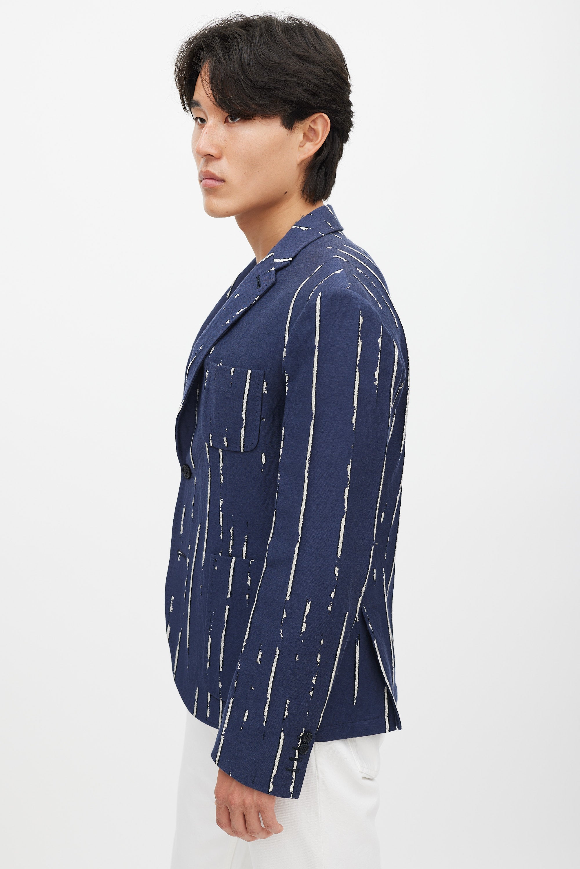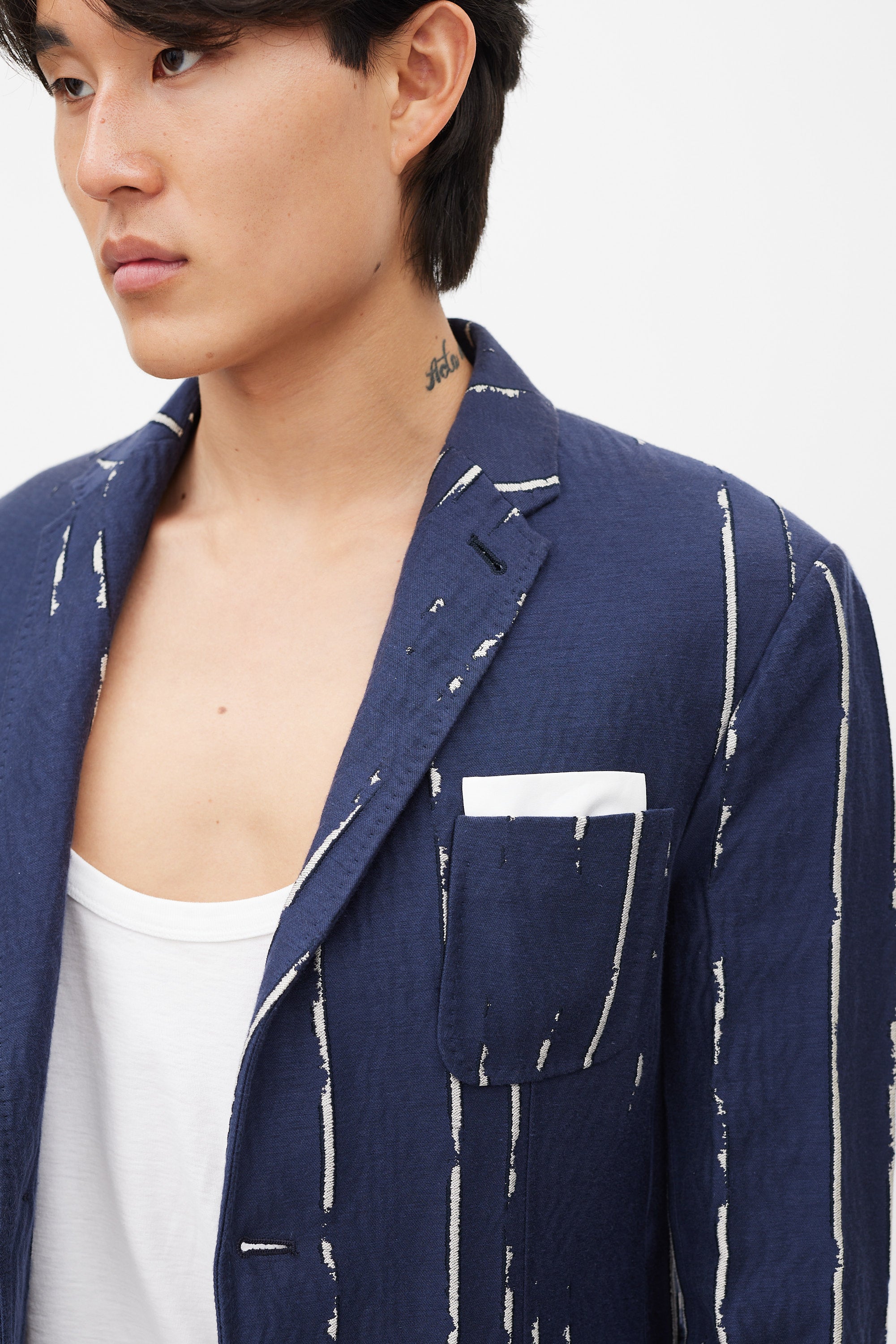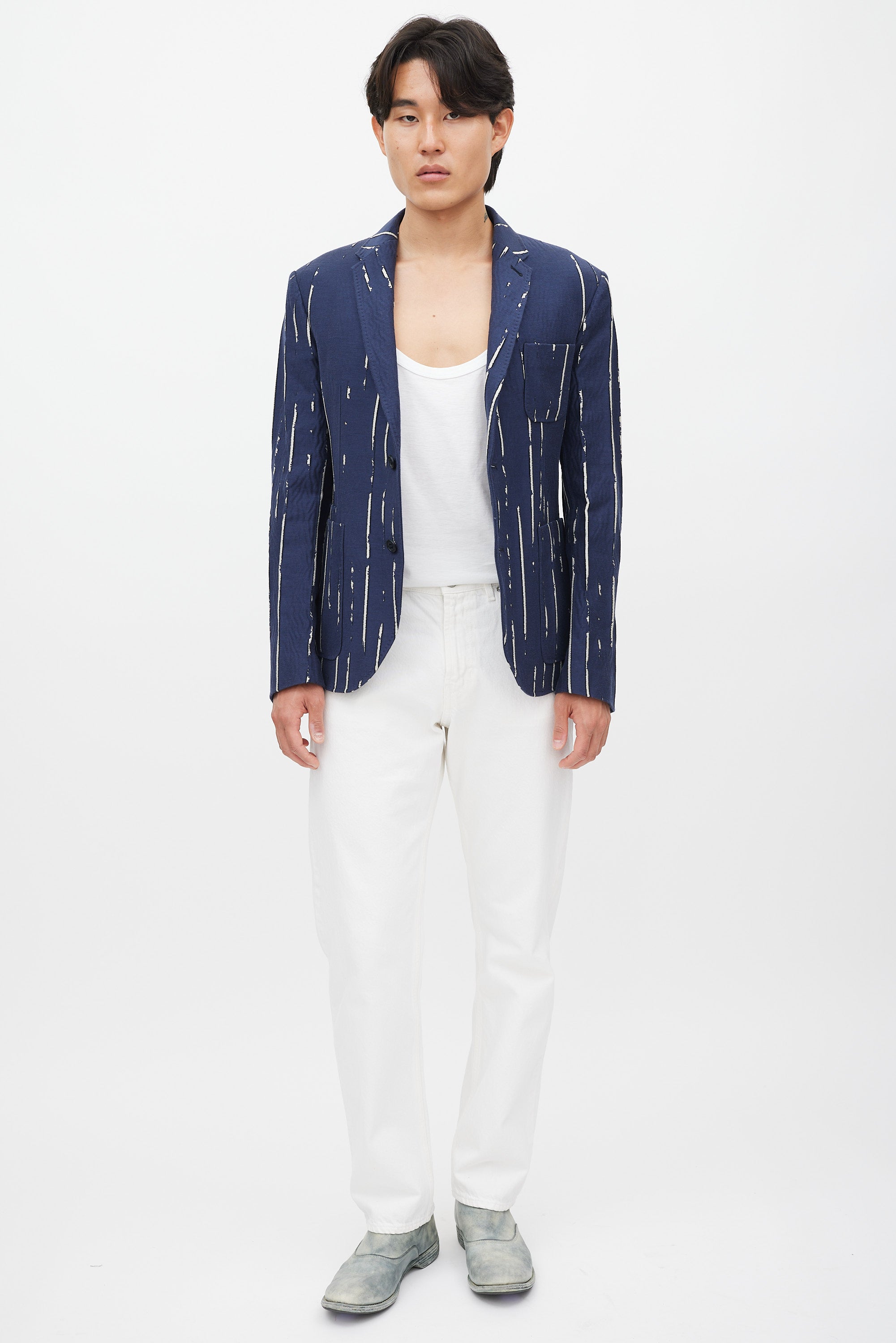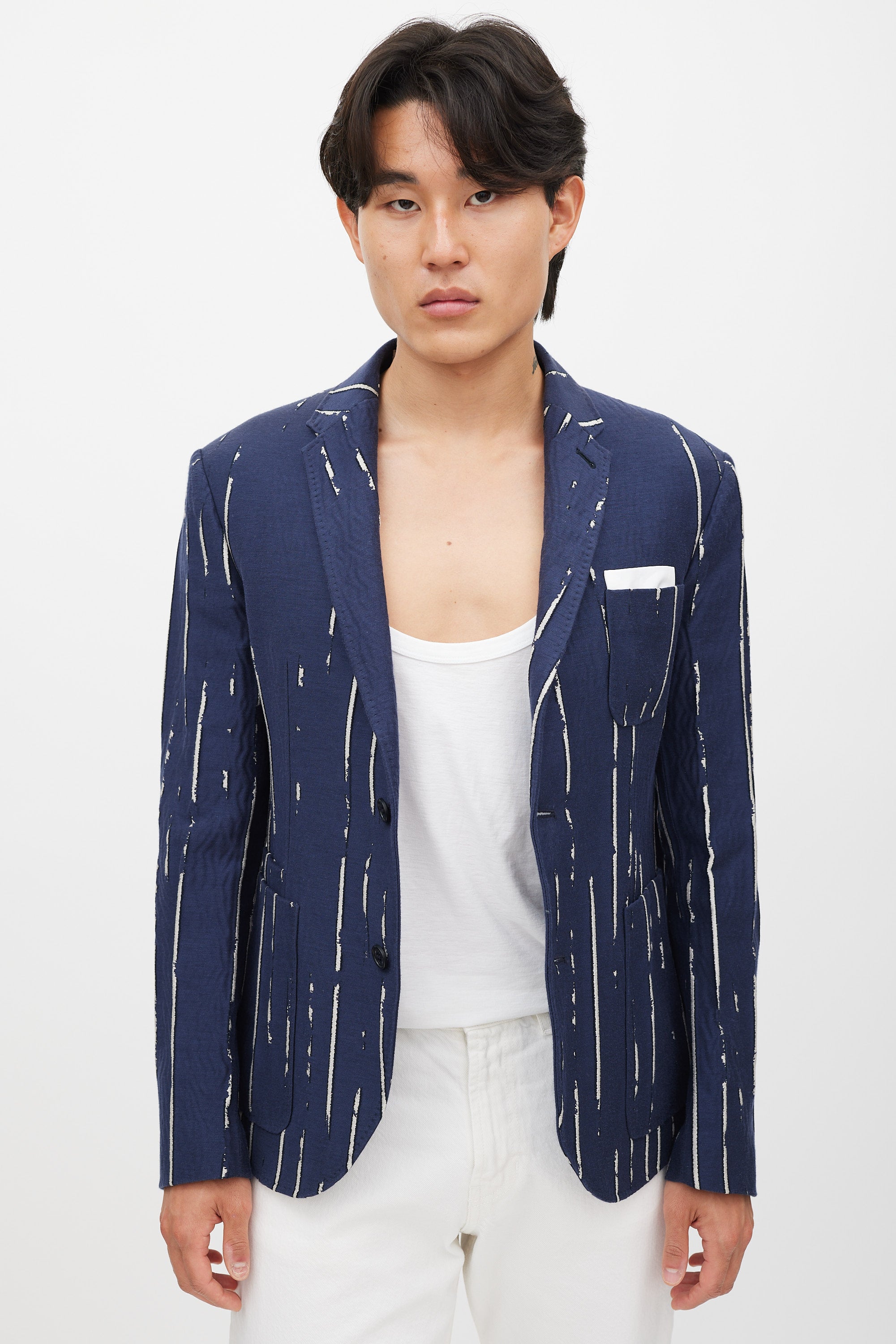 Pre-owned Neil Barrett navy blazer featuring white textured woven detailing, notched lapel, long sleeves with buttoned cuffs, one patch pocket at chest, two patch pockets at hip, tonal pocket square, and button up closure. Lined.