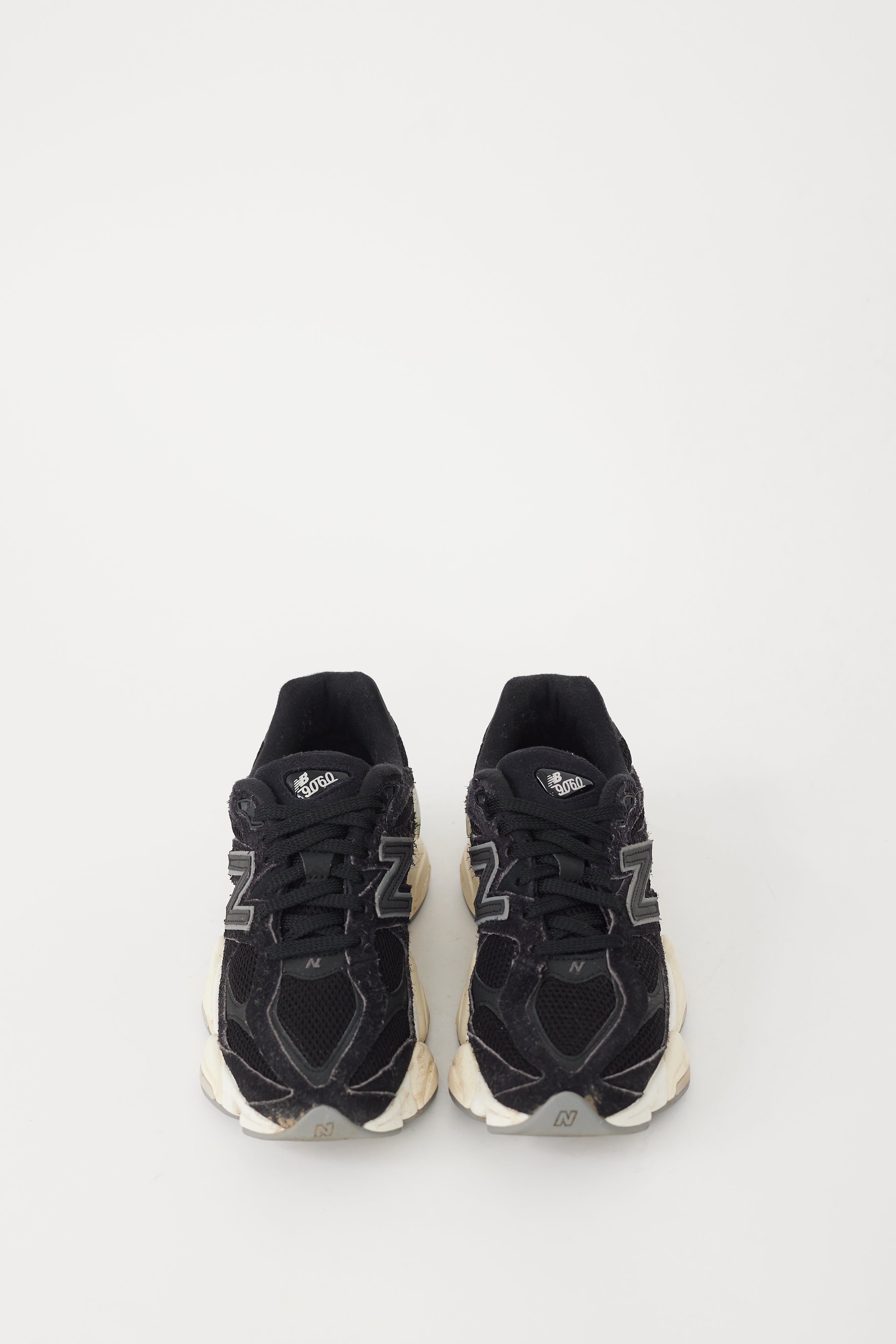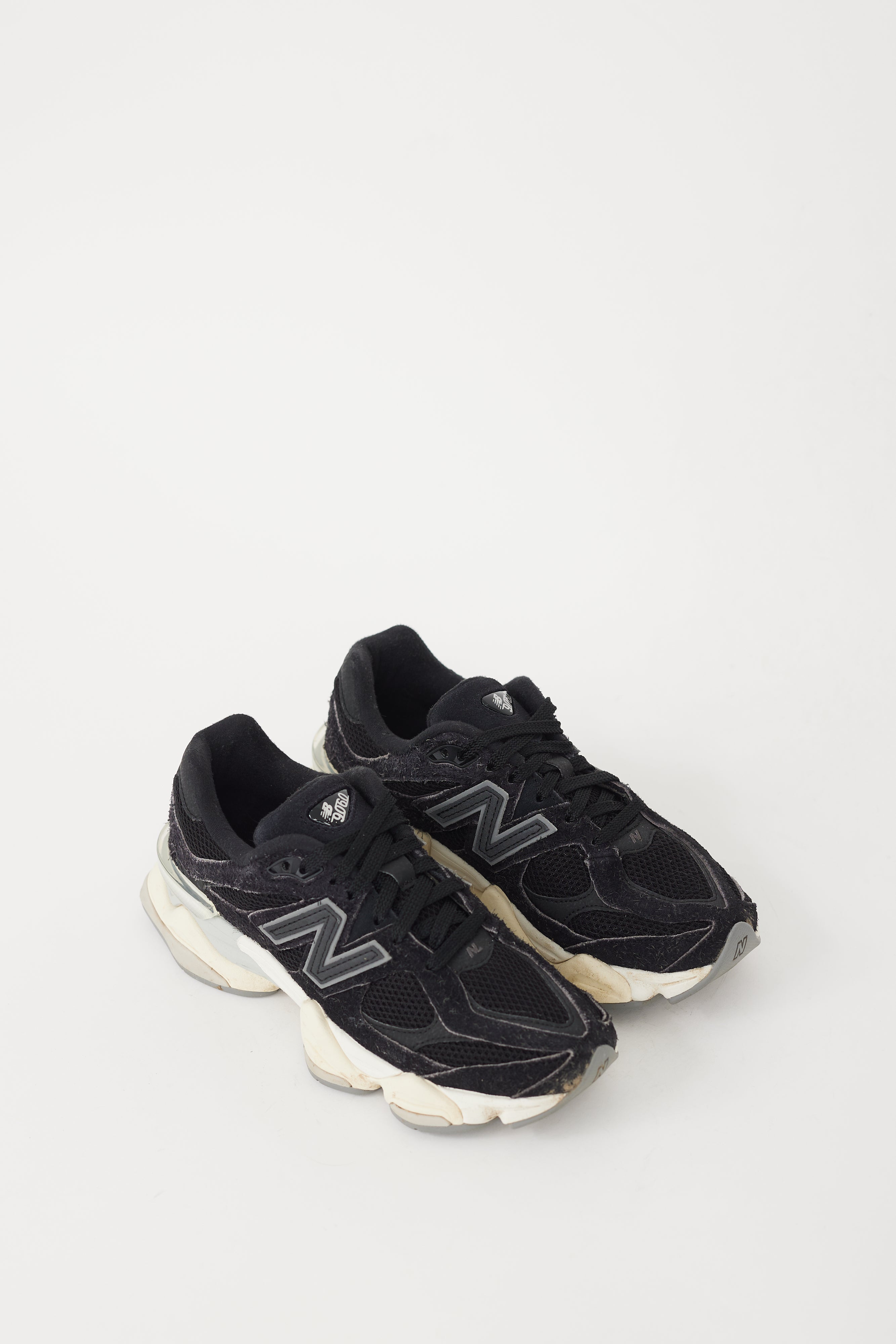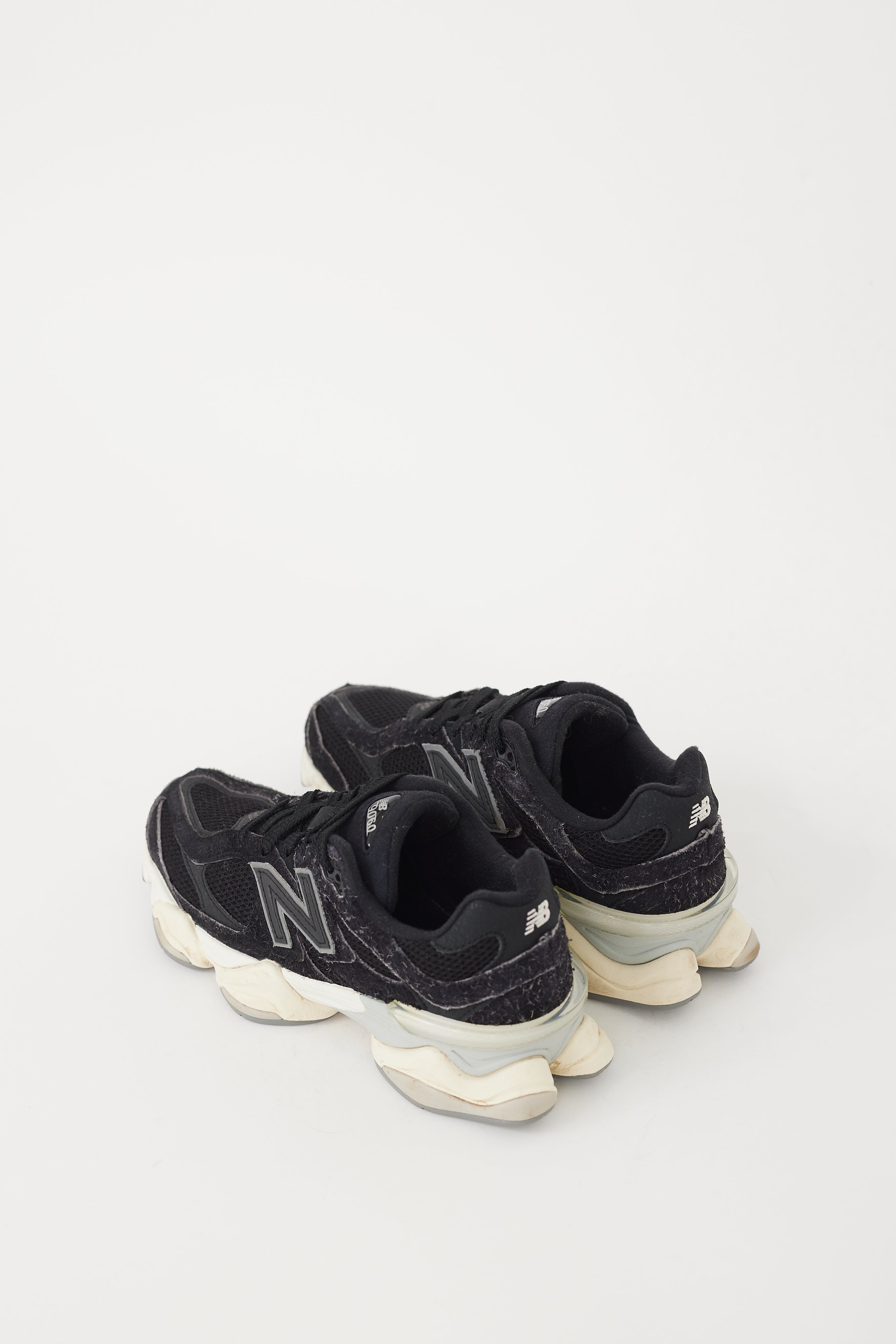 Pre-owned New Balance black 9060 leather sneakers featuring a round toe, mesh upper, logo patch at sides, embroidered logo at counter, white chunky midsole, translucent detail at heel, and lace up closure.