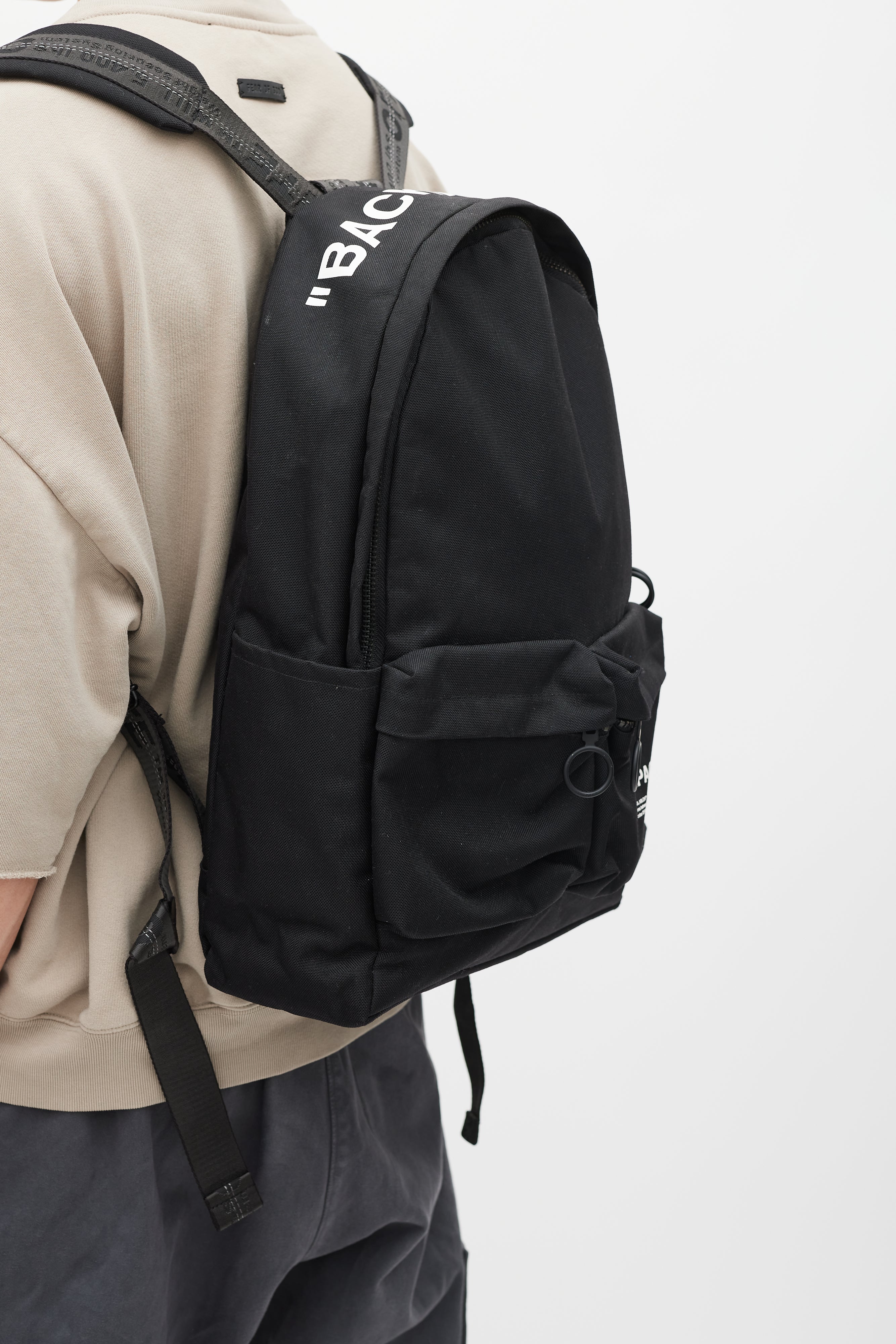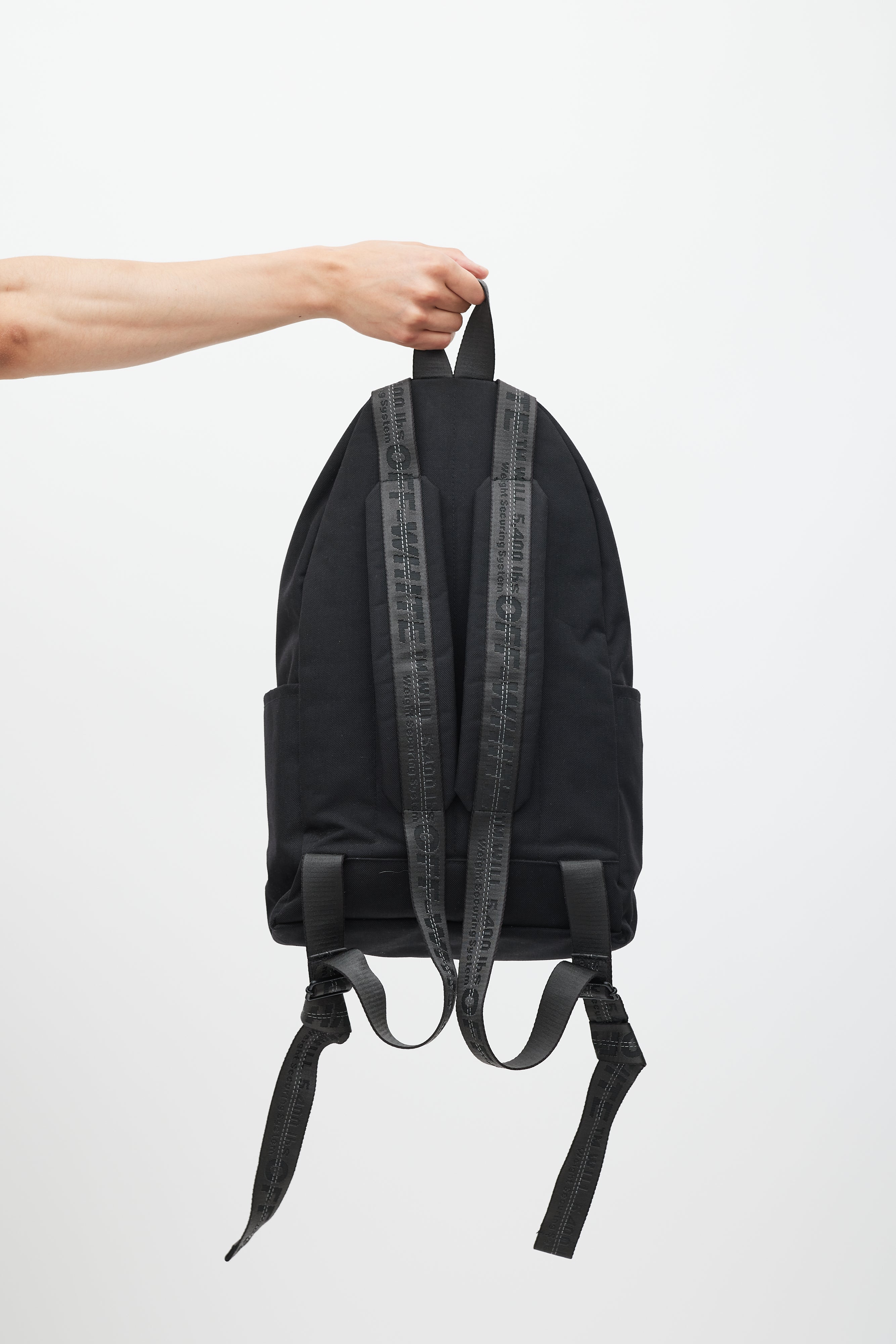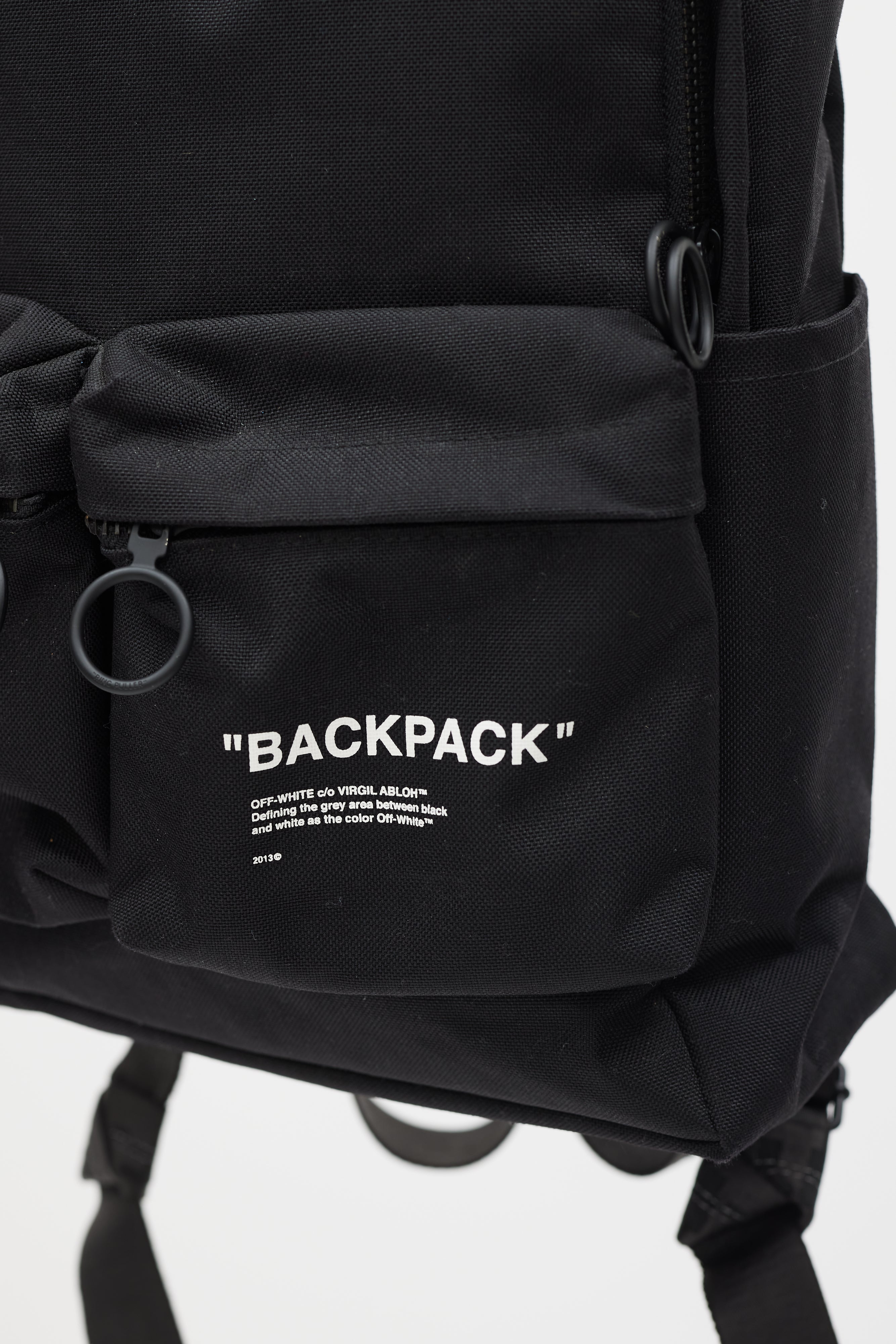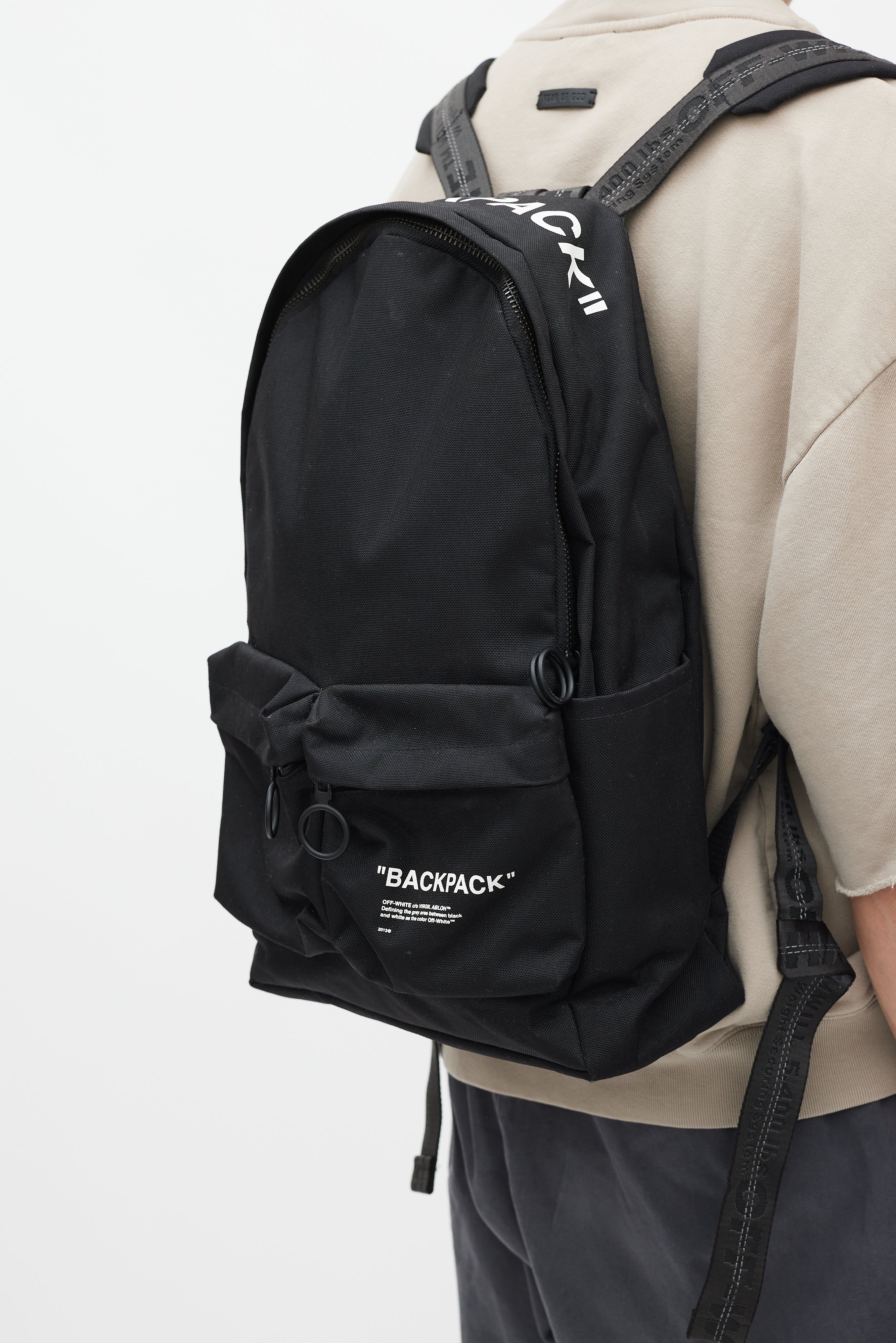 Pre-owned Off-White black backpack featuring a white logo print at front and top, two zip pockets at front, one main compartment with one slip pocket, two slip pockets at side, webbed logo top handle, adjustable shoulder straps, and top zip closure.