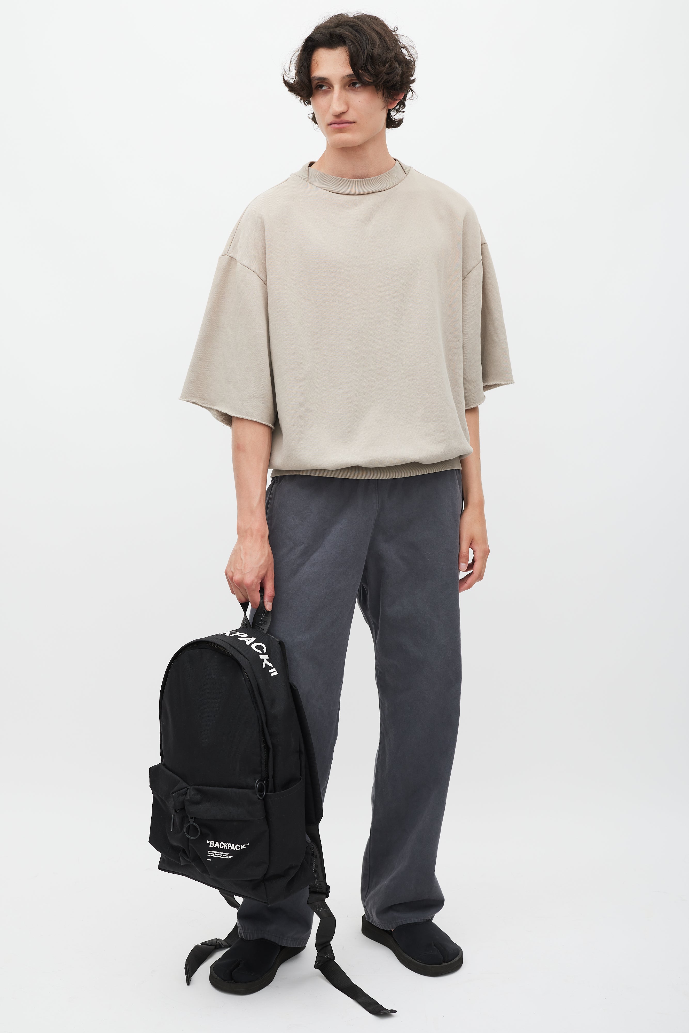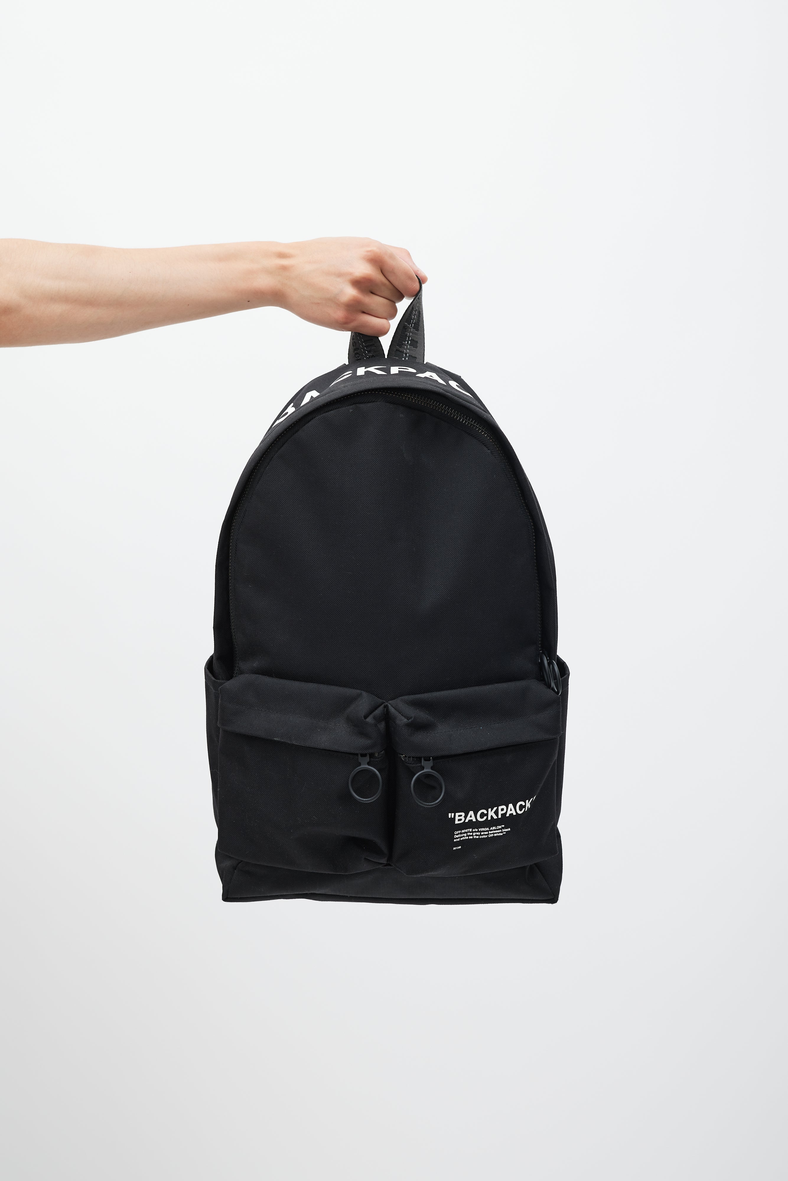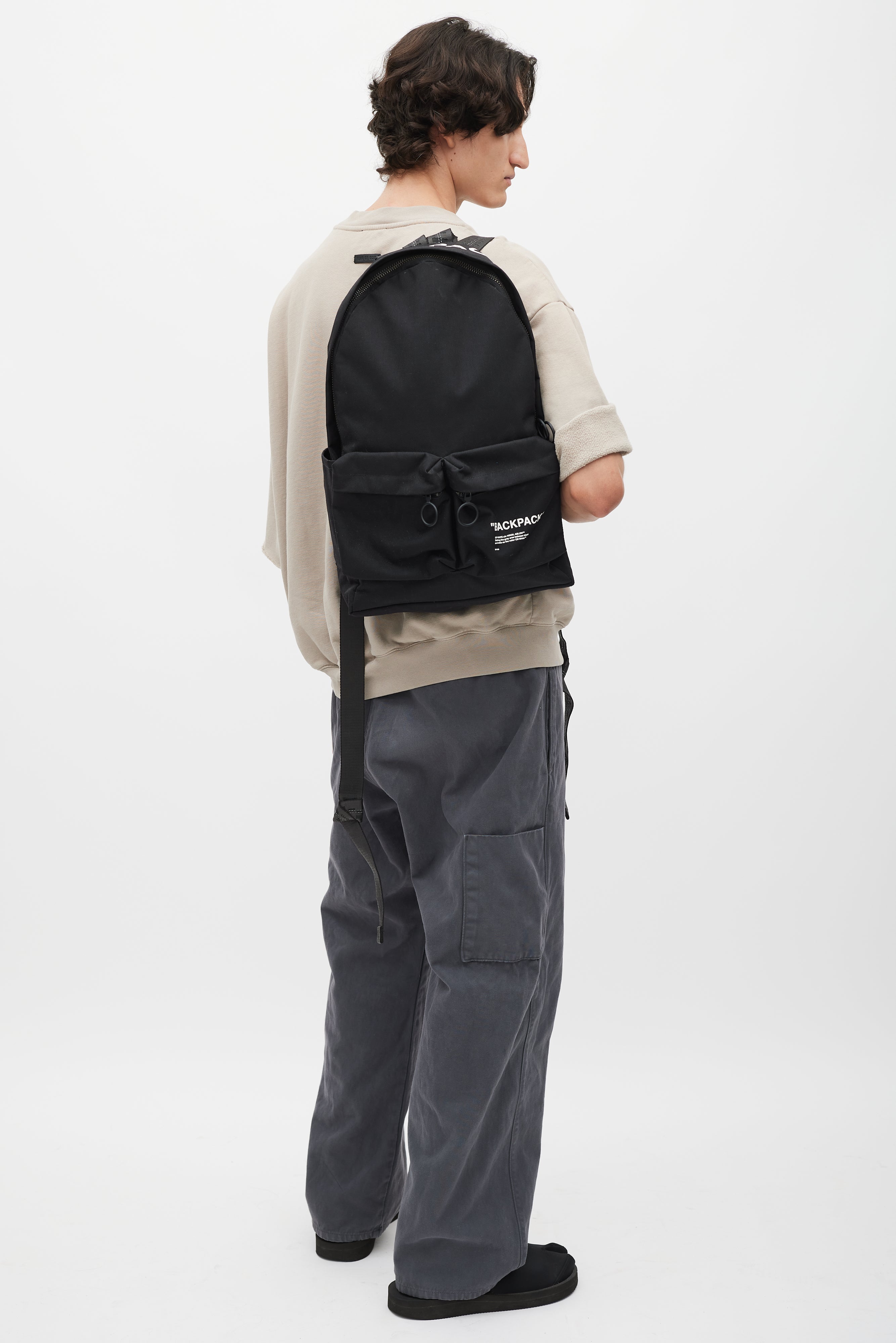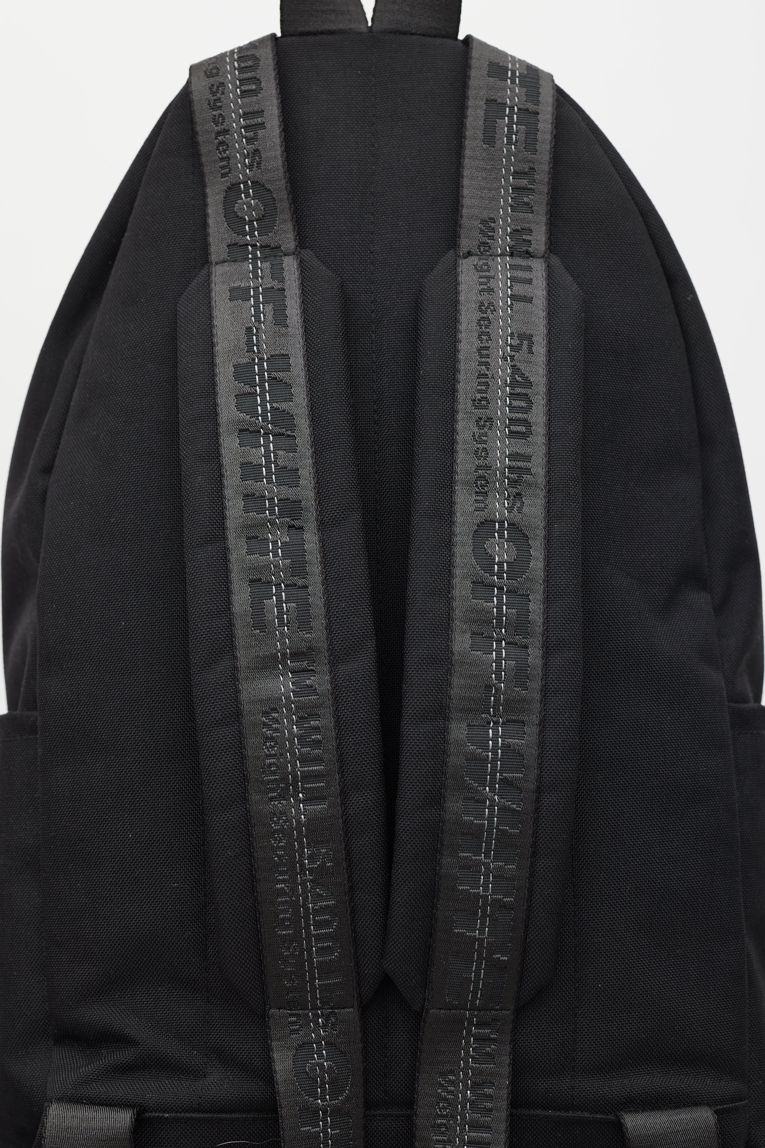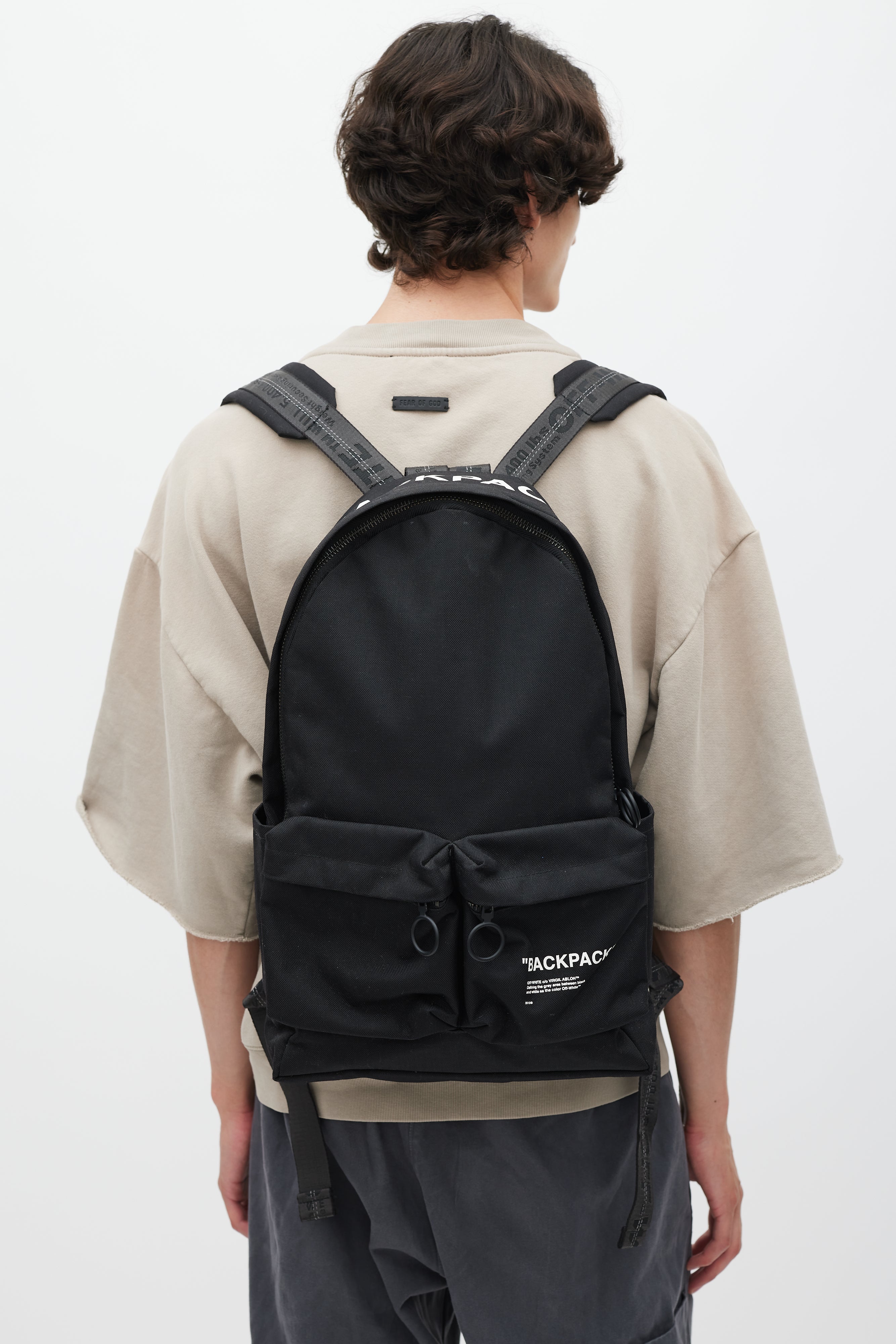 Pre-owned Off-White black backpack featuring a white logo print at front and top, two zip pockets at front, one main compartment with one slip pocket, two slip pockets at side, webbed logo top handle, adjustable shoulder straps, and top zip closure.