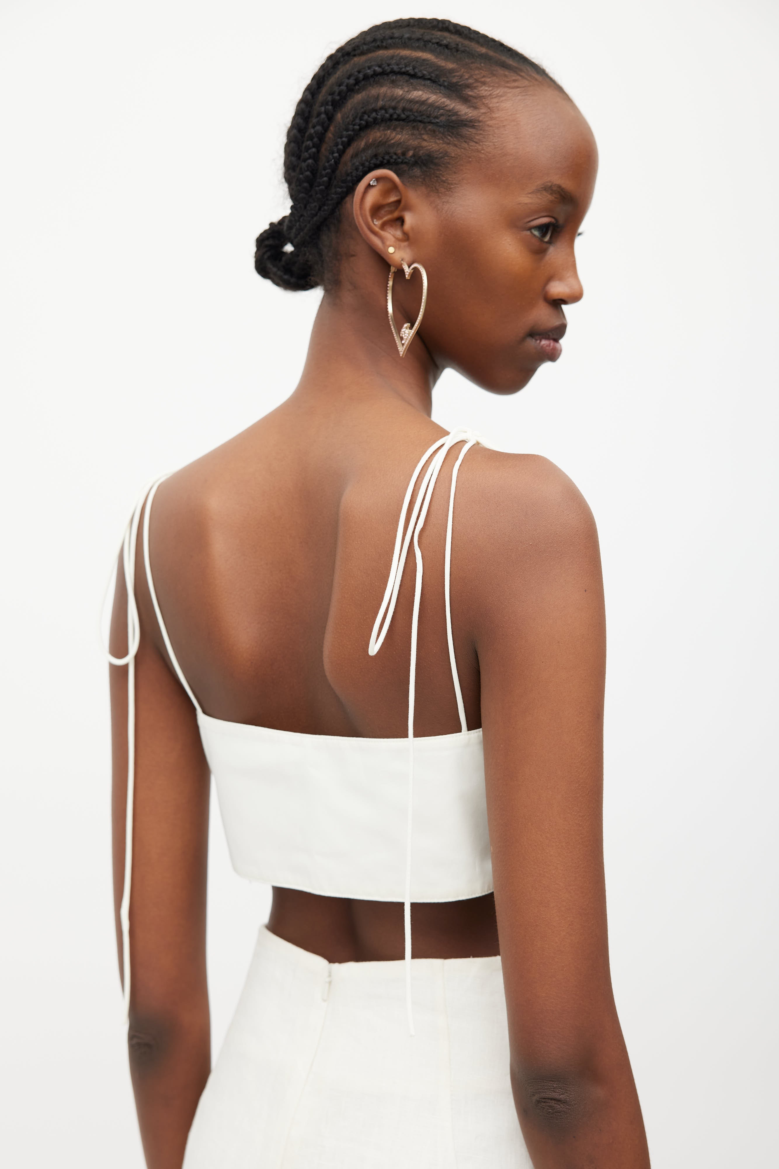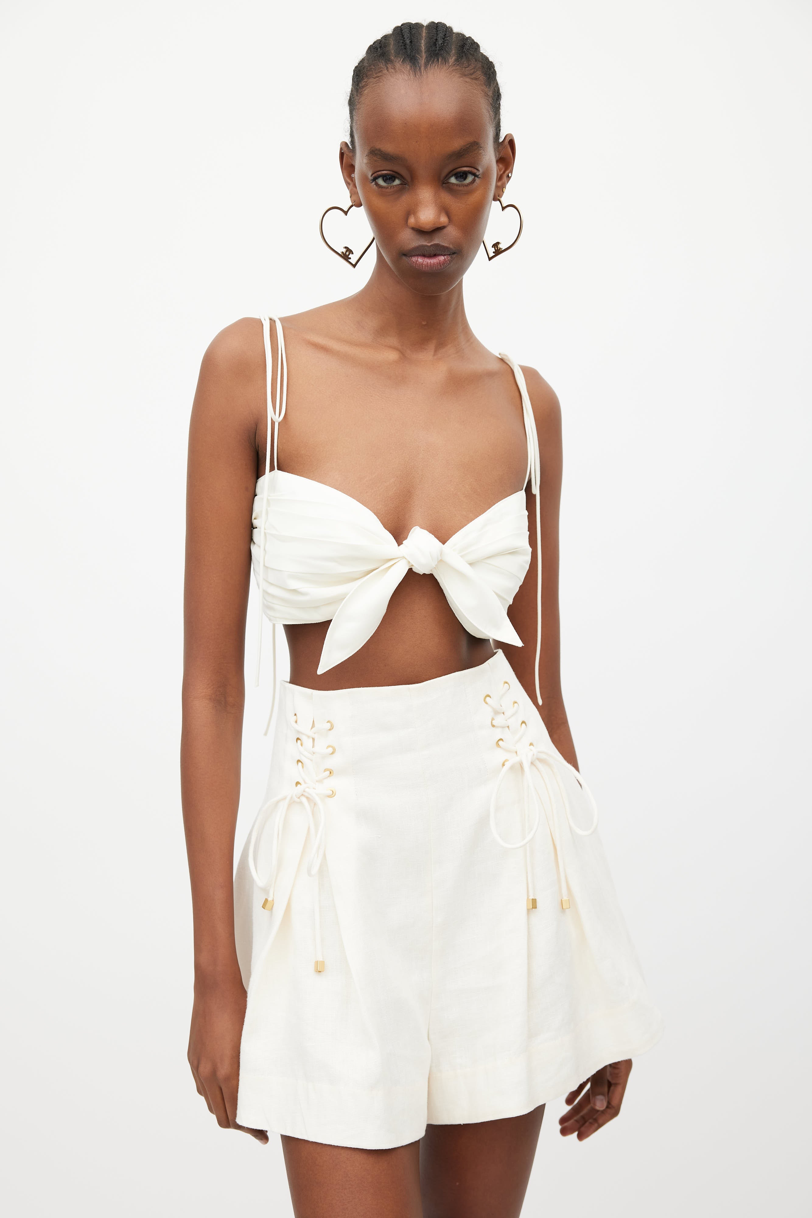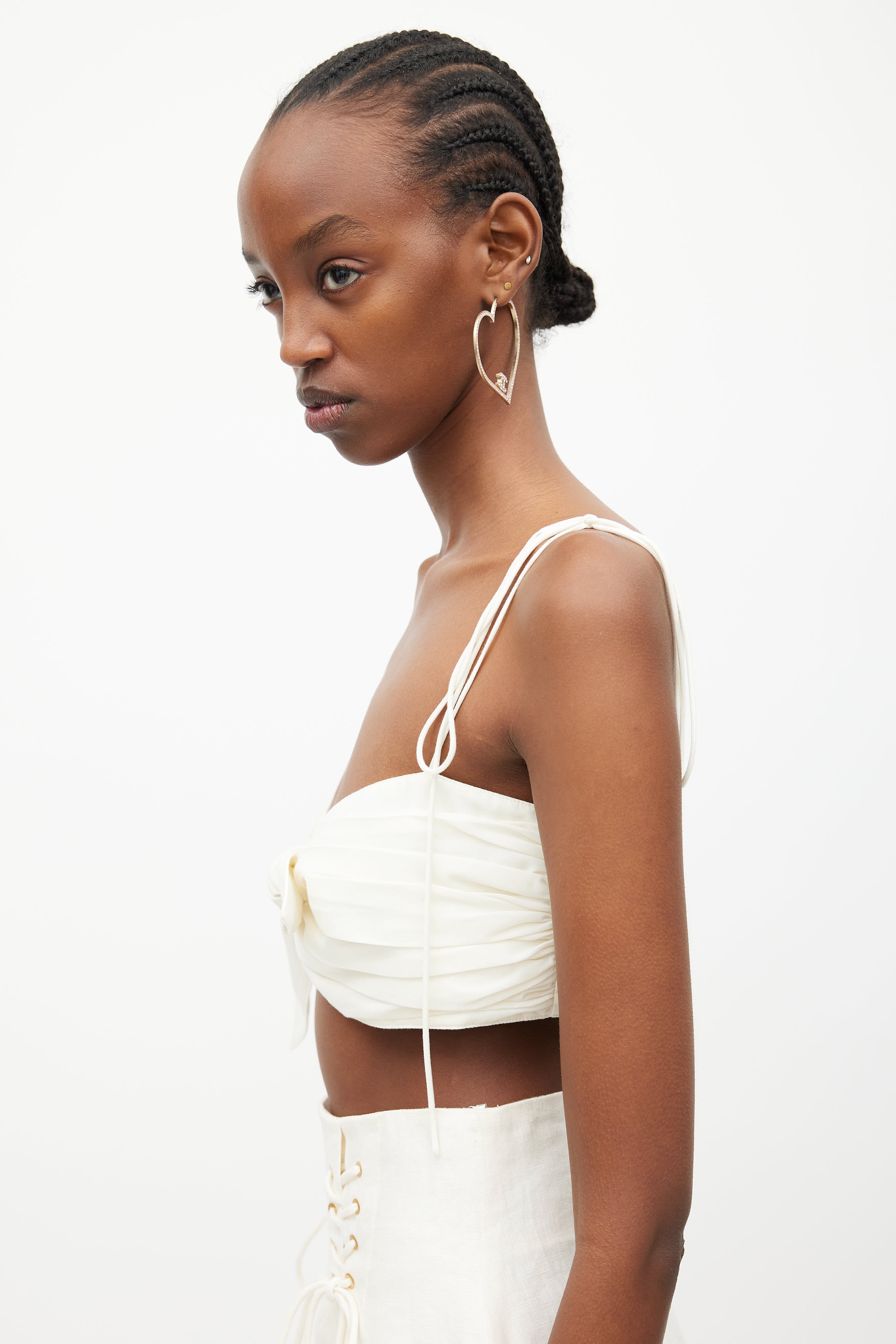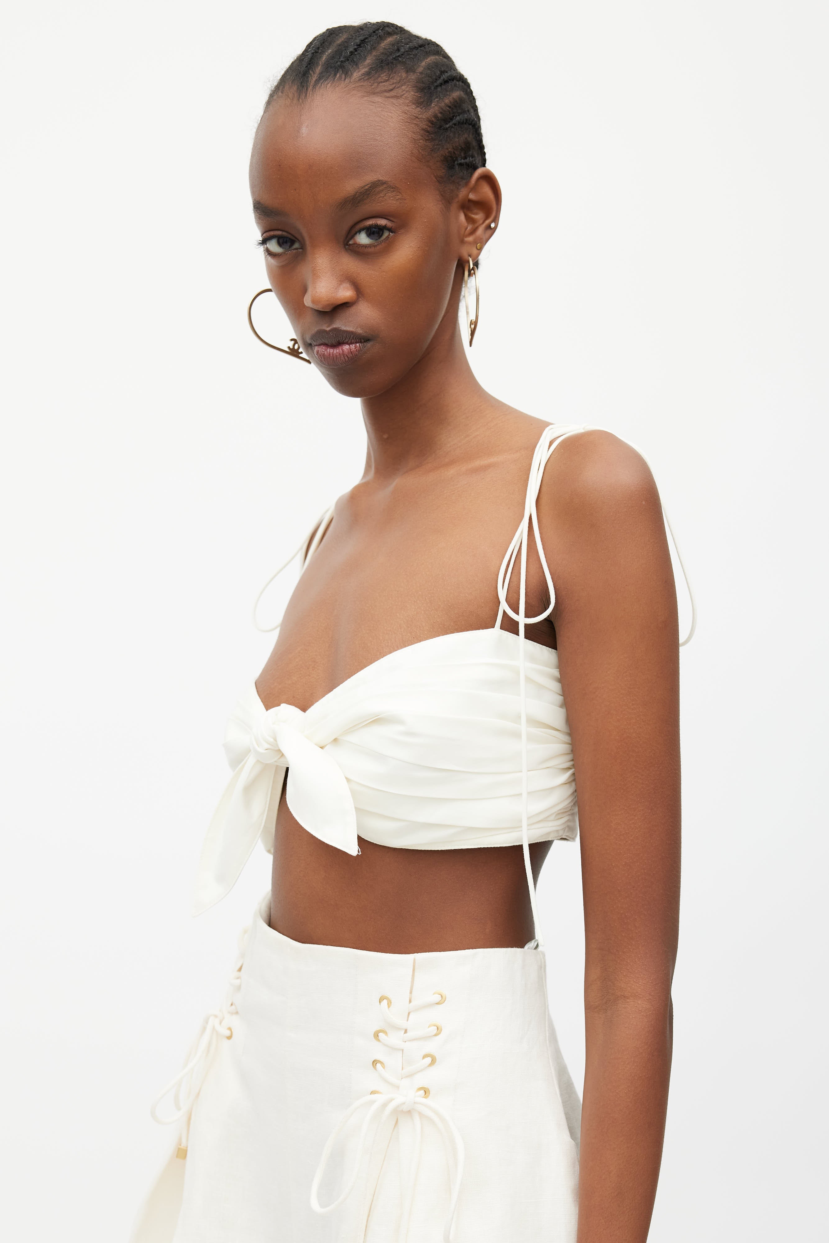 Pre-owned Orseund Iris white Cha Cha bandeau featuring adjustable spaghetti straps, twisted knot front, and pleated sides. Lined. Clipped to fit model.