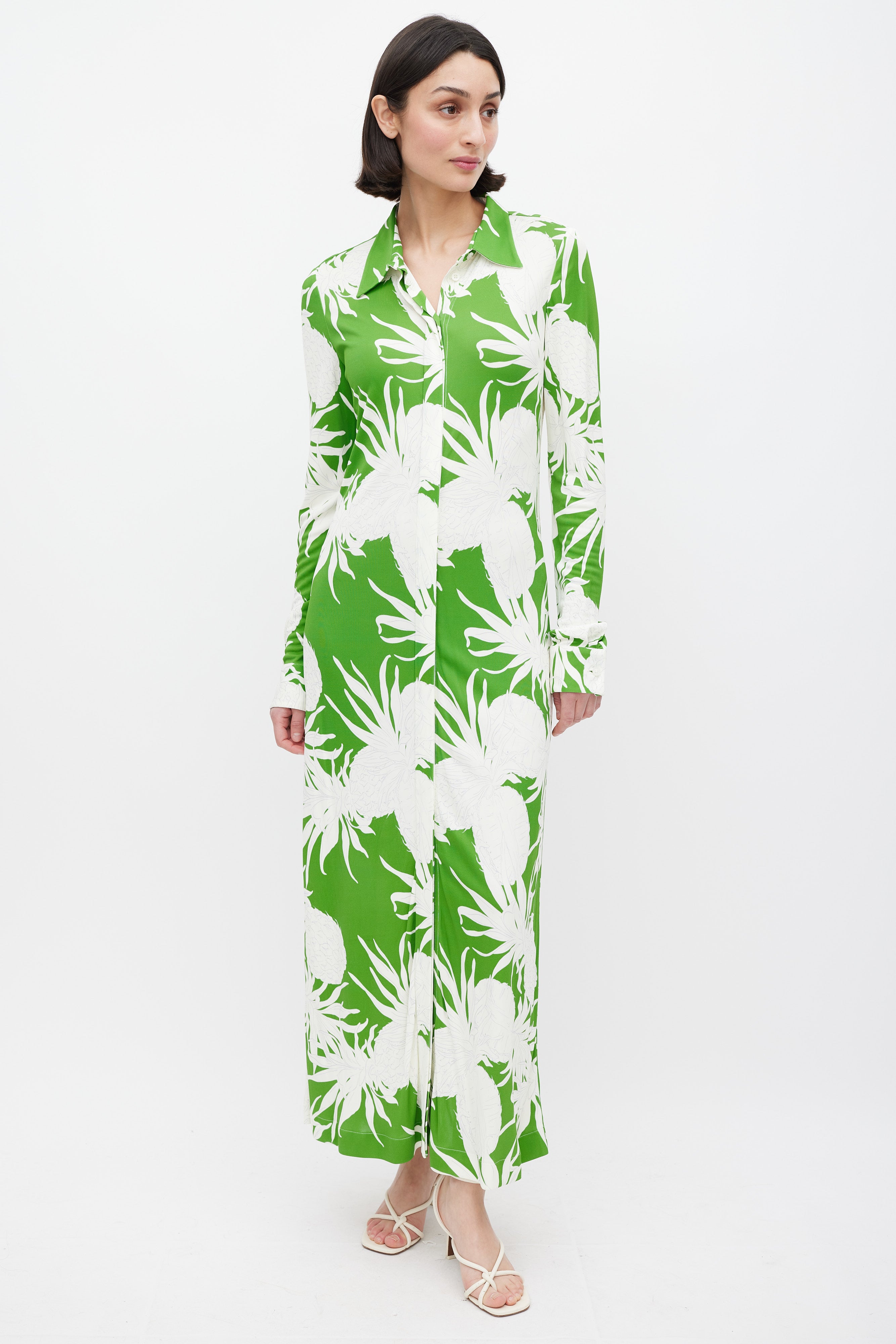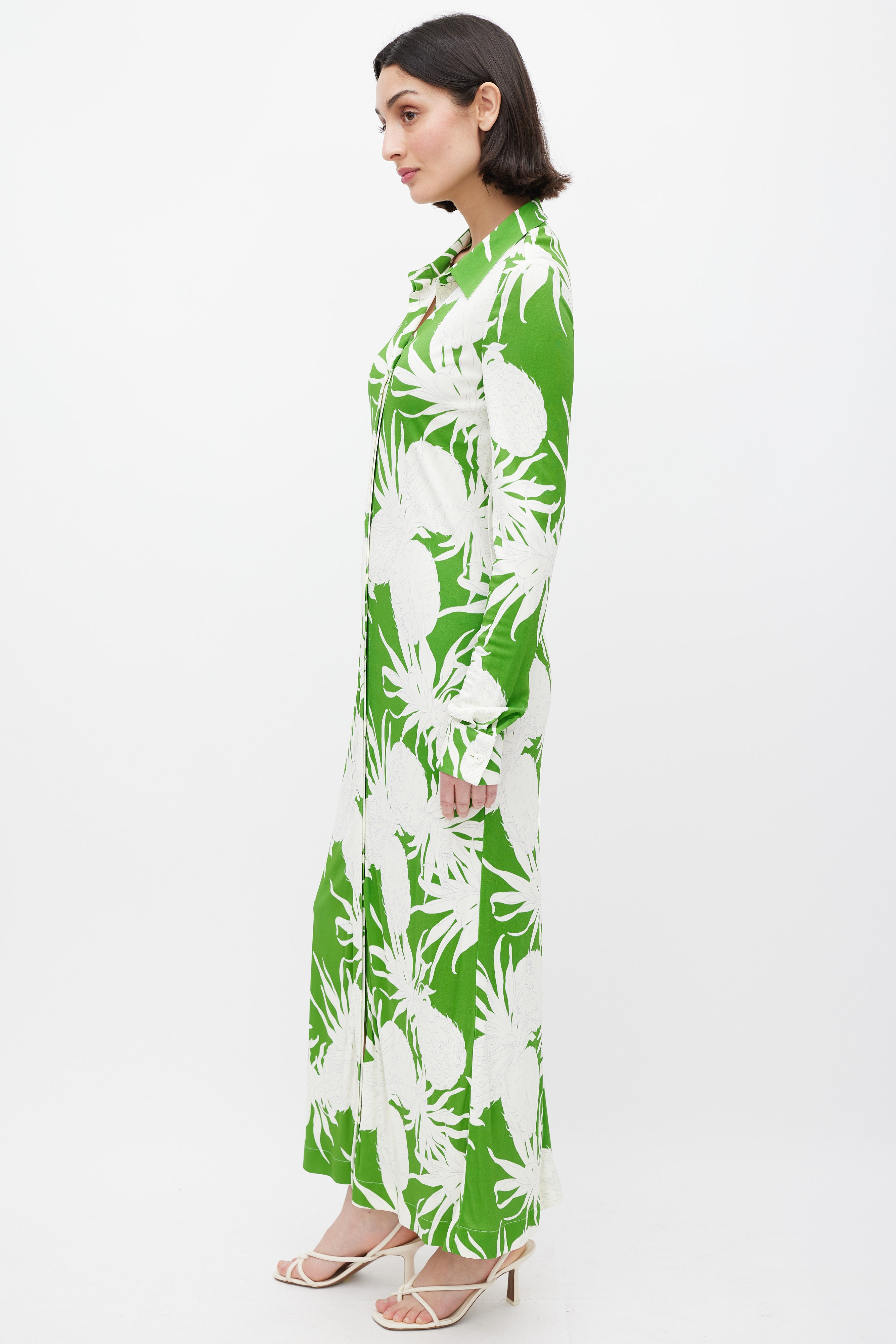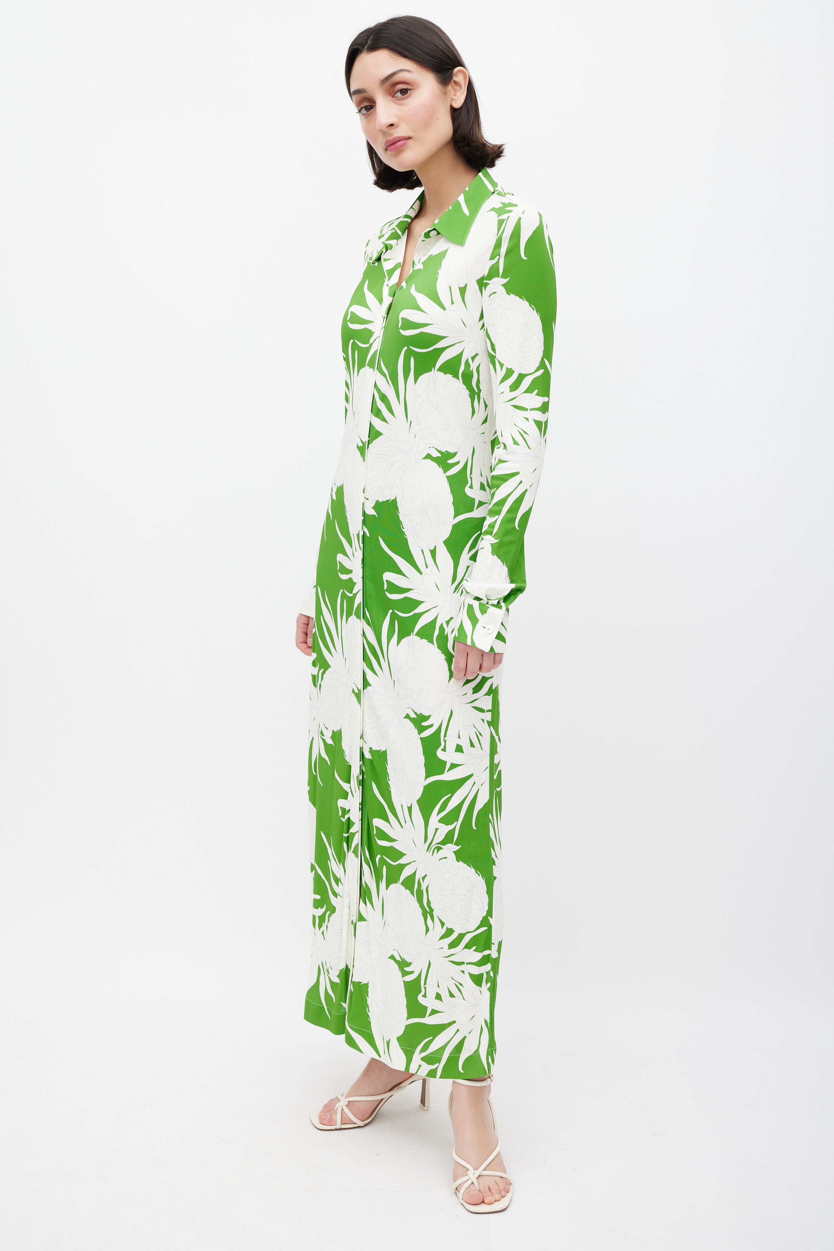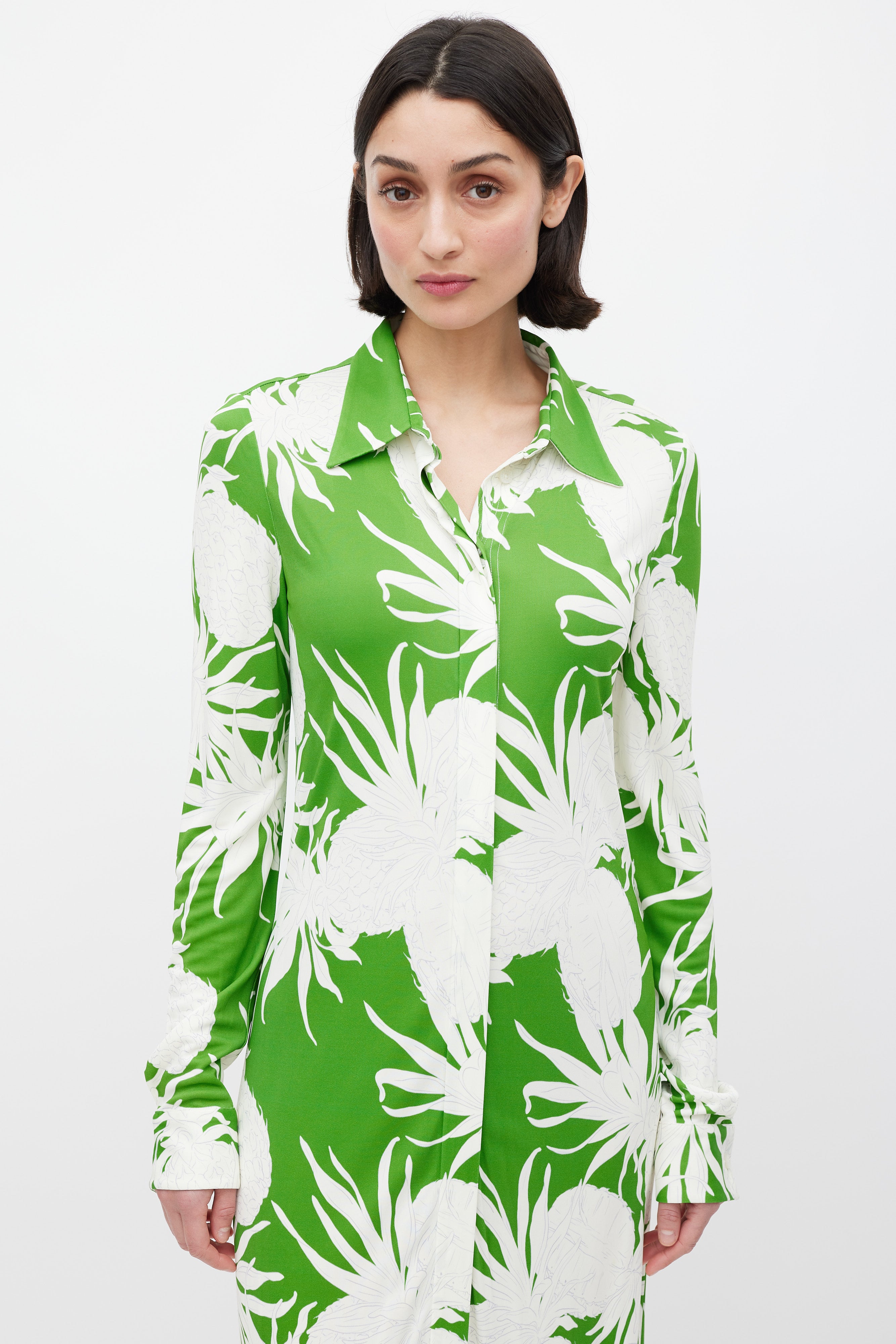 Pre-owned Oscar de la Renta green and white pineapple print dress featuring a spread collar, concealed button placket at front, buttoned cuffs, seam at back center, and slit at back.