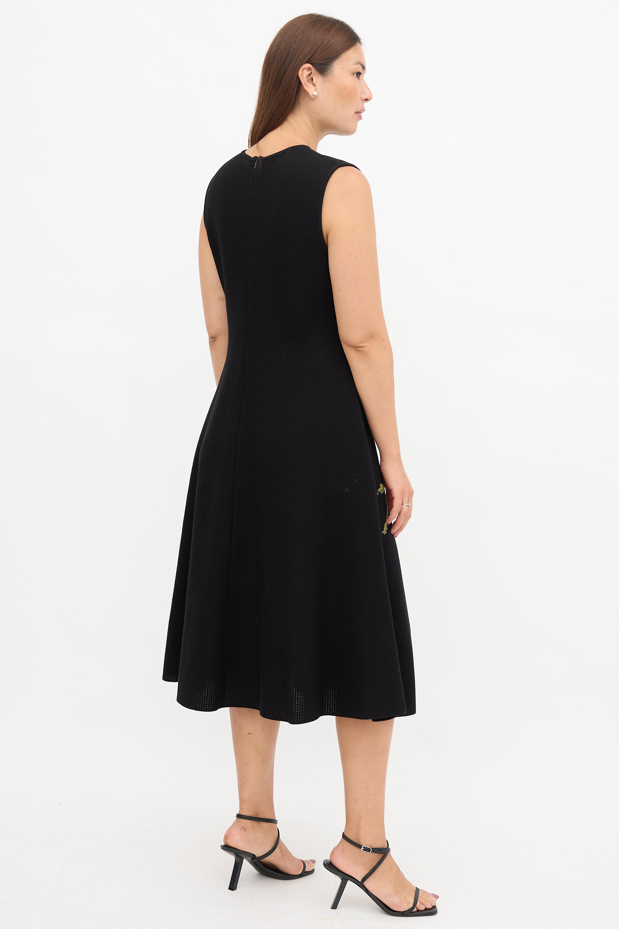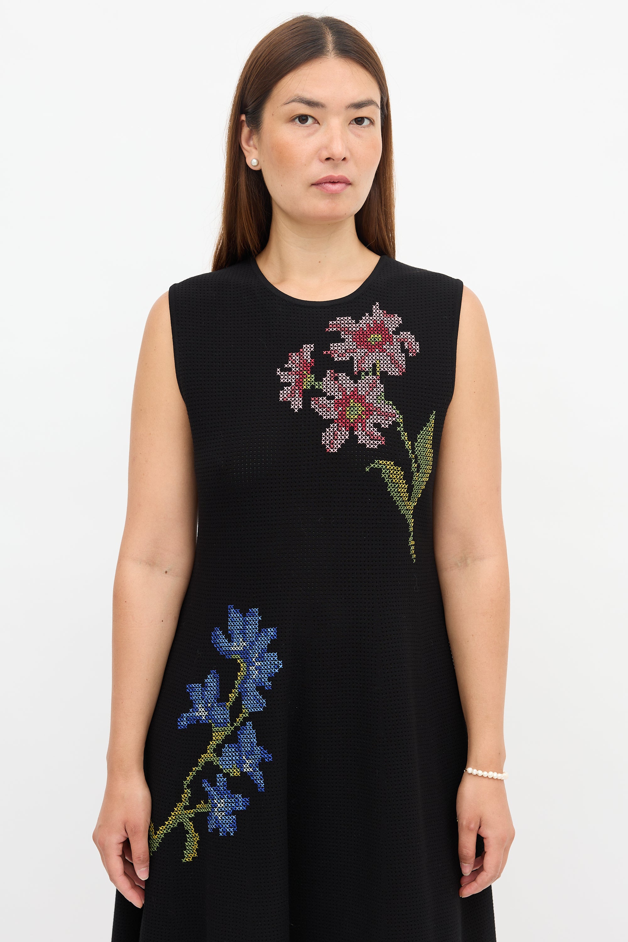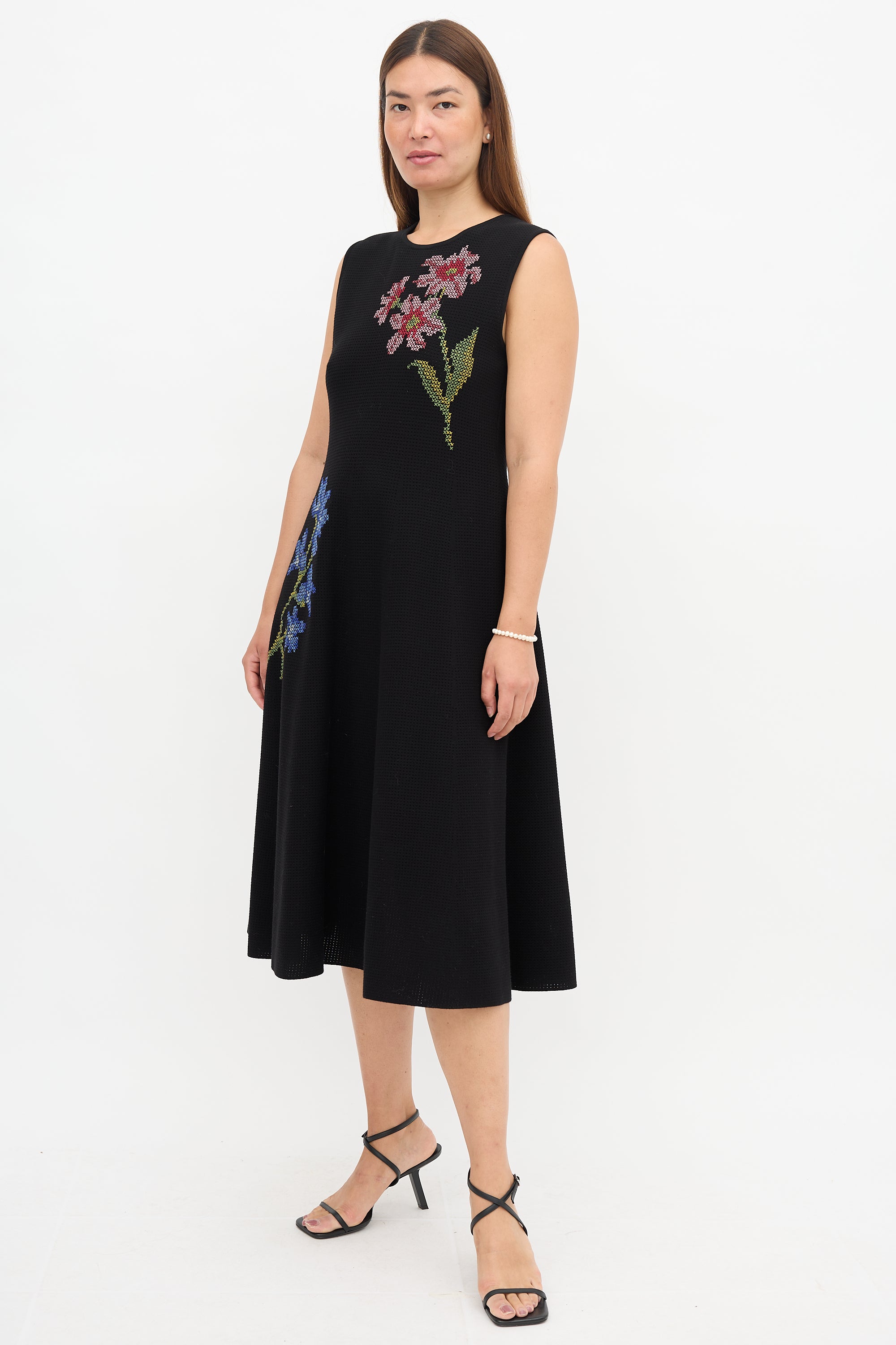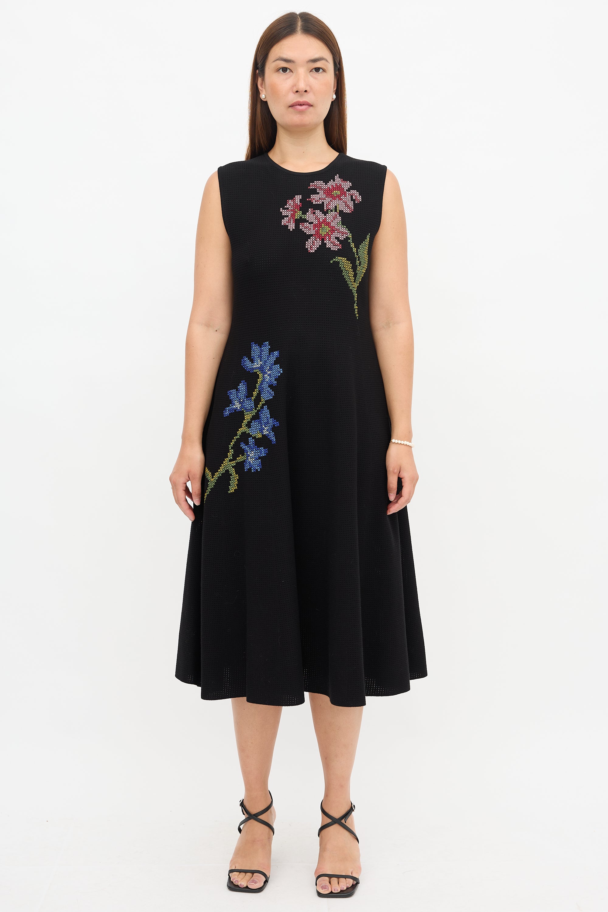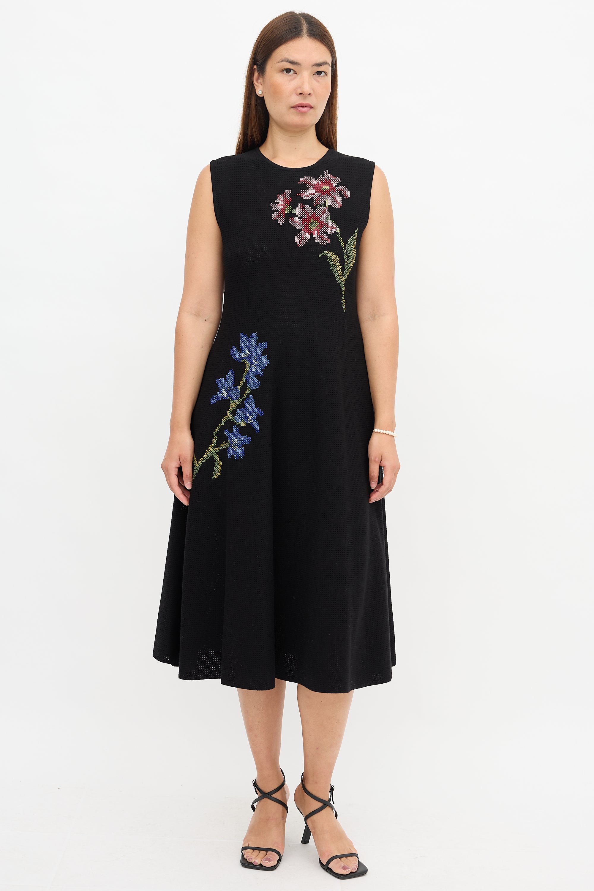 Pre-owned Oscar de la Renta black pointelle knit dress featuring multicolour floral cross stitch embroidered front, round neckline, and concealed back zip. Unlined.