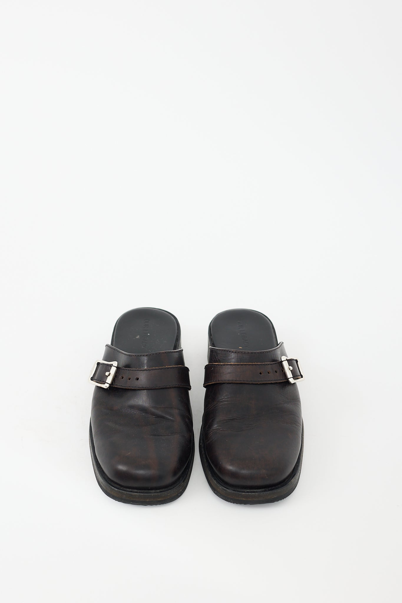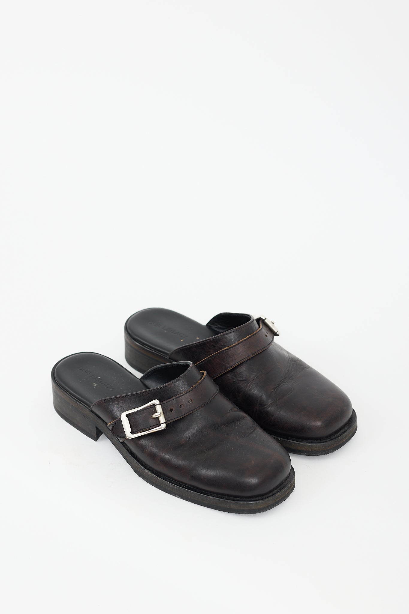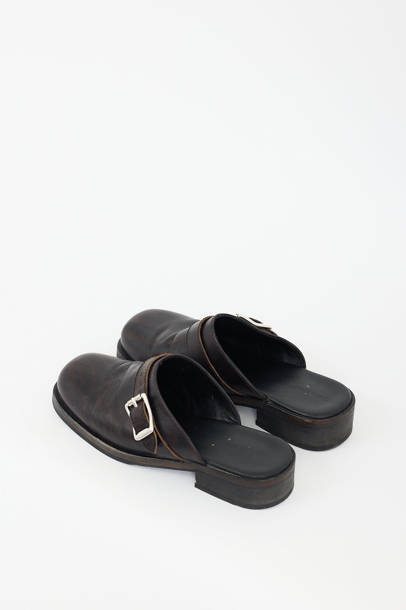 Pre-owned Our Legacy brown Camion leather mule featuring a round toe, stacked heel, adjustable buckle strap at vamp, and slip on entry.