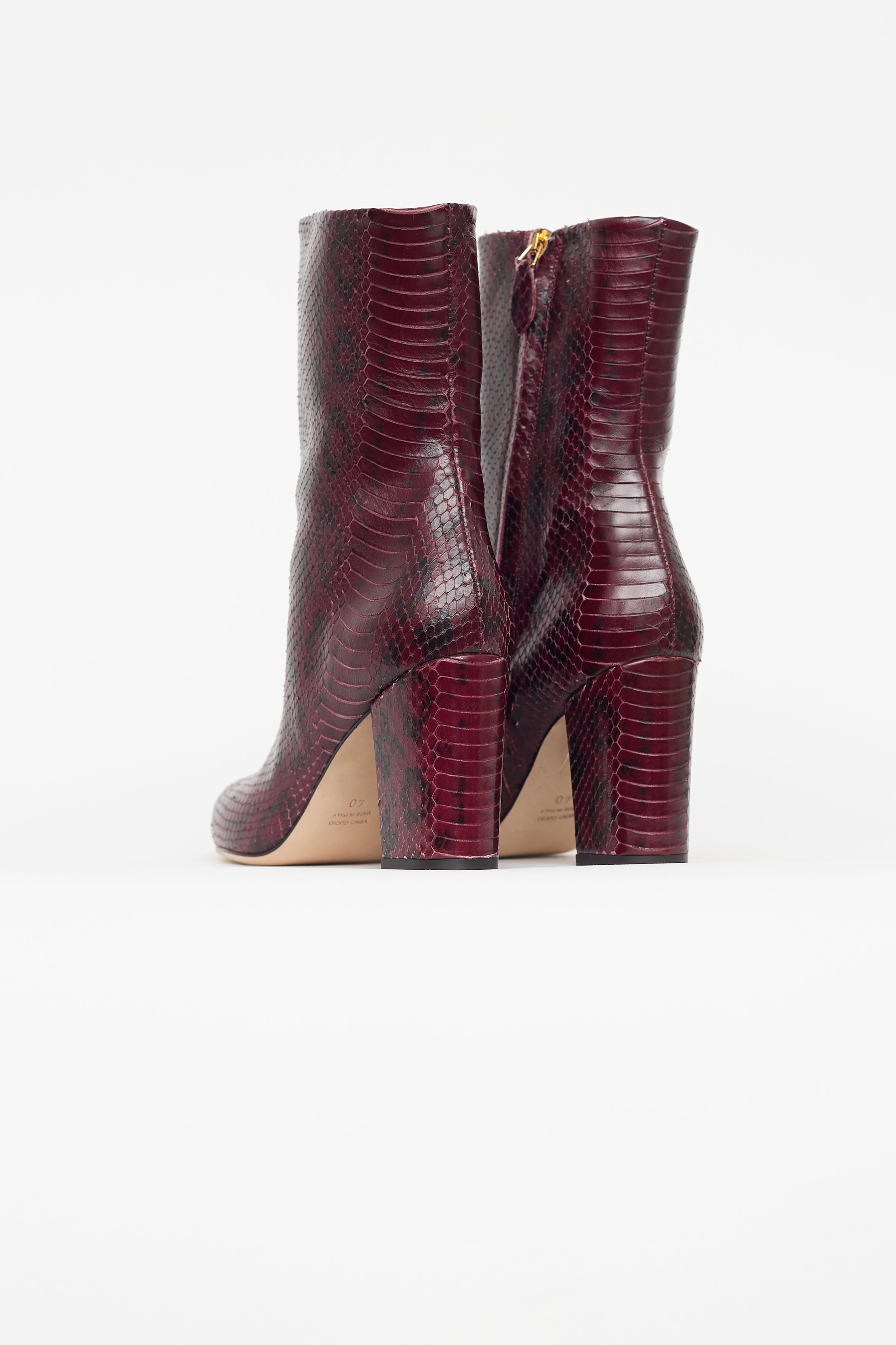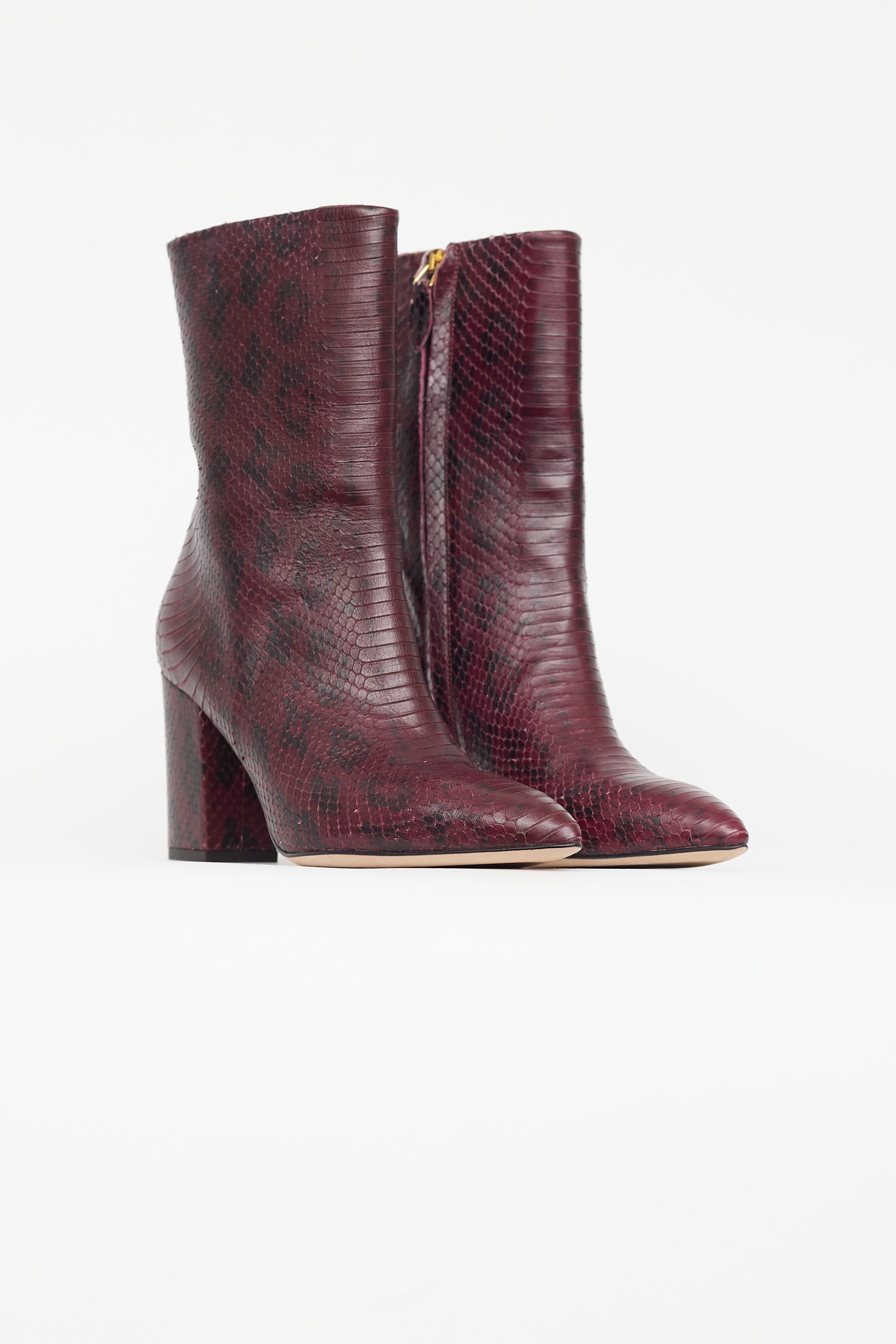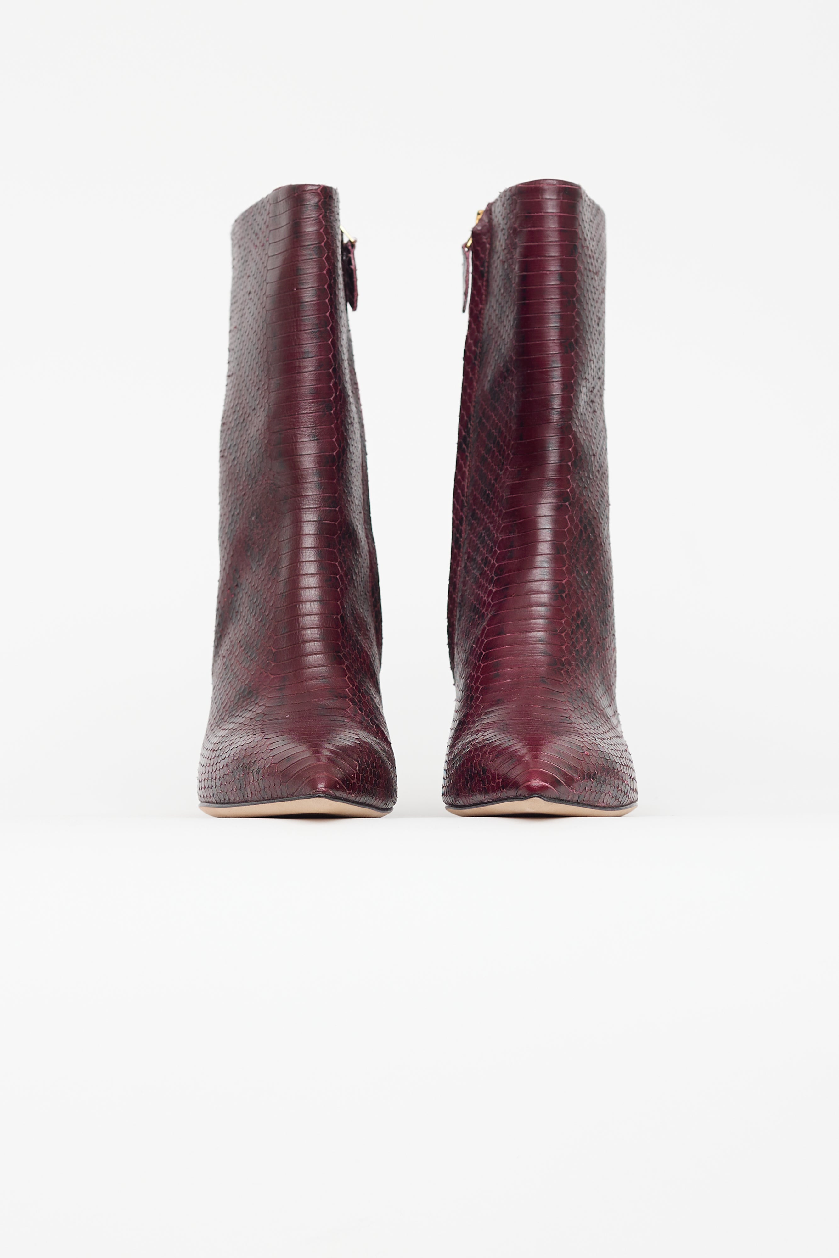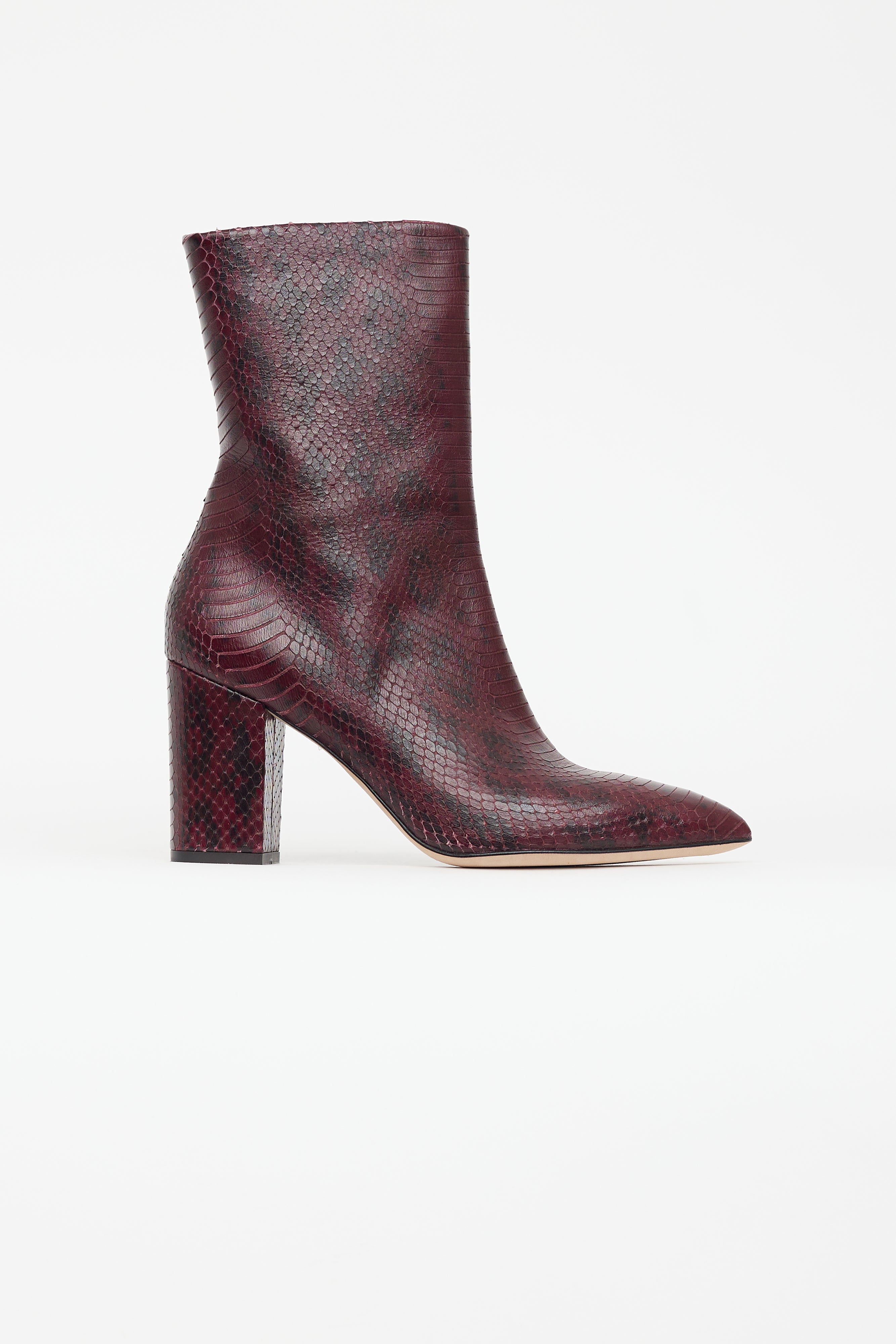 Pre-owned Paris Texas burgundy ankle boots featuring pointed toe, snakeskin effect leather, zip closure at side, and covered block heel.