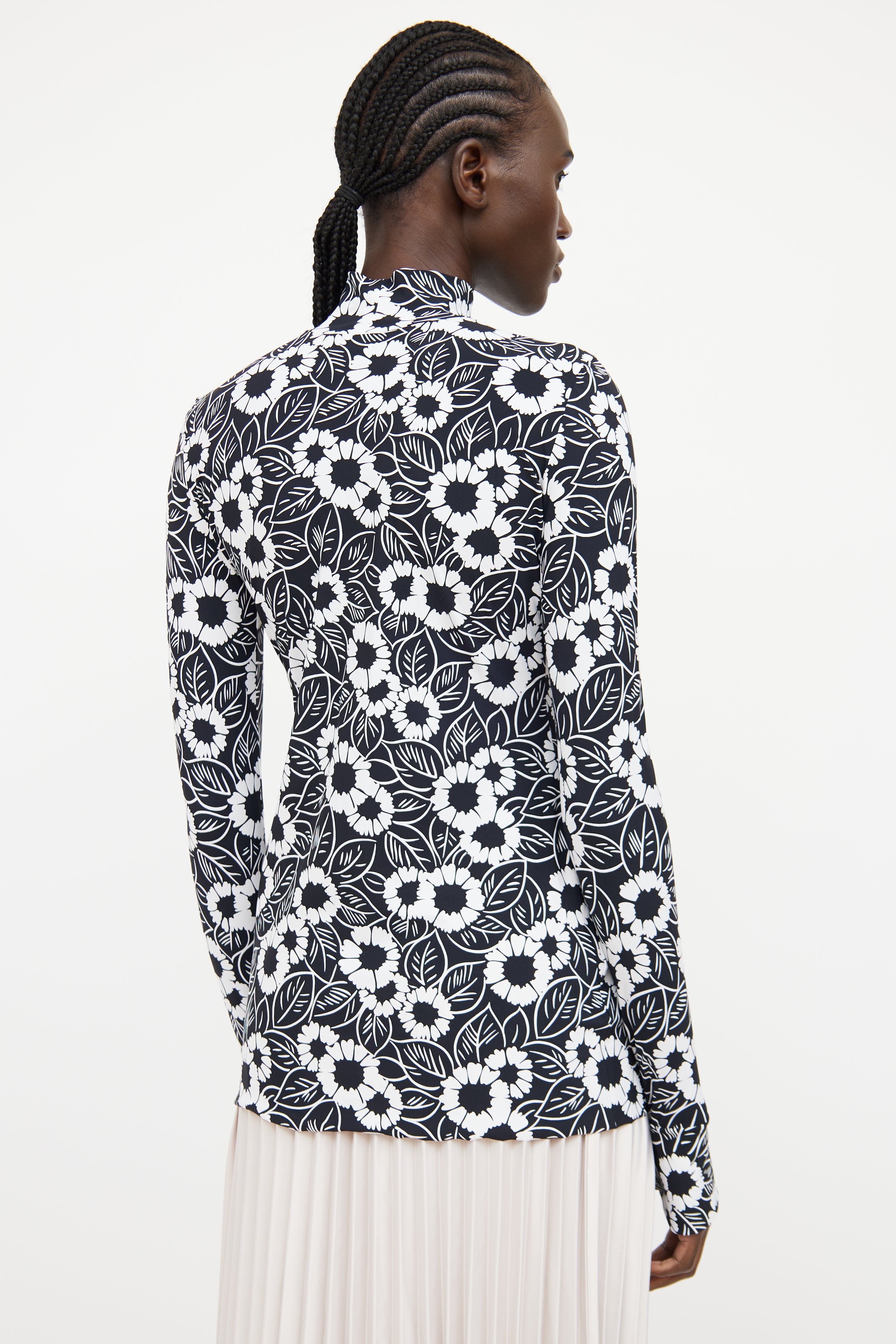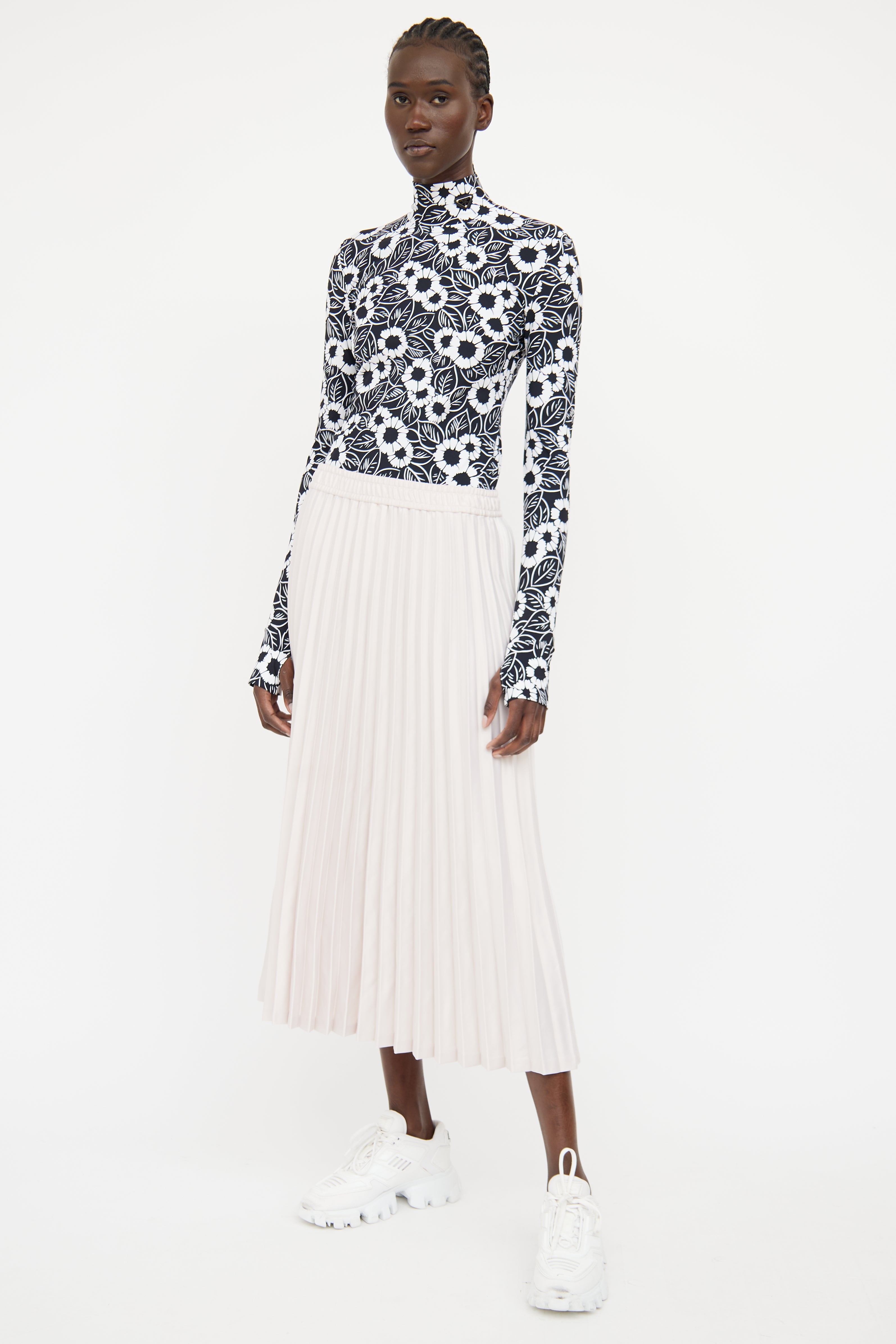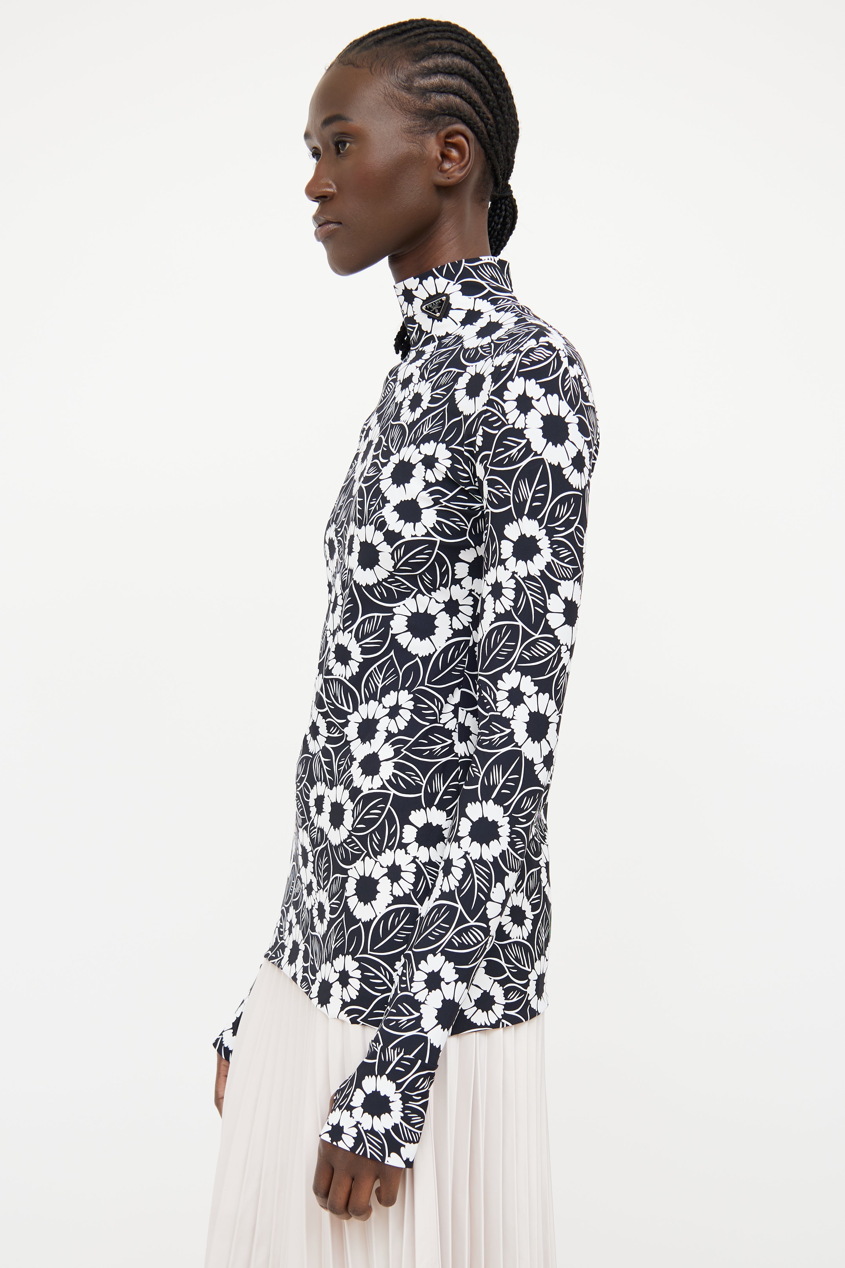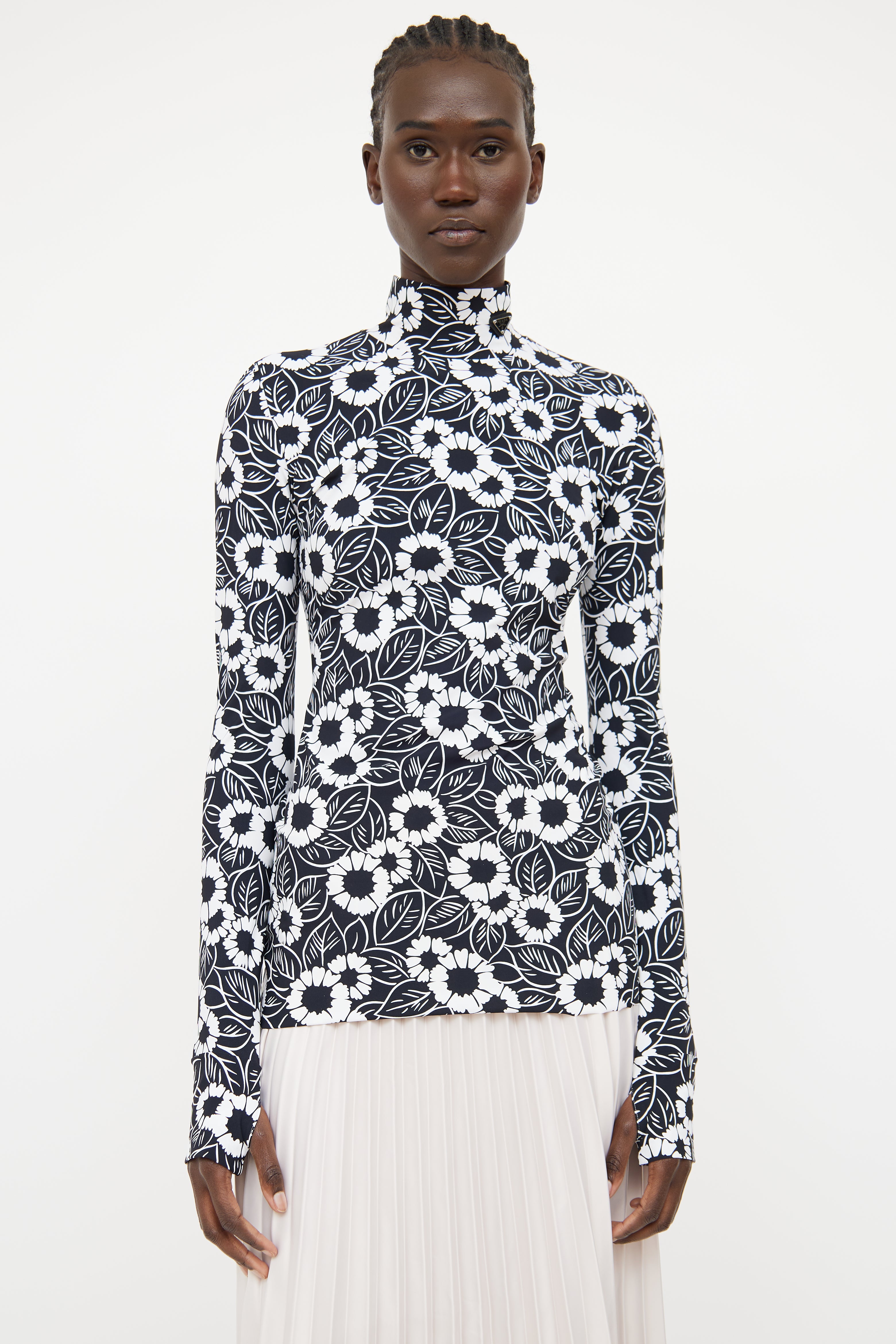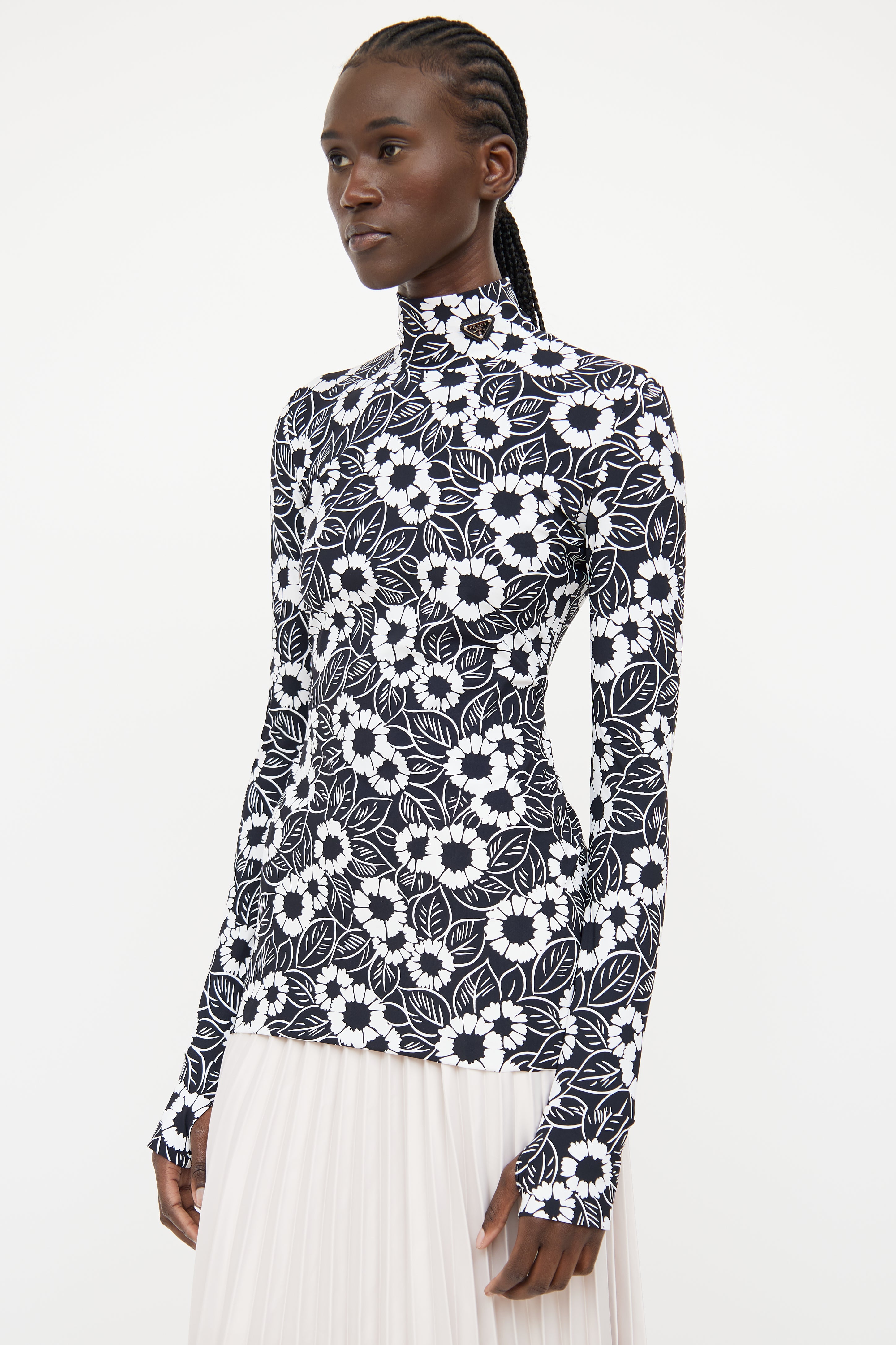 Pre-owned Prada 2021 black and white long sleeve top featuring high neckline with logo text triangle patch and floral print throughout.
