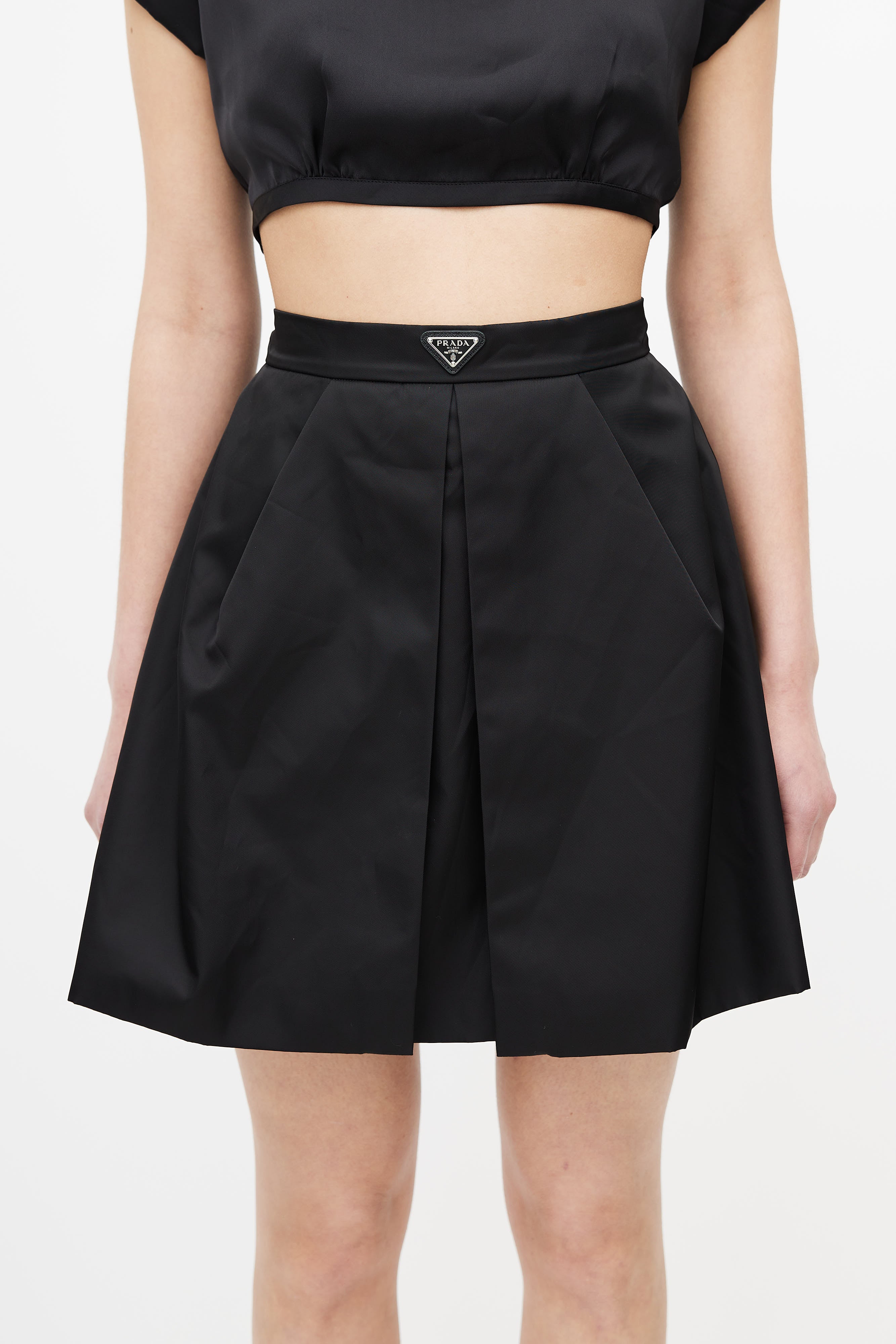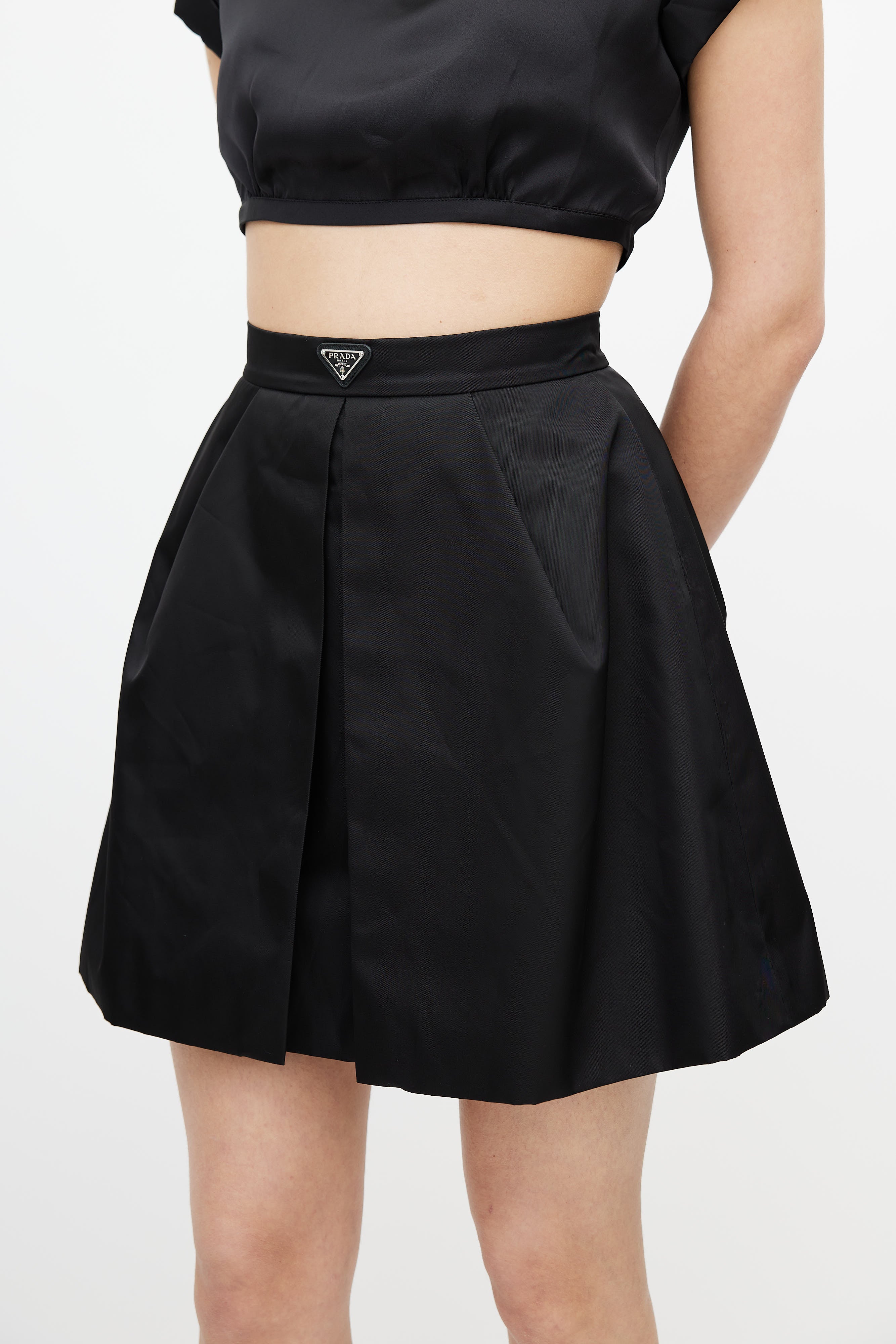 Black Logo Plaque Pleated Re-Nylon Skirt IT 38 Size Guide