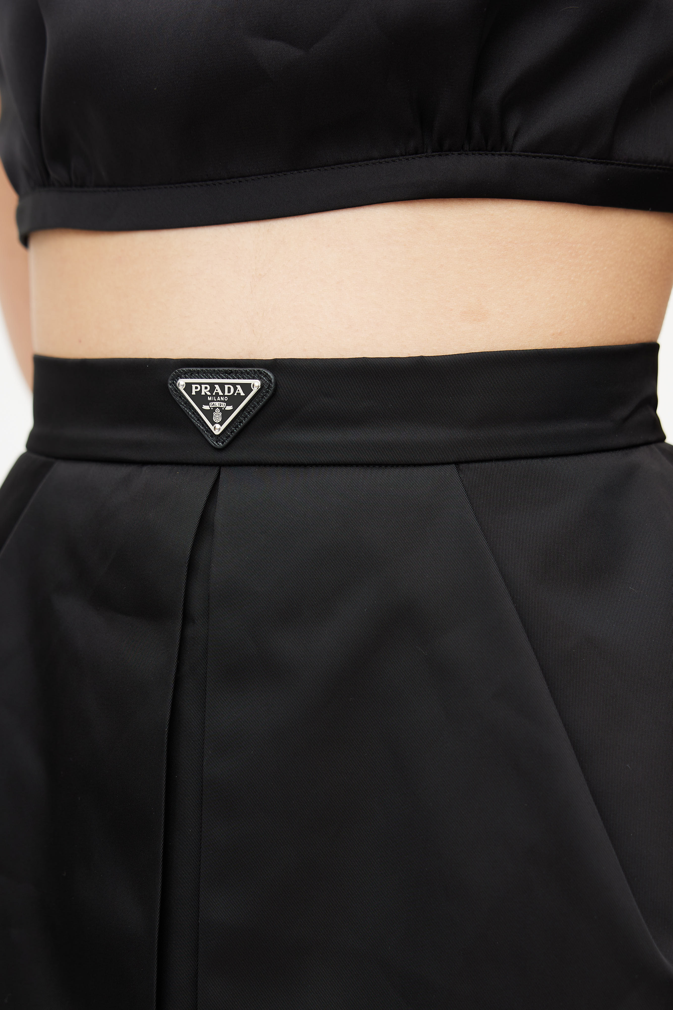 Pre-owned Prada black Re-Nylon skirt featuring logo hardware at waist band, silver buckle at back, and snap button fastening at back.