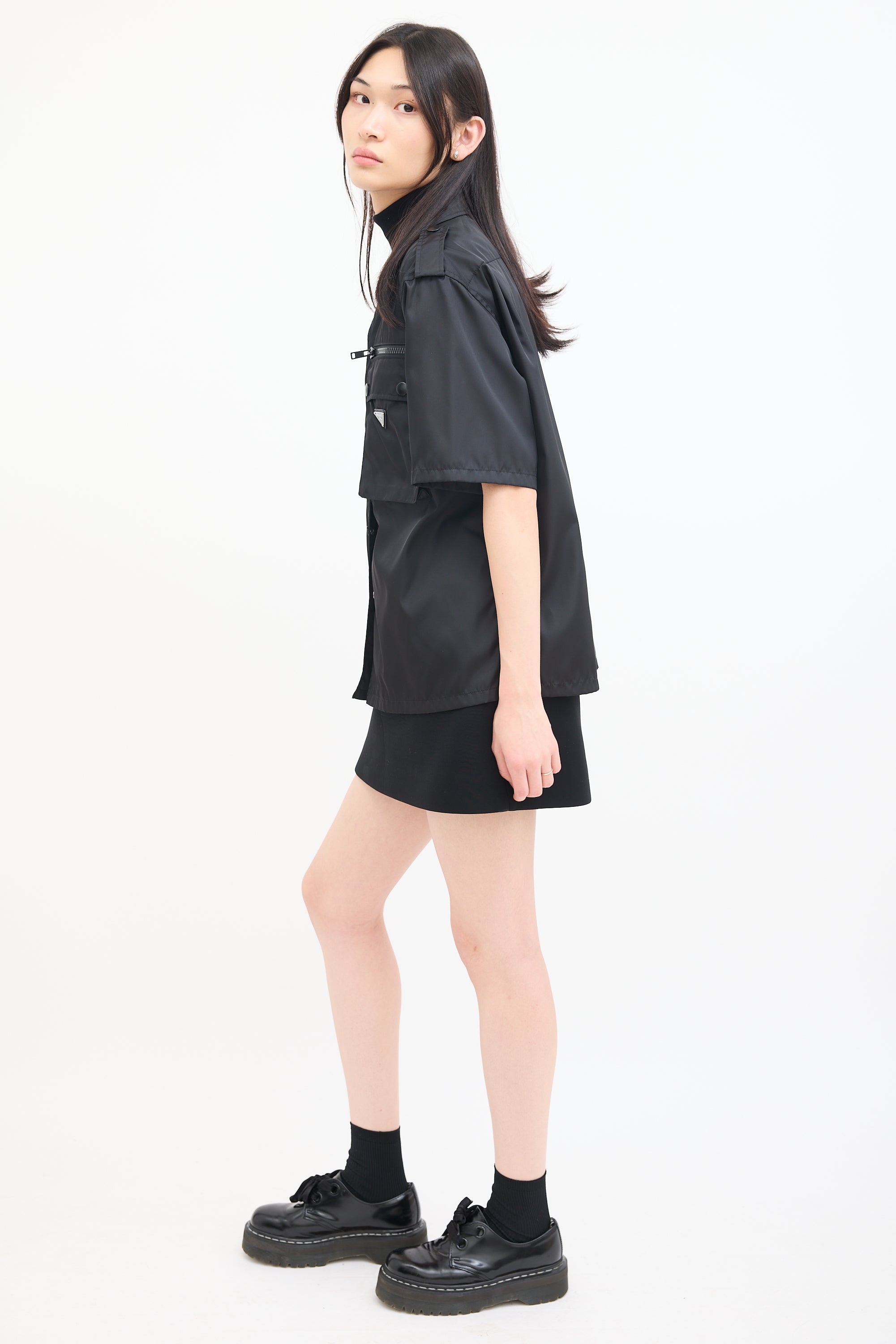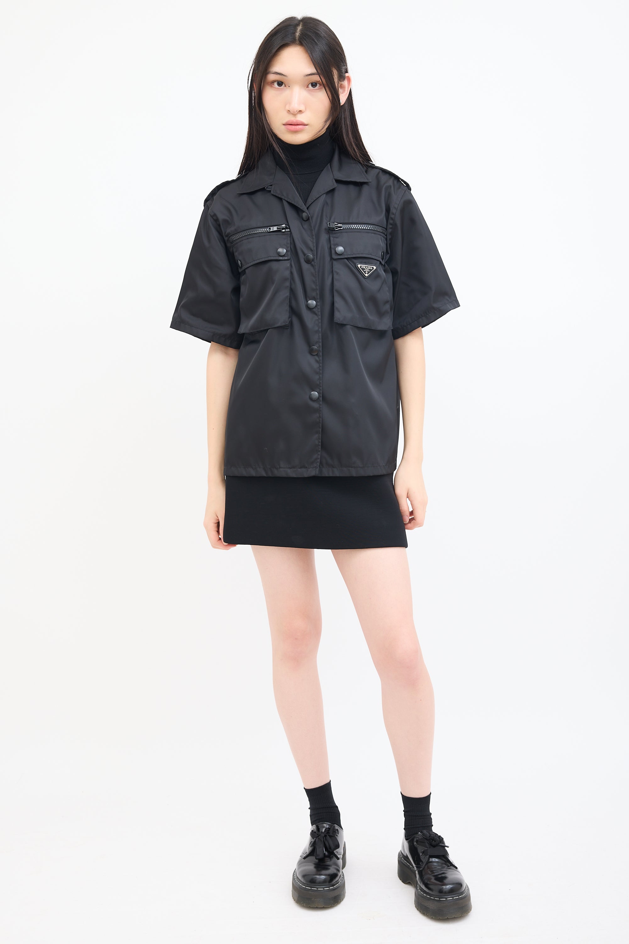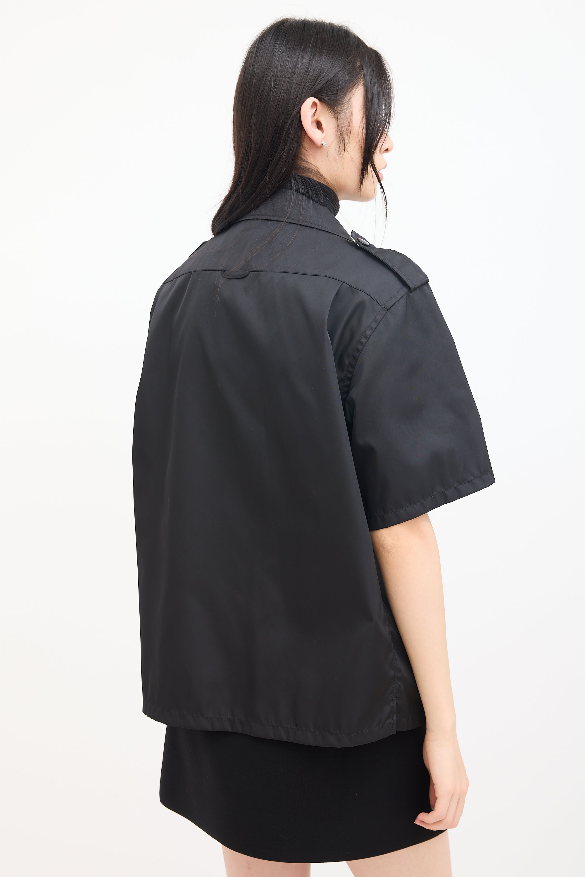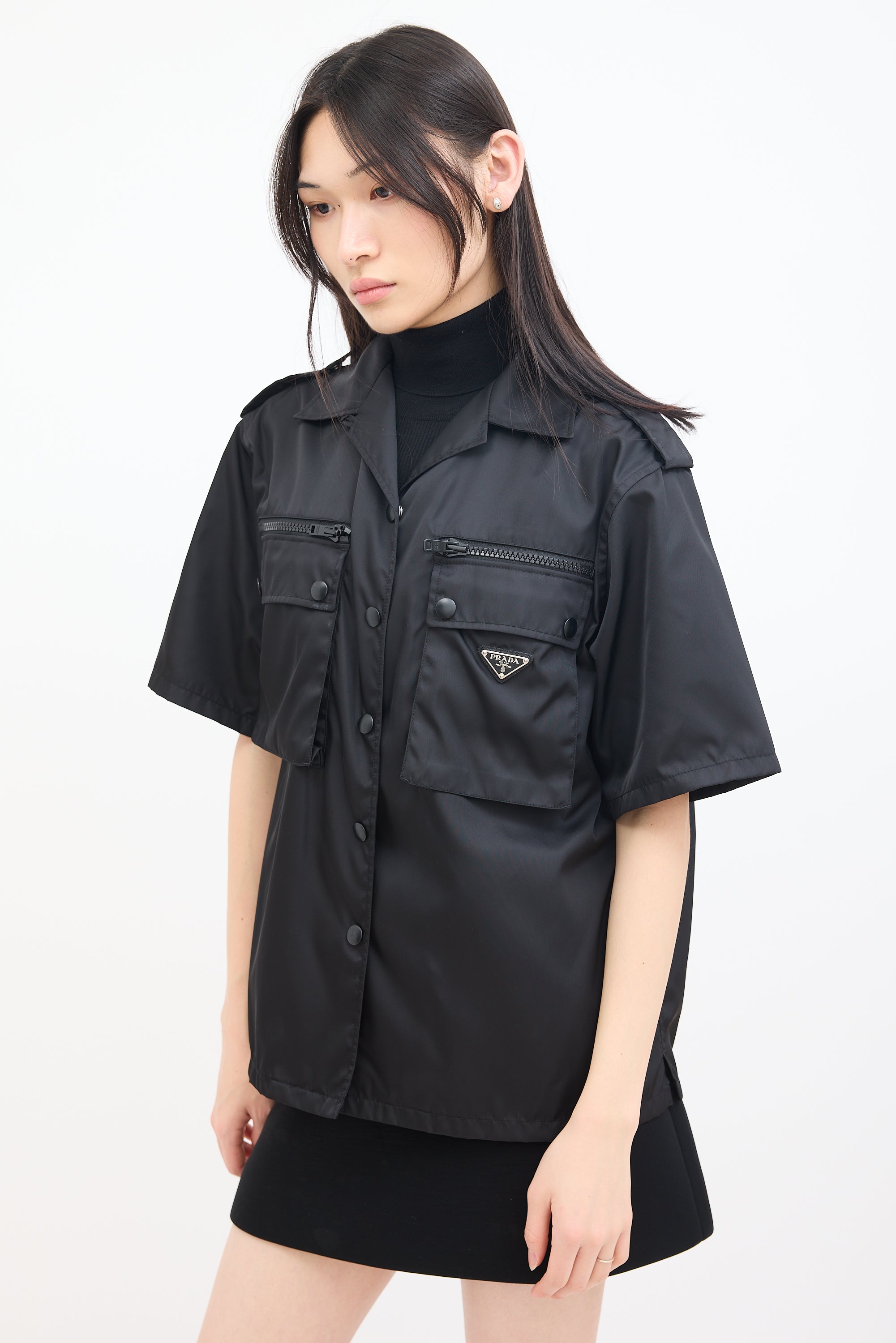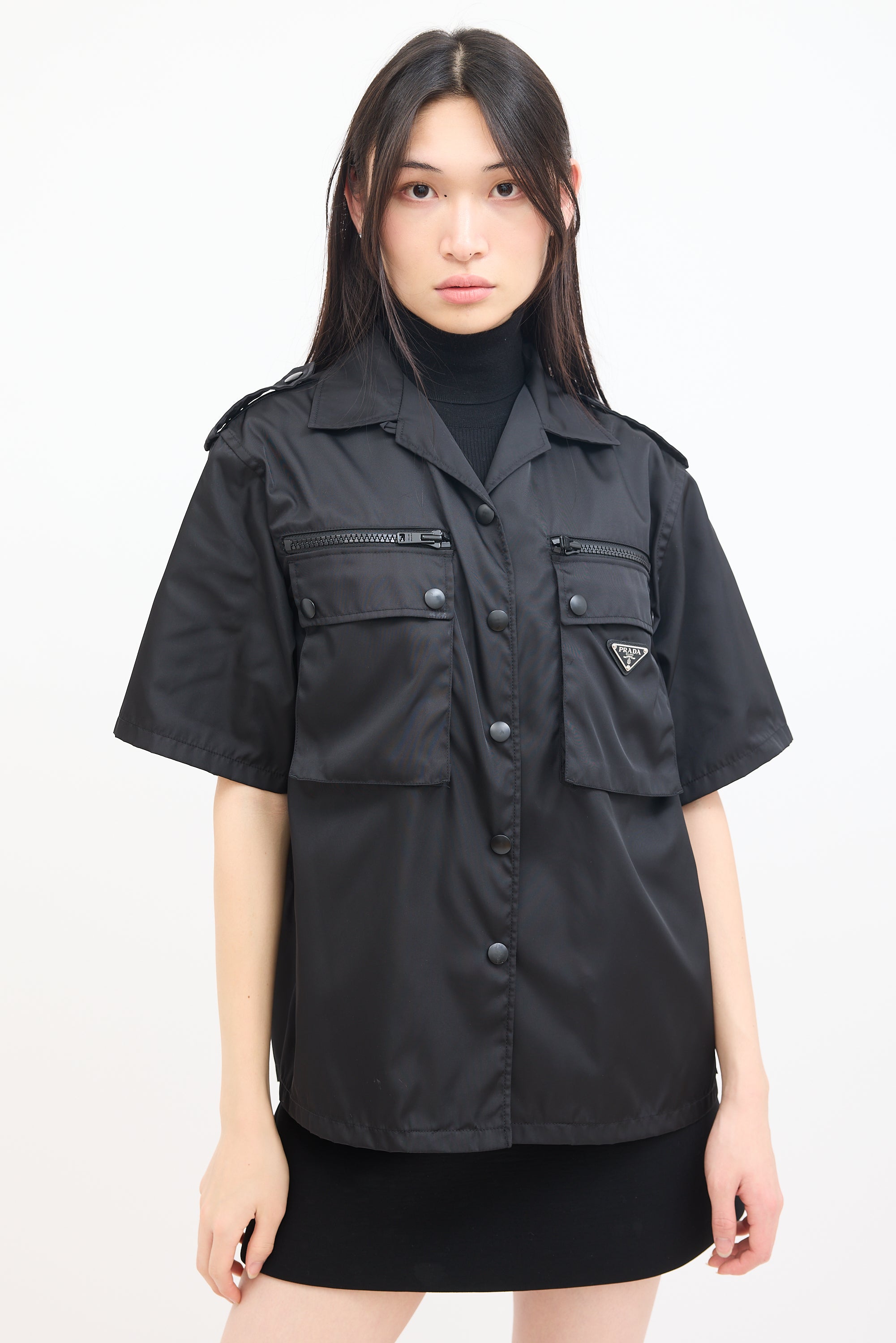 Pre-owned Prada black nylon shirt featuring a convertible collar, snap button up front closure, two zip pockets and flap pockets at chest, signature enamelled triangle logo plaque at left pocket, pleated back yoke, side vents, epaulettes at shoulders, and short sleeves.