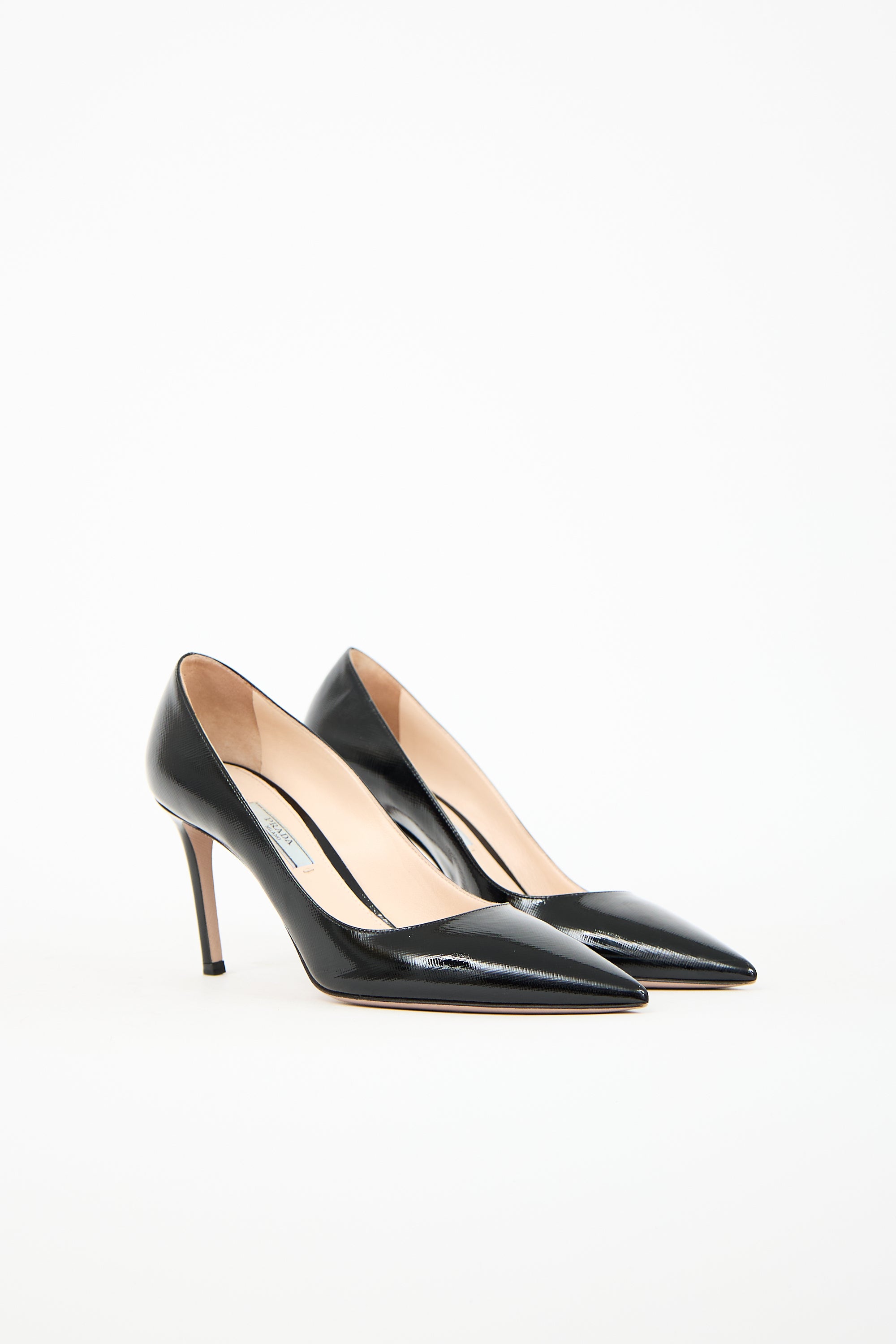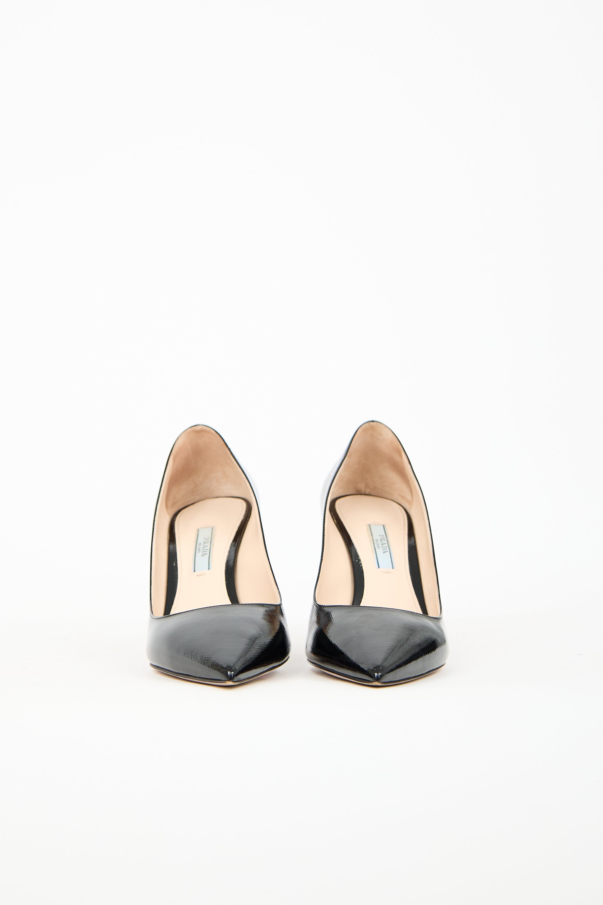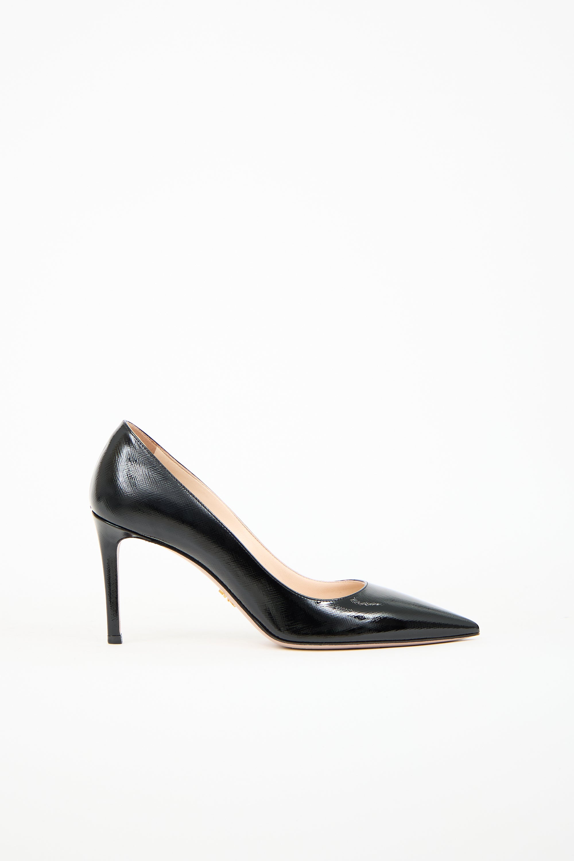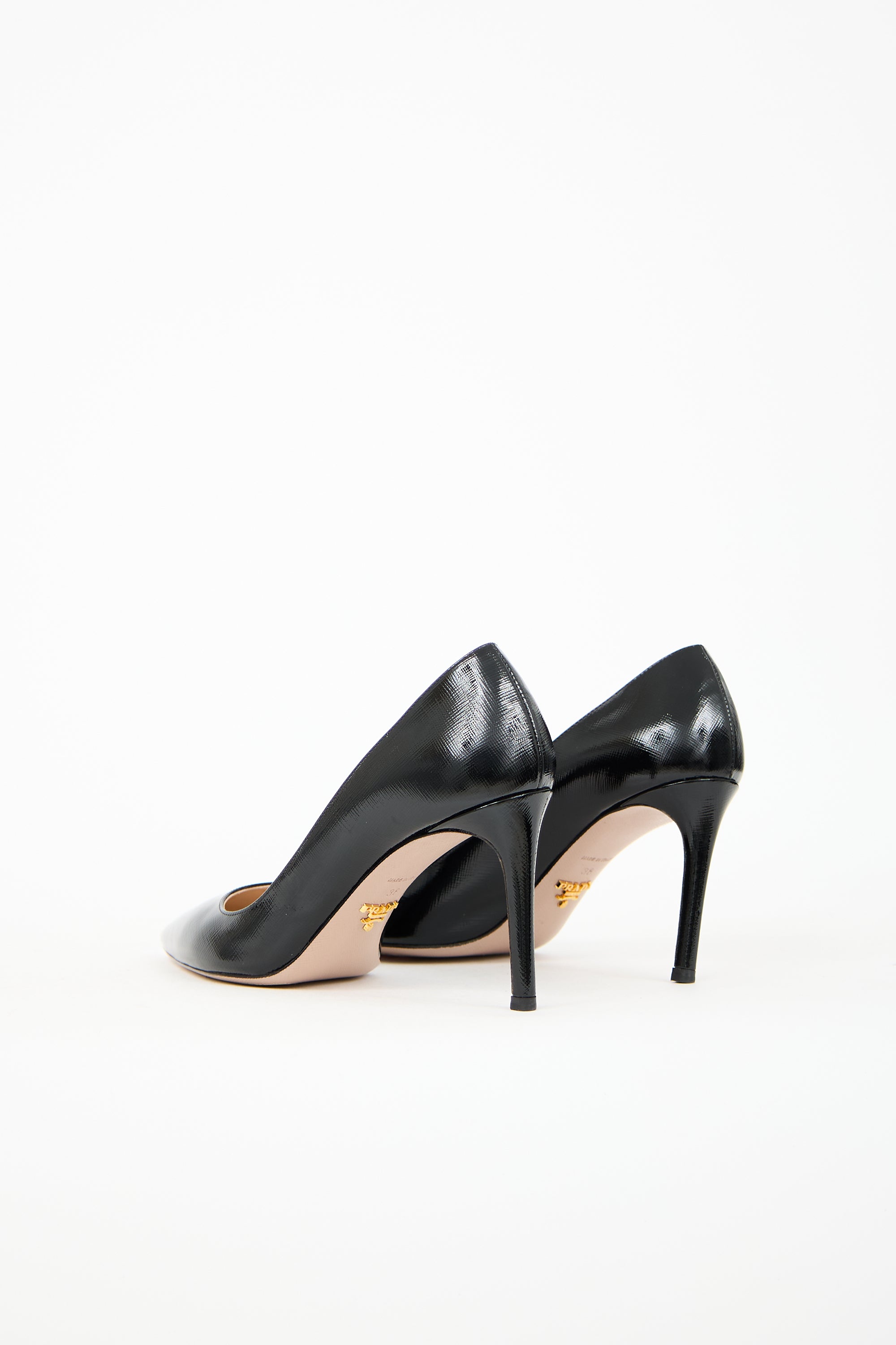 Pre-owned Prada black patent saffiano leather pumps featuring a pointed toe, slip on entry, and a covered stiletto heel. Includes original dust bags.