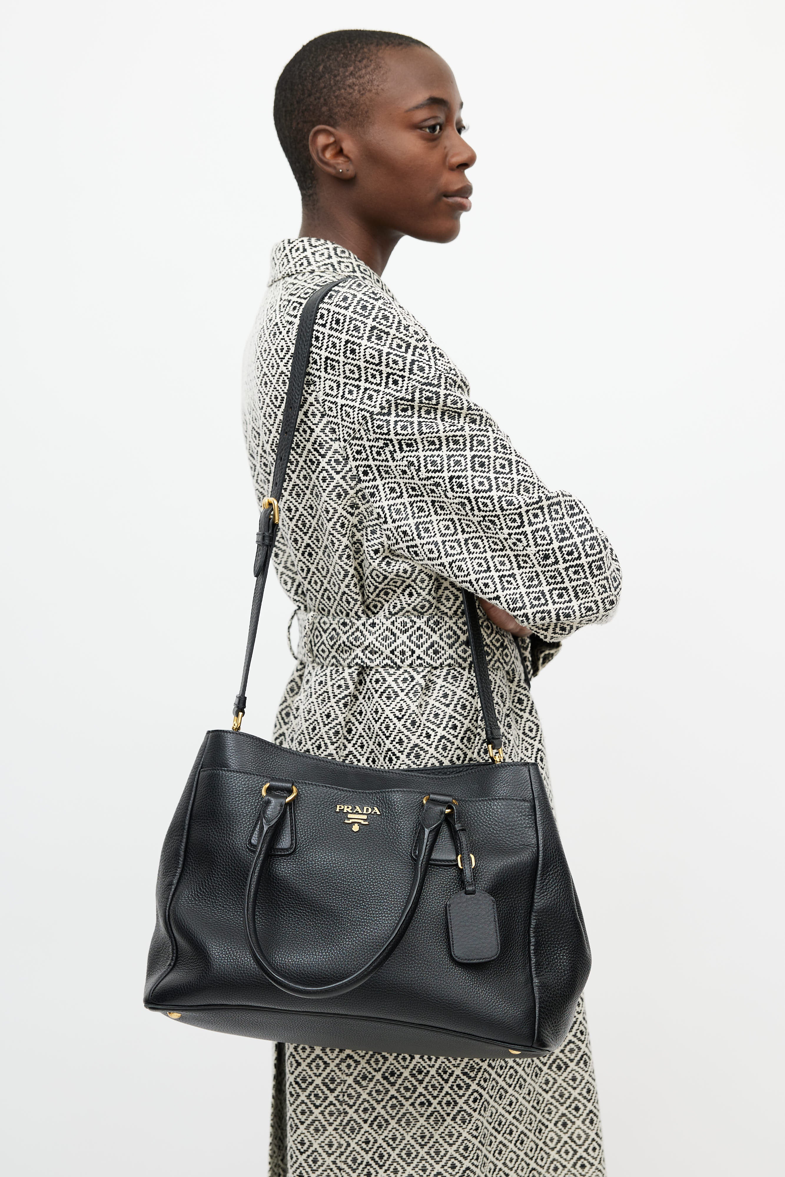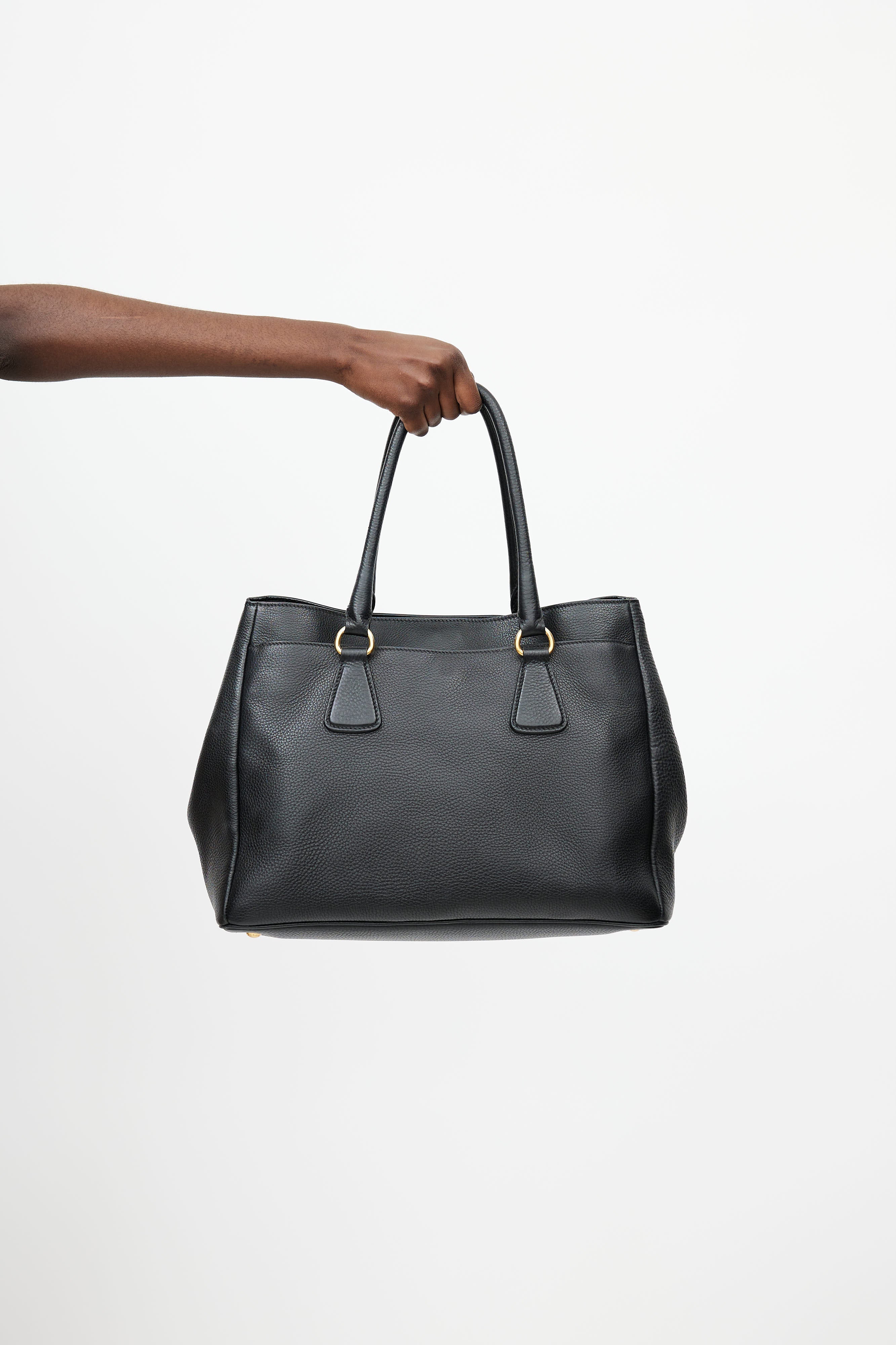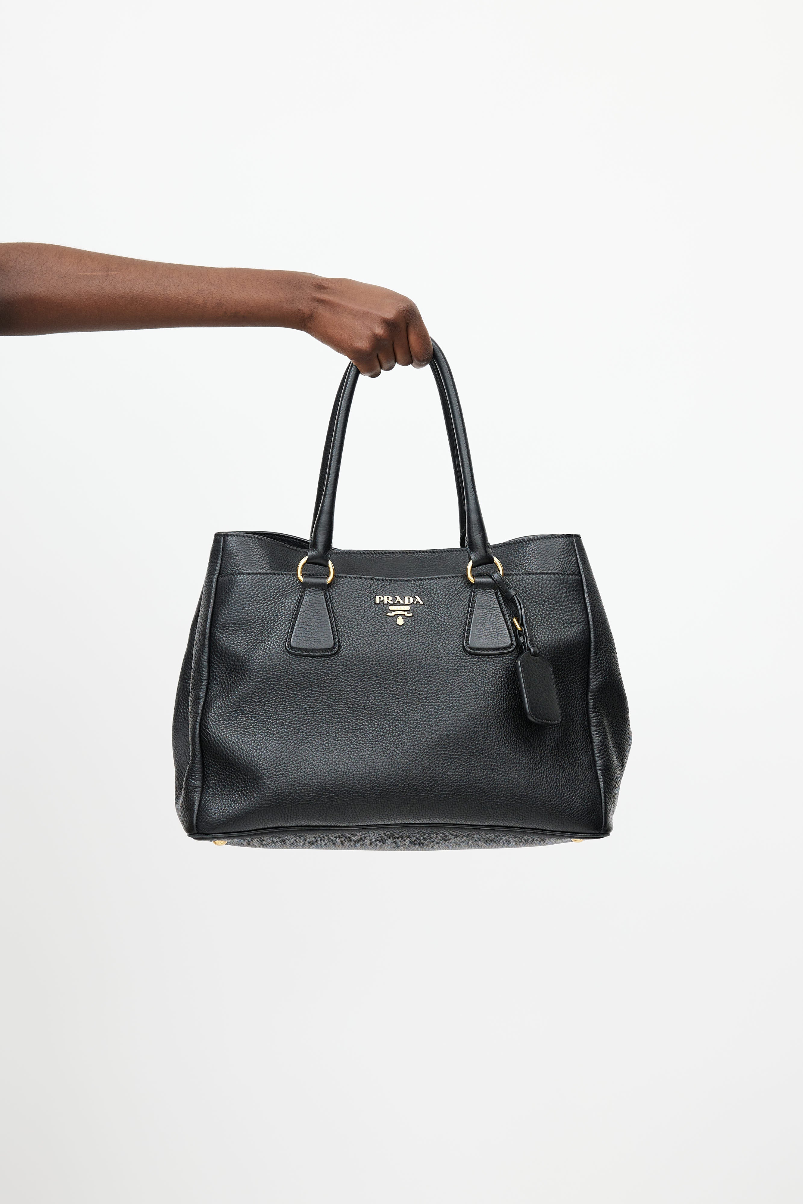 Pre-owned Prada black Vitello Daino tote bag featuring a snap closure pocket at front with gold tone logo hardware, one main compartment with one zip pocket and one slip pocket, embossed gold tone leather logo tab at interior, gold tone protective feet at bottom of bag, removable adjustable shoulder strap at top, detachable name tag at handle, one snap closure pocket at back, and two wrapped leather top handles. Comes with dust bag and certificate of authenticity.