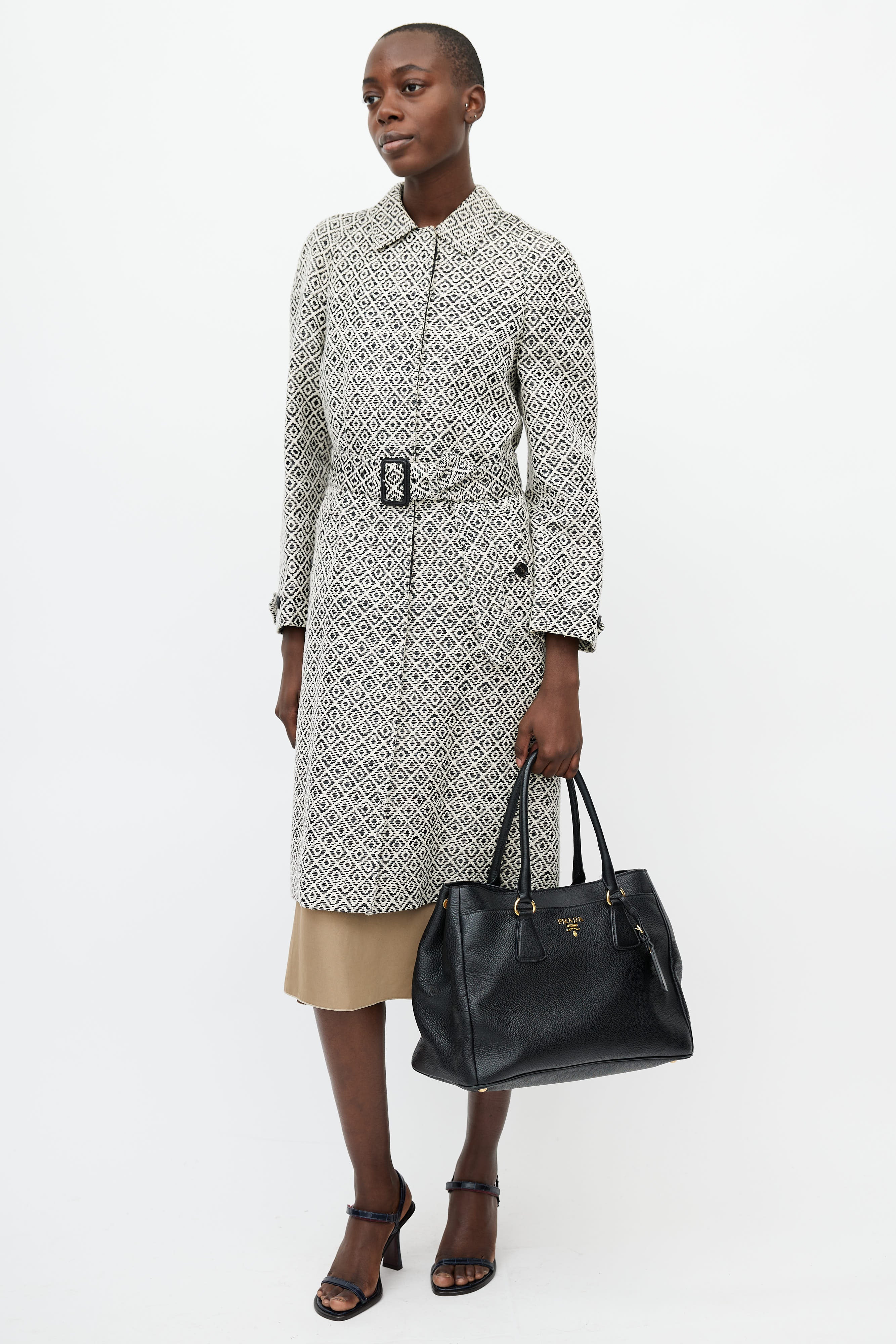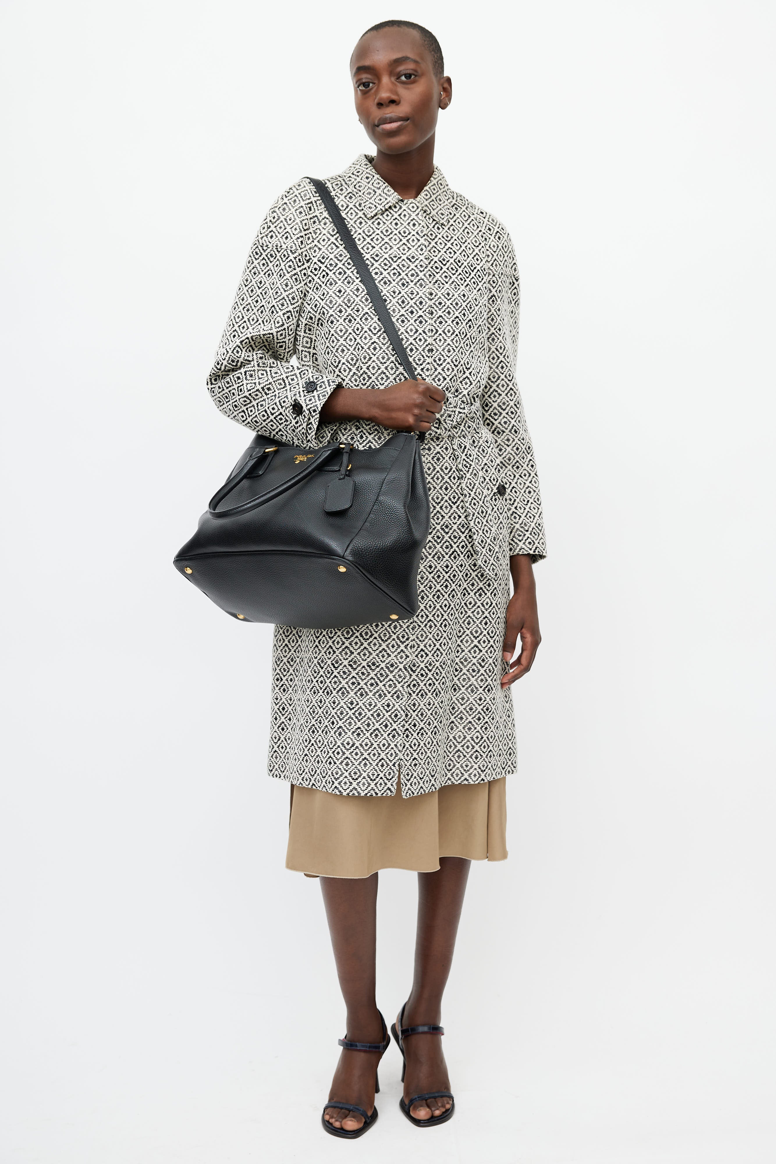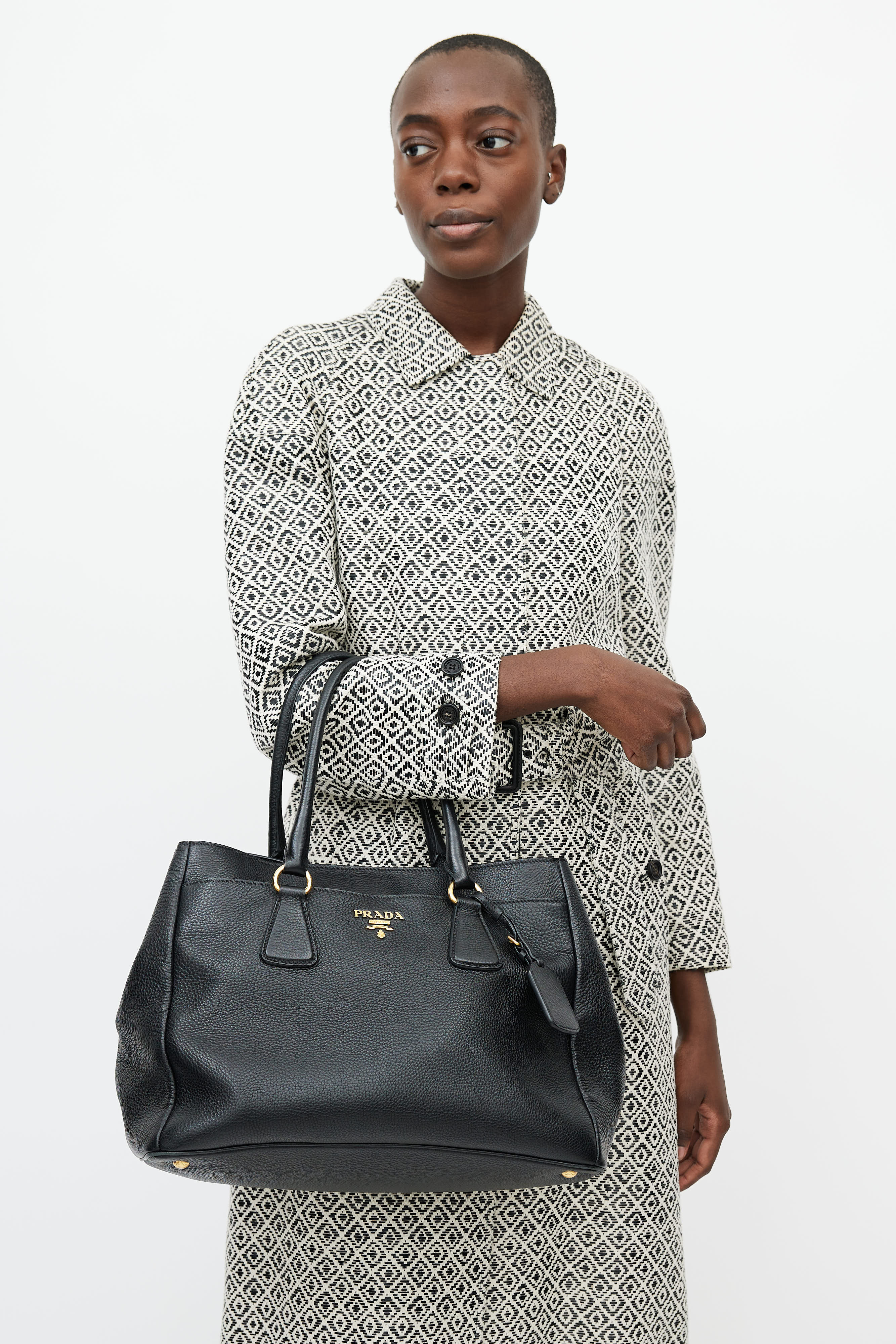 Pre-owned Prada black Vitello Daino tote bag featuring a snap closure pocket at front with gold tone logo hardware, one main compartment with one zip pocket and one slip pocket, embossed gold tone leather logo tab at interior, gold tone protective feet at bottom of bag, removable adjustable shoulder strap at top, detachable name tag at handle, one snap closure pocket at back, and two wrapped leather top handles. Comes with dust bag and certificate of authenticity.