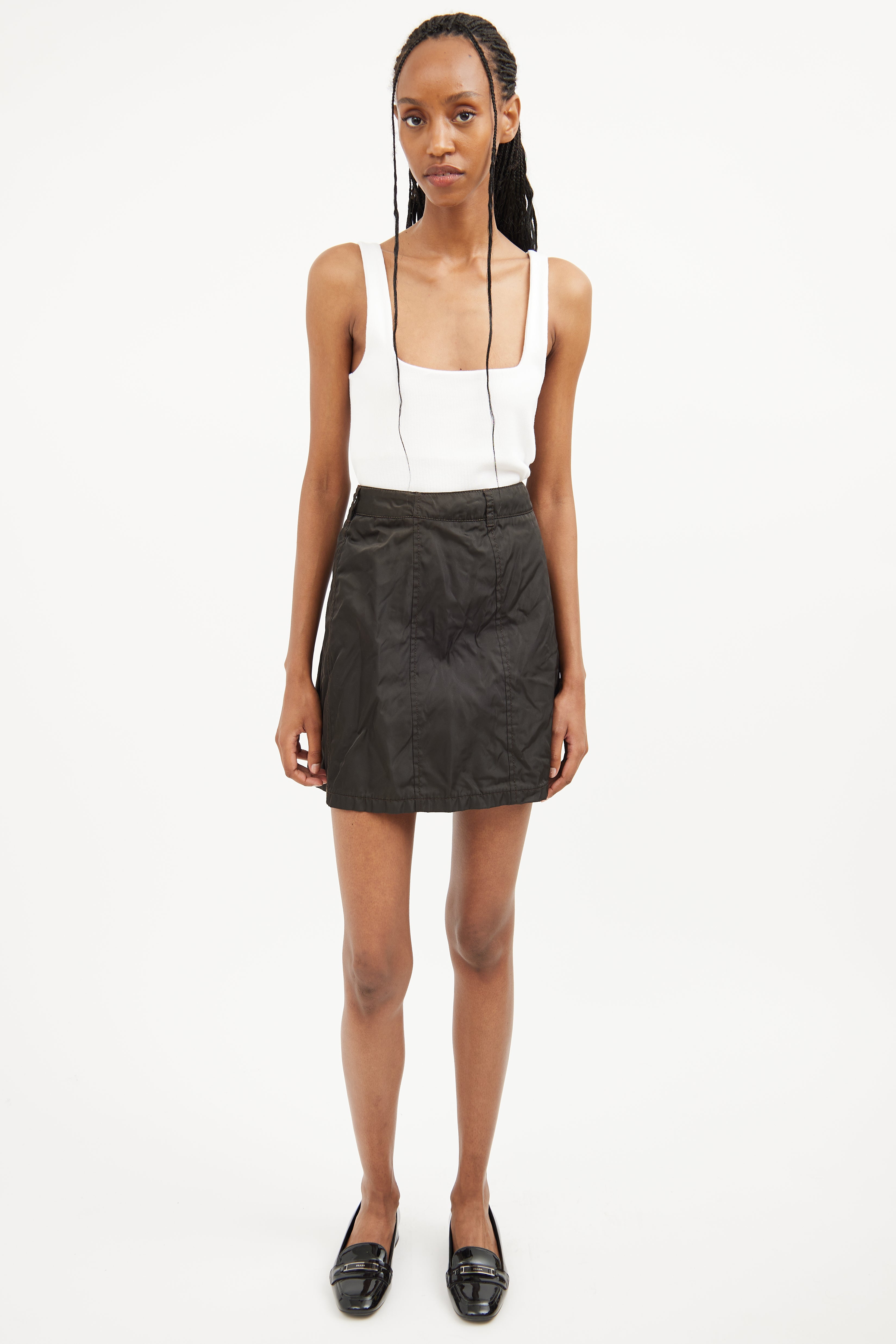Pre-owned Prada brown nylon mini skirt featuring belt loops on waist and zip entry back. Fully lined.