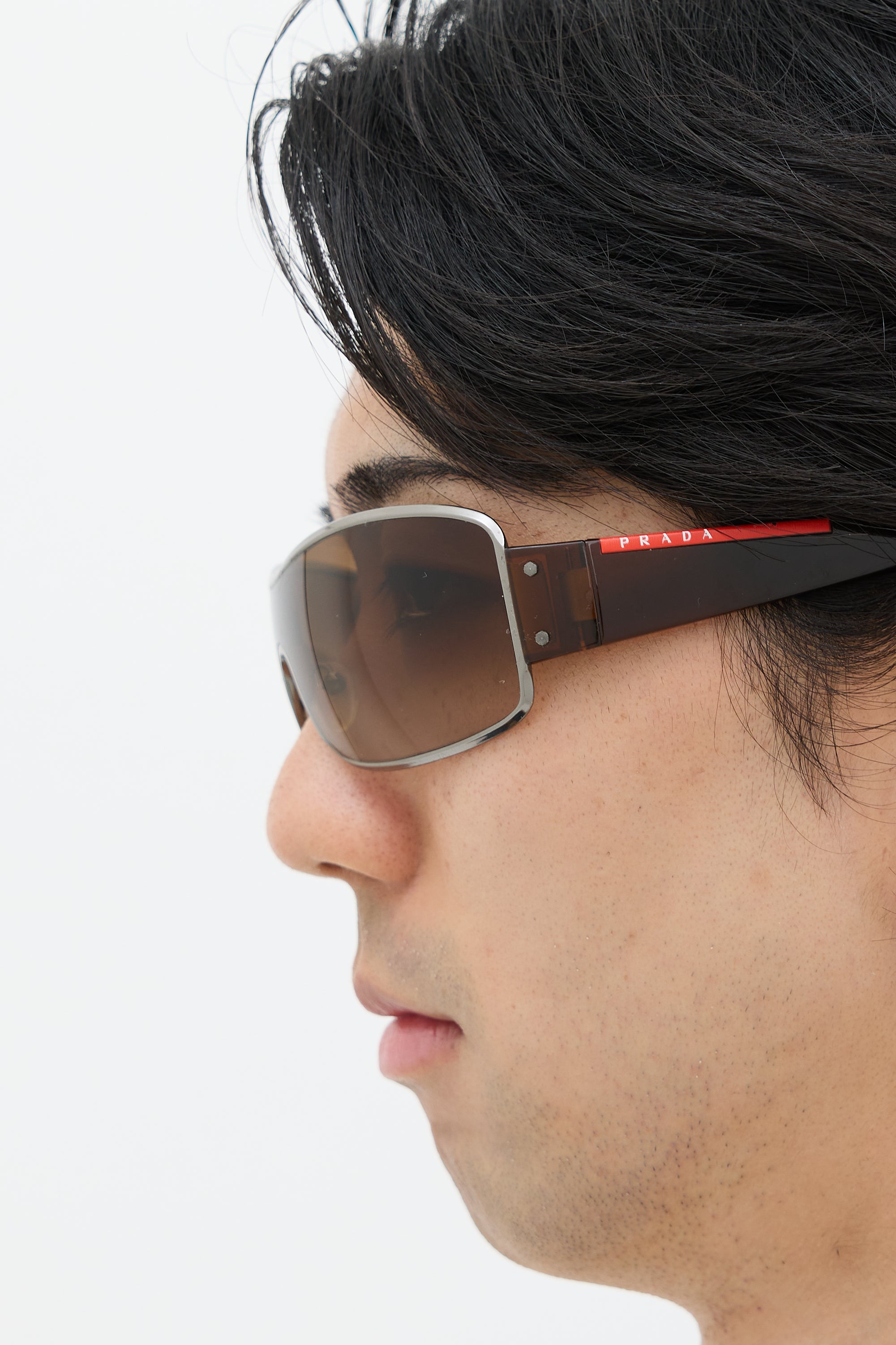Pre-owned Prada brown SPS52E shield sunglasses featuring a wire frame, tinted lens, adjustable nose pads, and logo detail at temple.