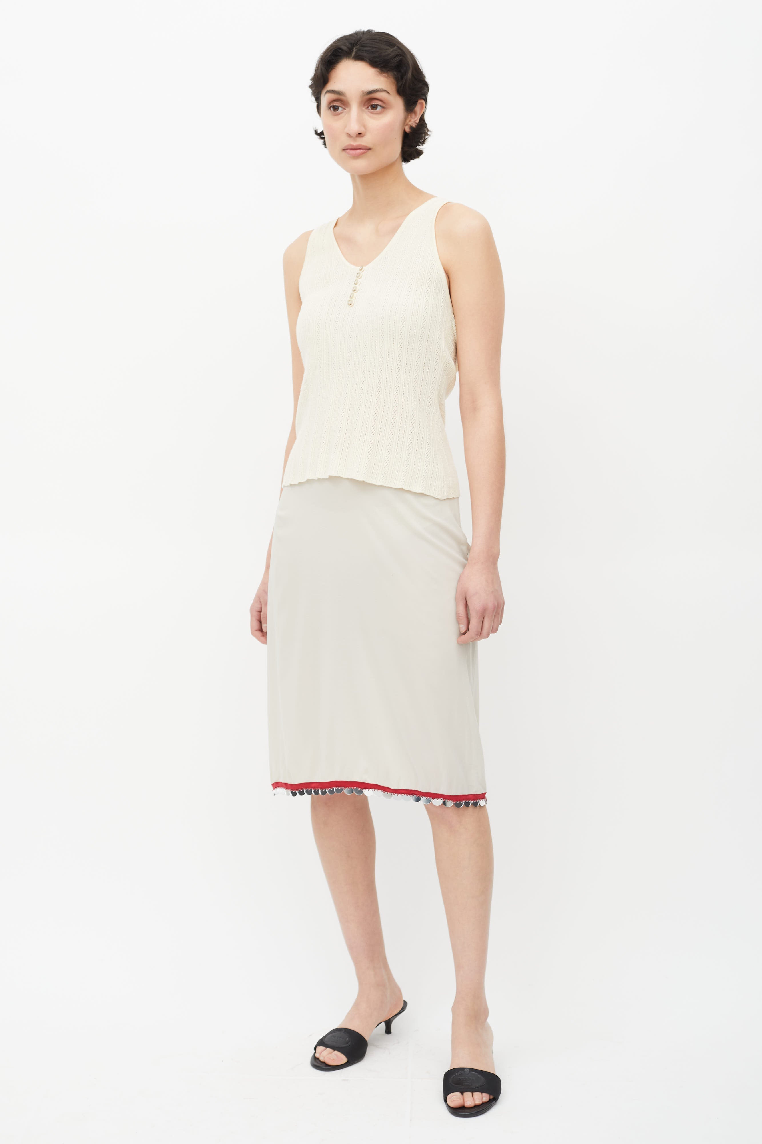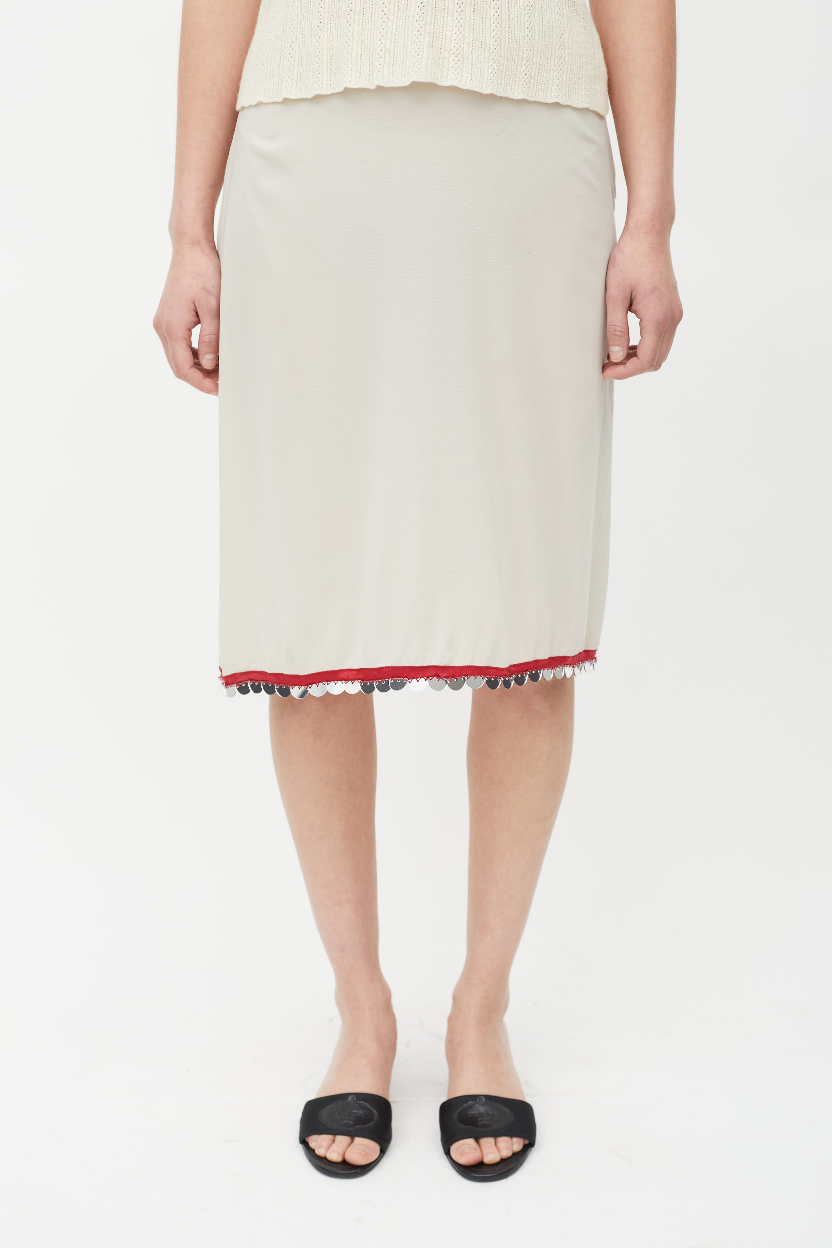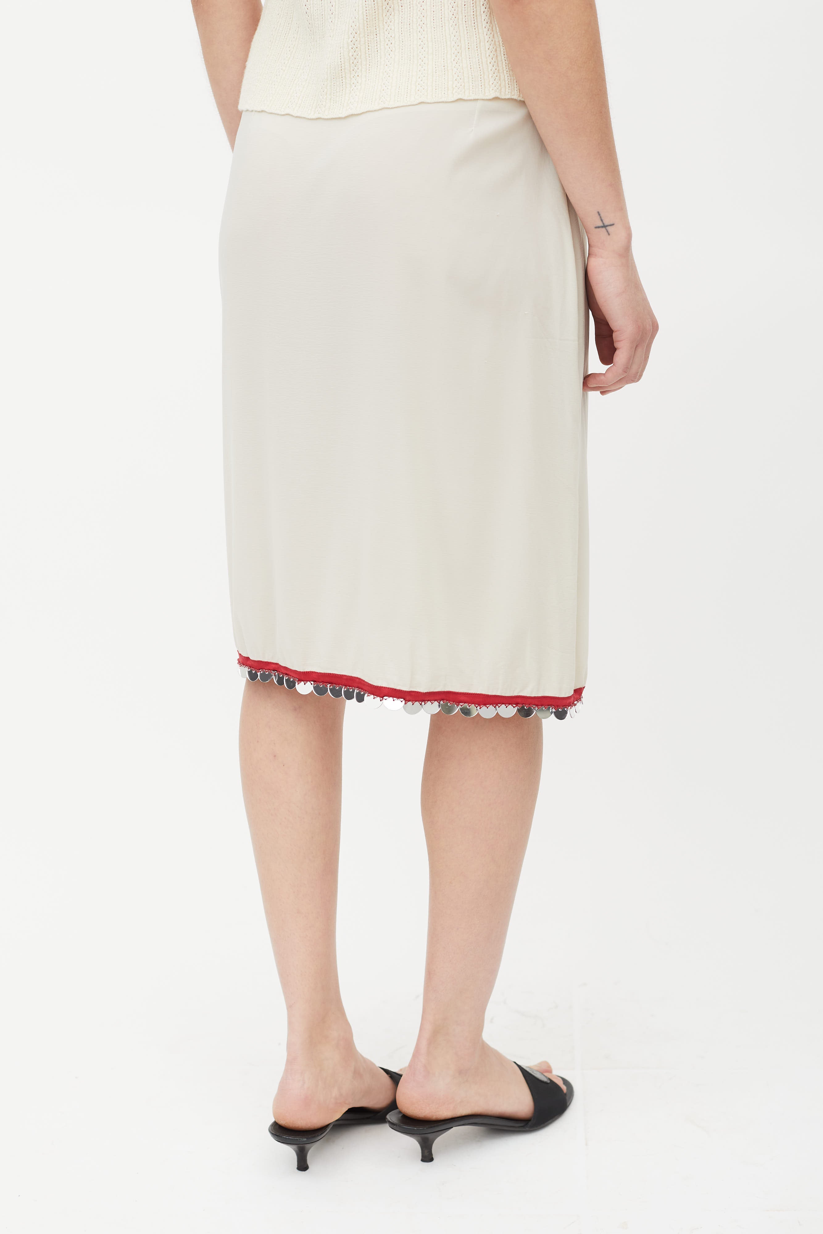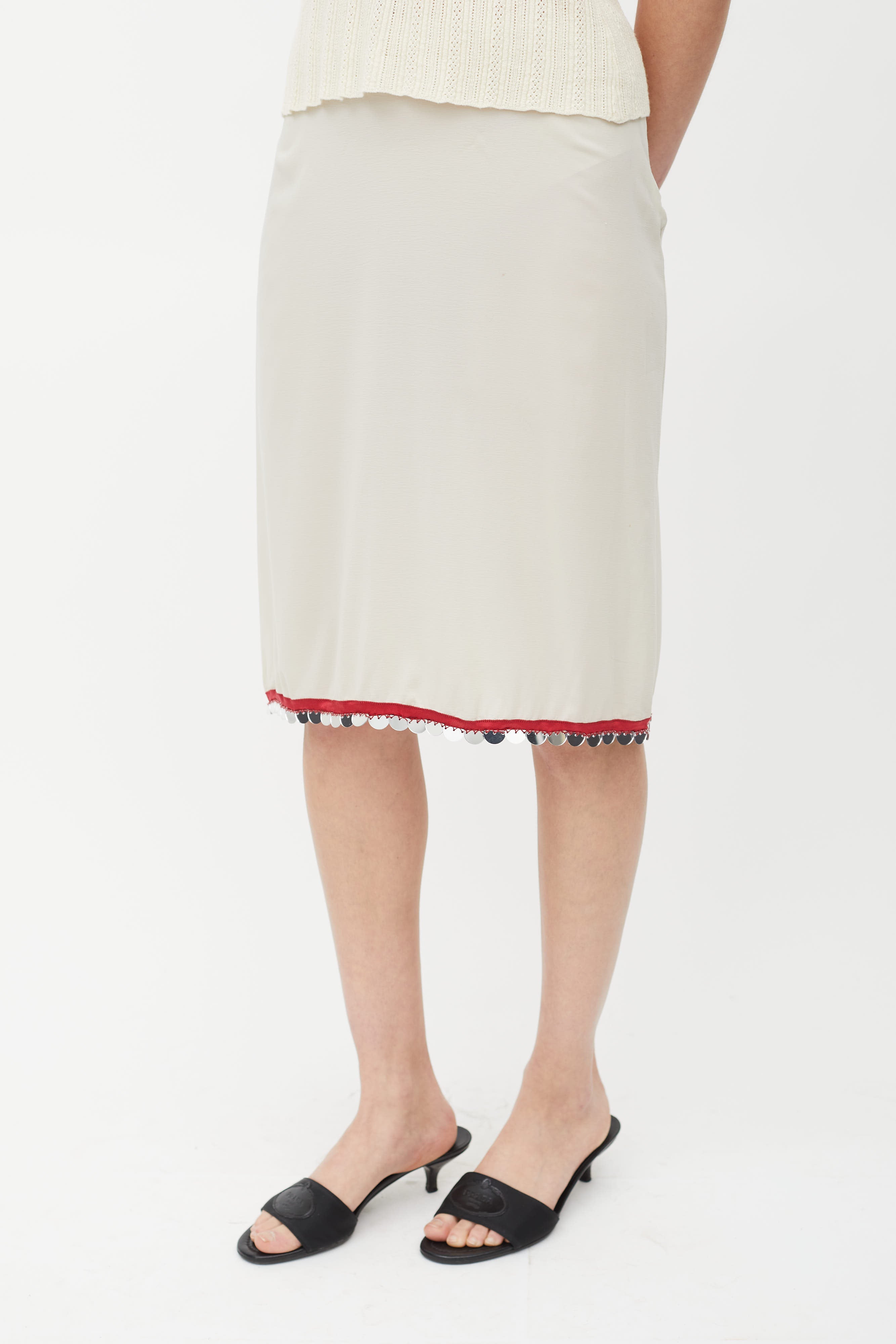 Pre-owned Prada cream skirt featuring a scallop trim waist, red embroidered hem with mirrored sequin trim, and a concealed zip closure at left side.
