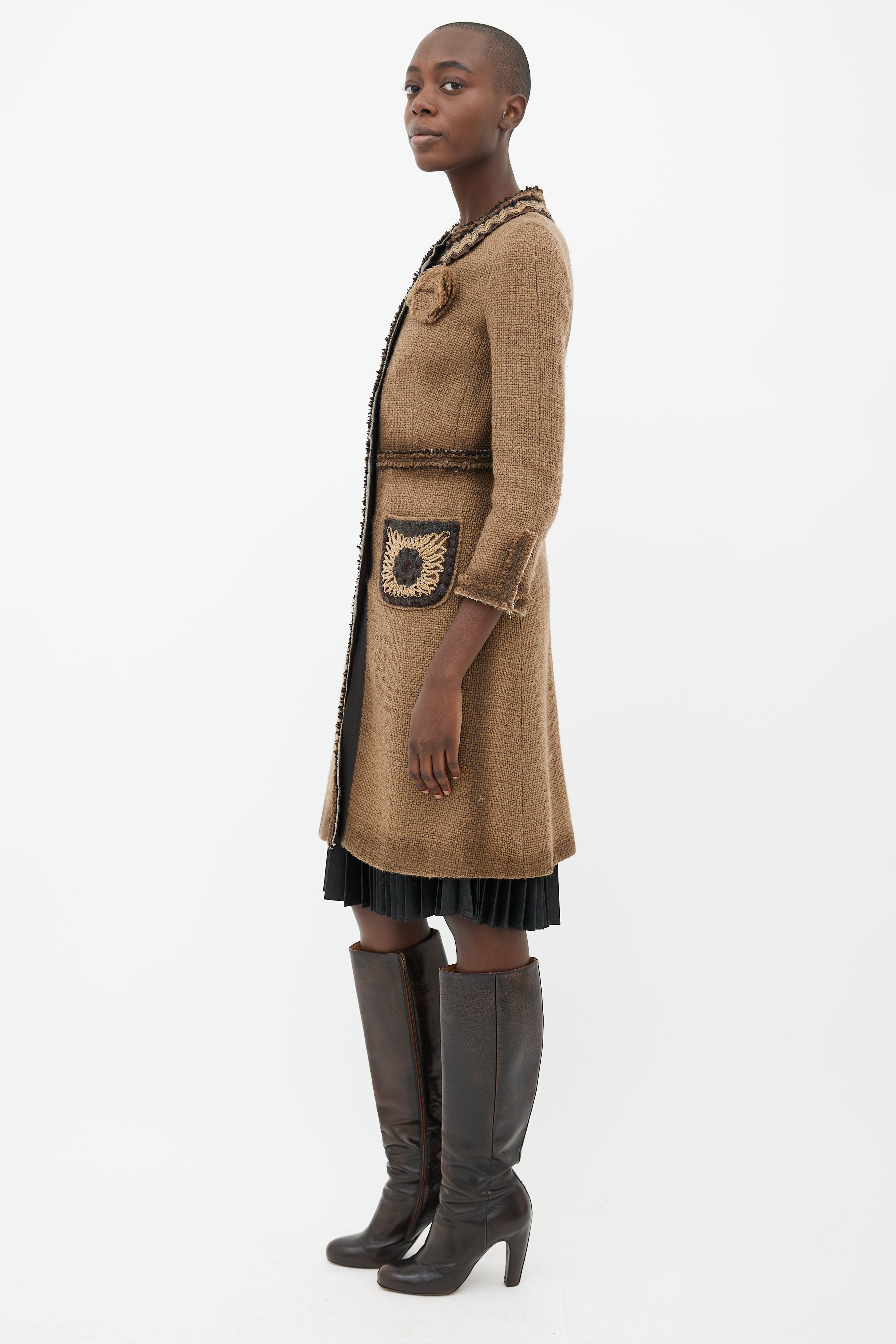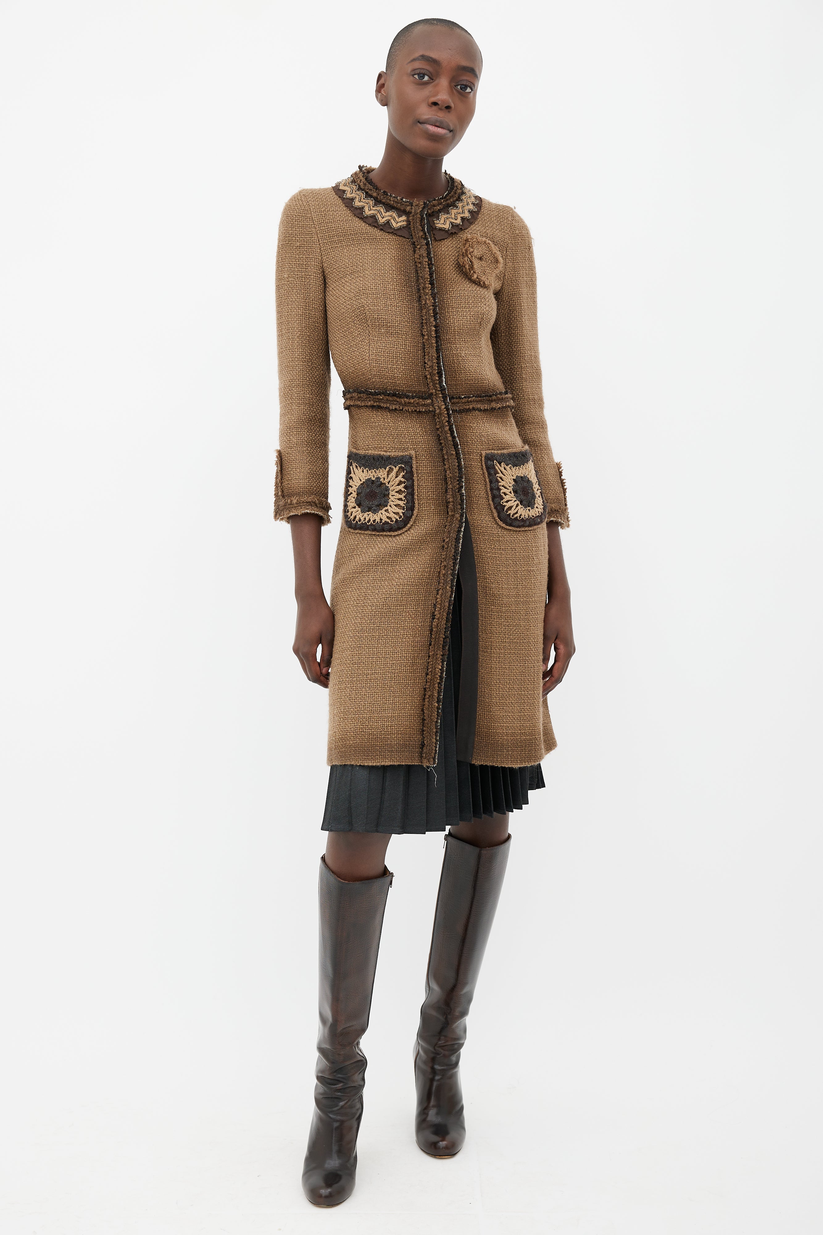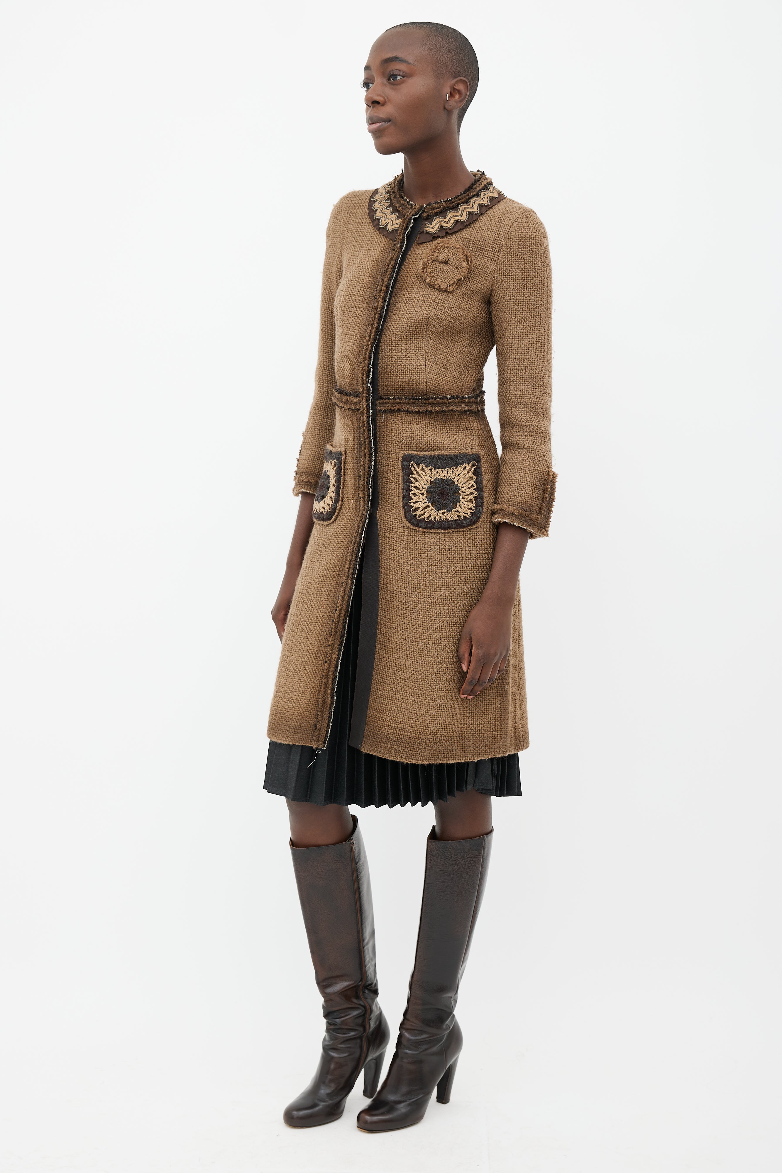 Pre-owned F/W 2005 RTW Prada coat in brown featuring round neckline with bead embellishment, concealed snap button closure at front, tonal tweed trimming detail throughout, detachable tonal tweed brooch at chest, and two pockets styling with crochet detailing.